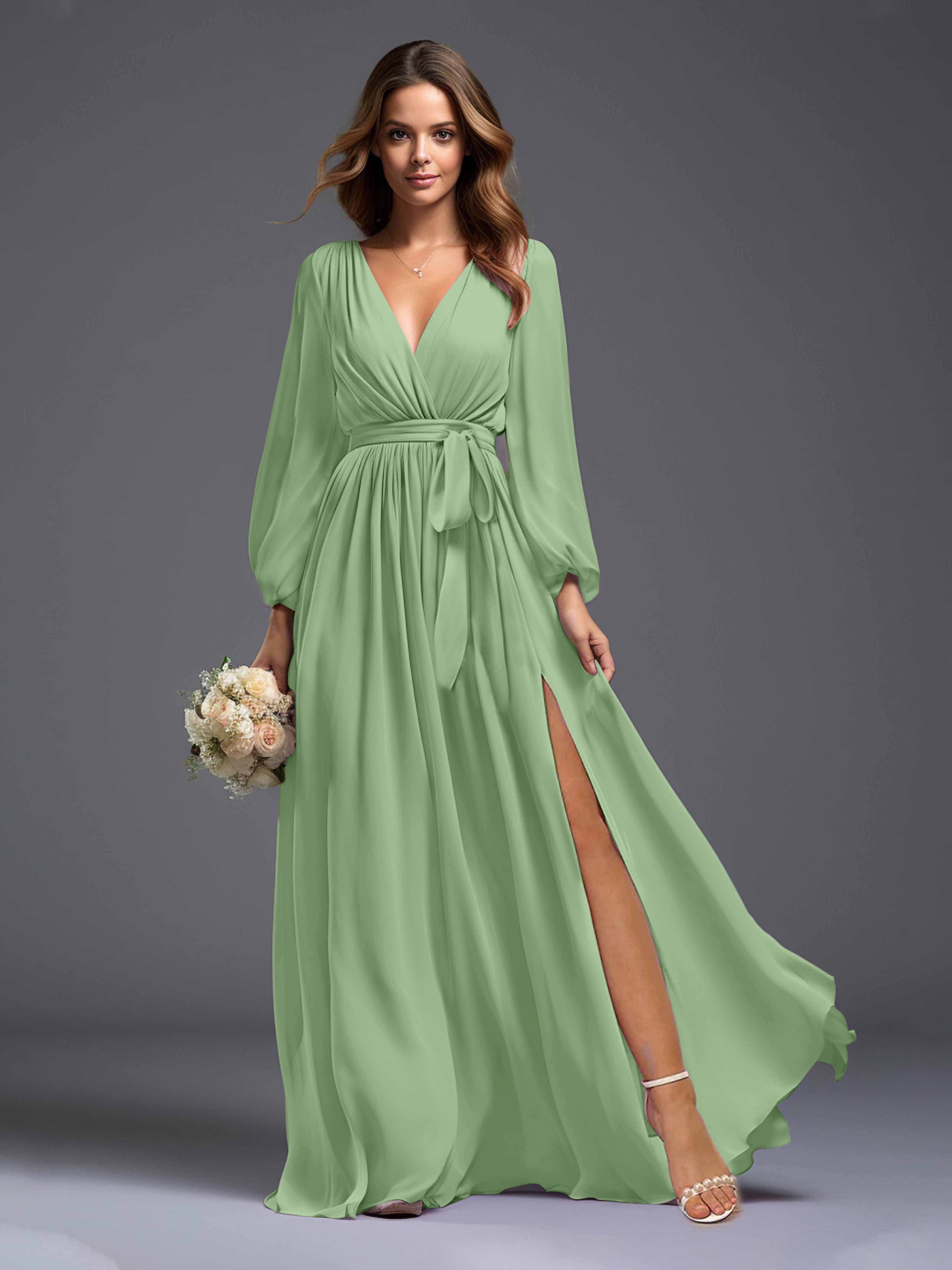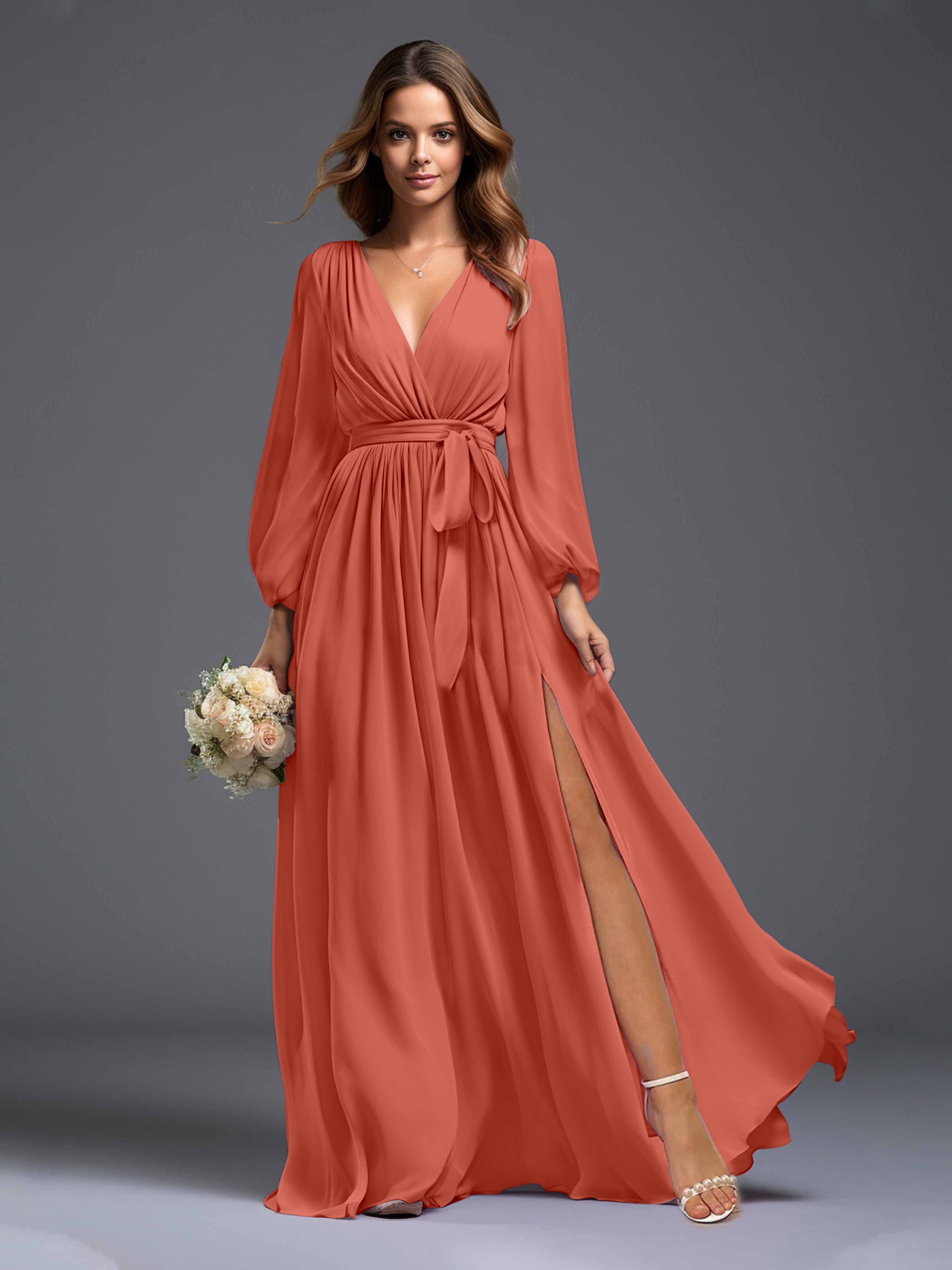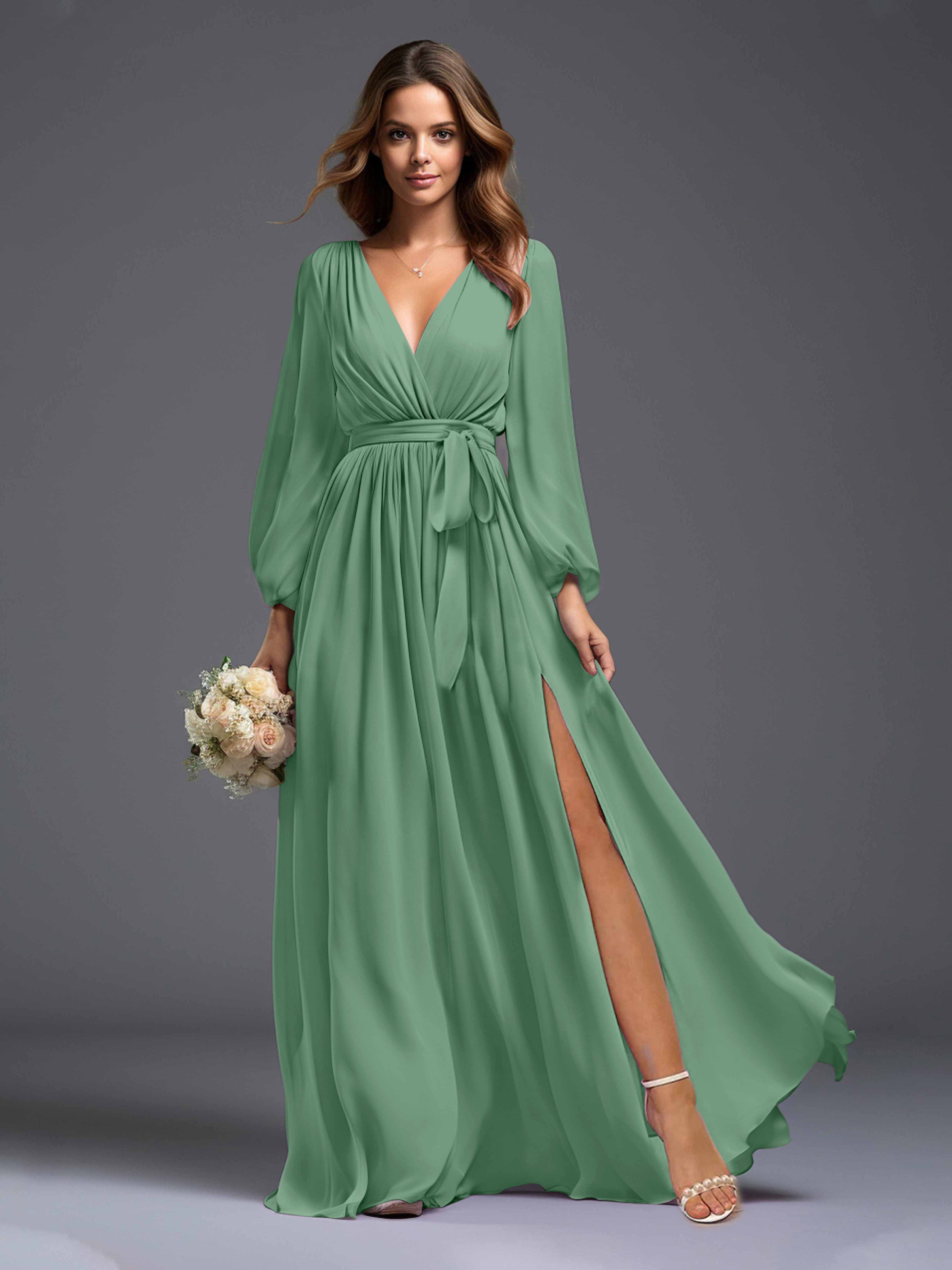 Leila Gorgeous V Neck Long Sleeves Chiffon Bridesmaid Dresses