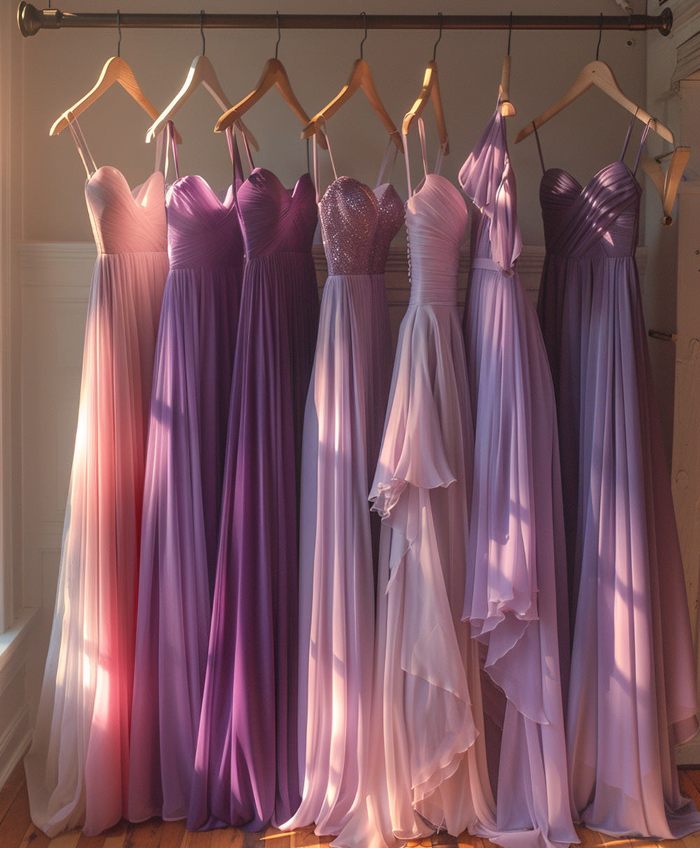 Another option is to select a uniform dress style for your bridesmaids while granting them the freedom to choose from a diverse range of colors within the same palette. For instance, you can opt for a flowing chiffon dress with a sweetheart neckline, and your bridesmaids can individually select from various tones of blues, such as sky blue, navy, and dusty blue.
