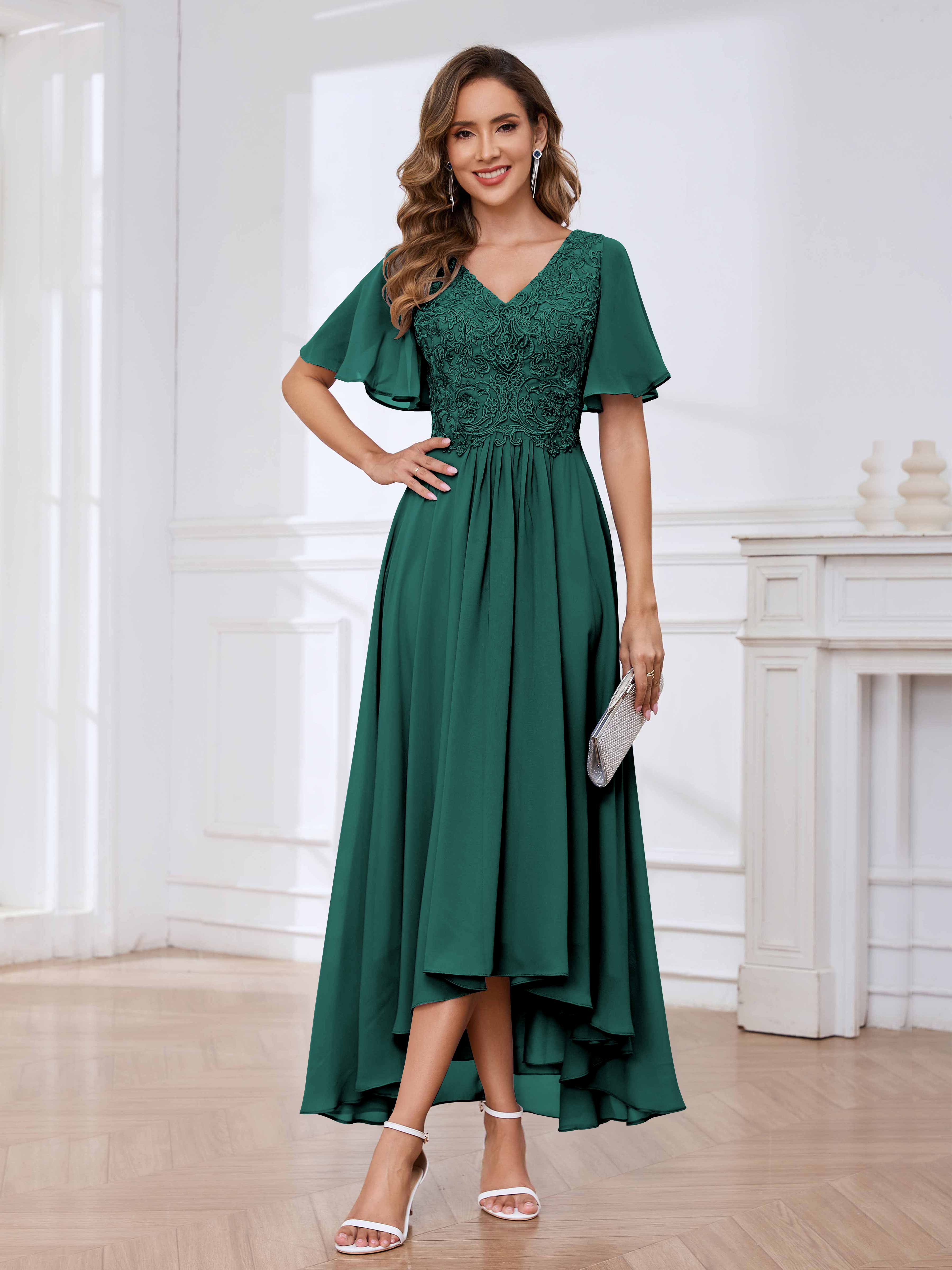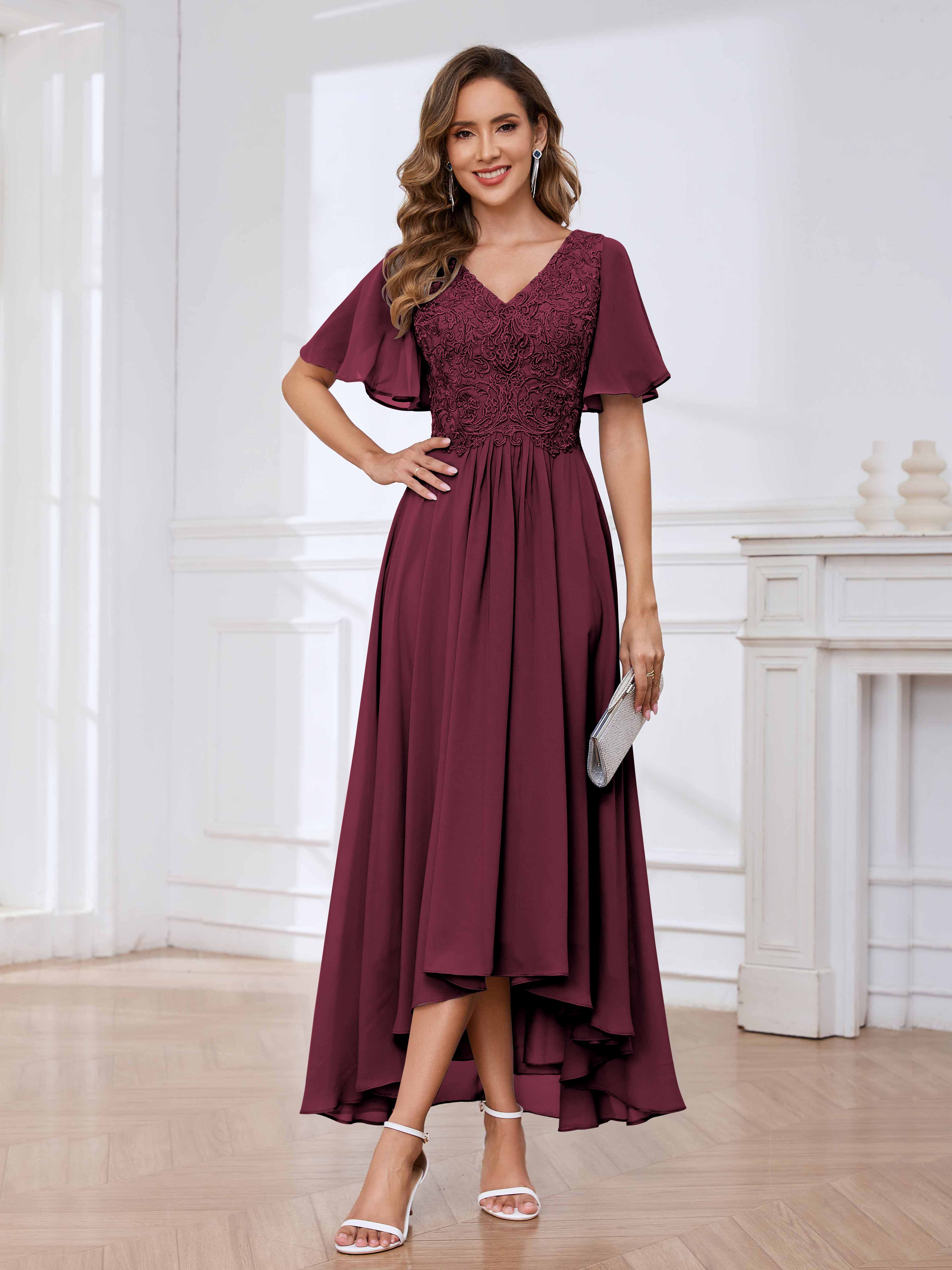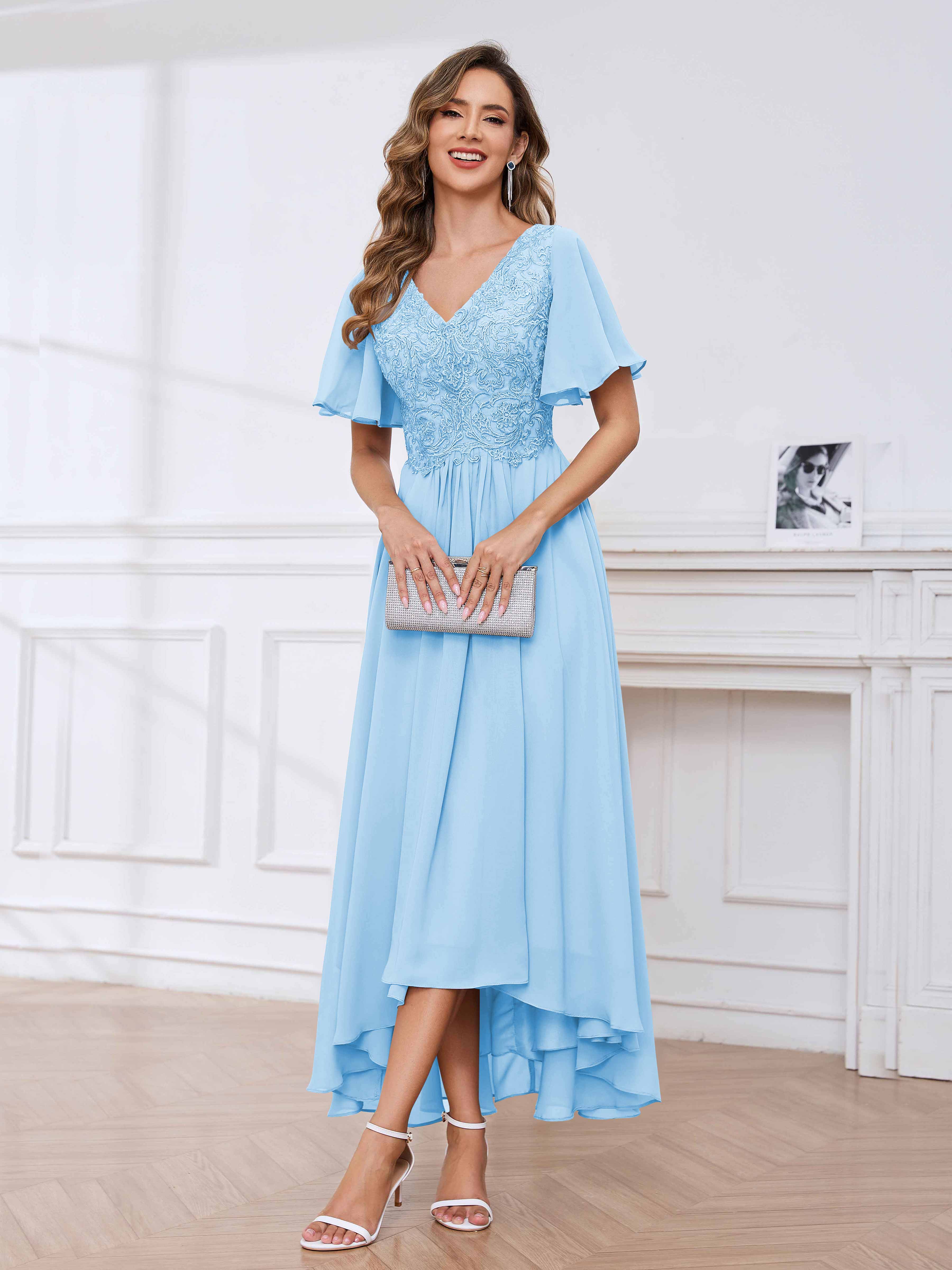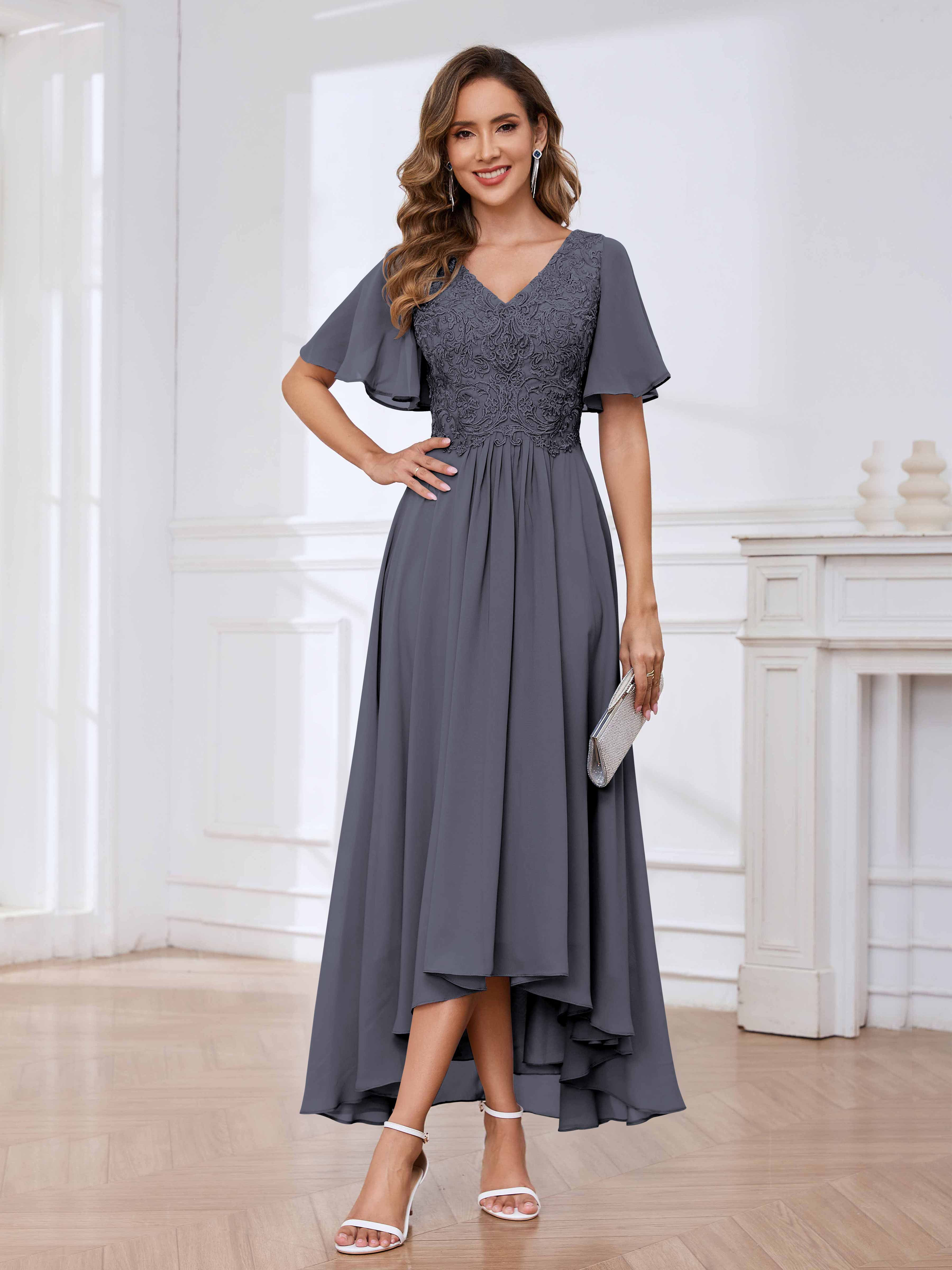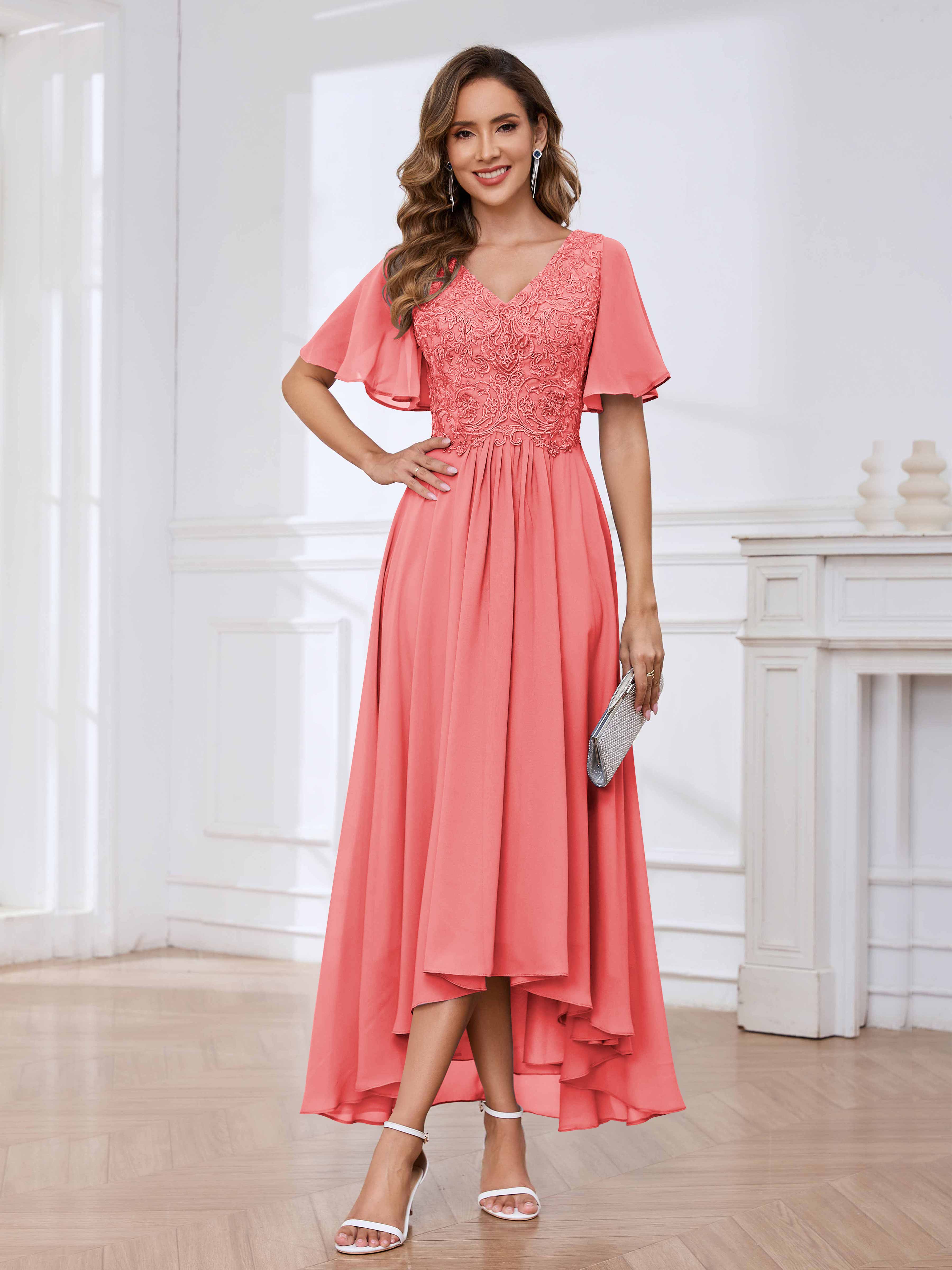 Abby Graceful V Neck Lace Appliques High Low Chiffon Mother of the Bride Dresses