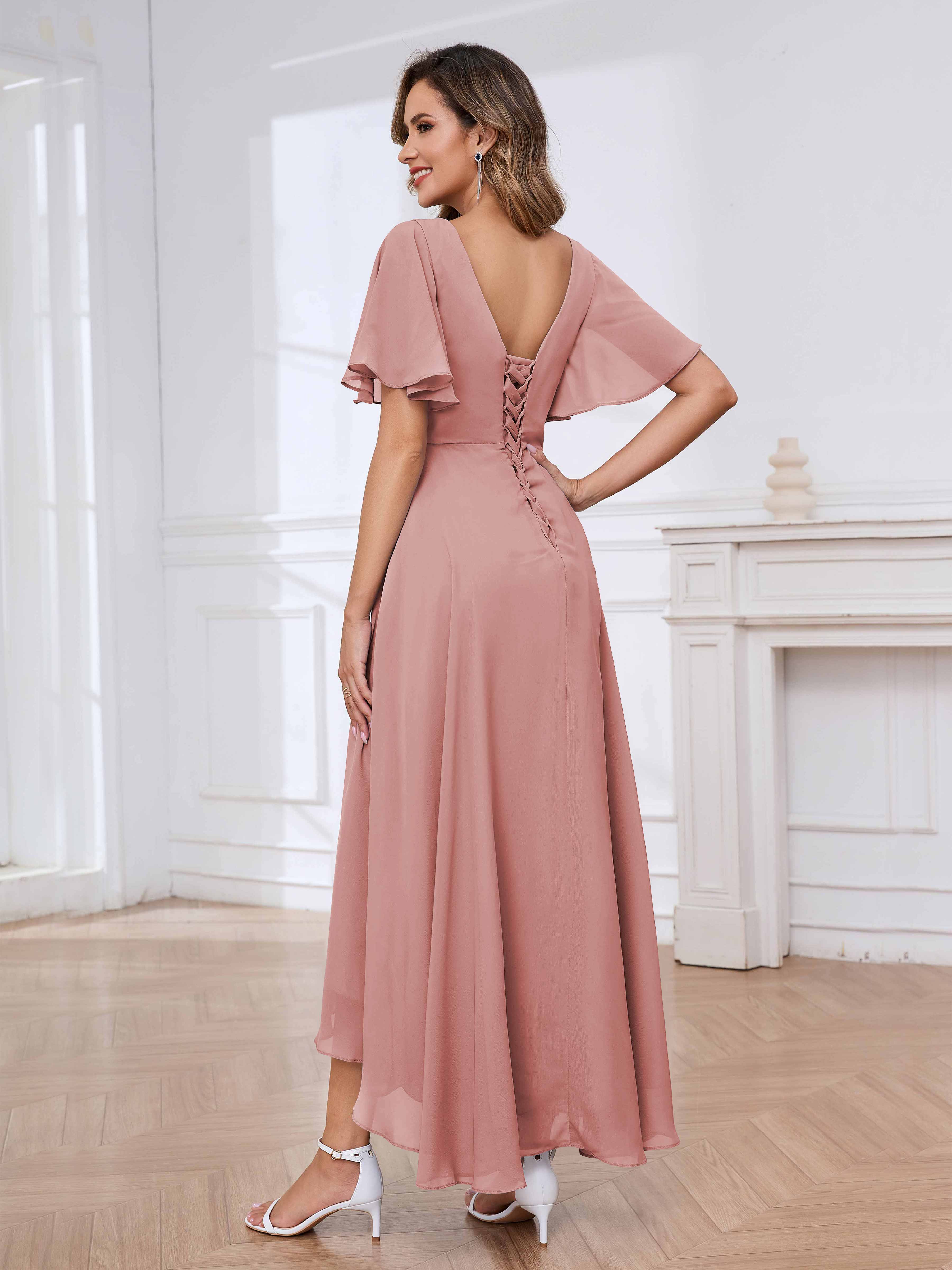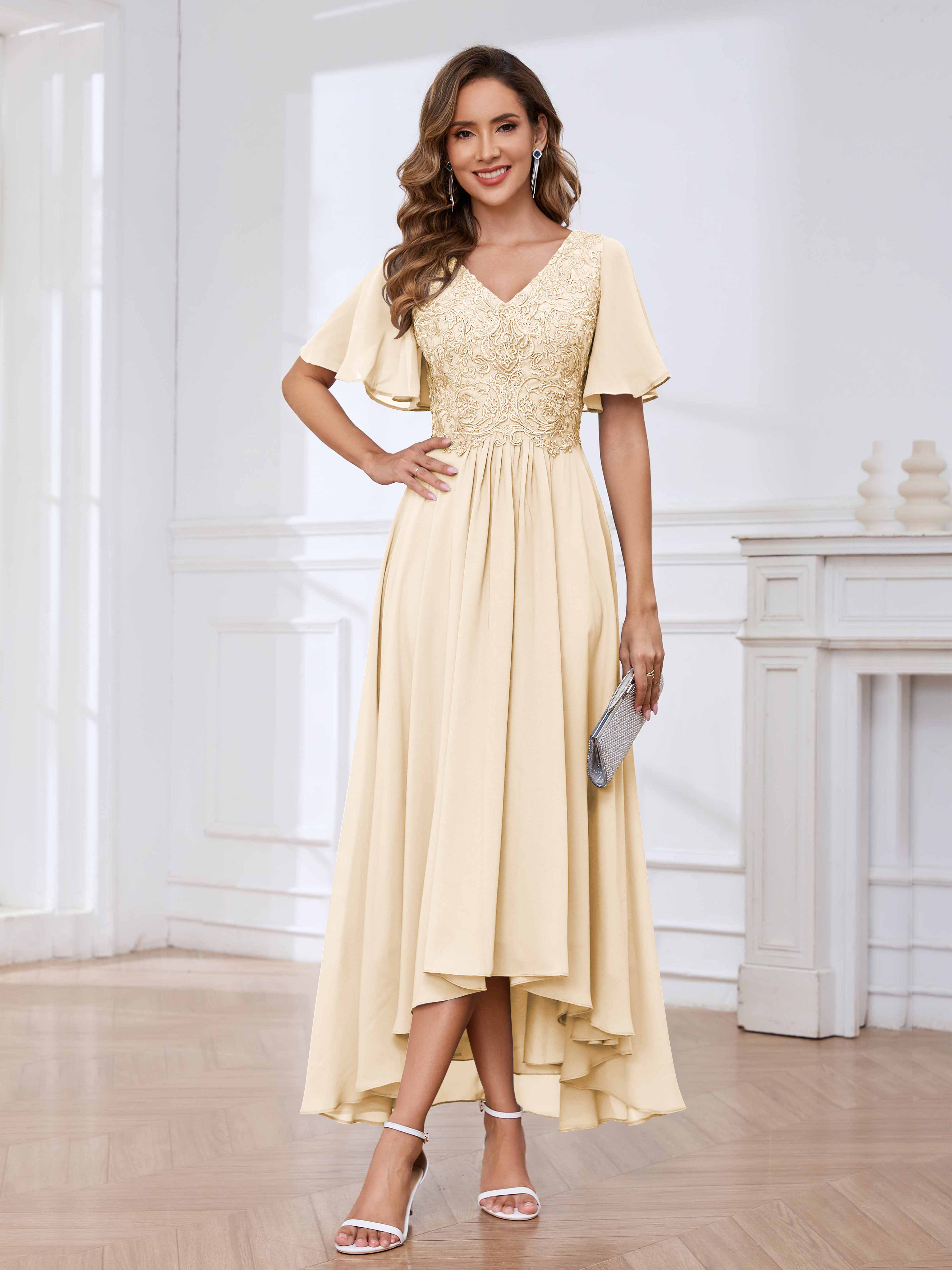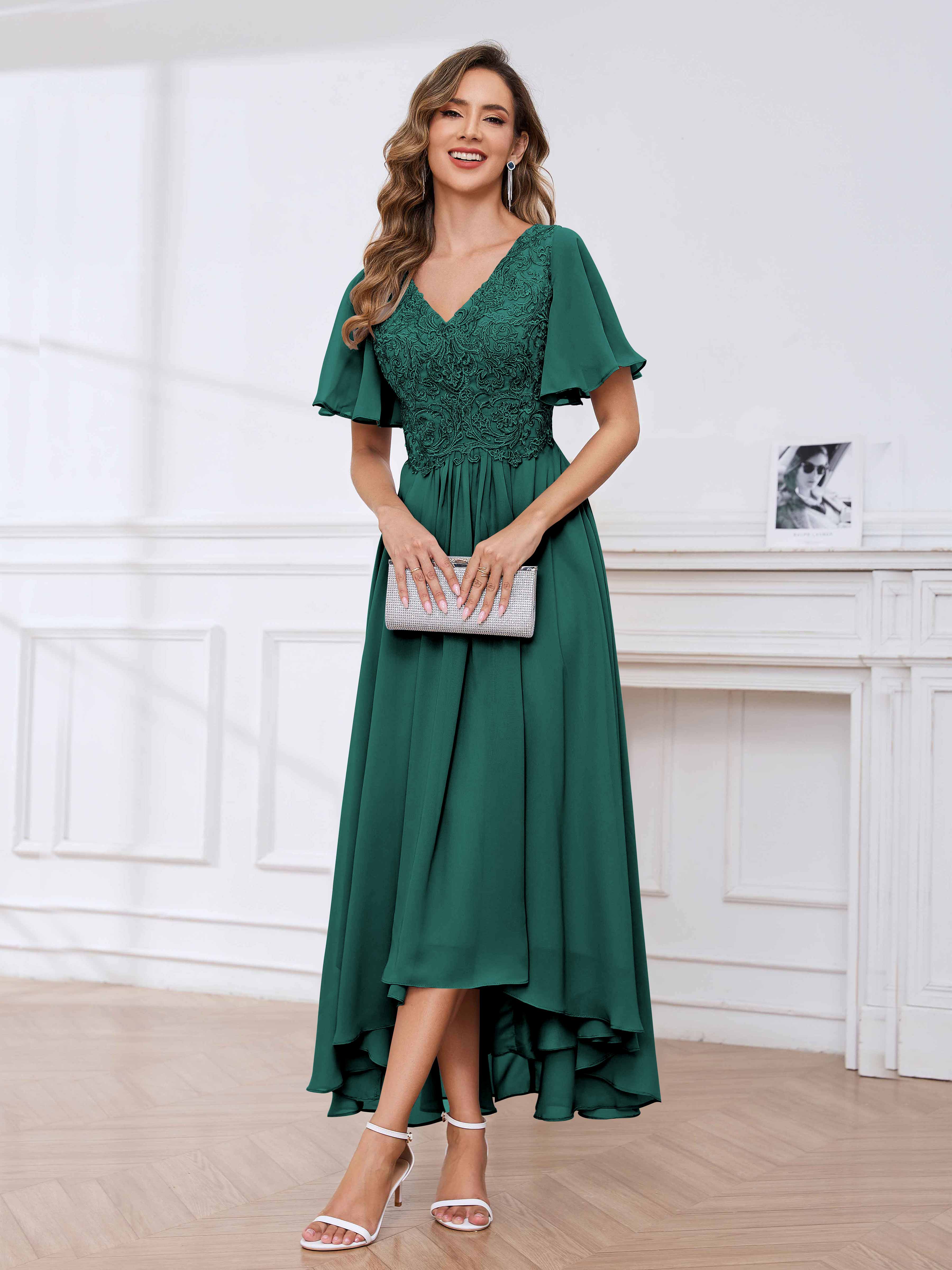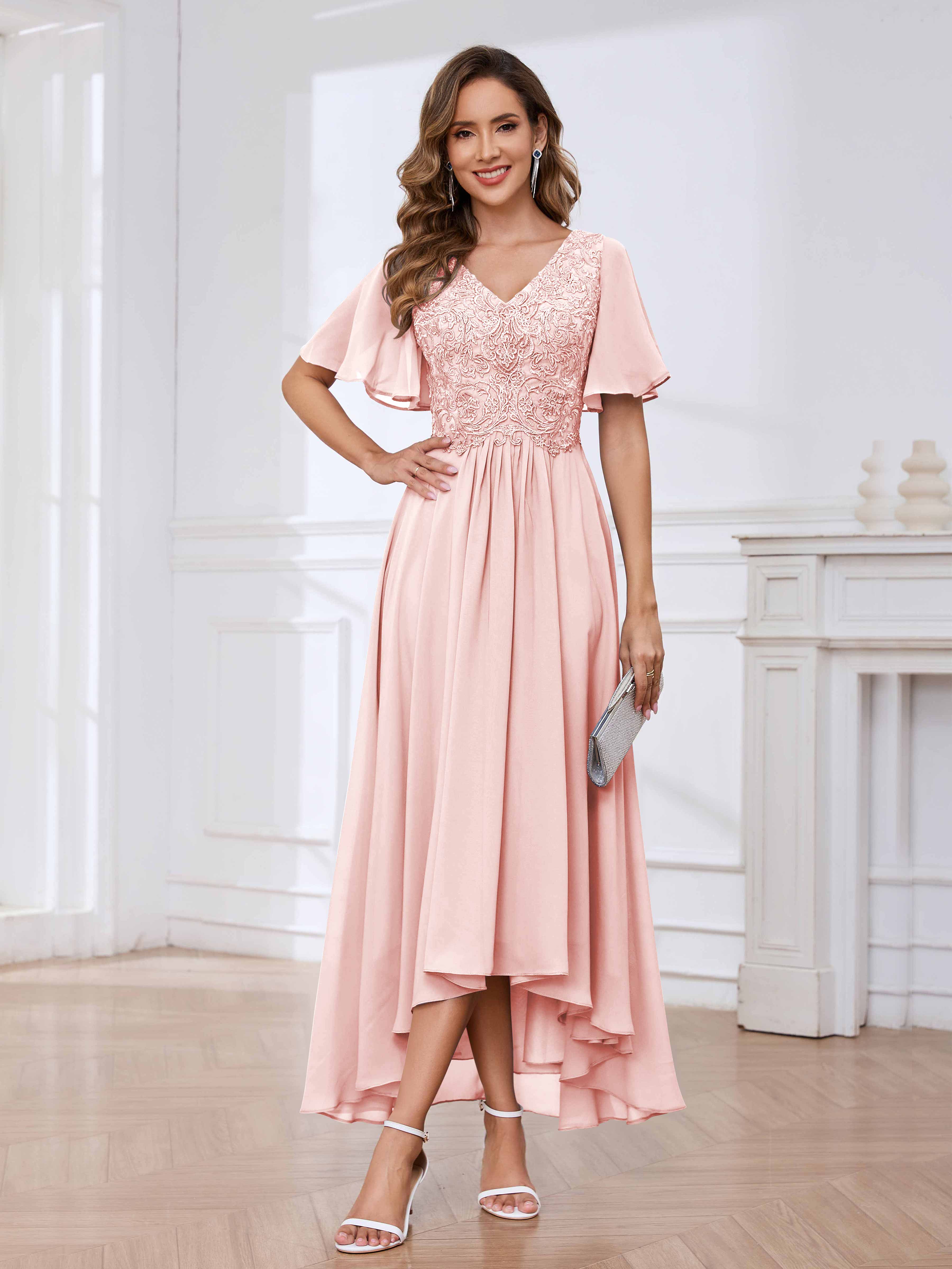 Abby Graceful V Neck Lace Appliques High Low Chiffon Mother of the Bride Dresses
