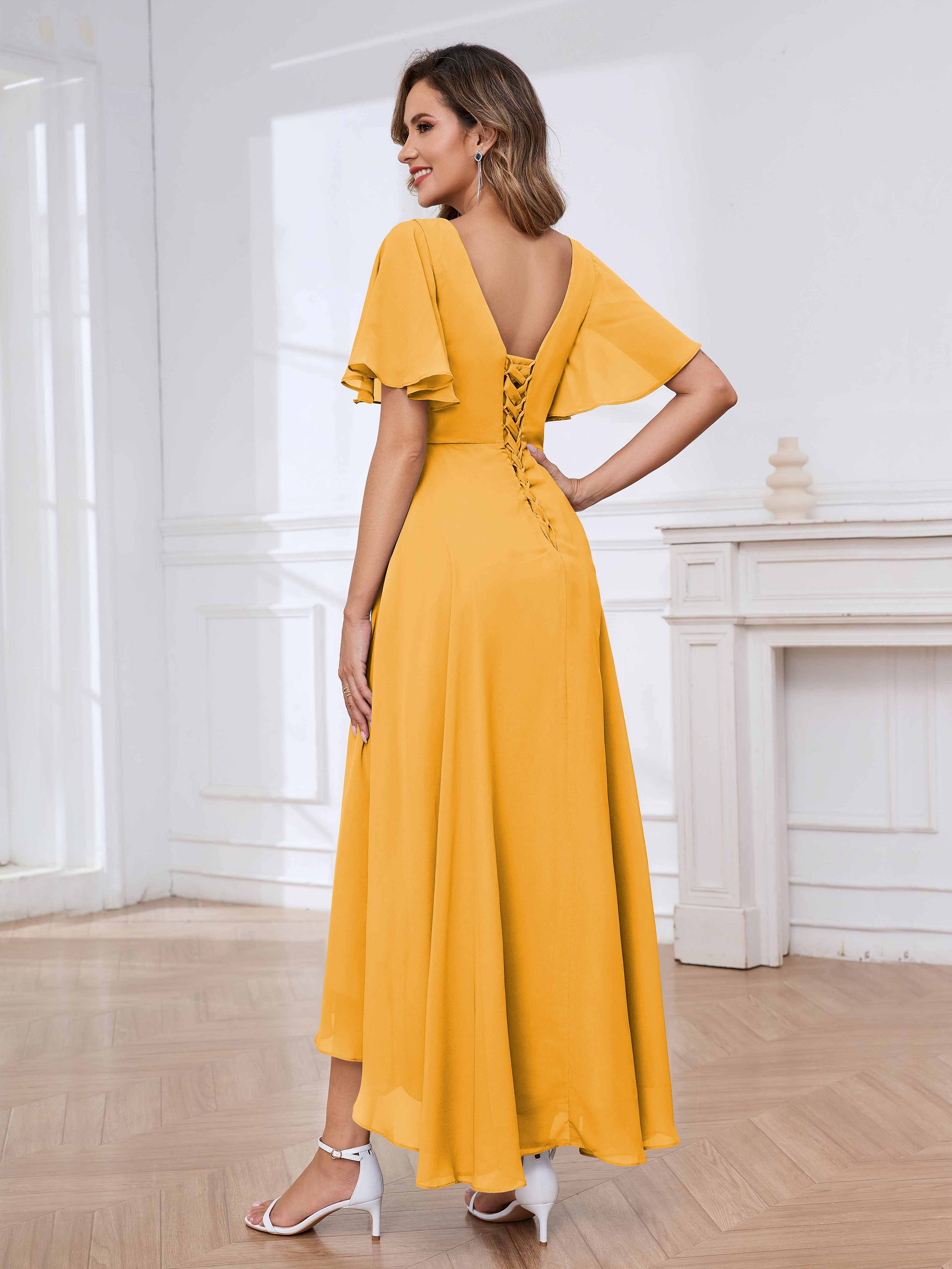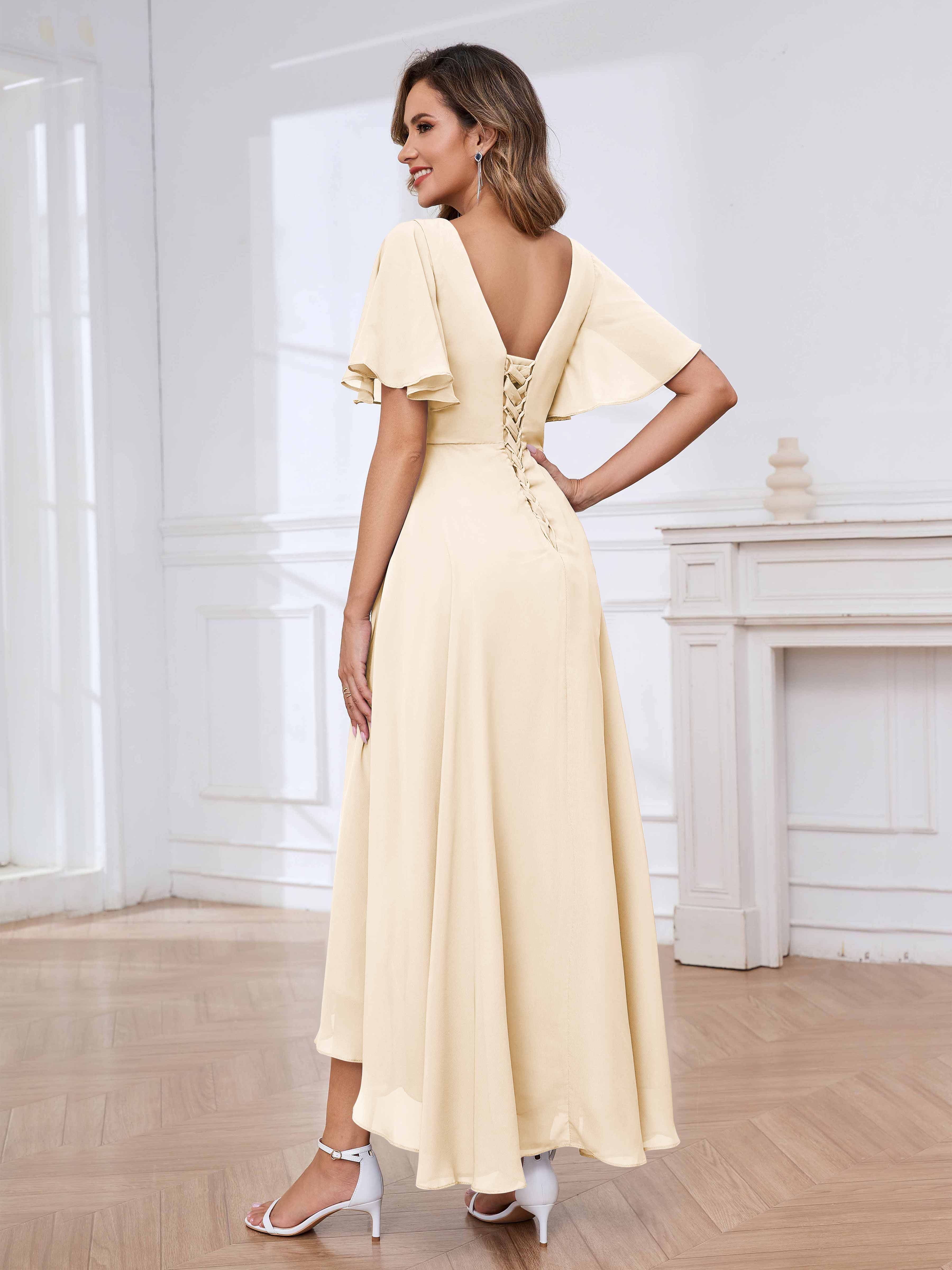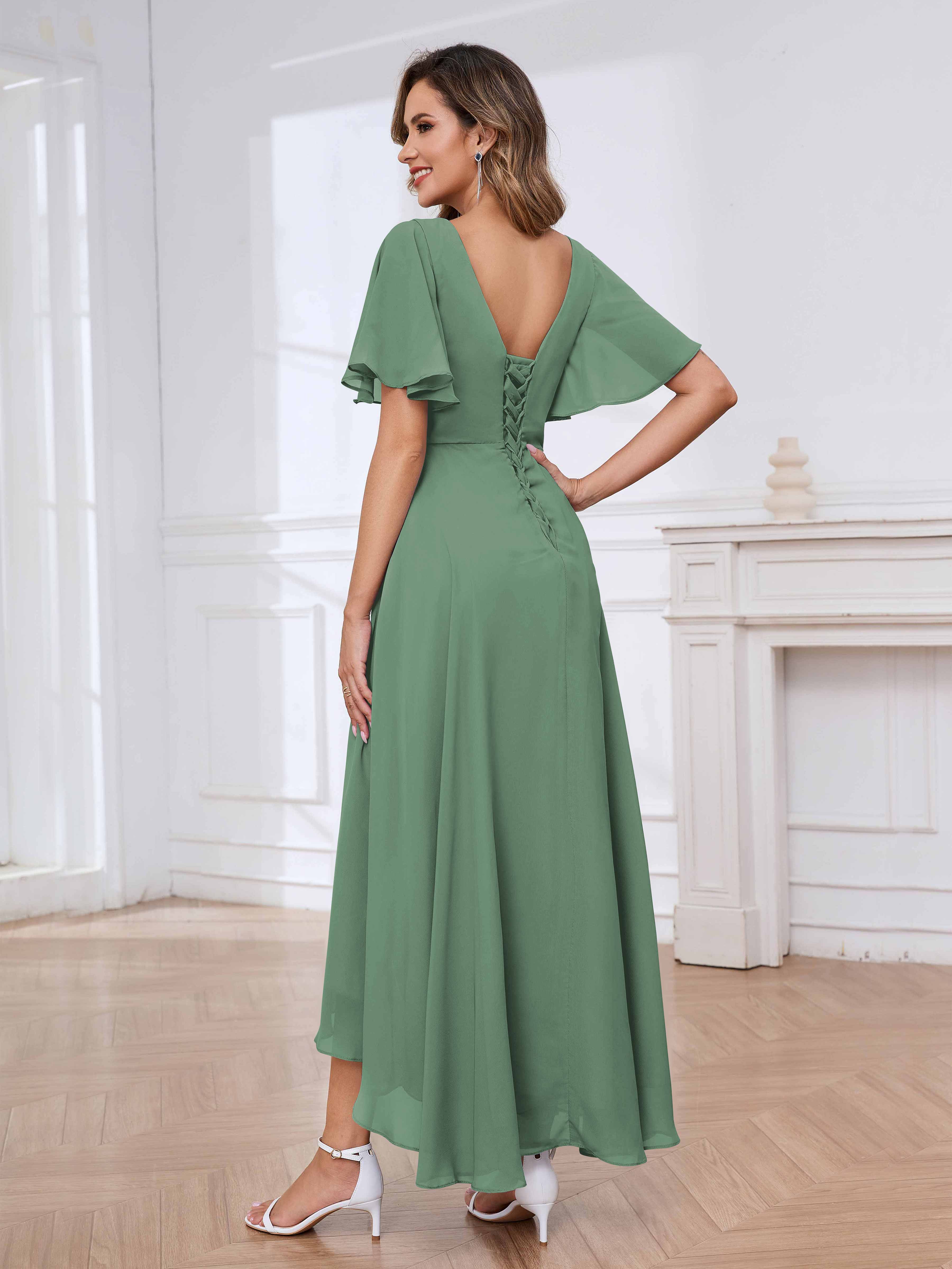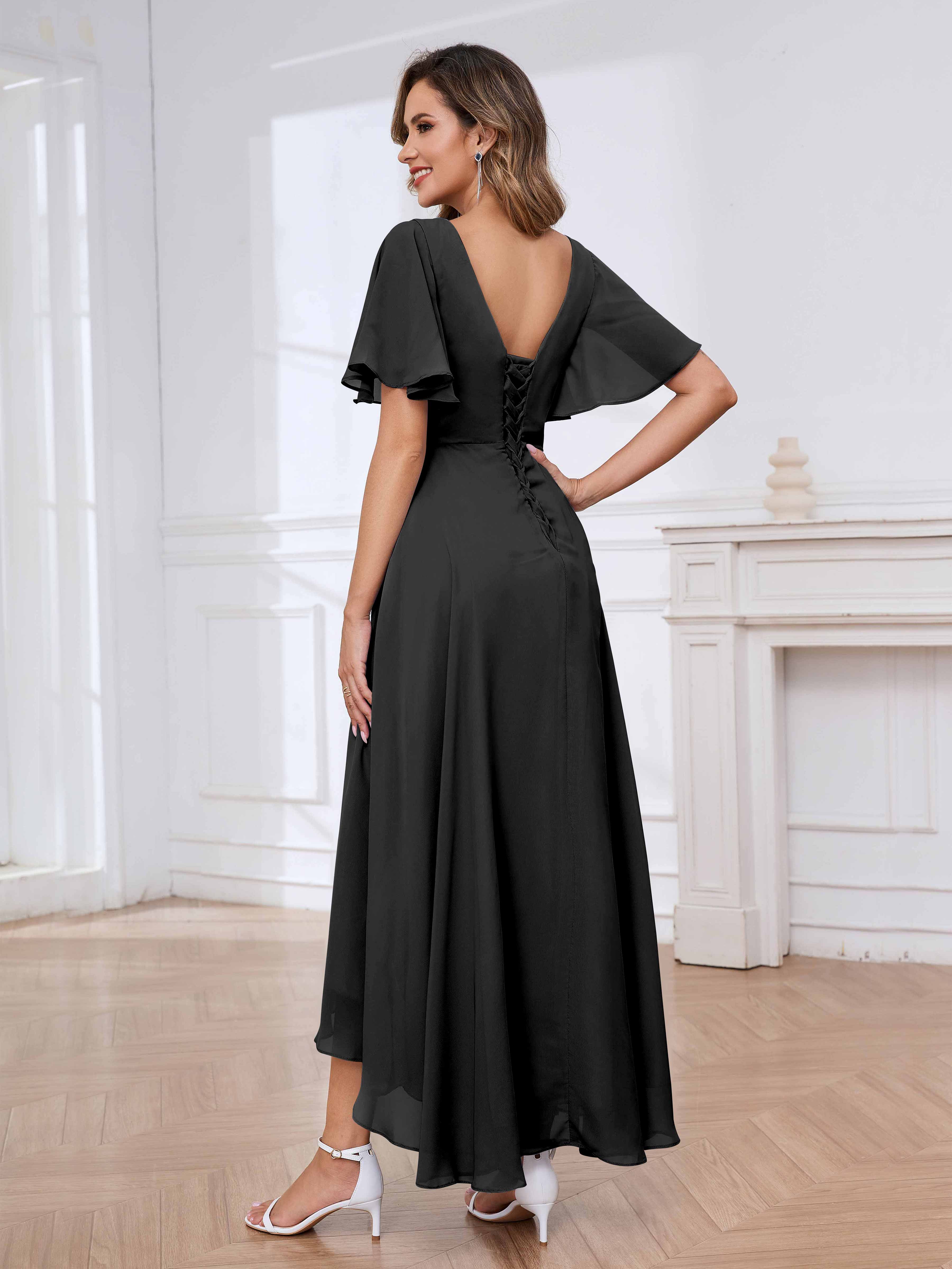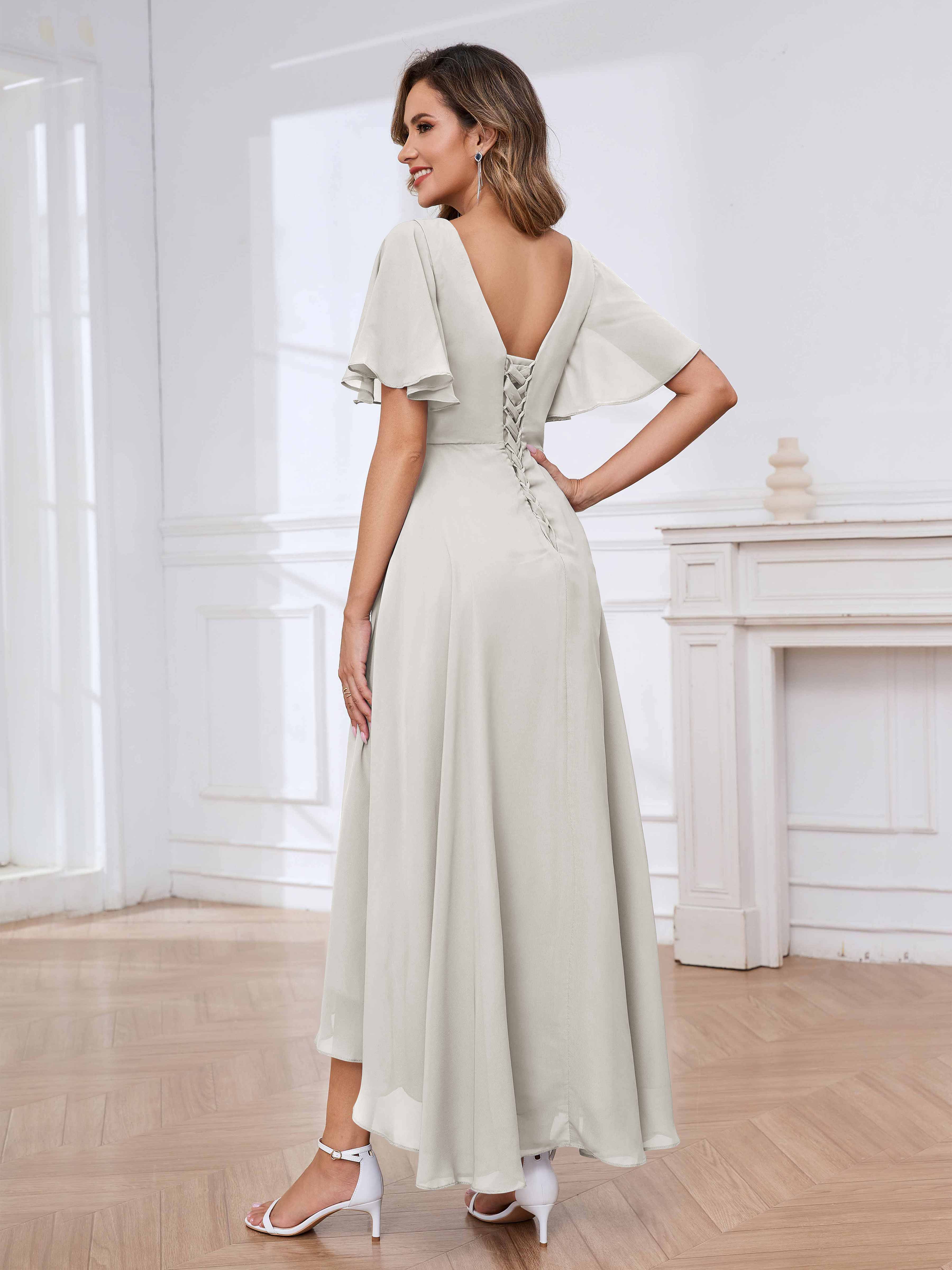 Abby Graceful V Neck Lace Appliques High Low Chiffon Mother of the Bride Dresses