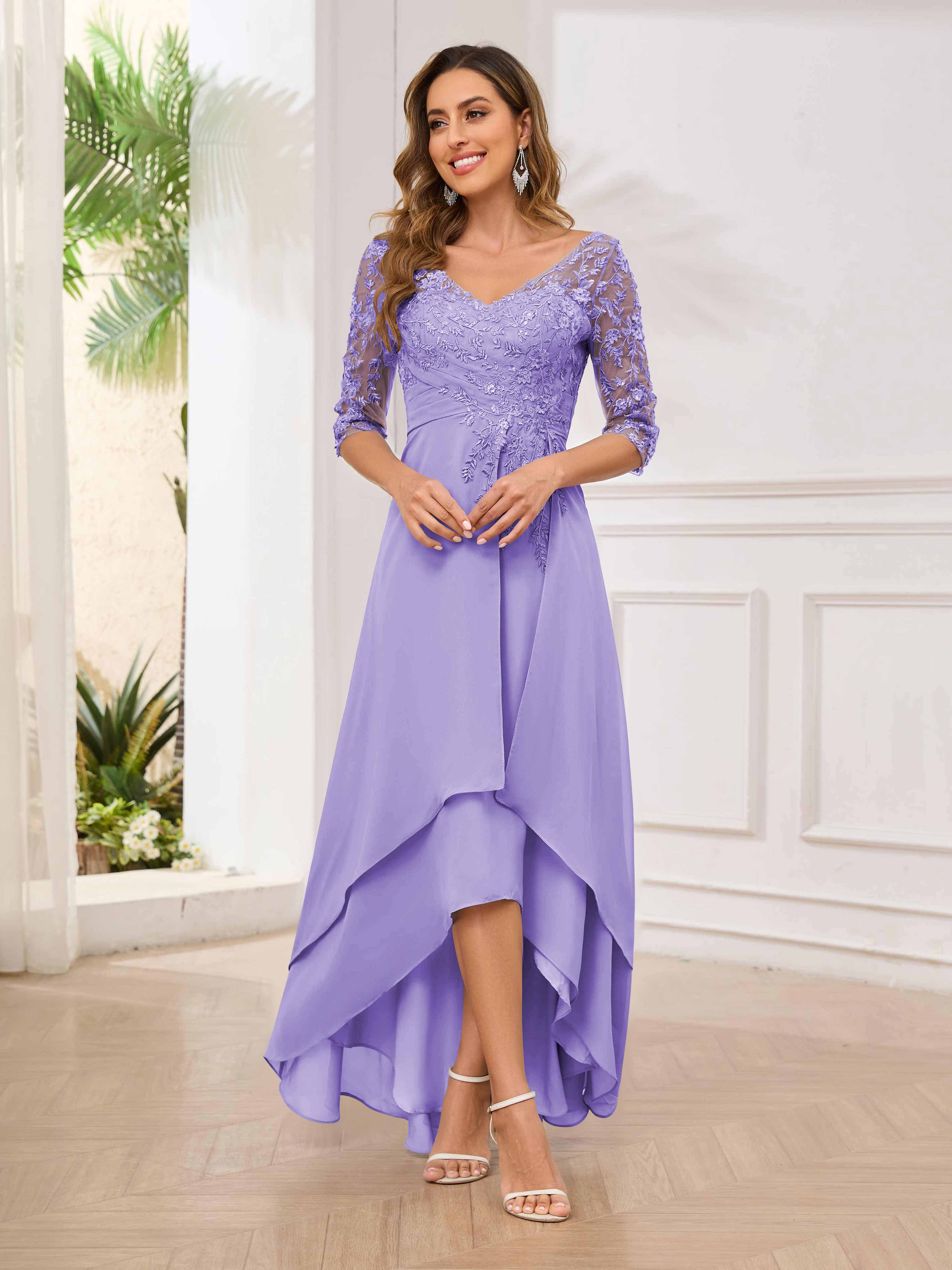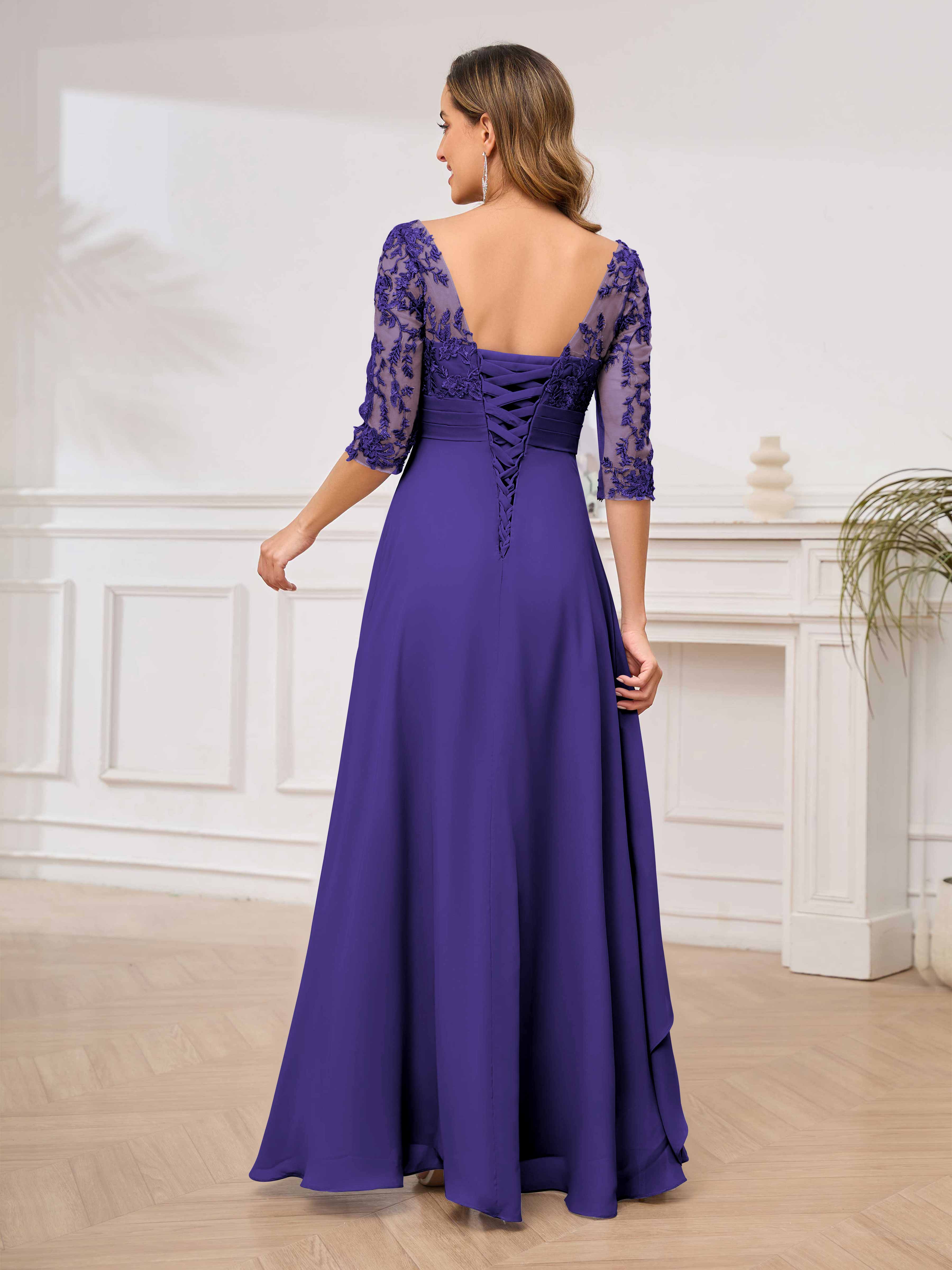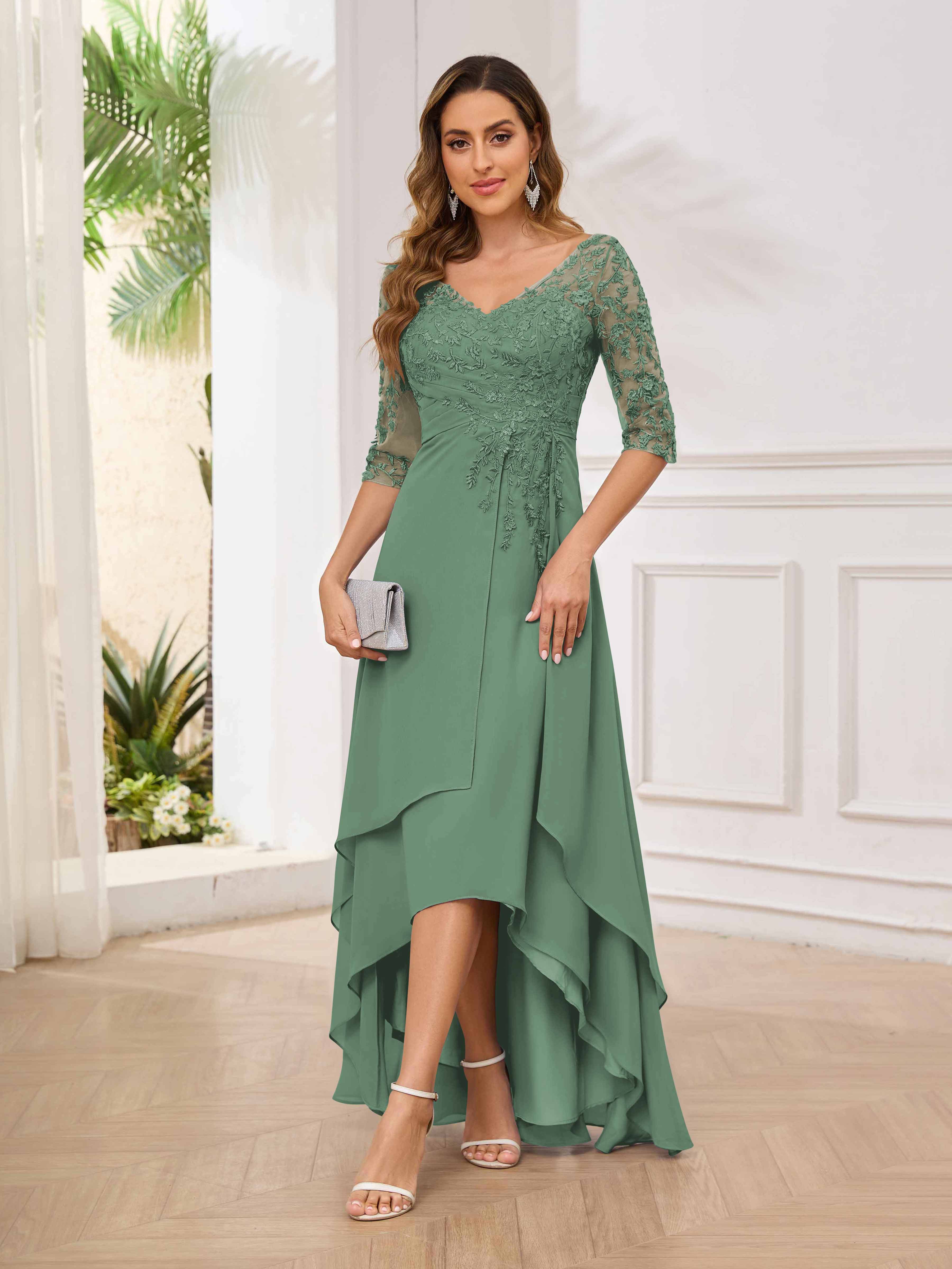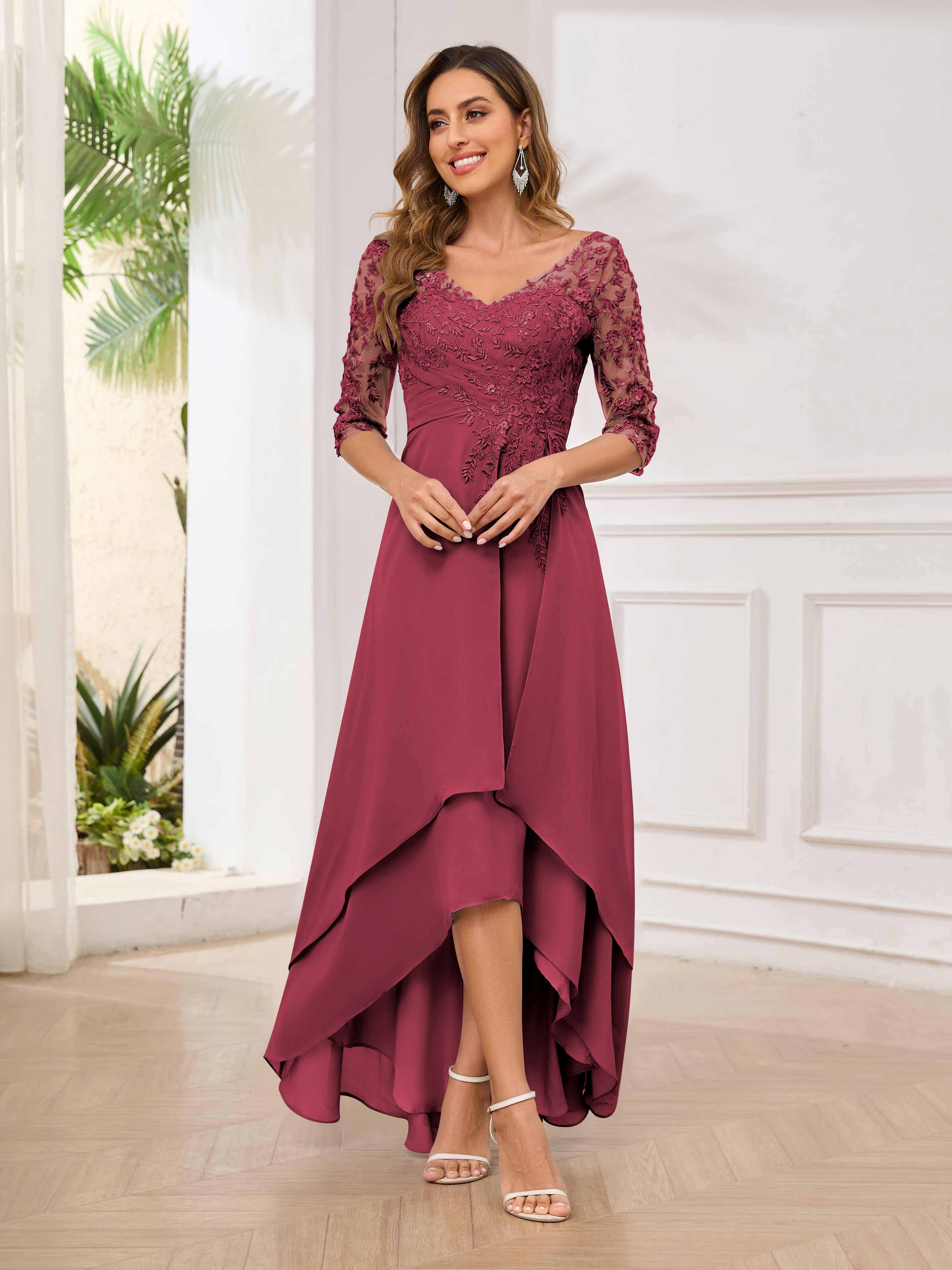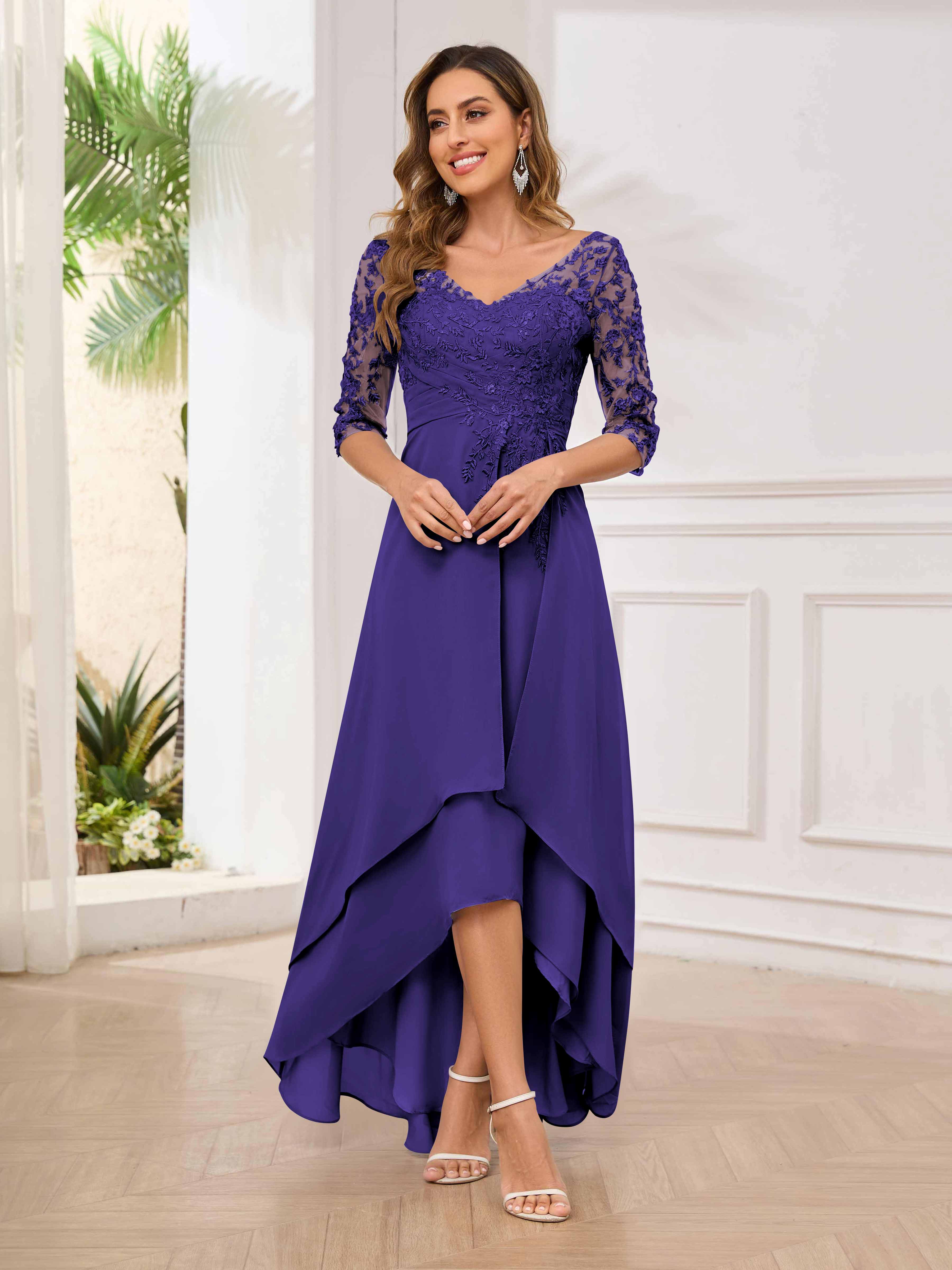 Featuring a flattering v-neckline, intricate appliques, and ruched detailing, this dress is both stylish and comfortable. Perfect for any mother of the bride looking to make a statement.