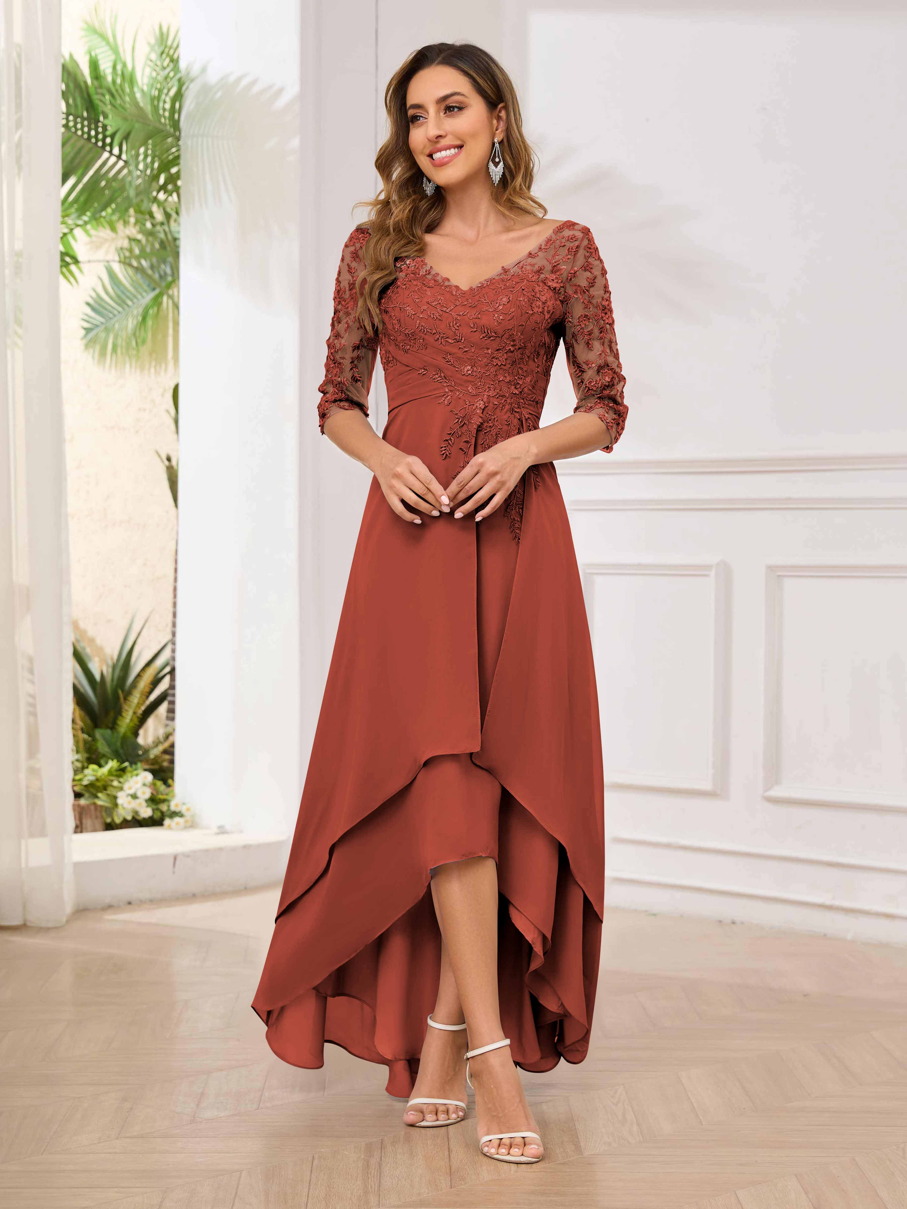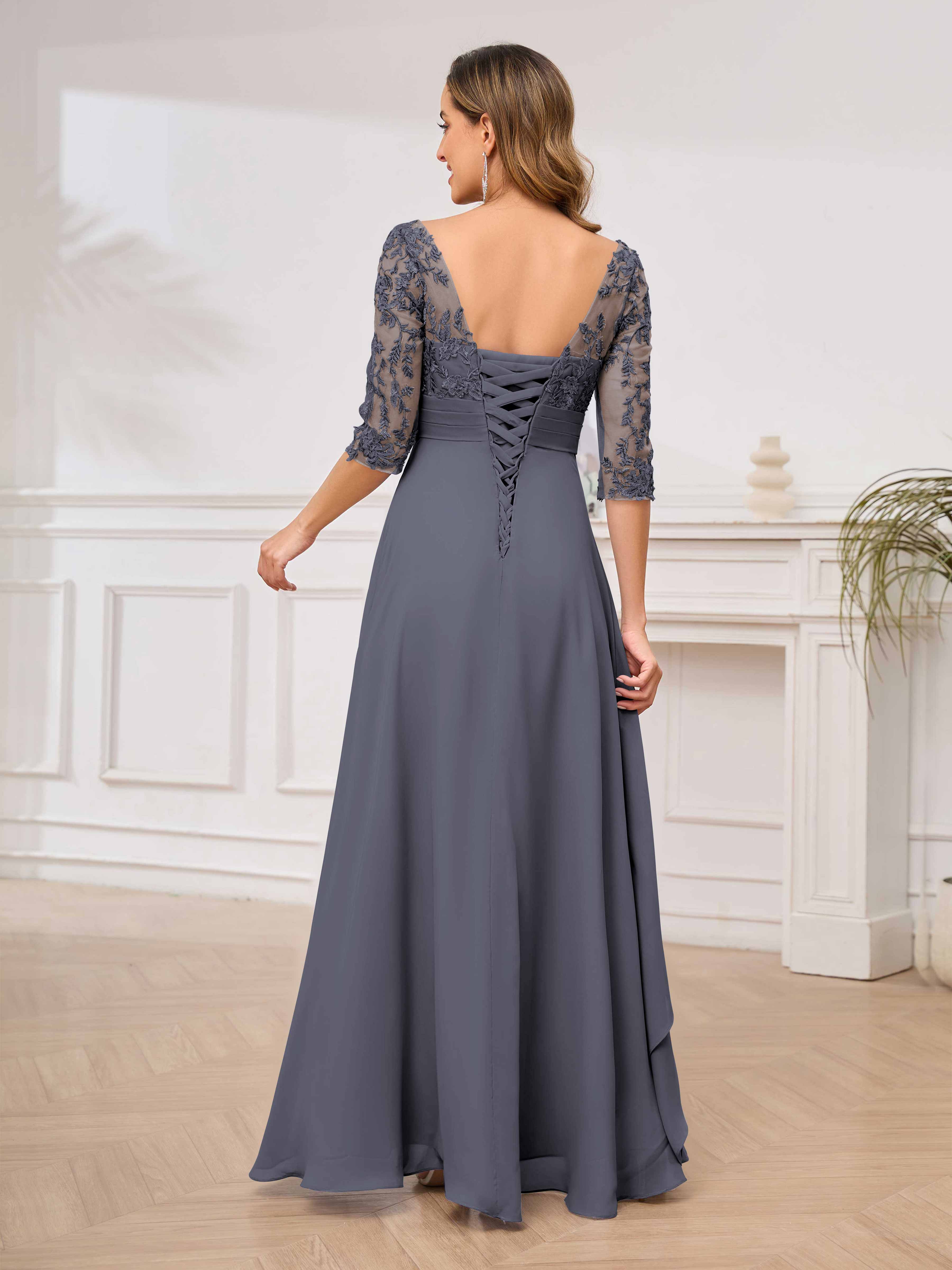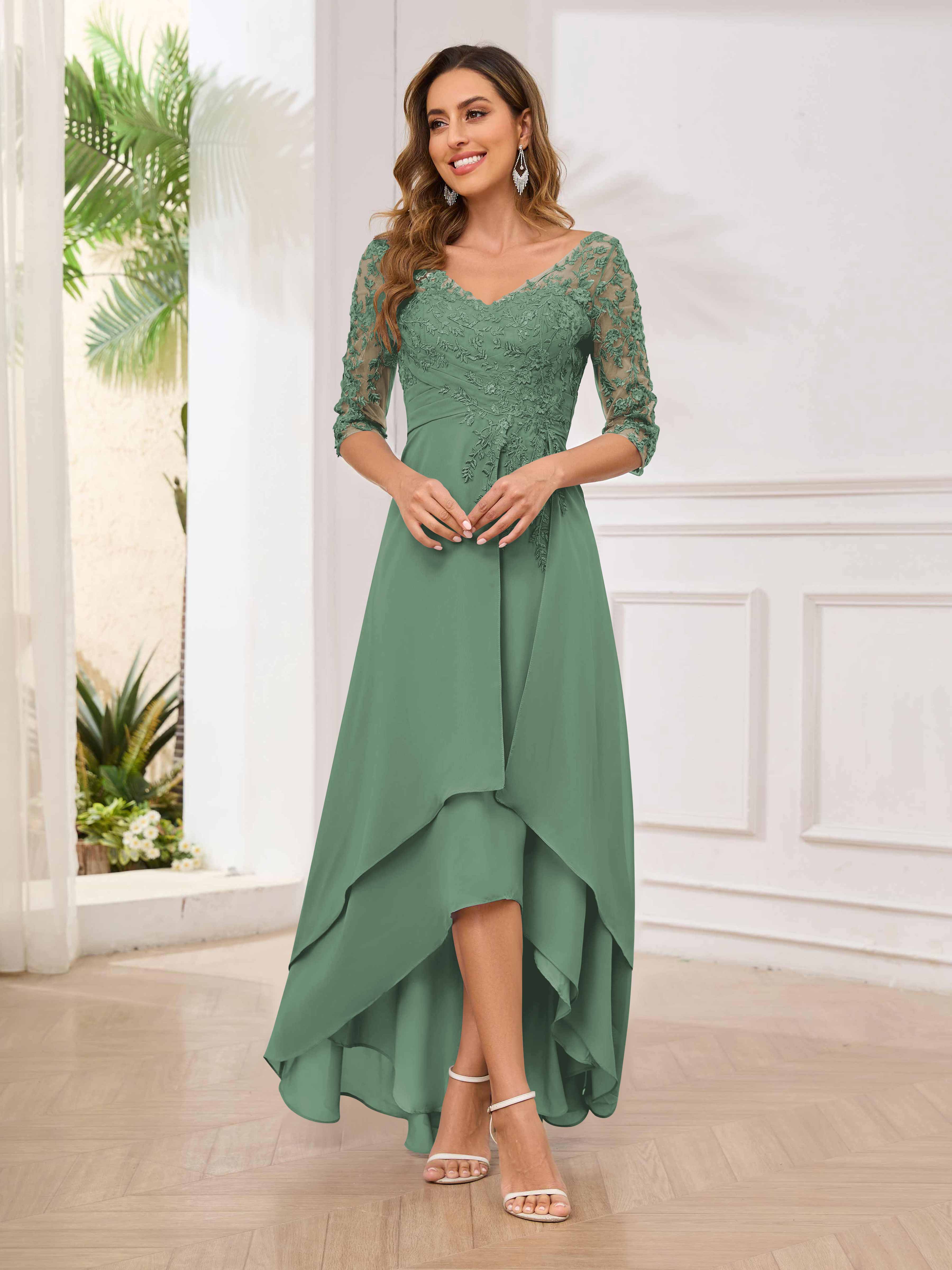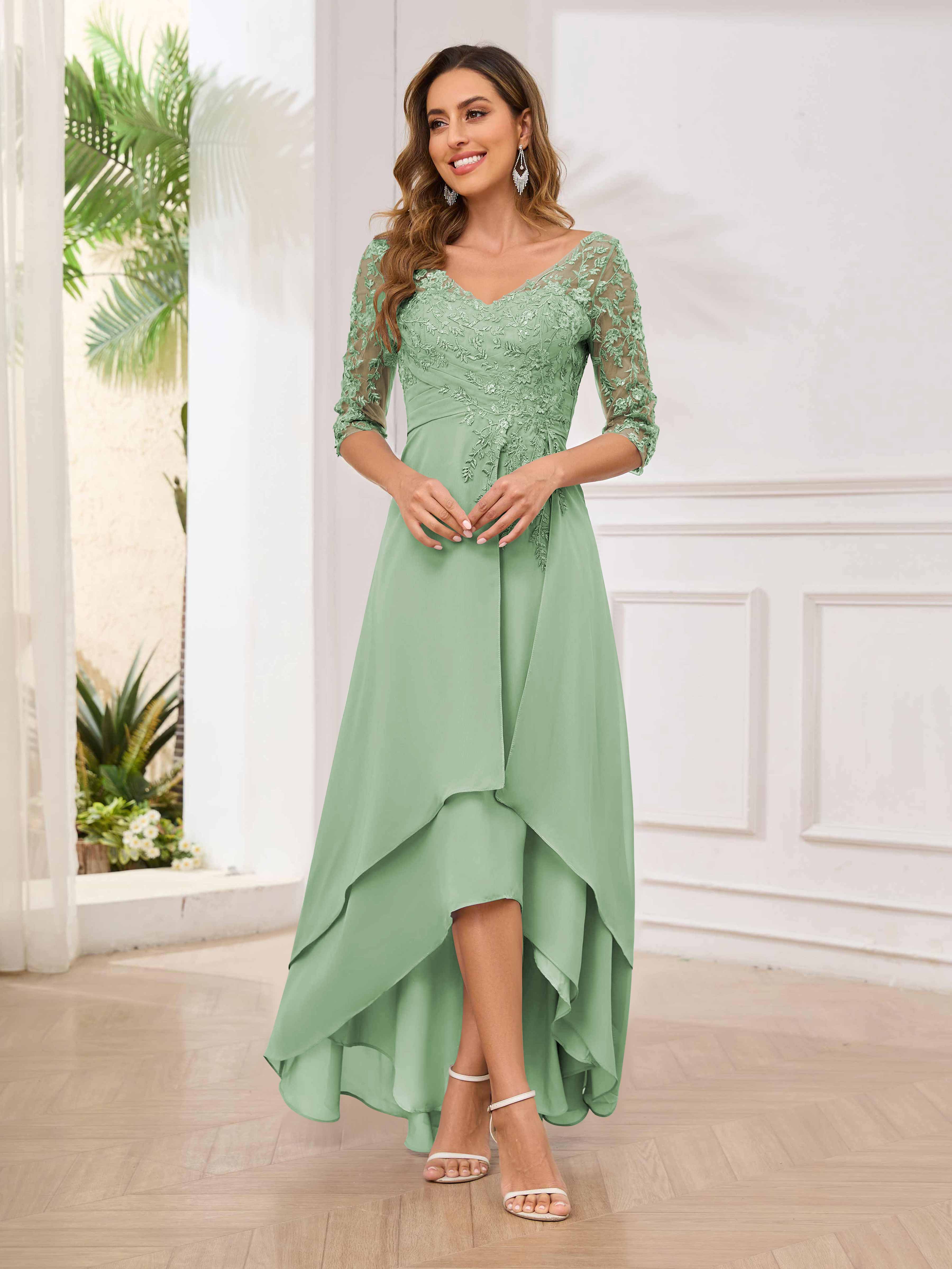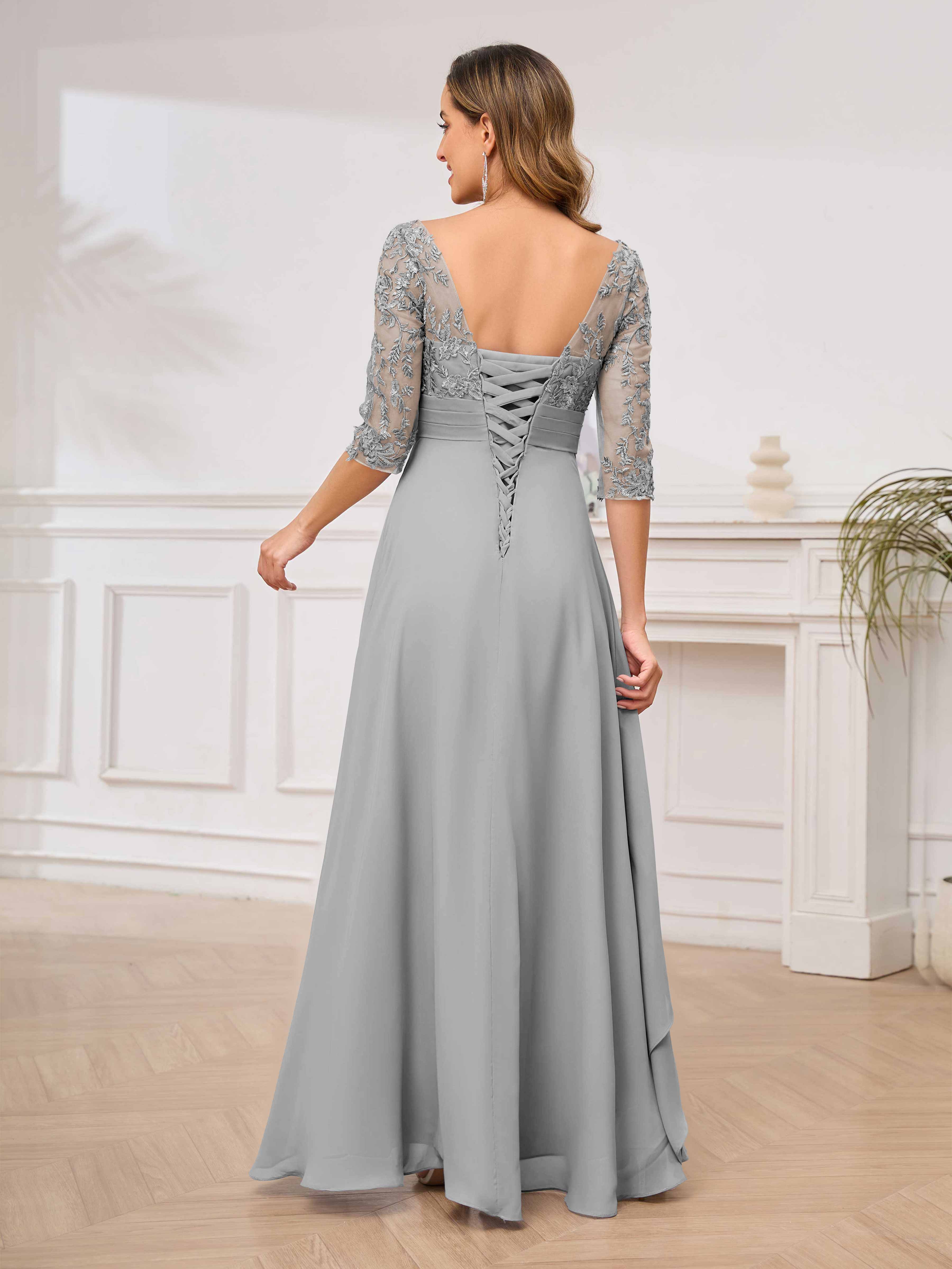 Featuring a flattering v-neckline, intricate appliques, and ruched detailing, this dress is both stylish and comfortable. Perfect for any mother of the bride looking to make a statement.
