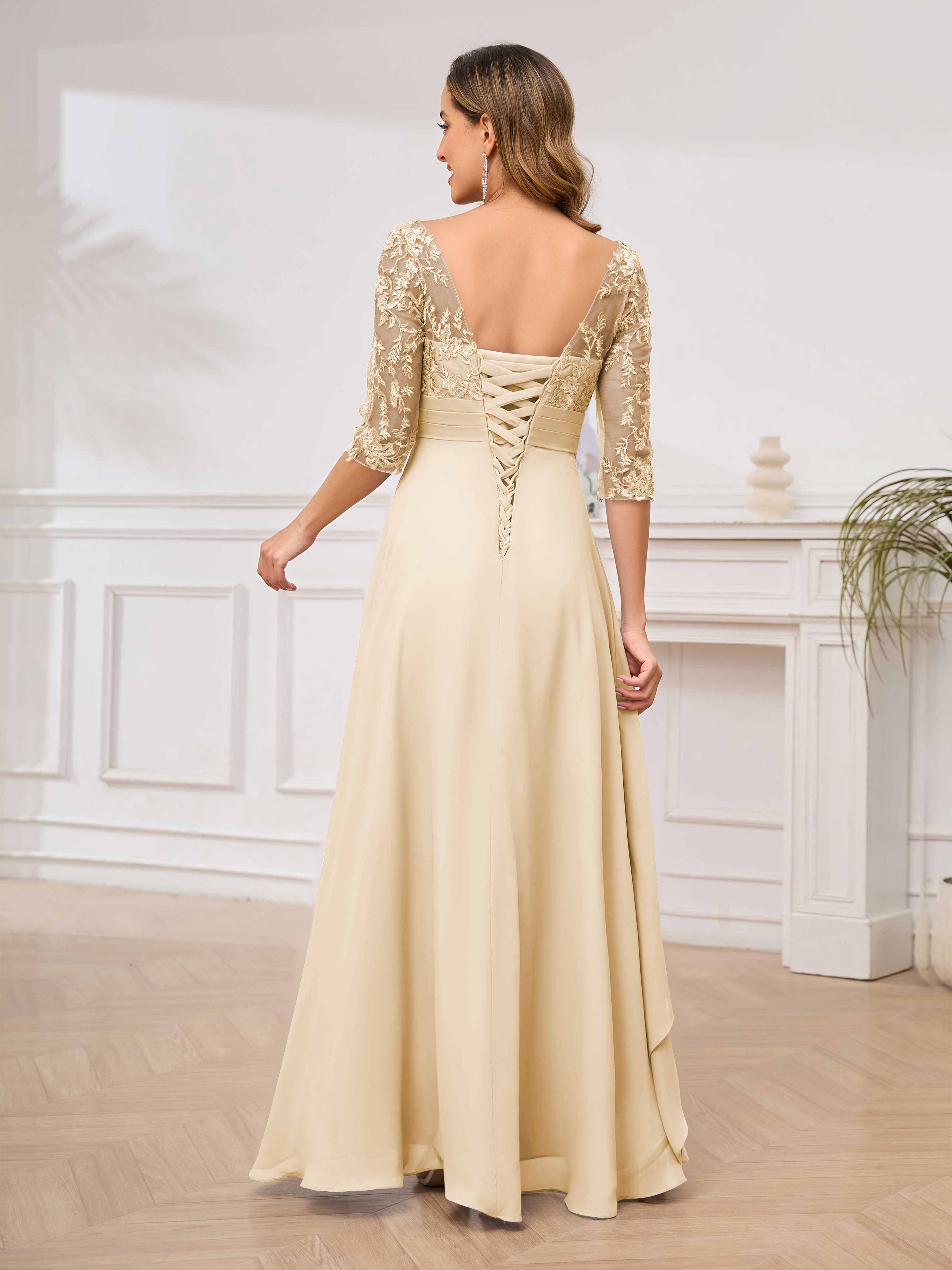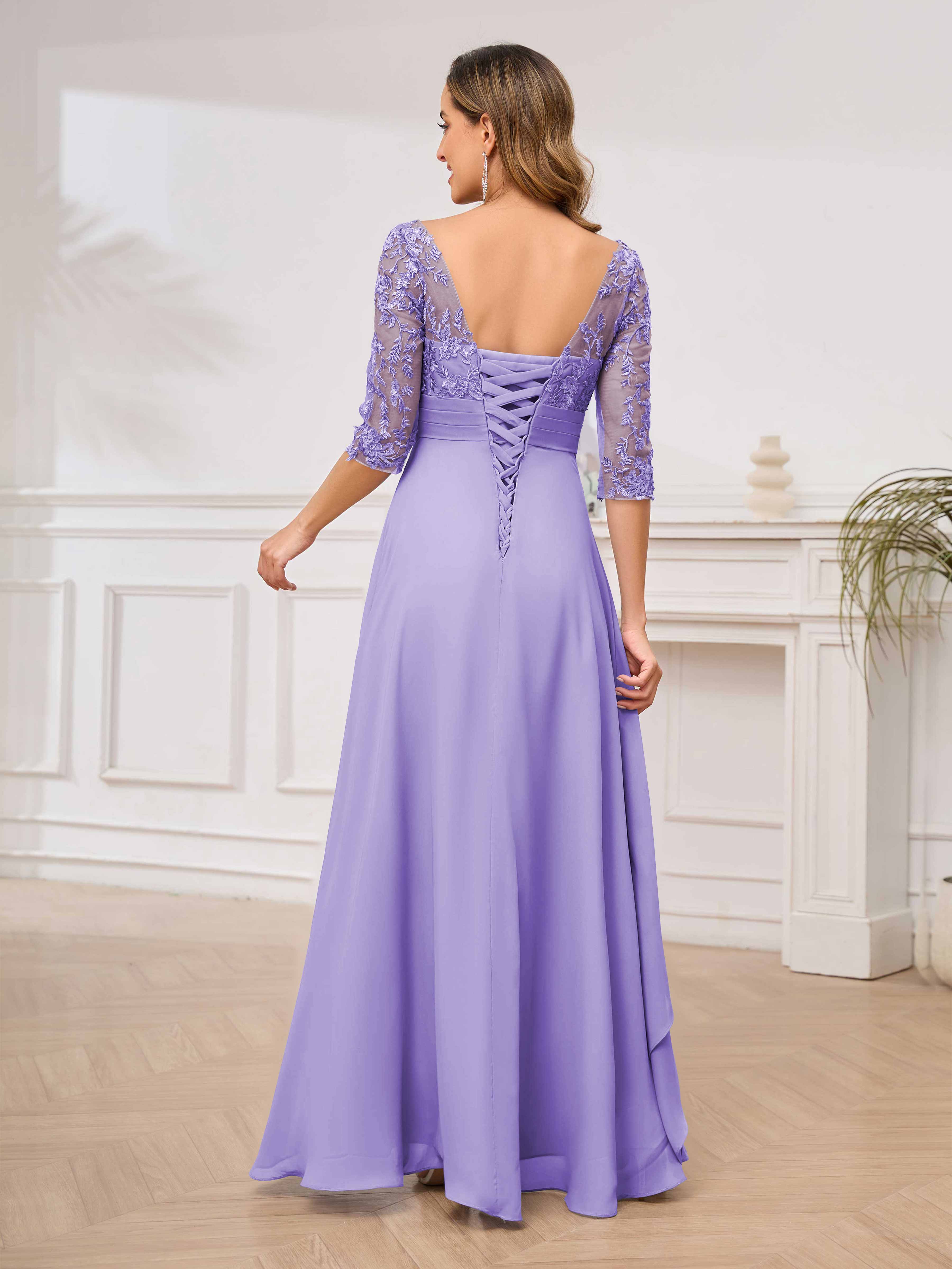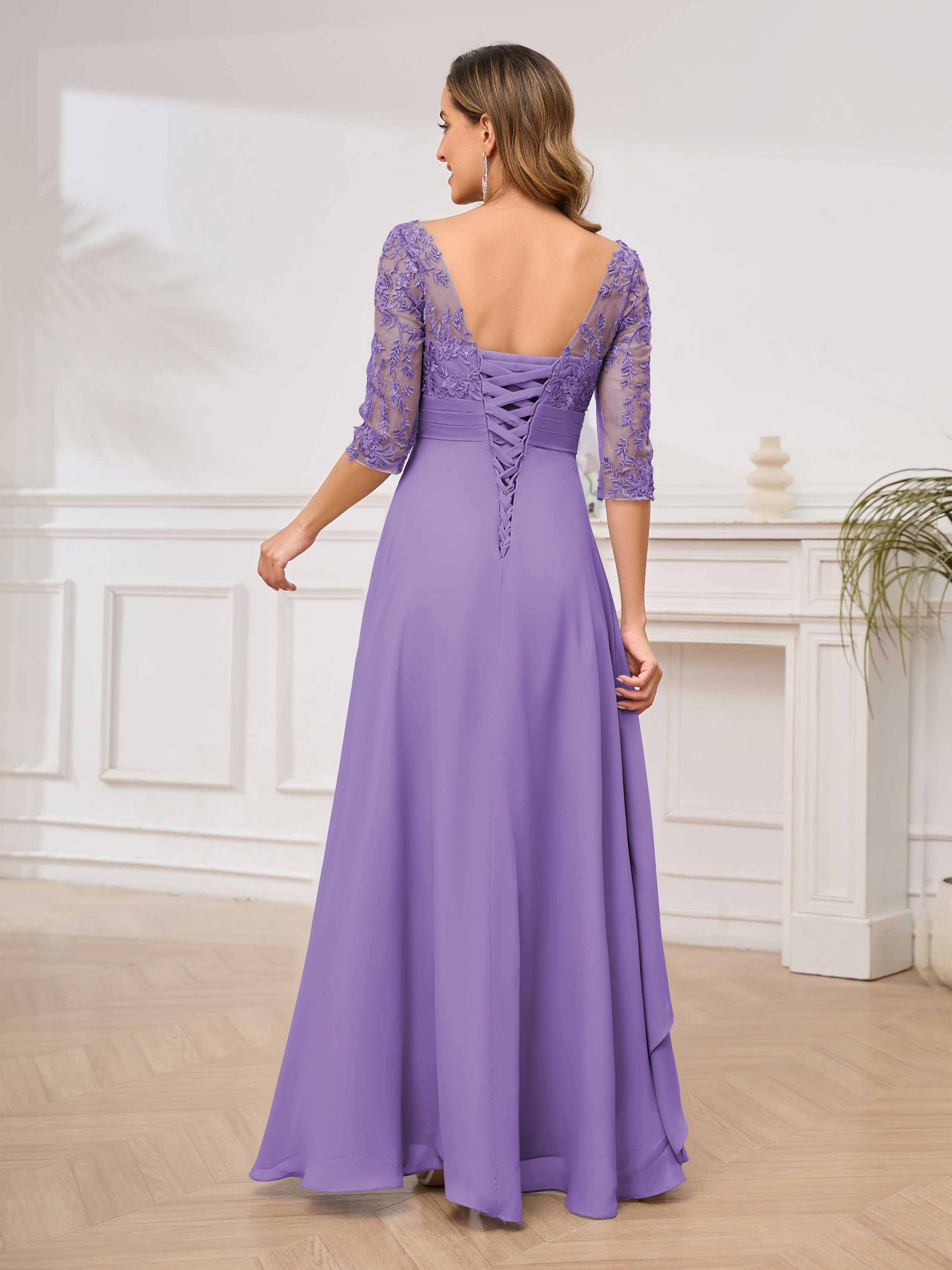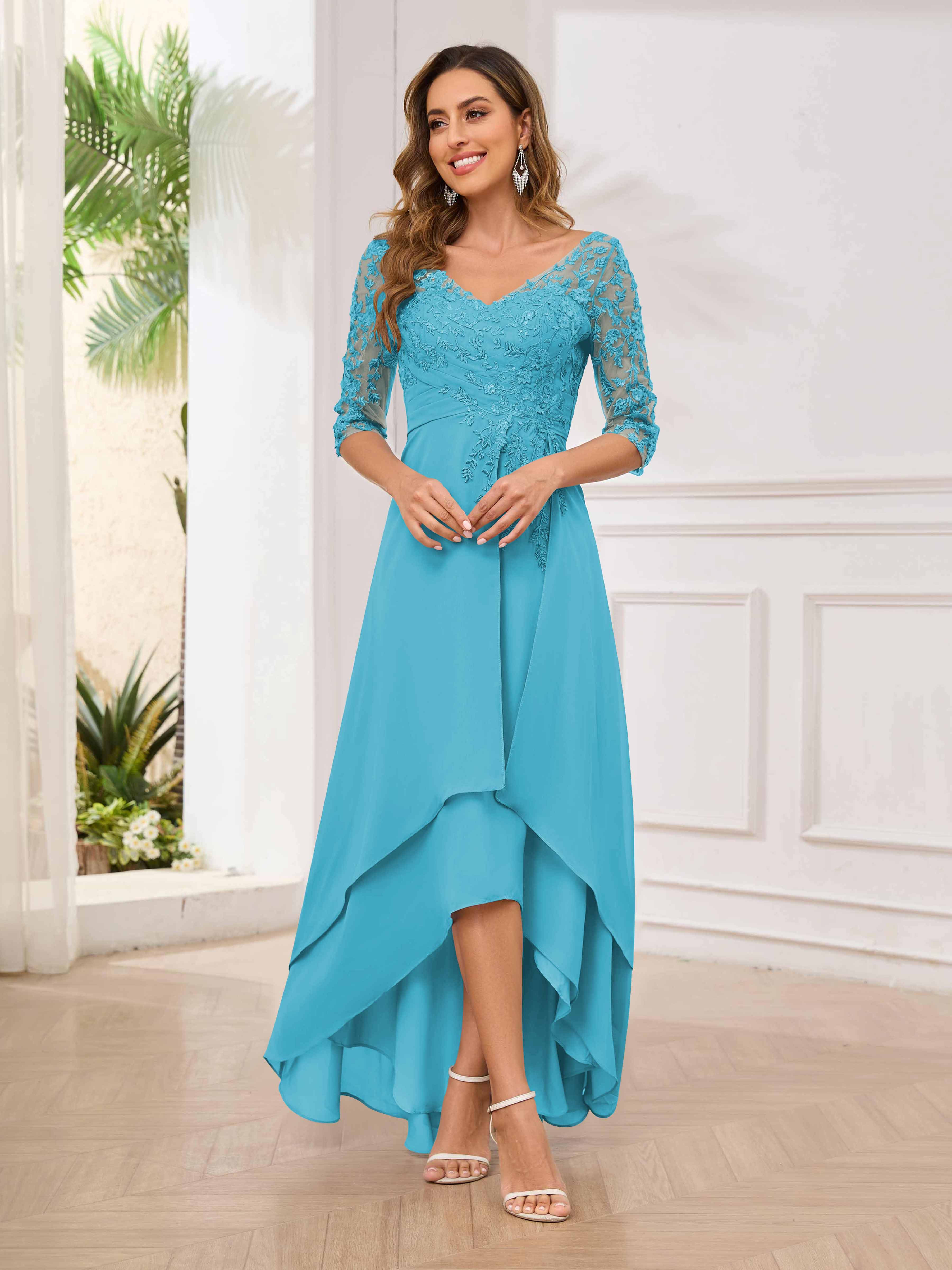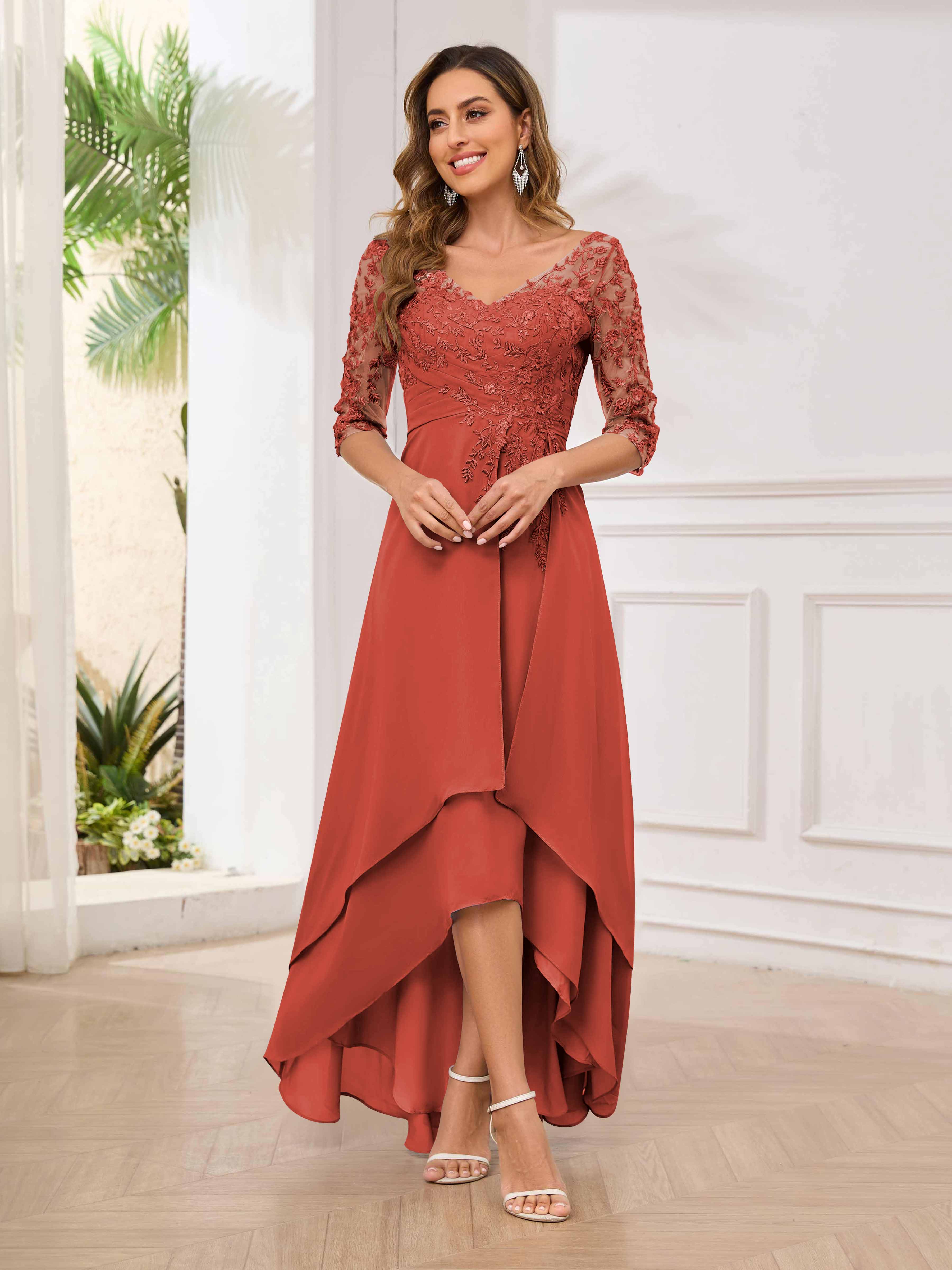 Featuring a flattering v-neckline, intricate appliques, and ruched detailing, this dress is both stylish and comfortable. Perfect for any mother of the bride looking to make a statement.