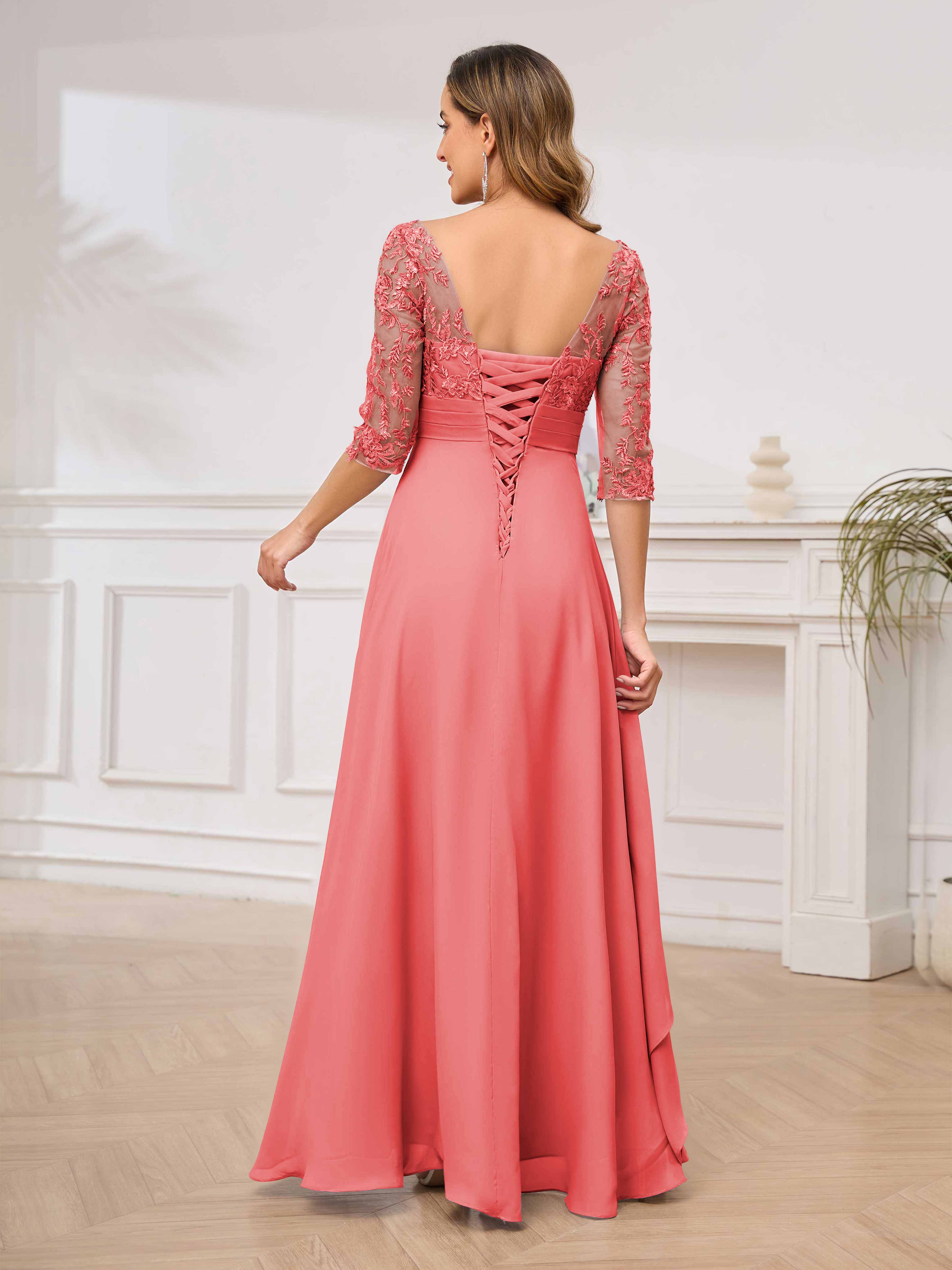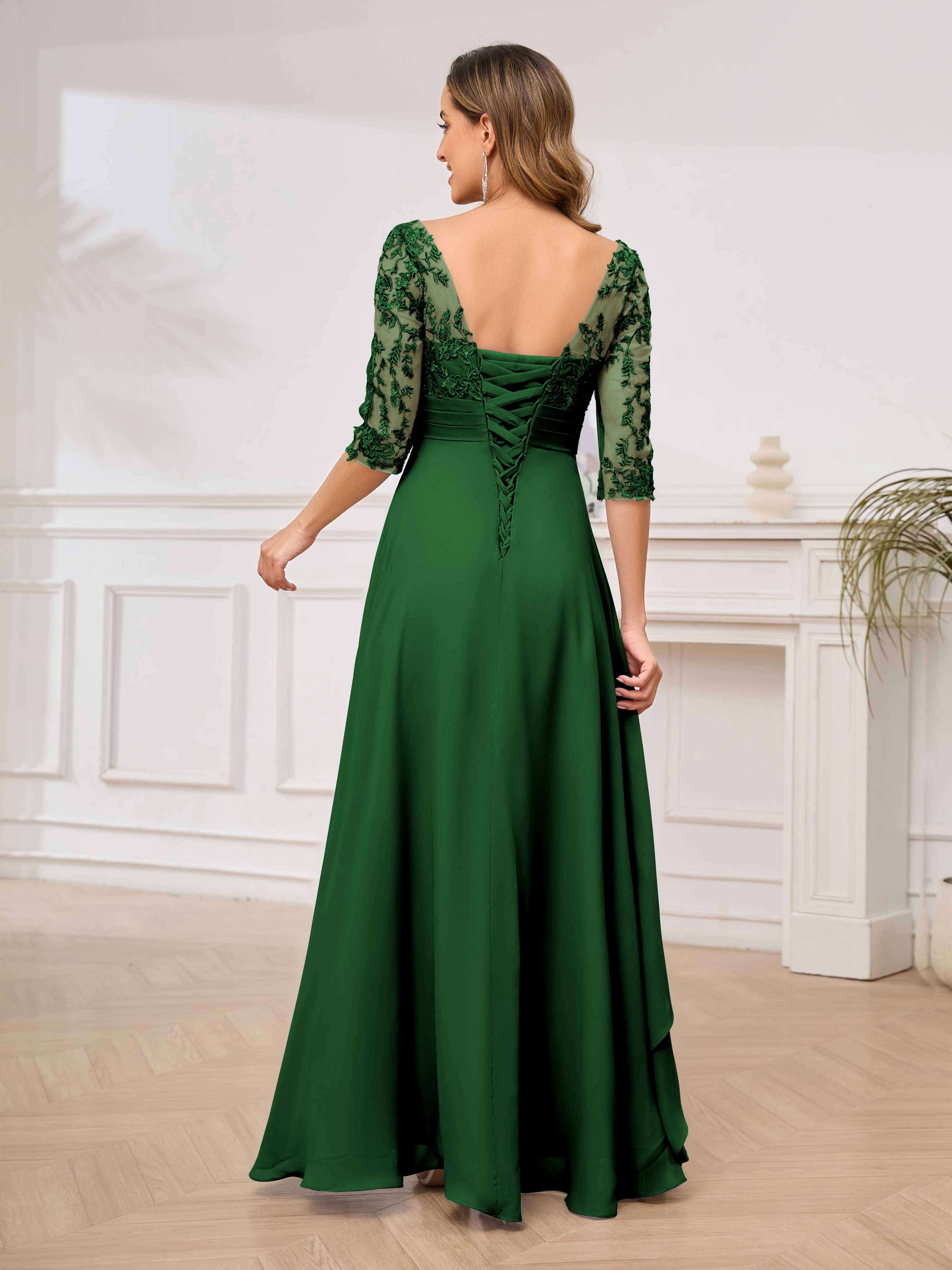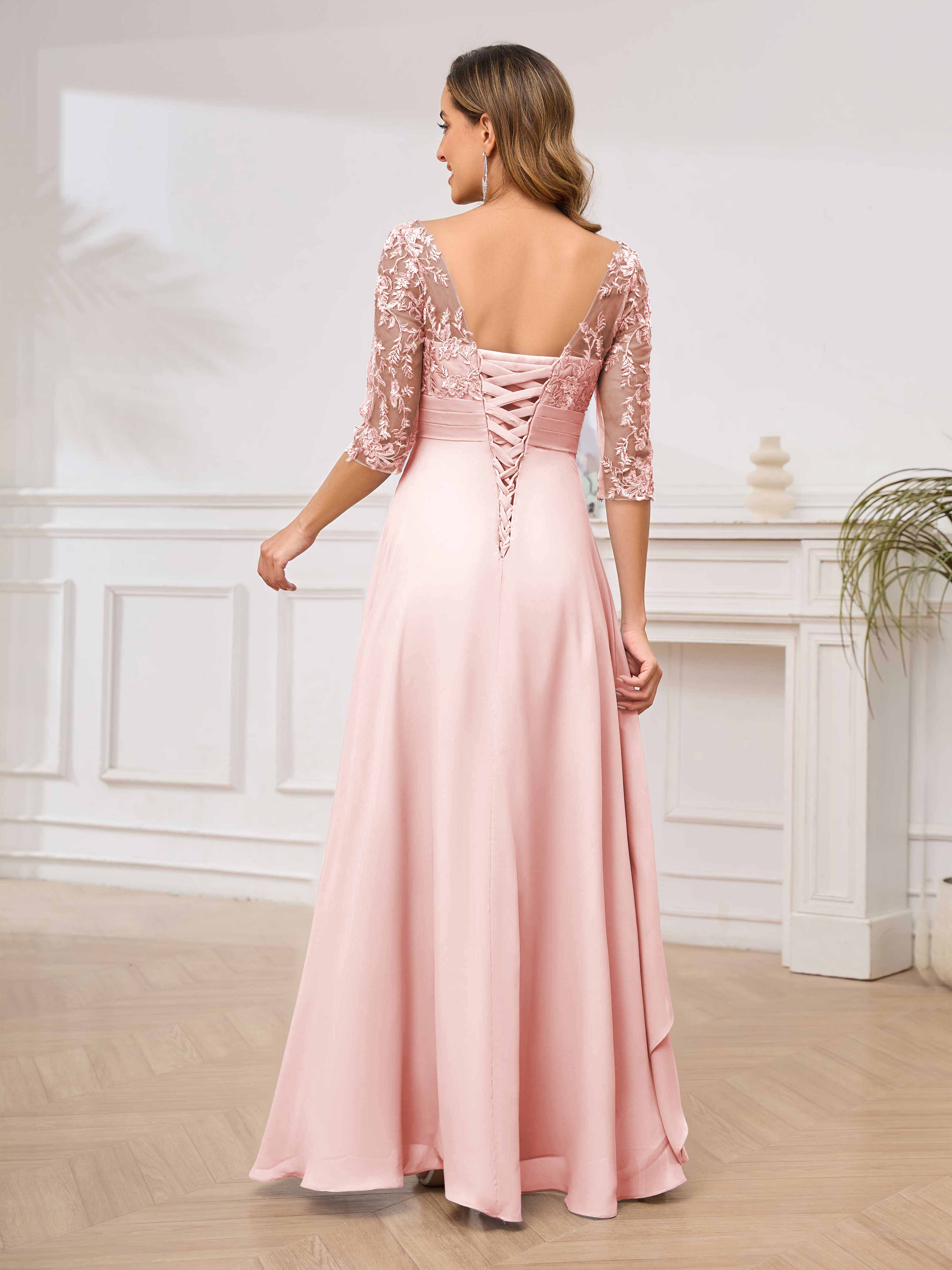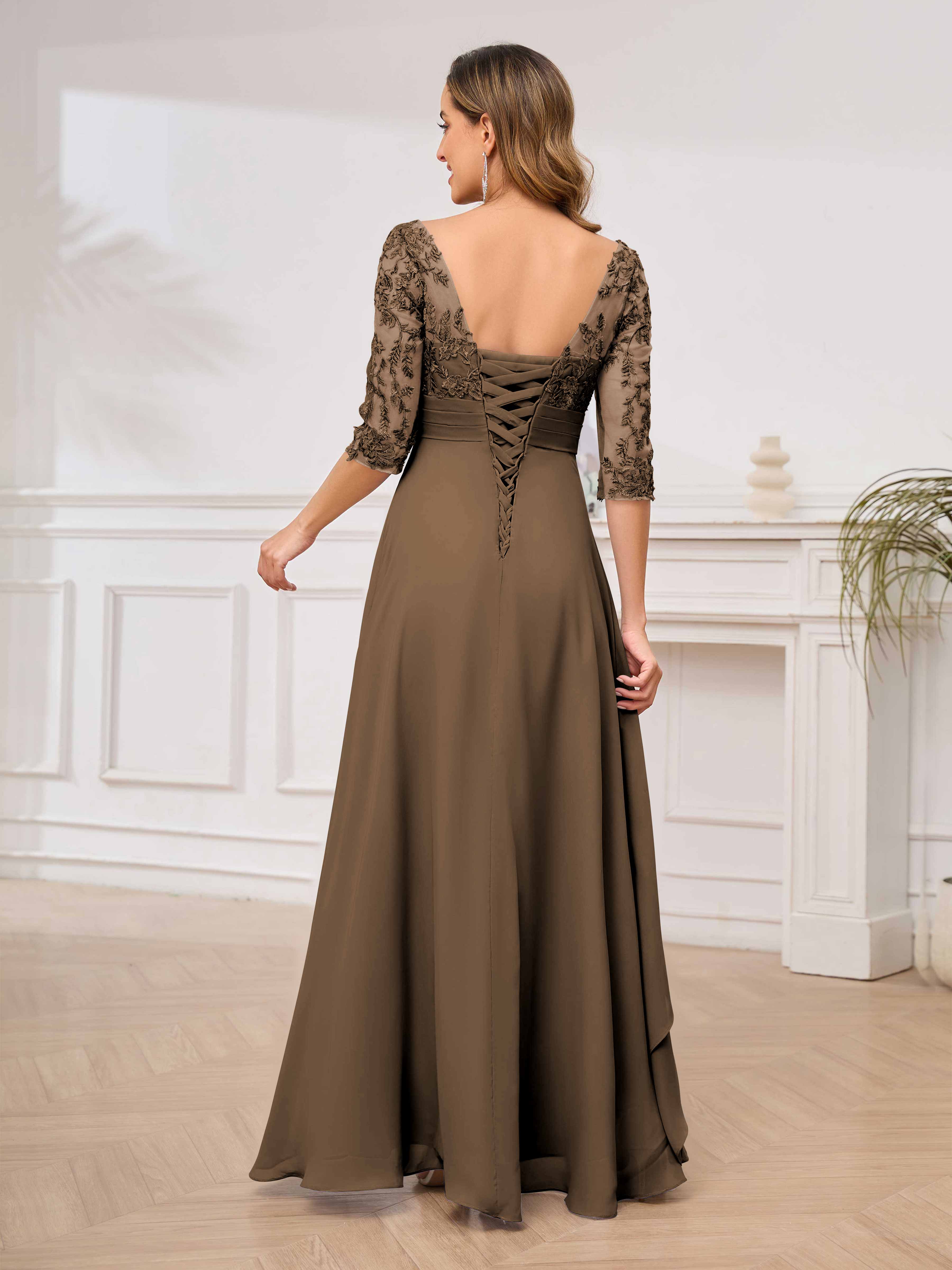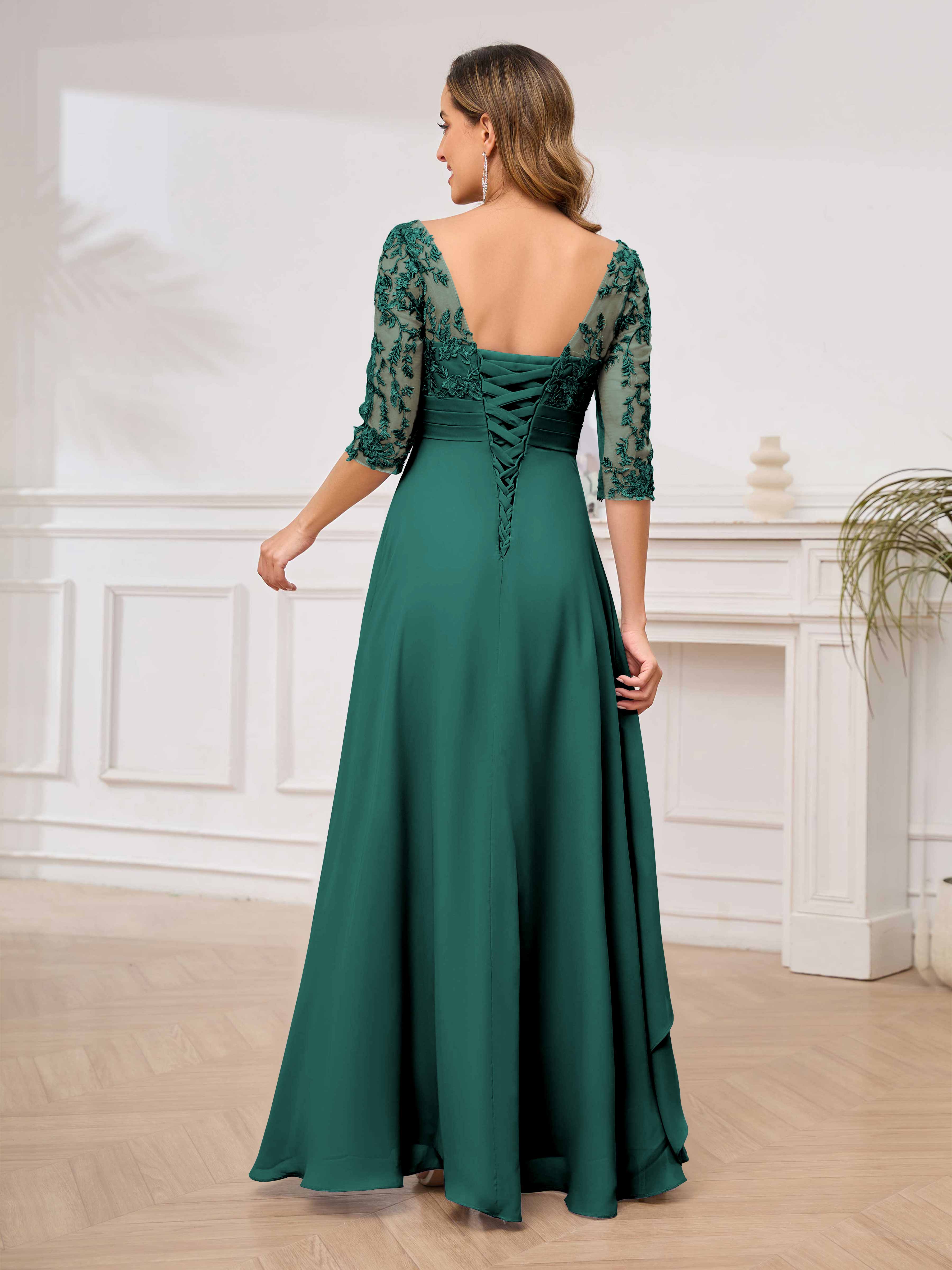 Featuring a flattering v-neckline, intricate appliques, and ruched detailing, this dress is both stylish and comfortable. Perfect for any mother of the bride looking to make a statement.