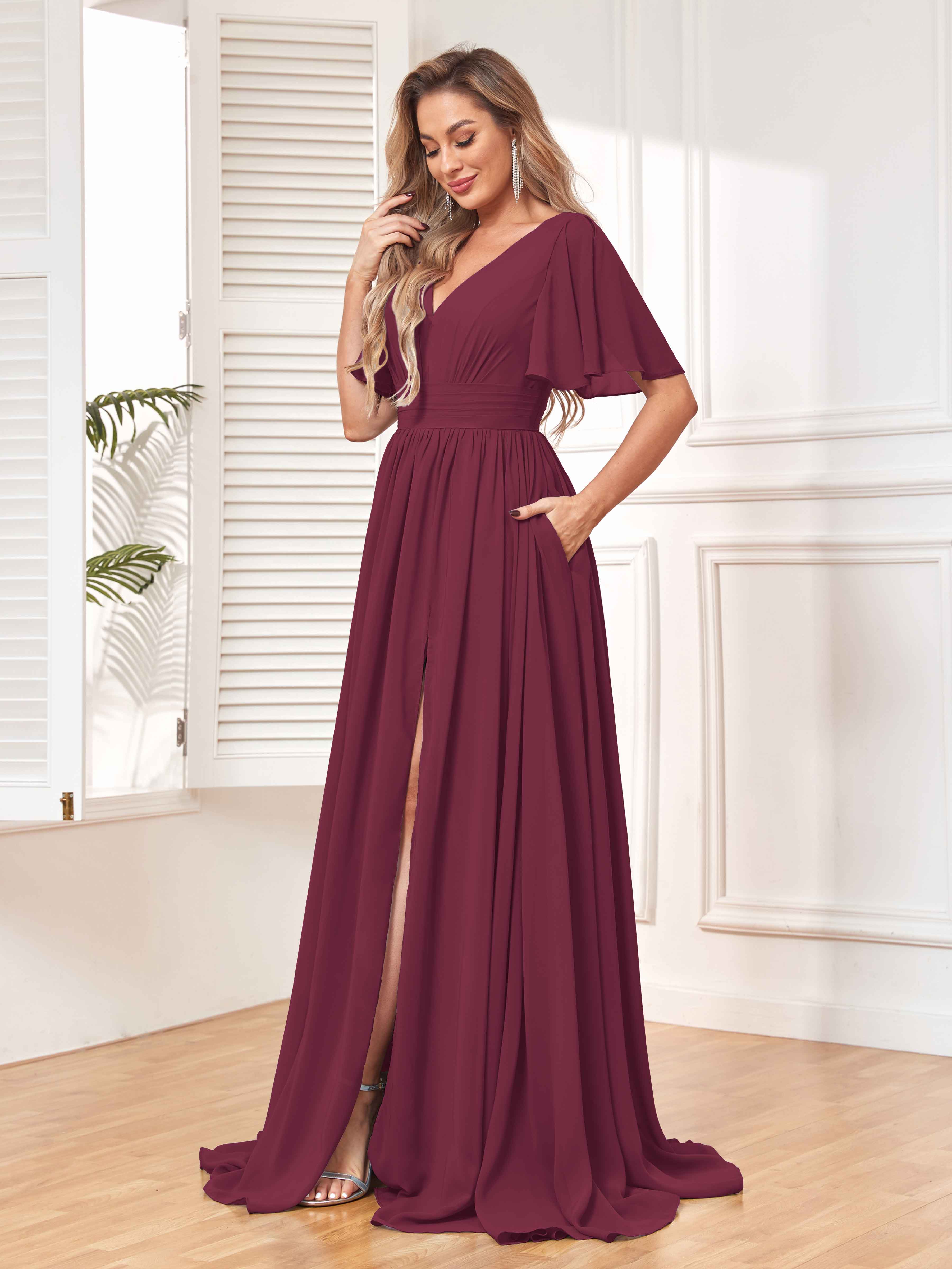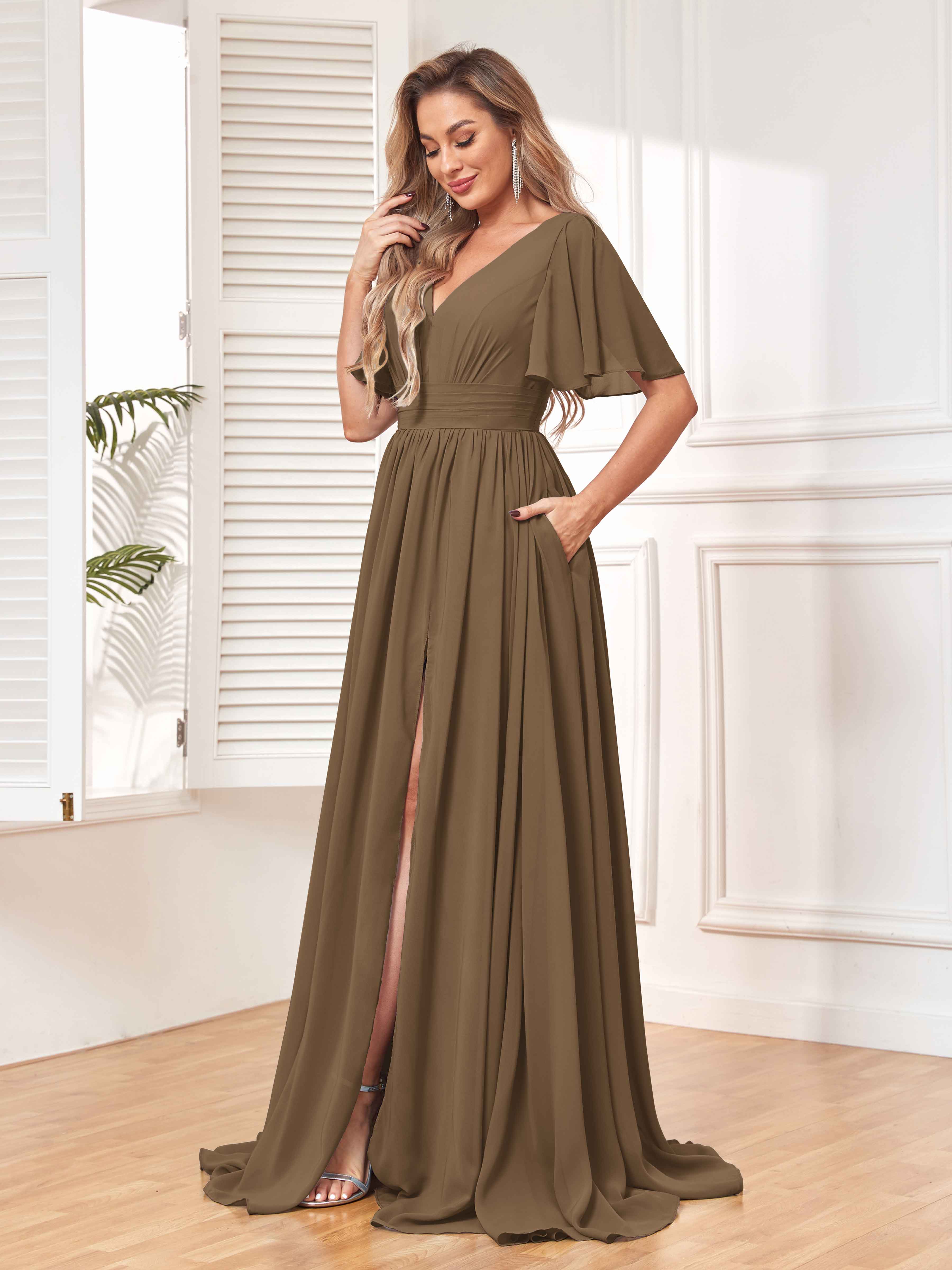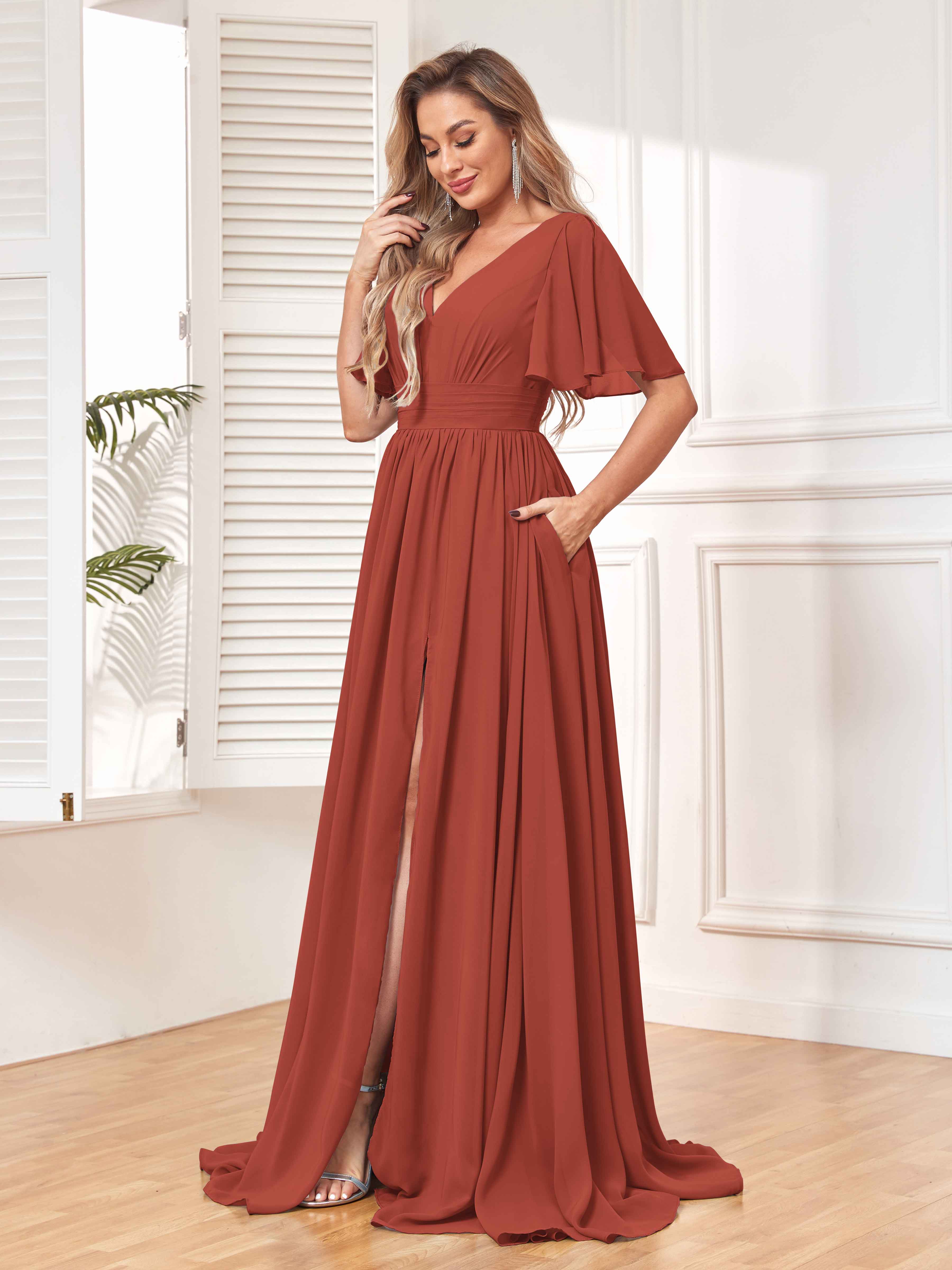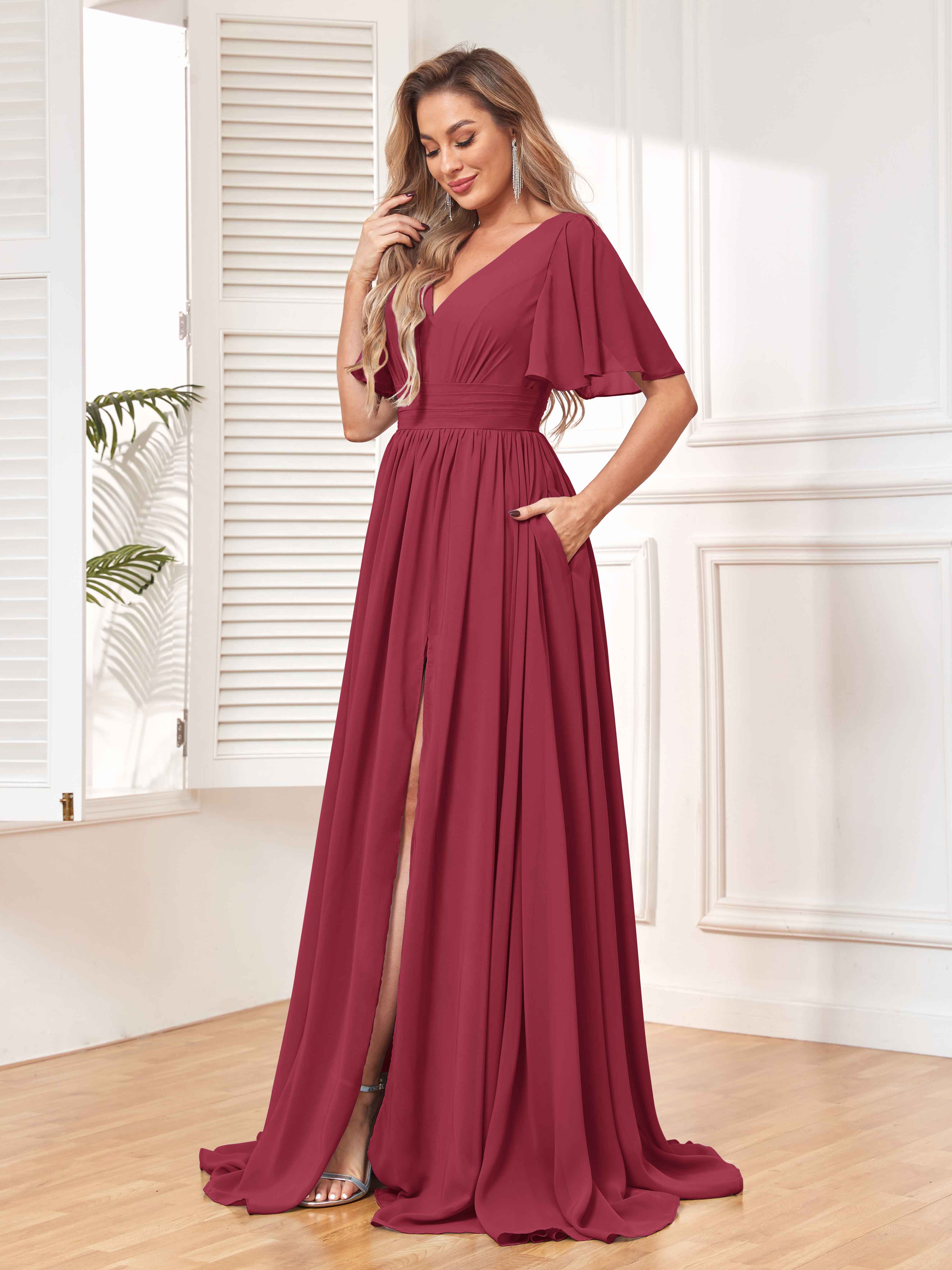 Brooklyn Modest V-Neck Ruched Slit Chiffon Bridesmaid Dresses