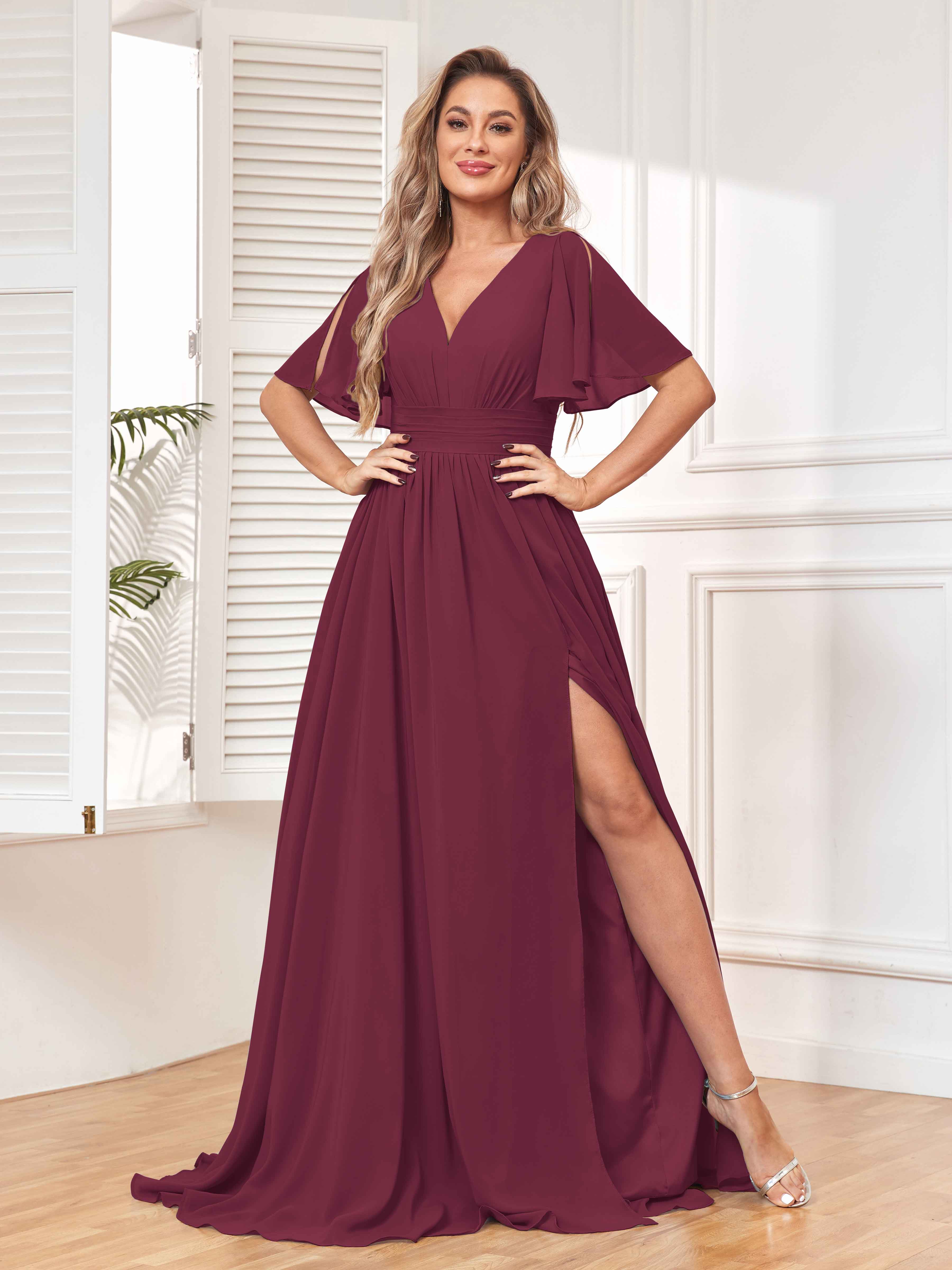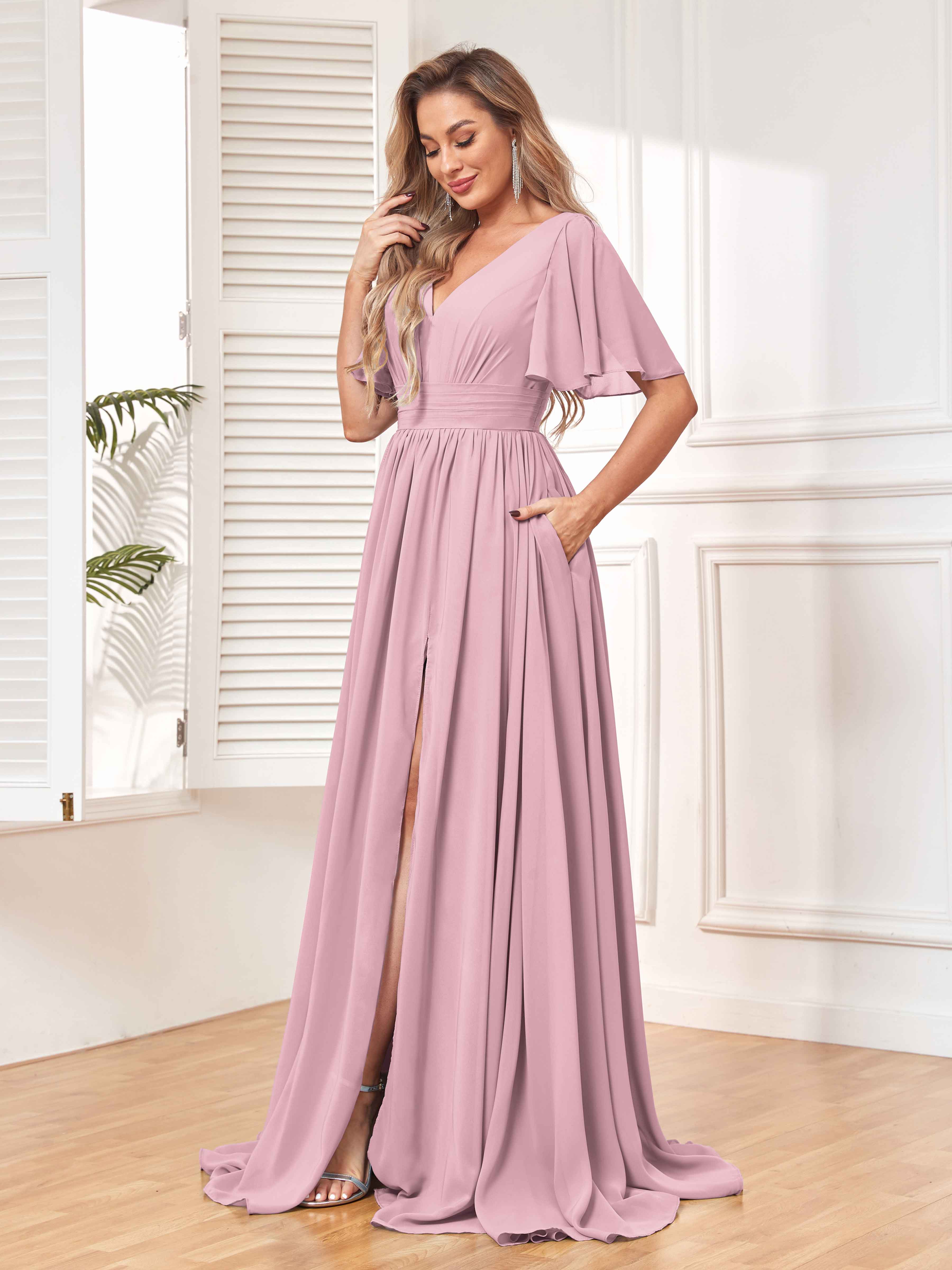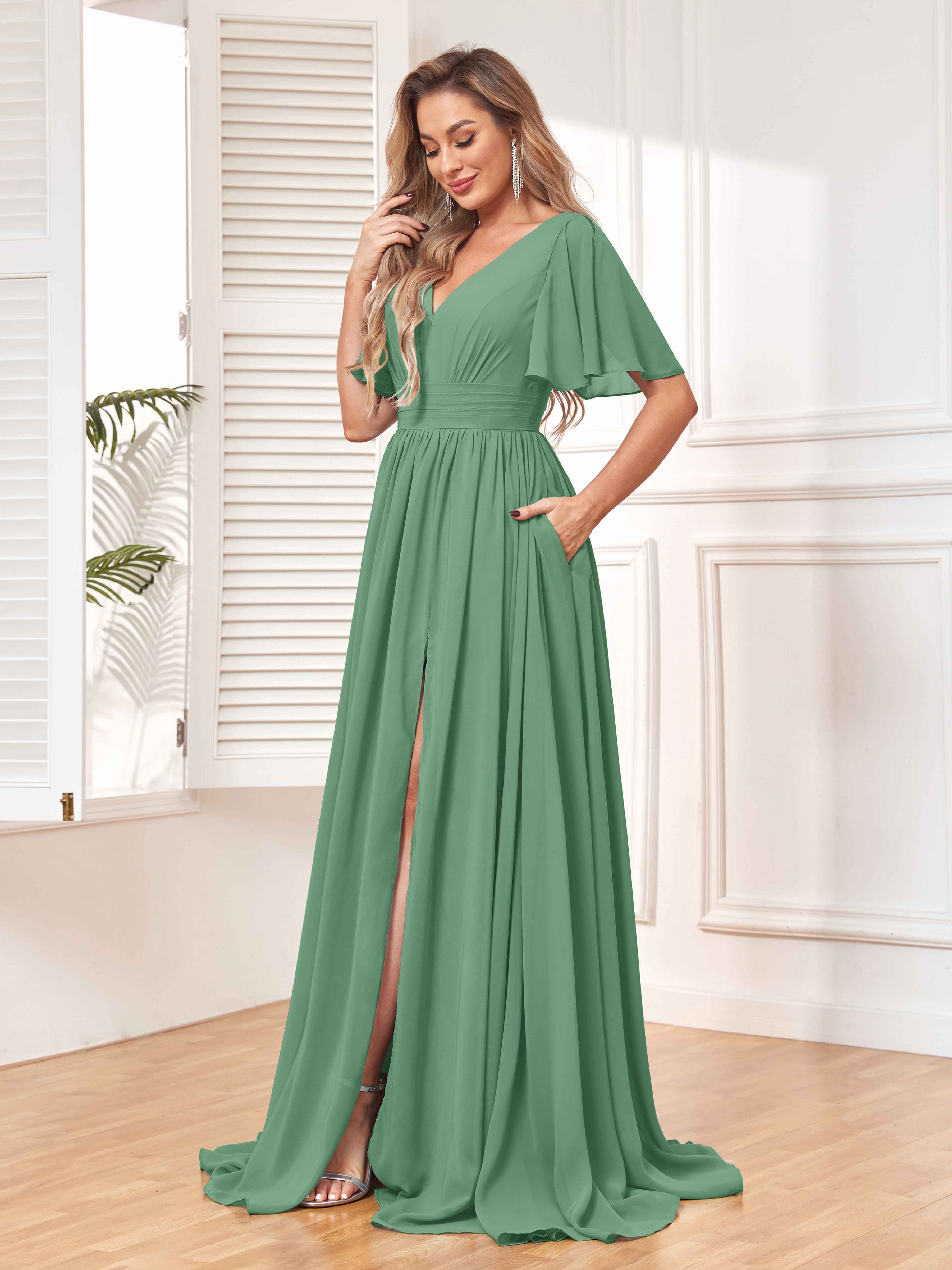 Brooklyn Modest V-Neck Ruched Slit Chiffon Bridesmaid Dresses