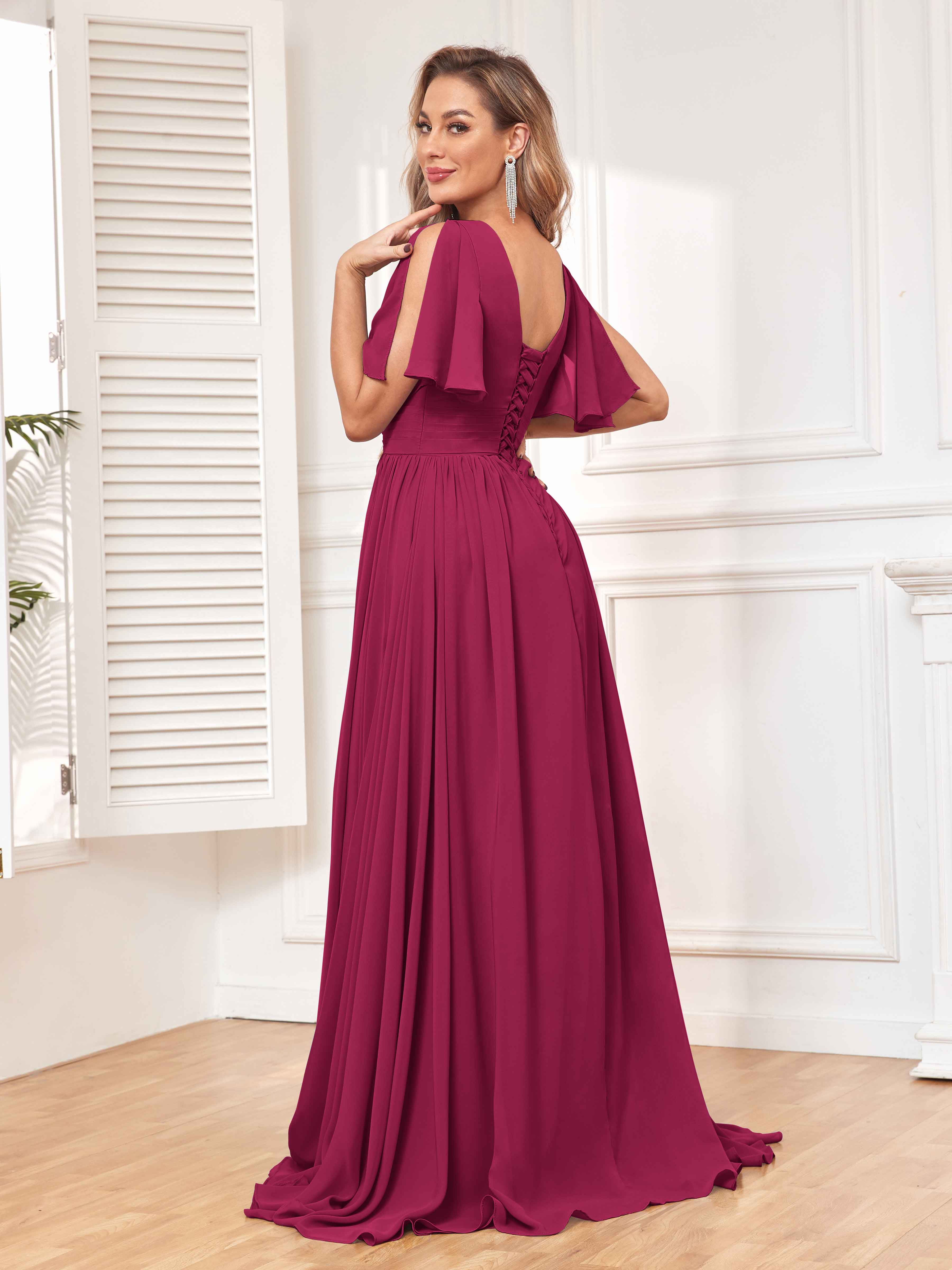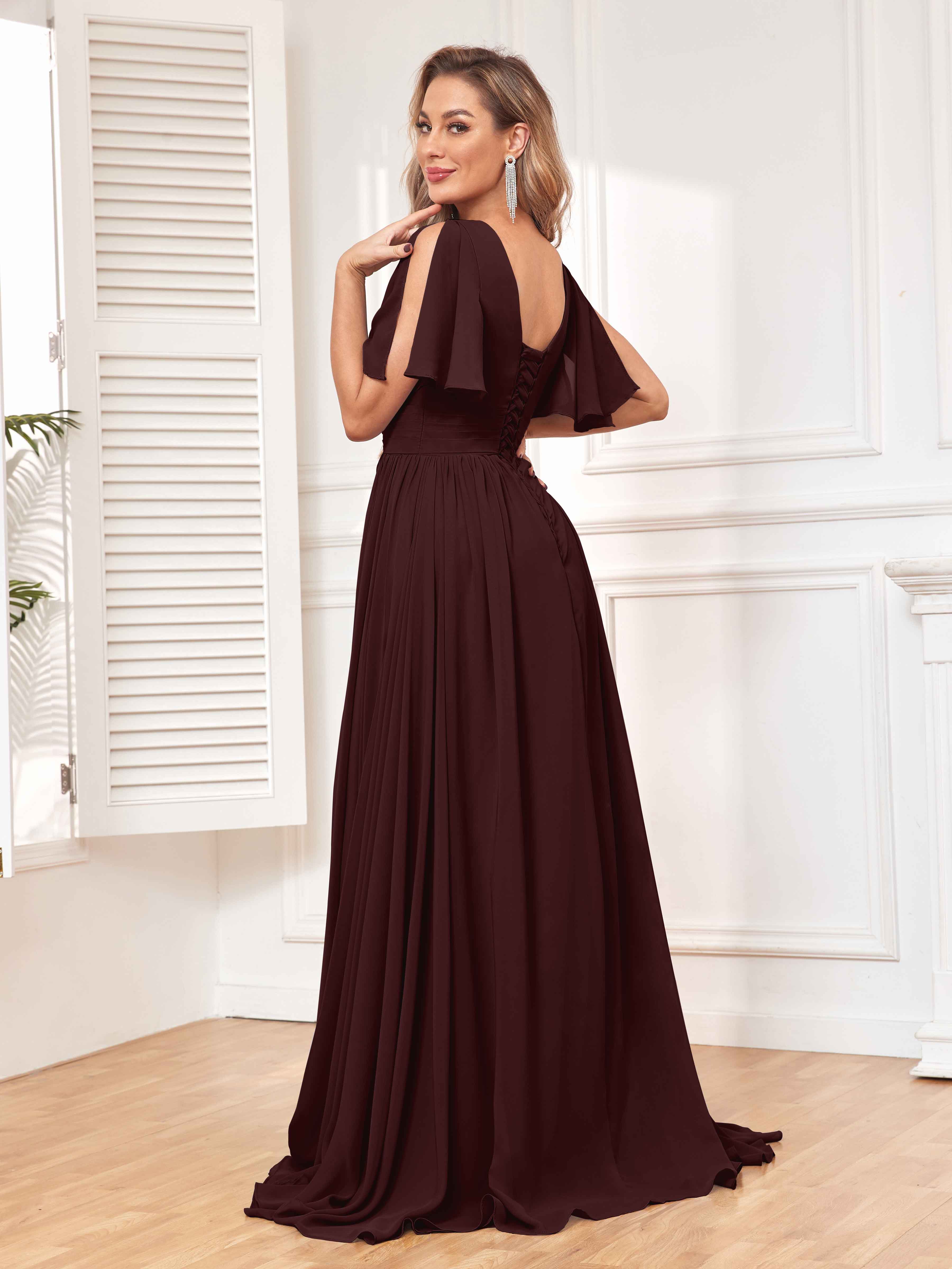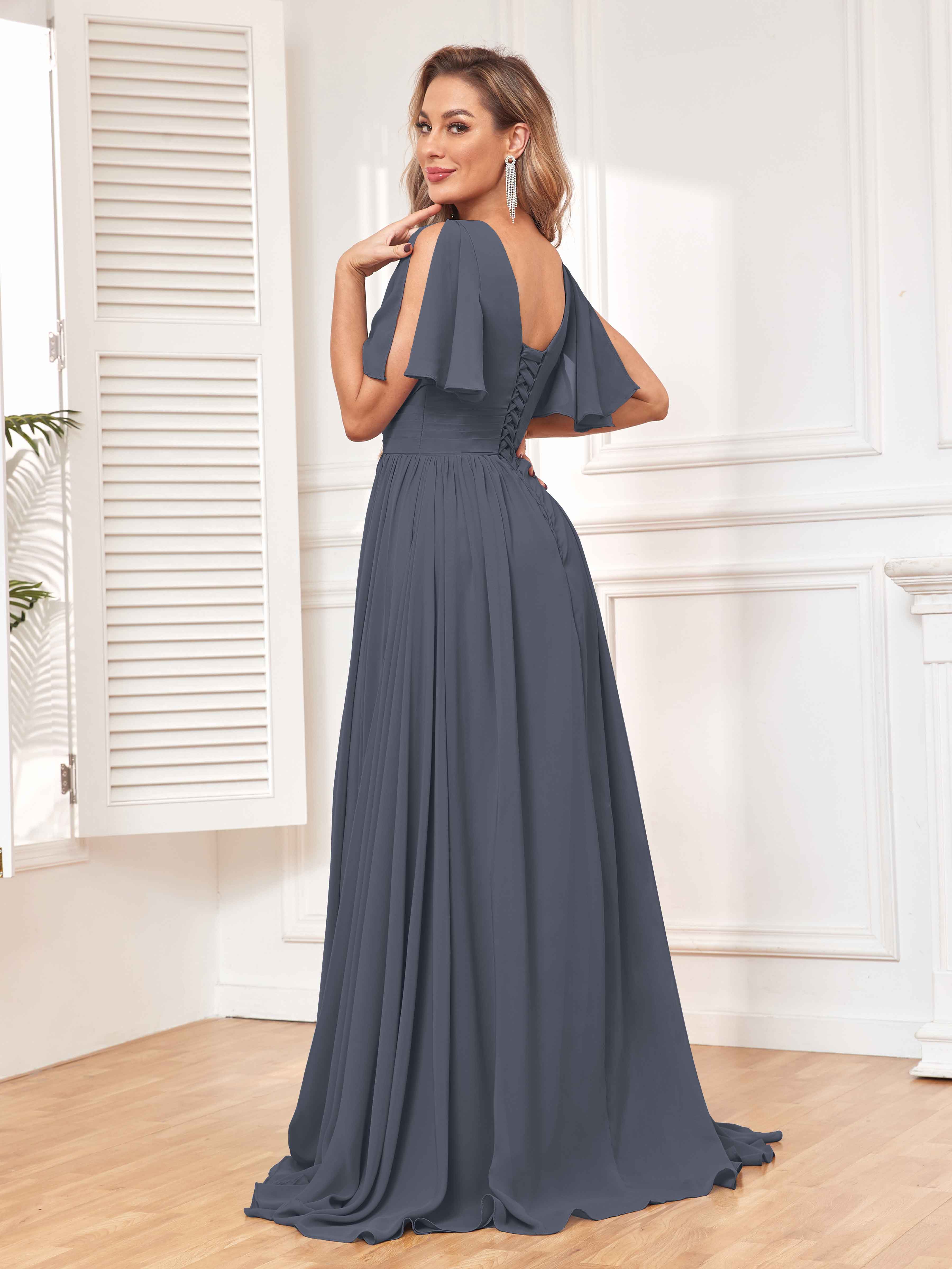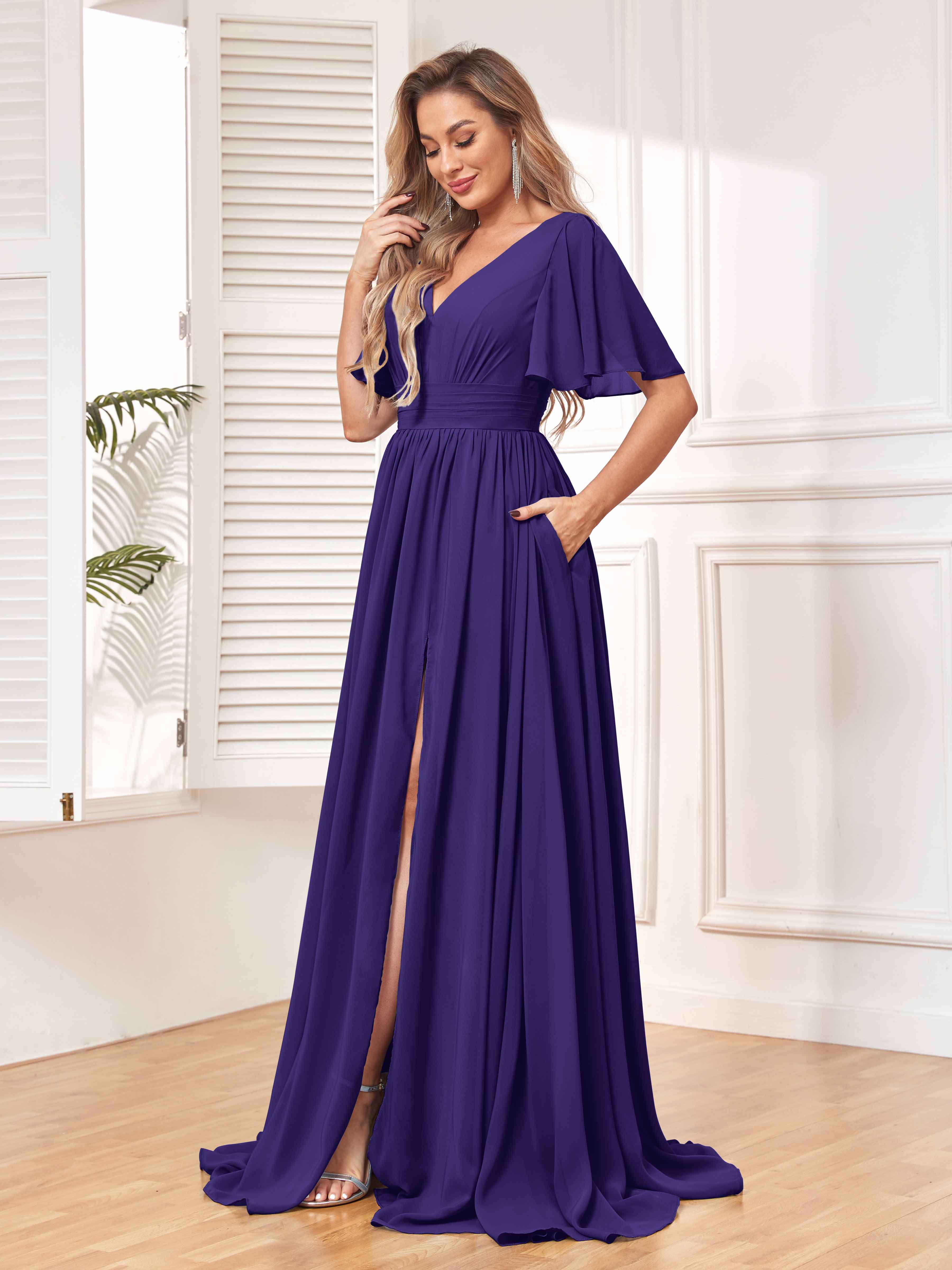 Brooklyn Modest V-Neck Ruched Slit Chiffon Bridesmaid Dresses