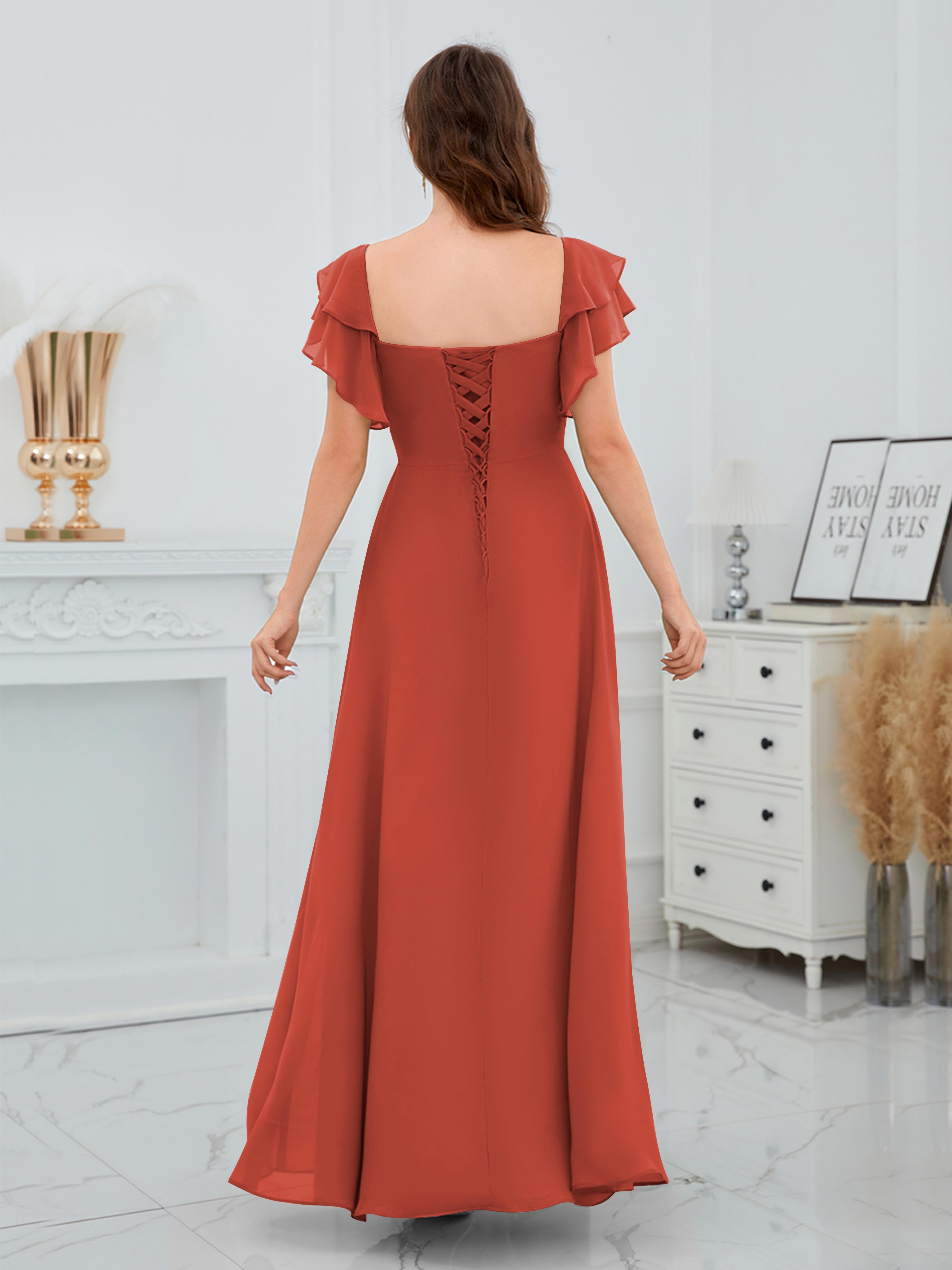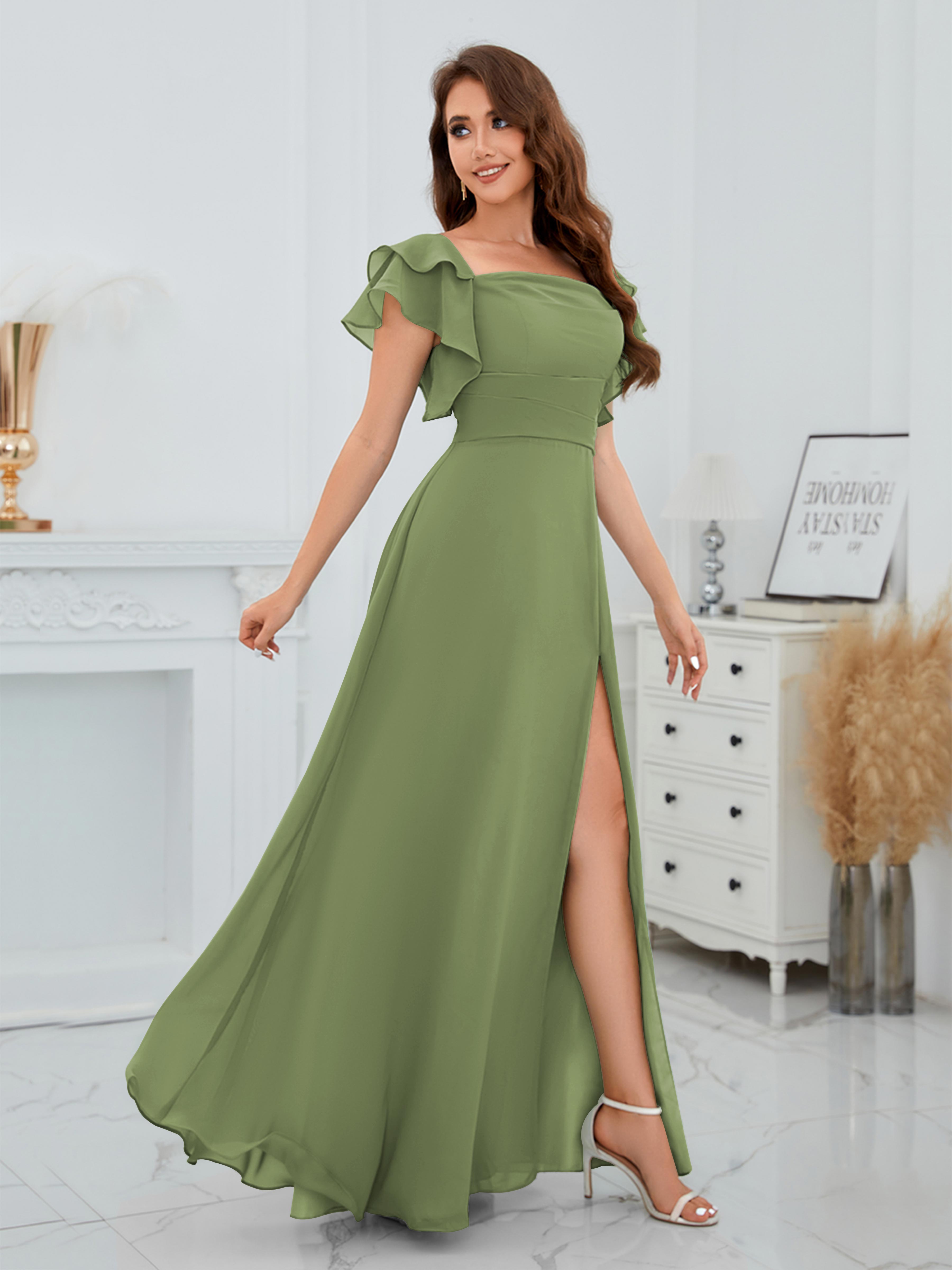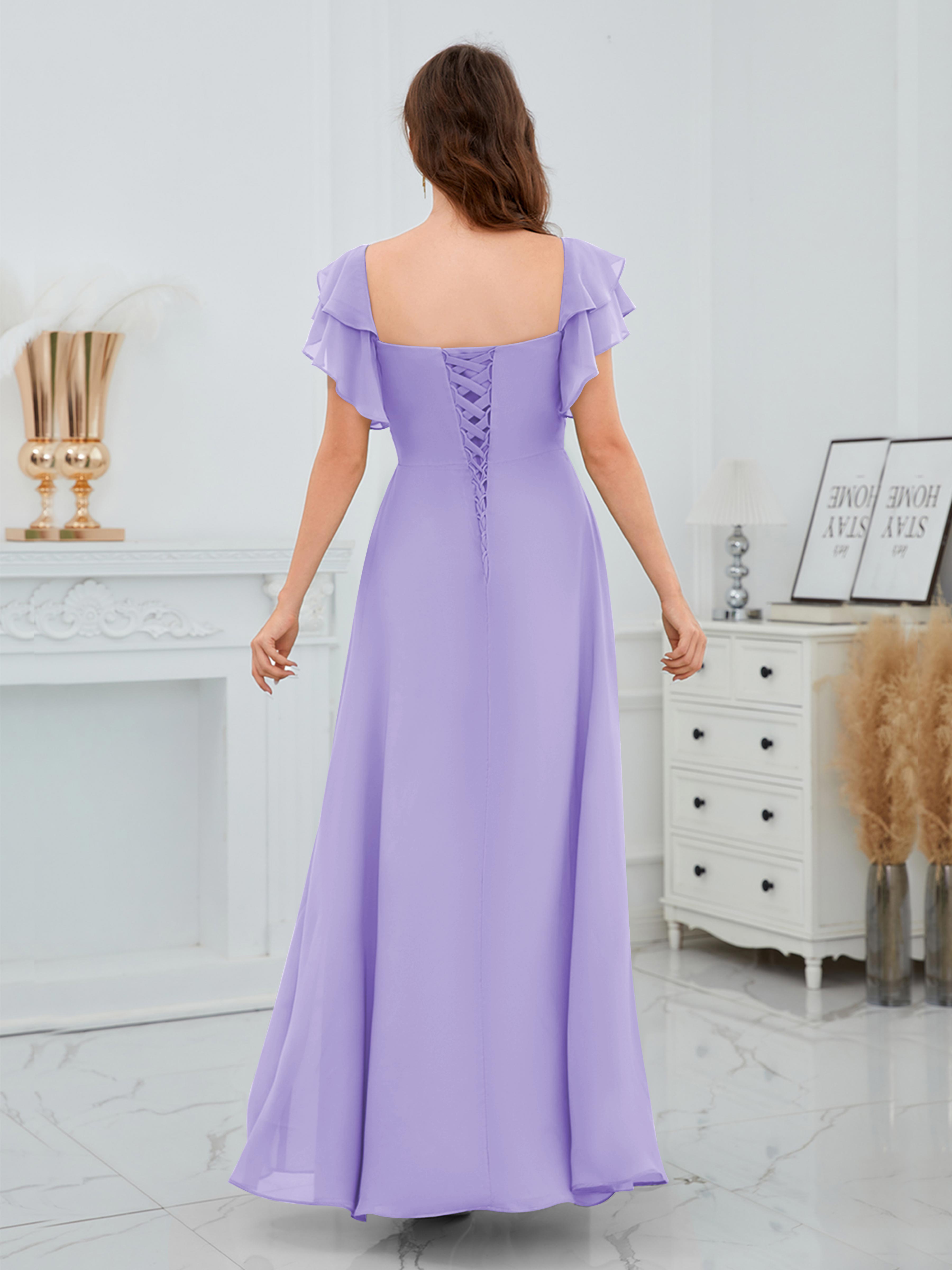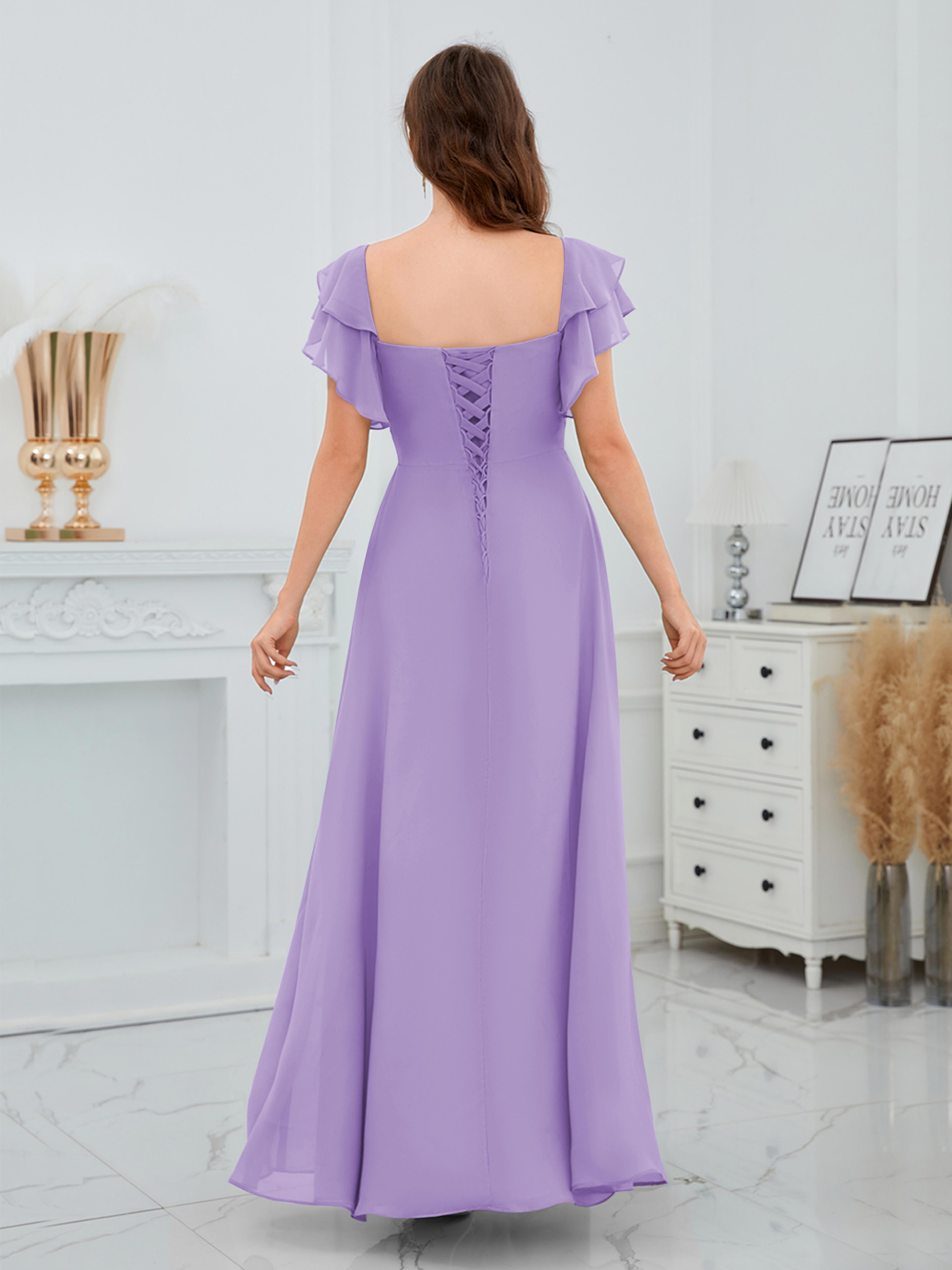Charleigh Trendy A-Line Square Short Sleeves Long Chiffon Bridesmaid Dresses