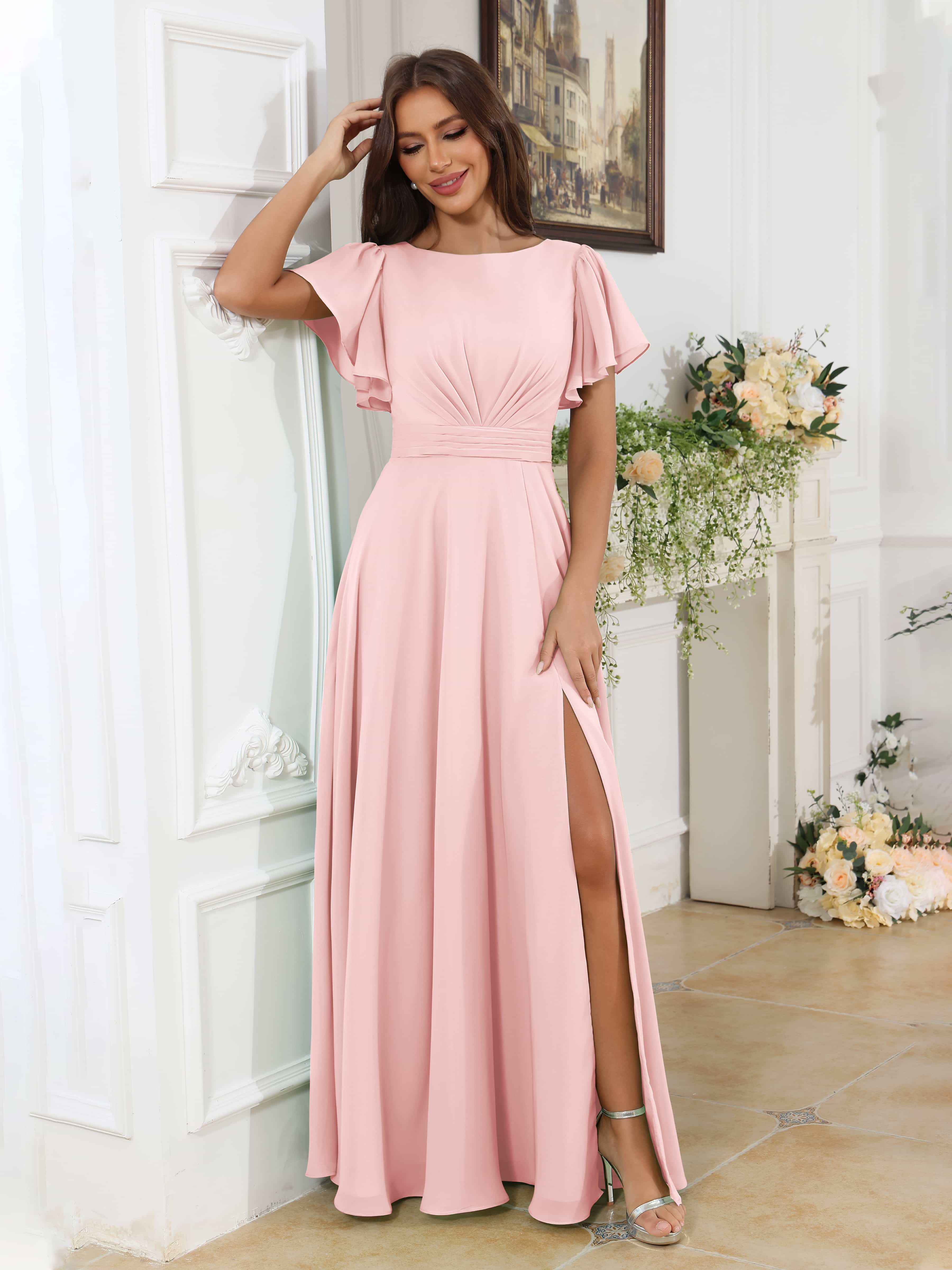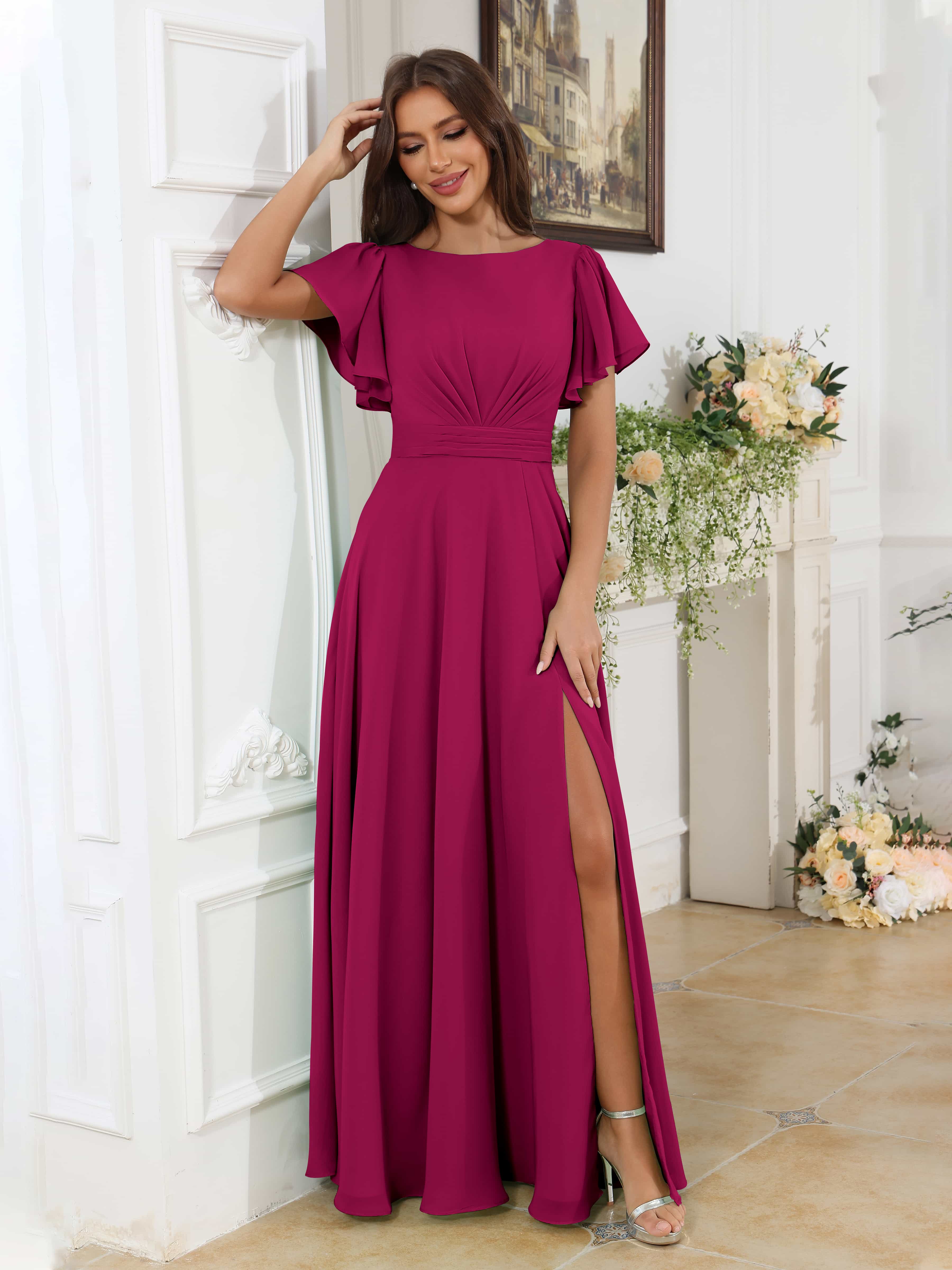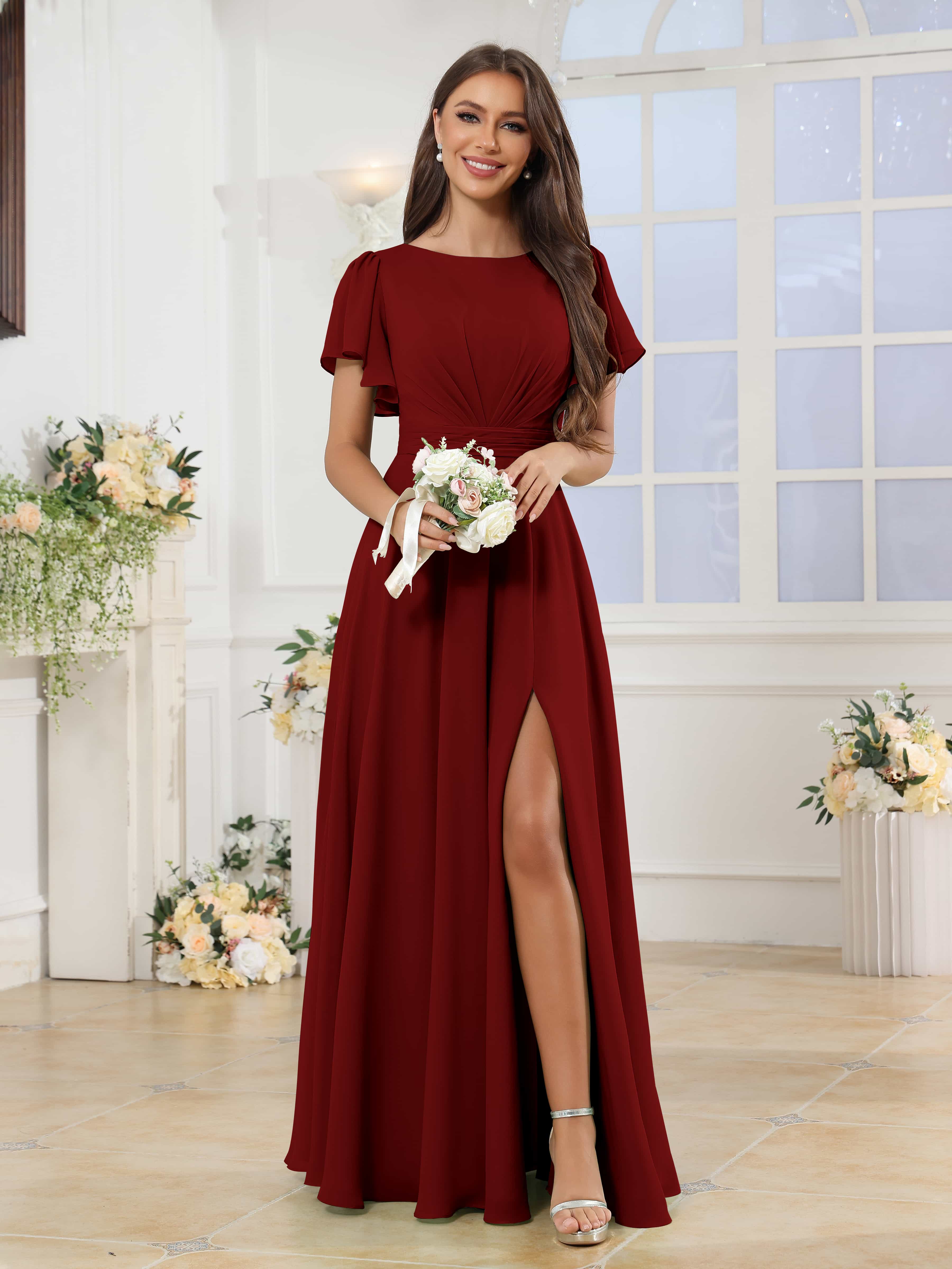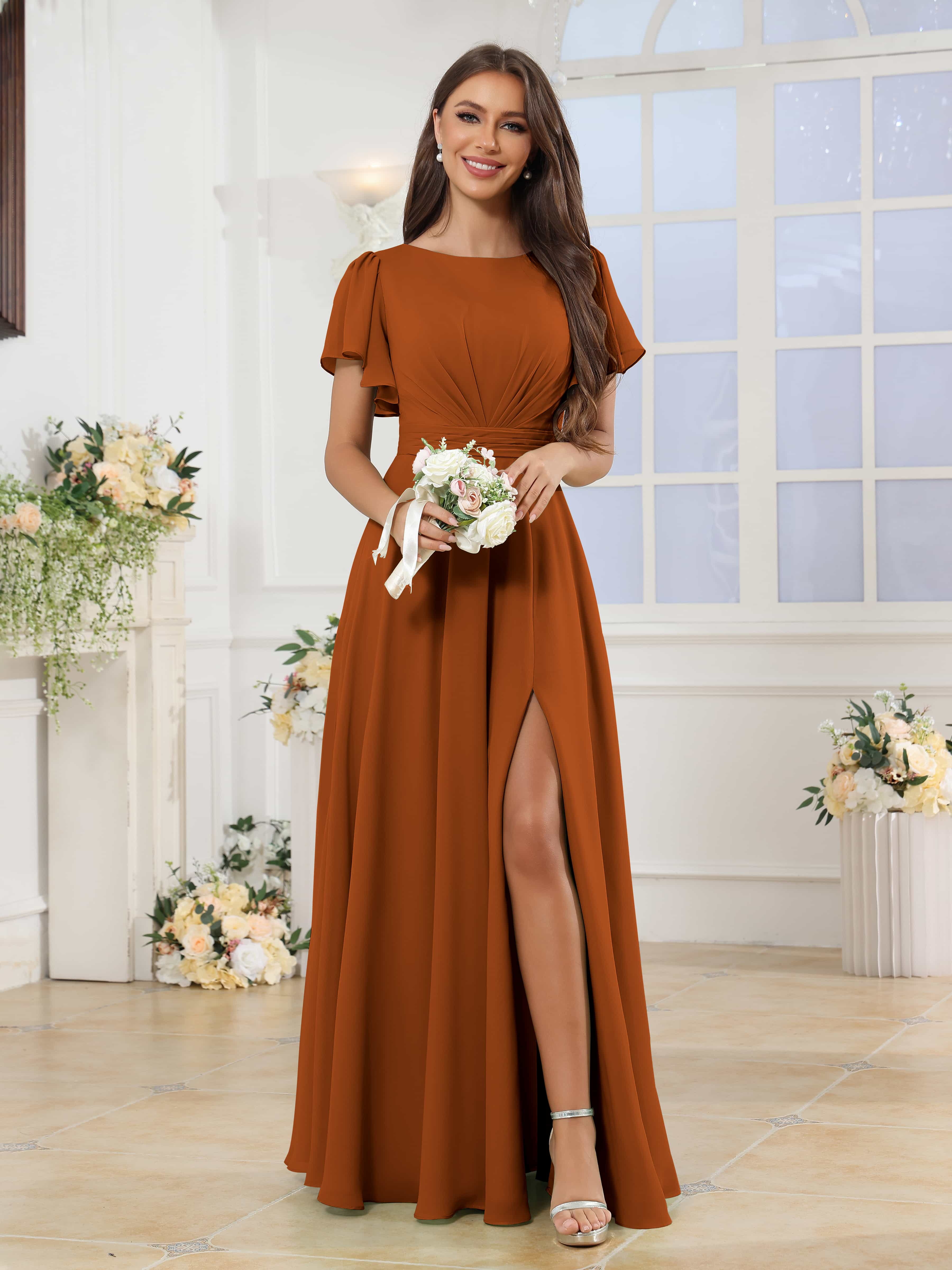 Dani Charming Scoop Short Sleeves Slit Long Chiffon Bridesmaid Dresses