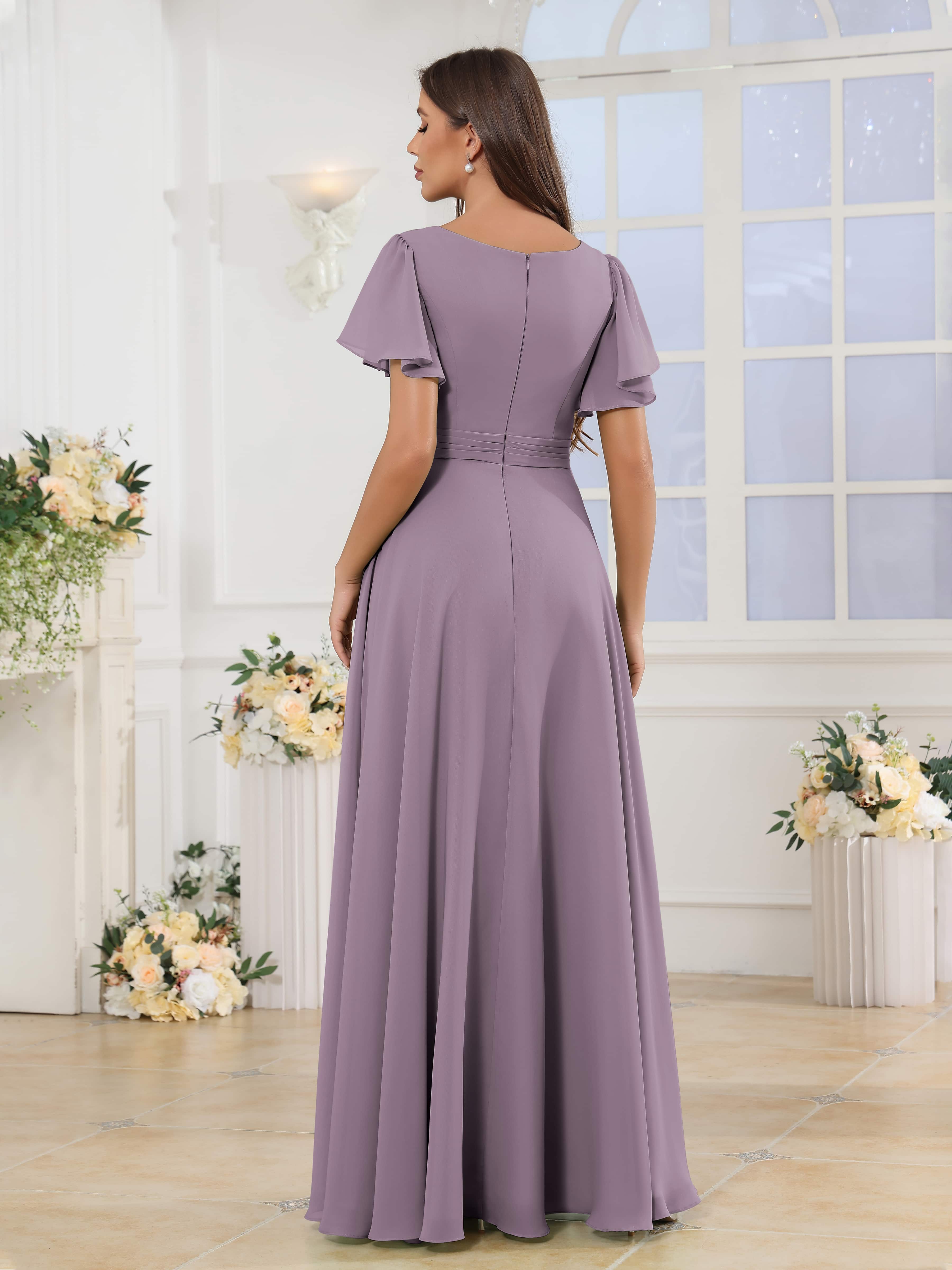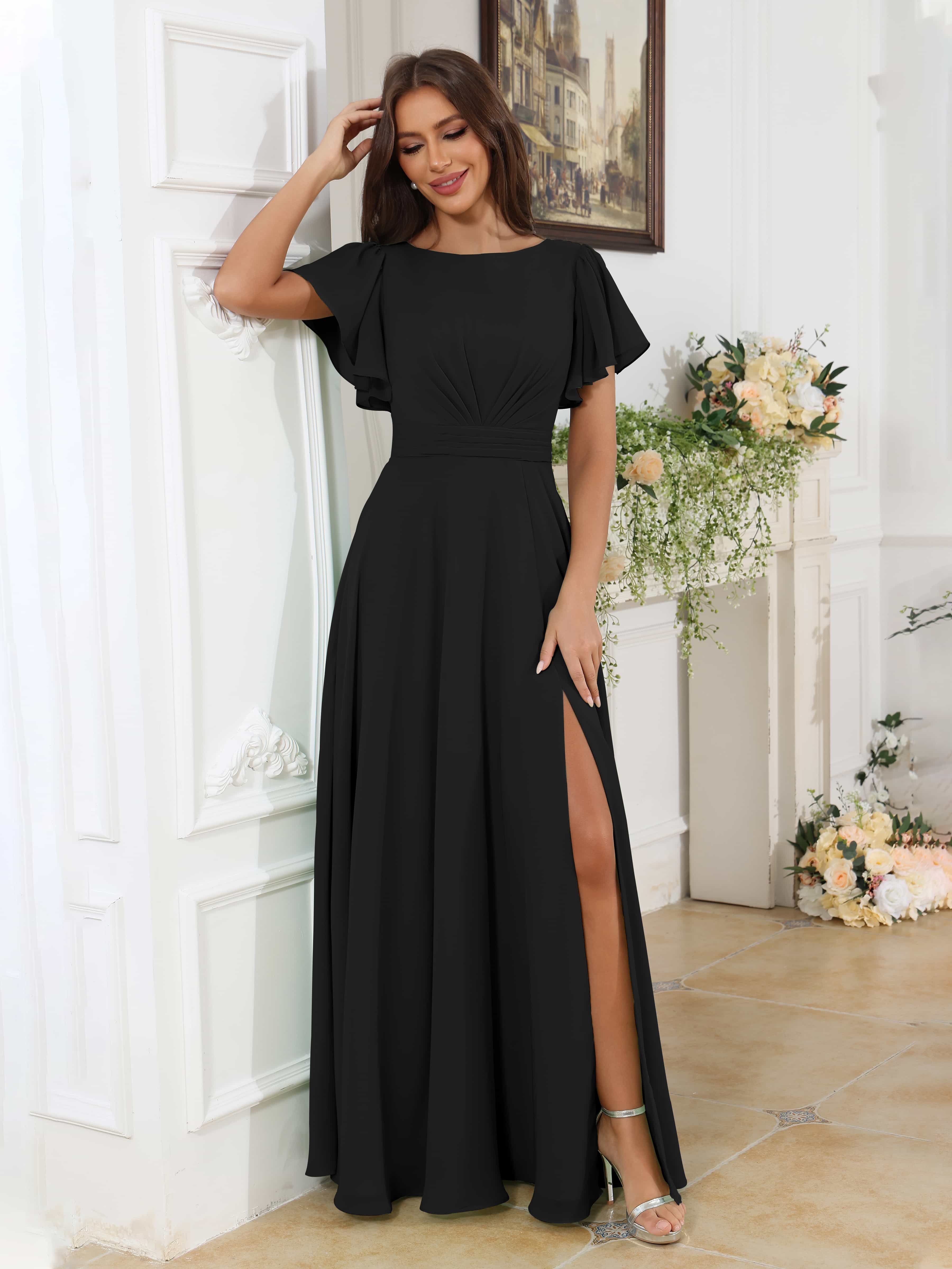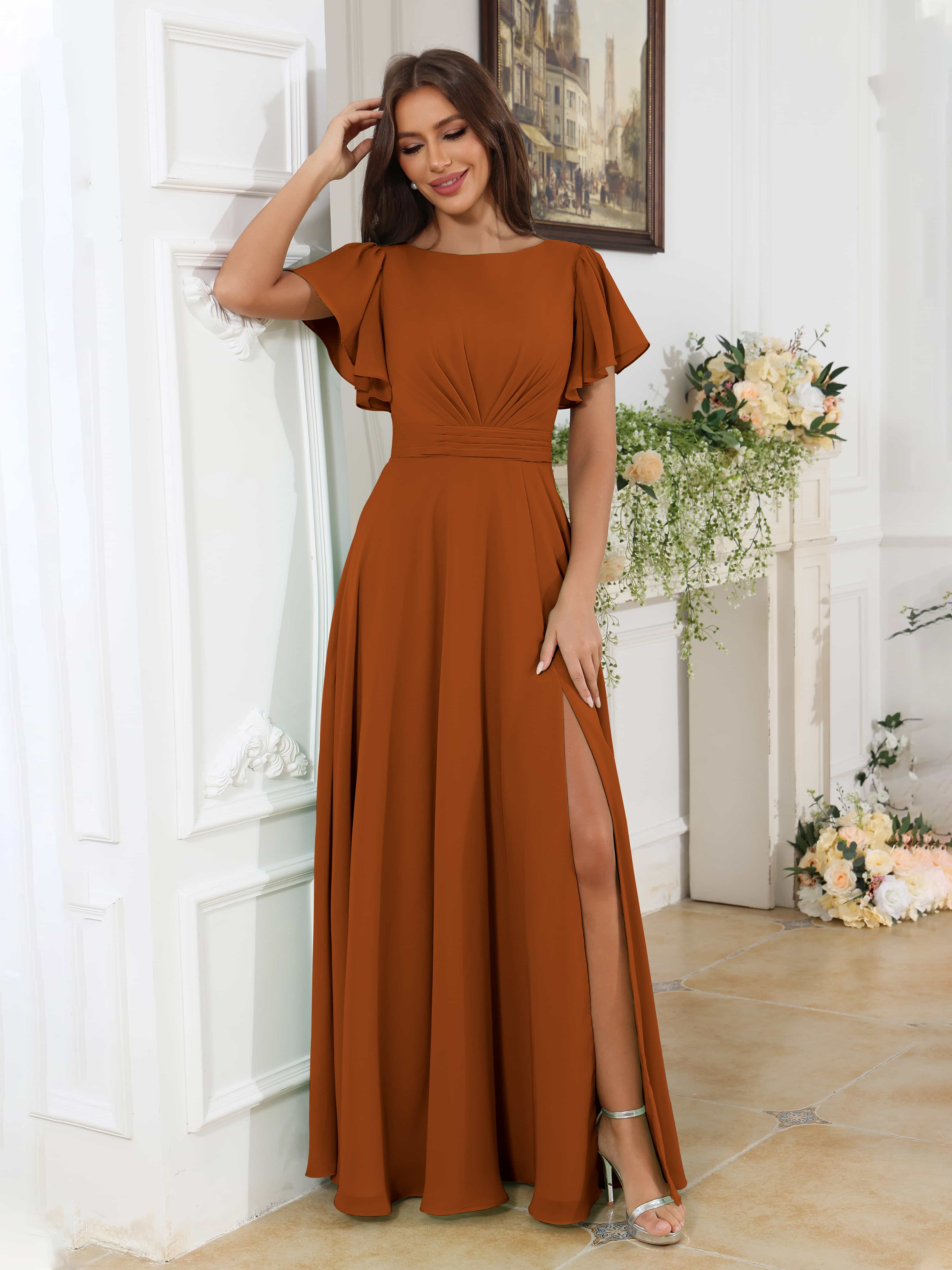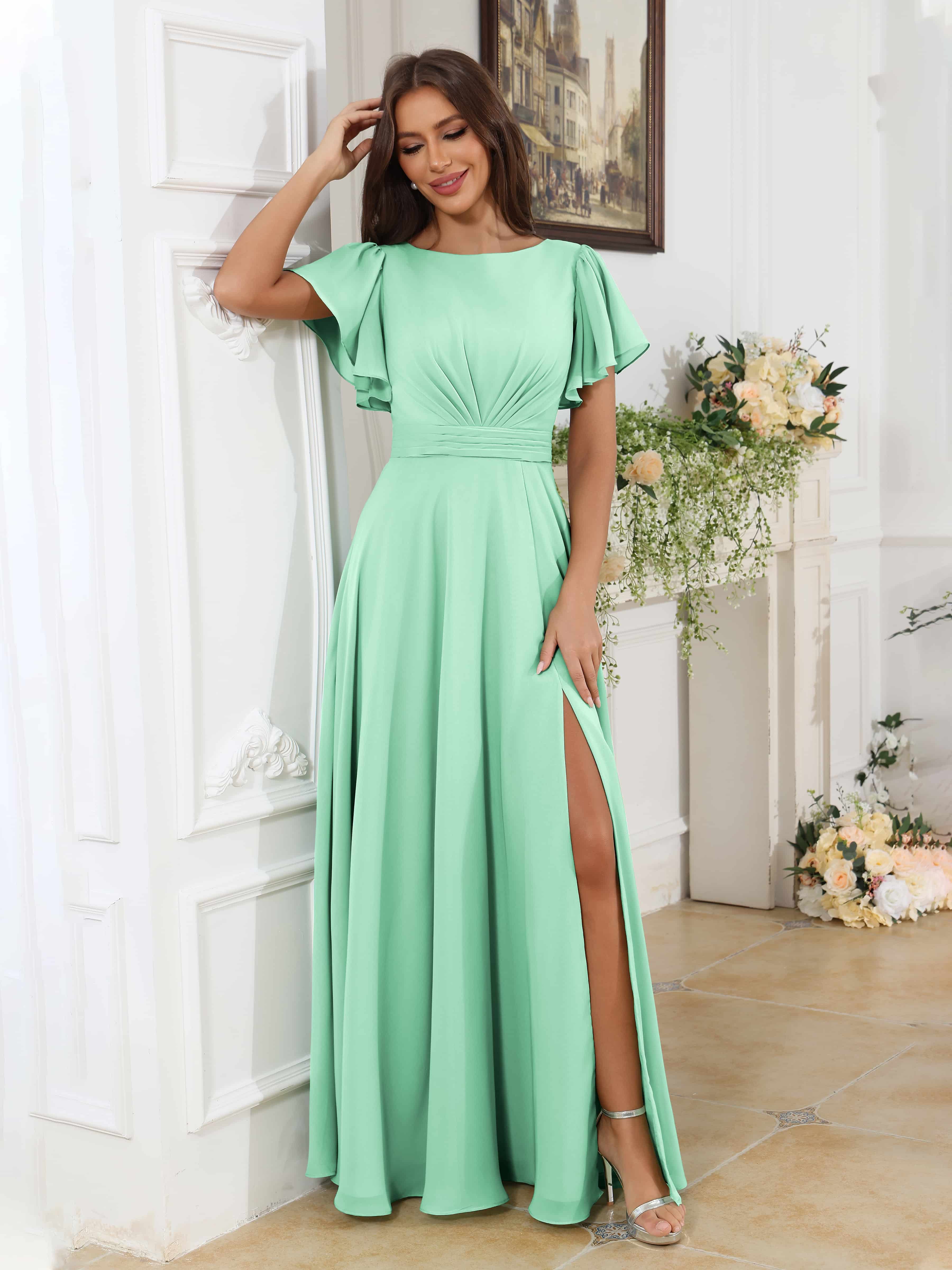 Dani Charming Scoop Short Sleeves Slit Long Chiffon Bridesmaid Dresses