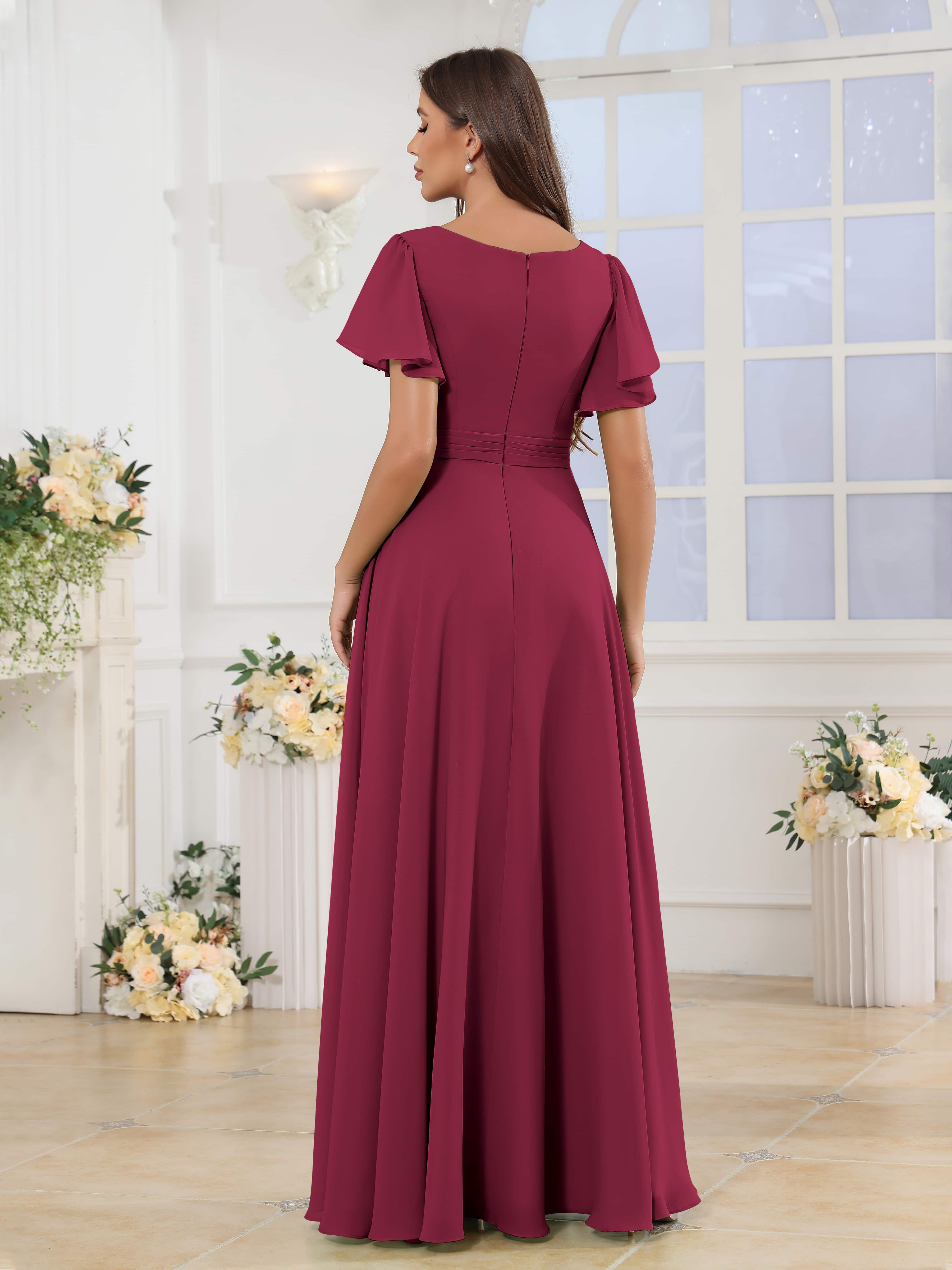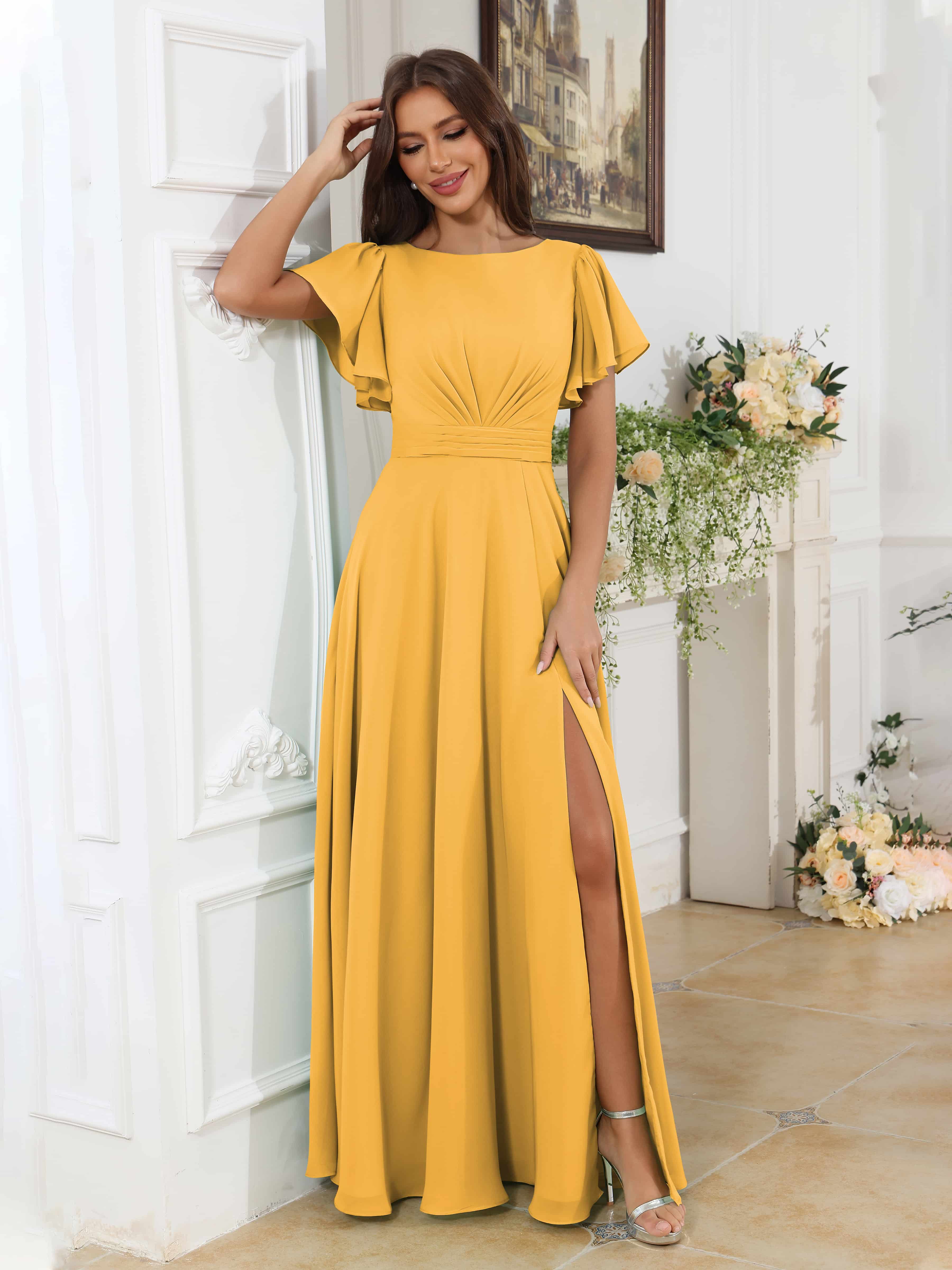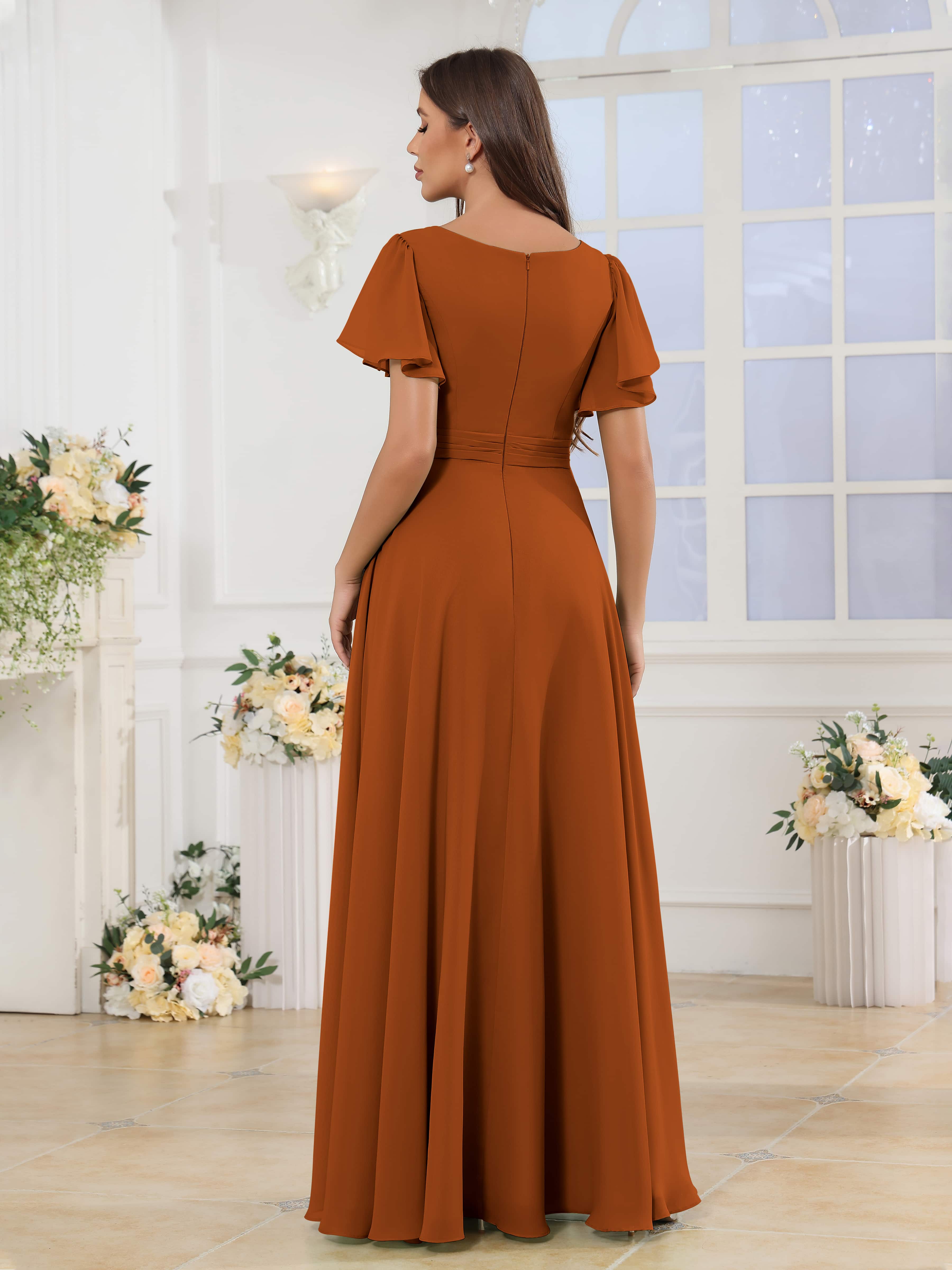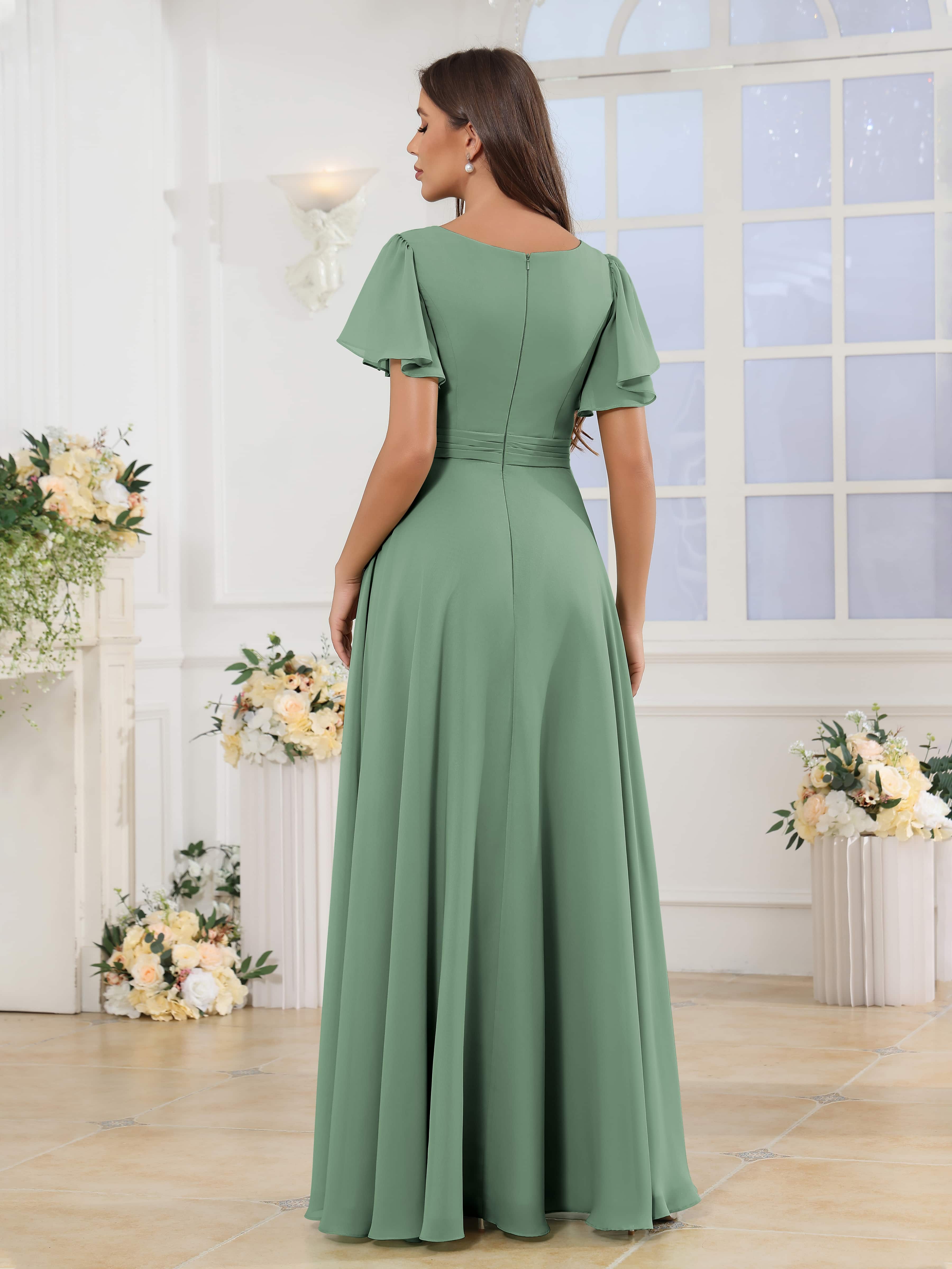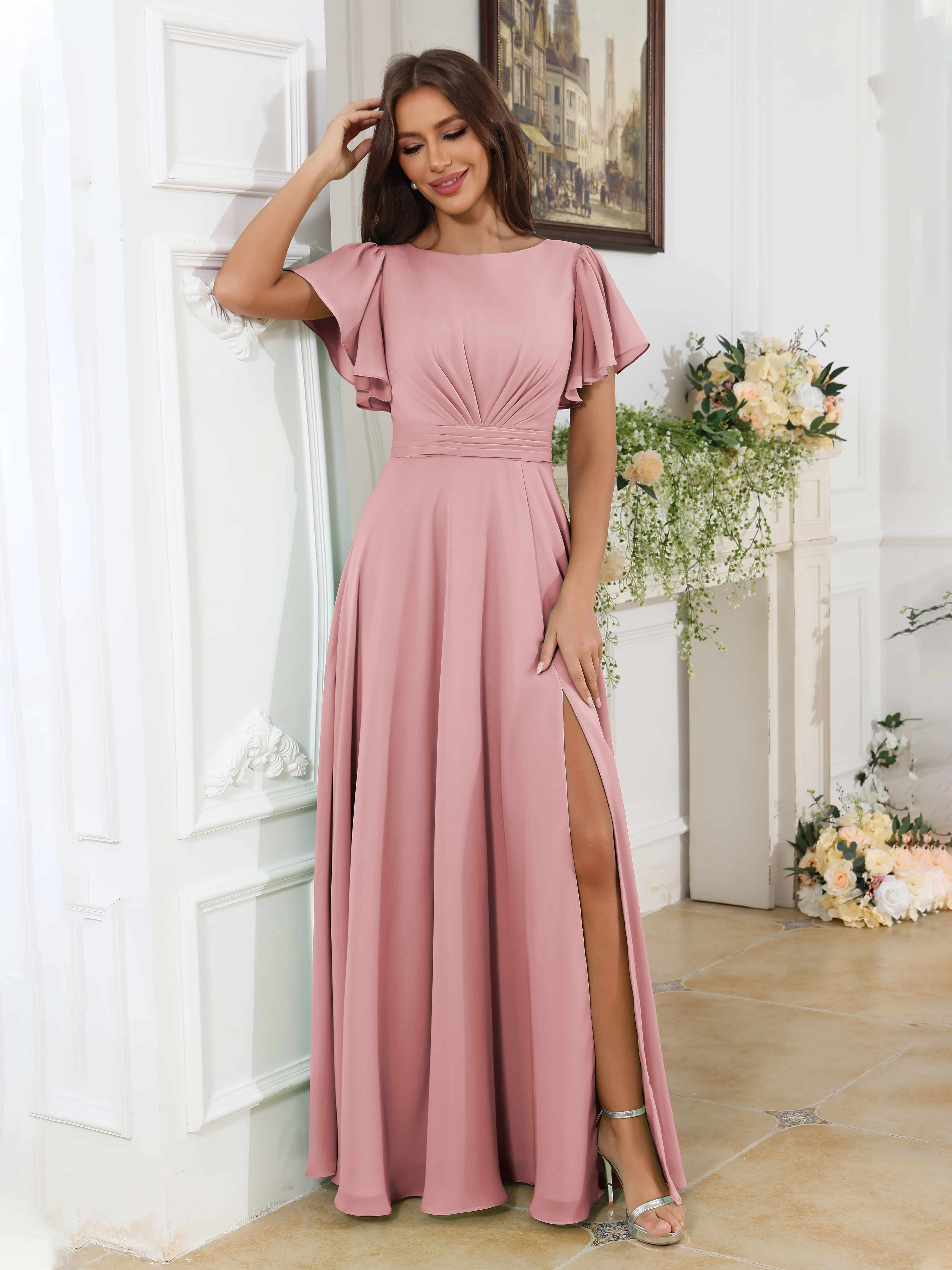 Dani Charming Scoop Short Sleeves Slit Long Chiffon Bridesmaid Dresses