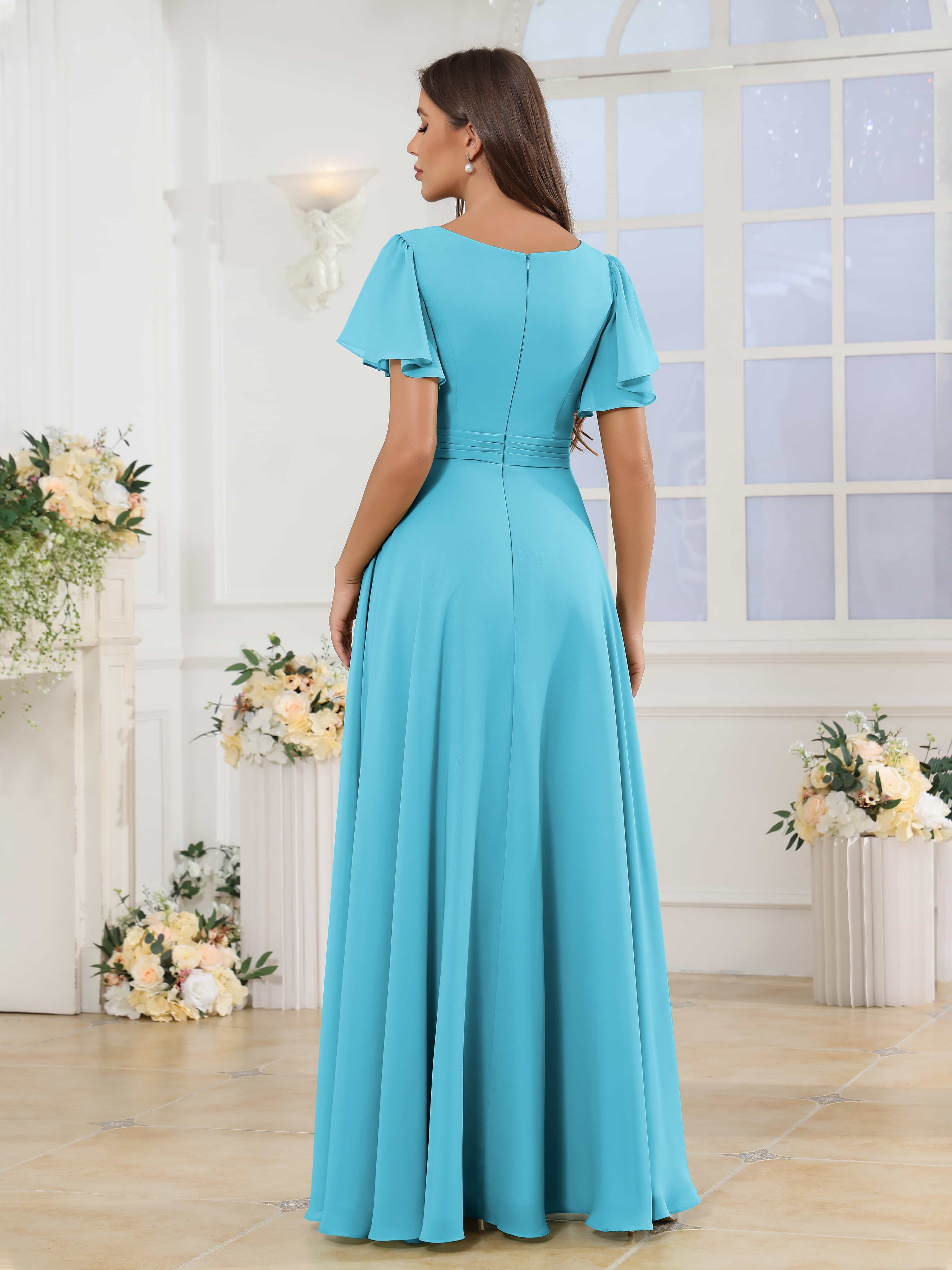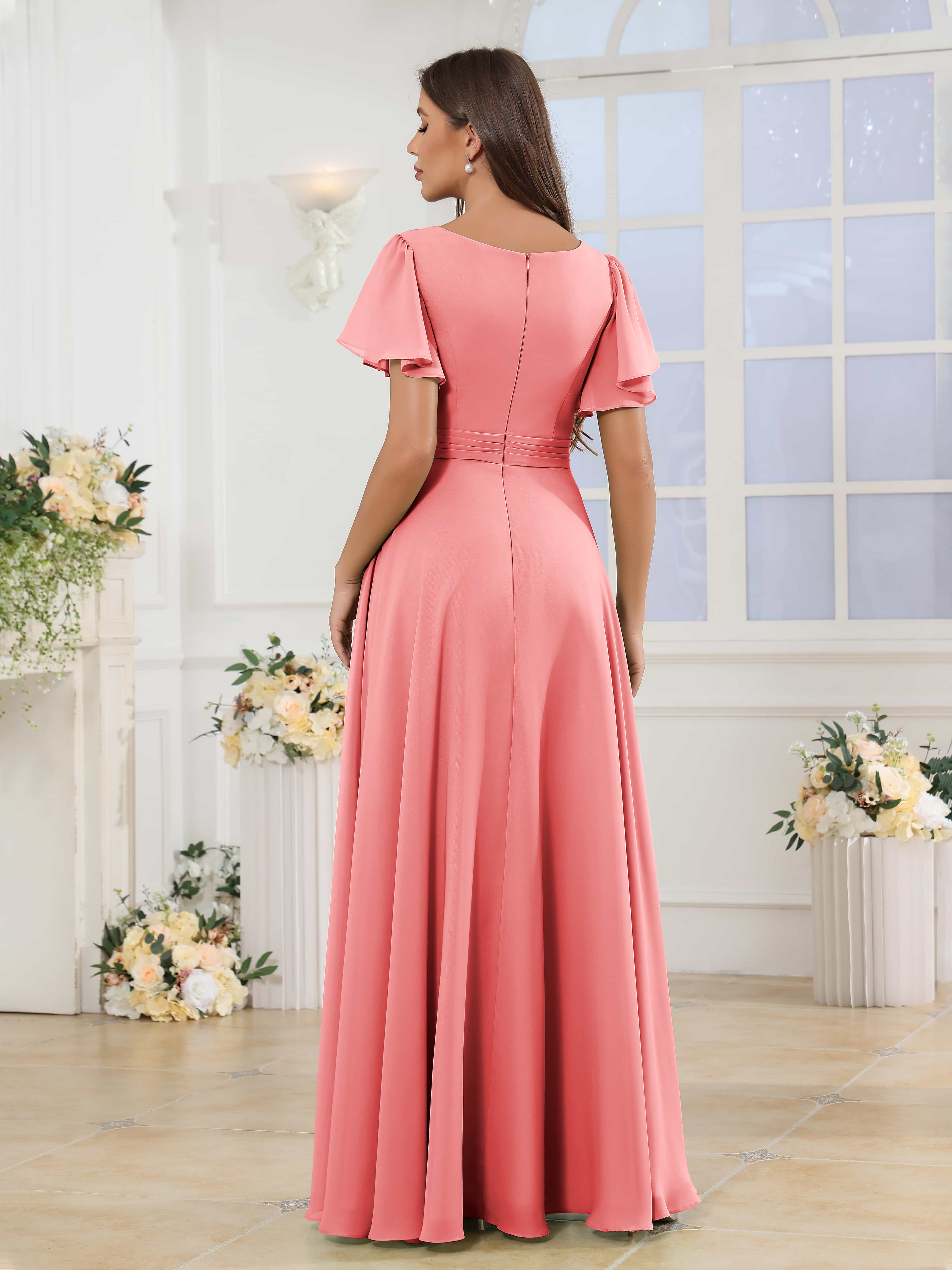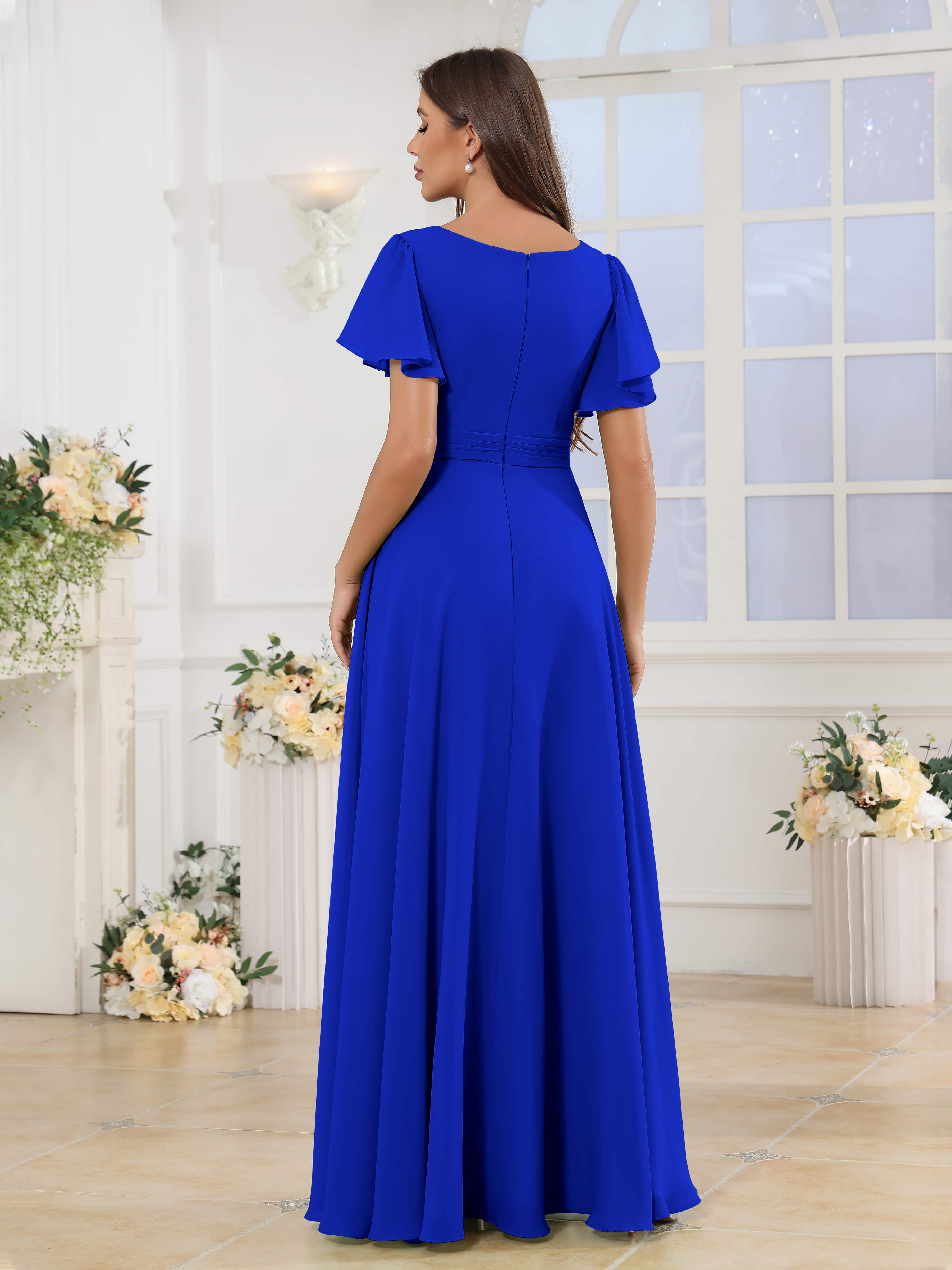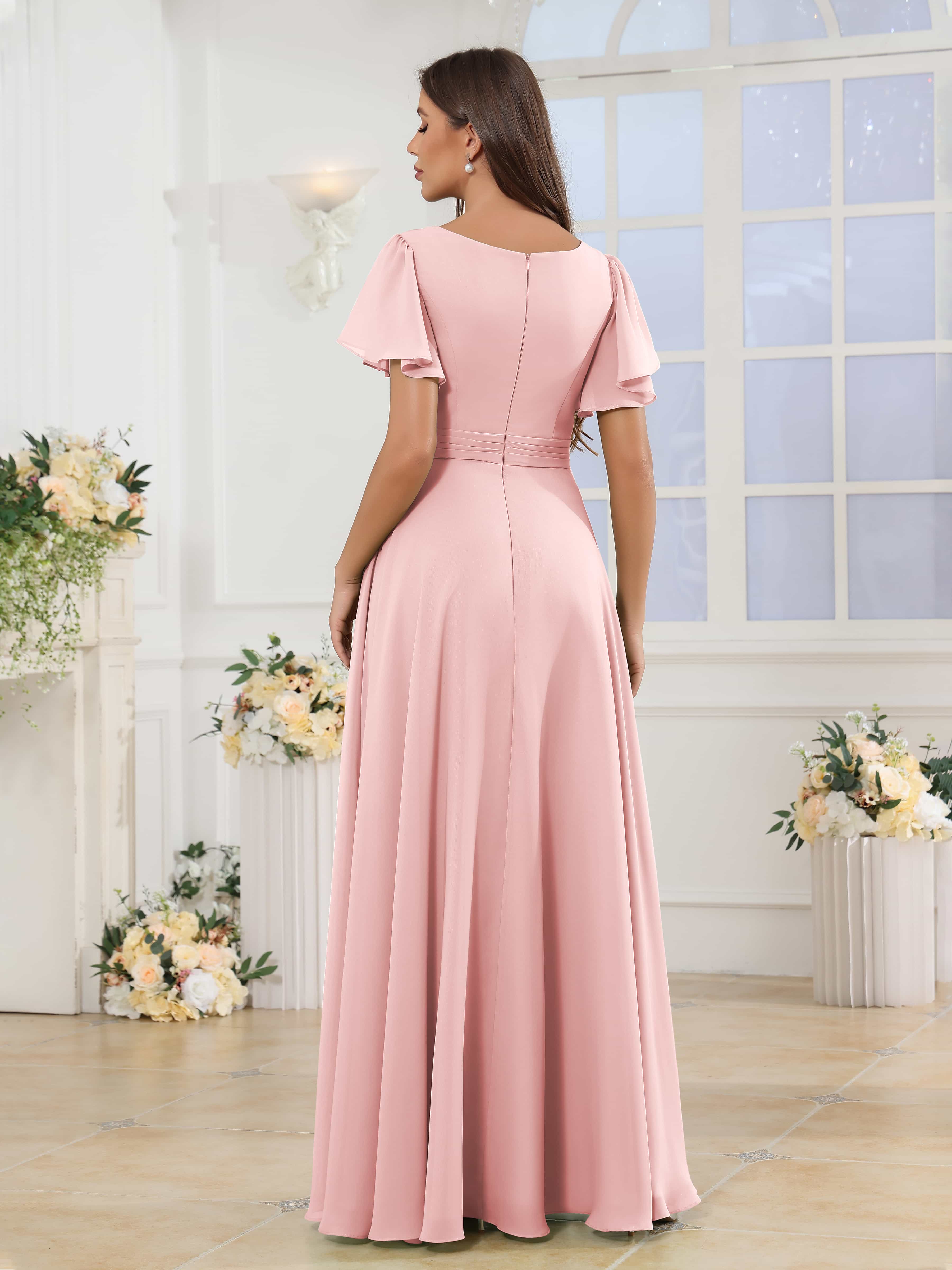 Dani Charming Scoop Short Sleeves Slit Long Chiffon Bridesmaid Dresses
