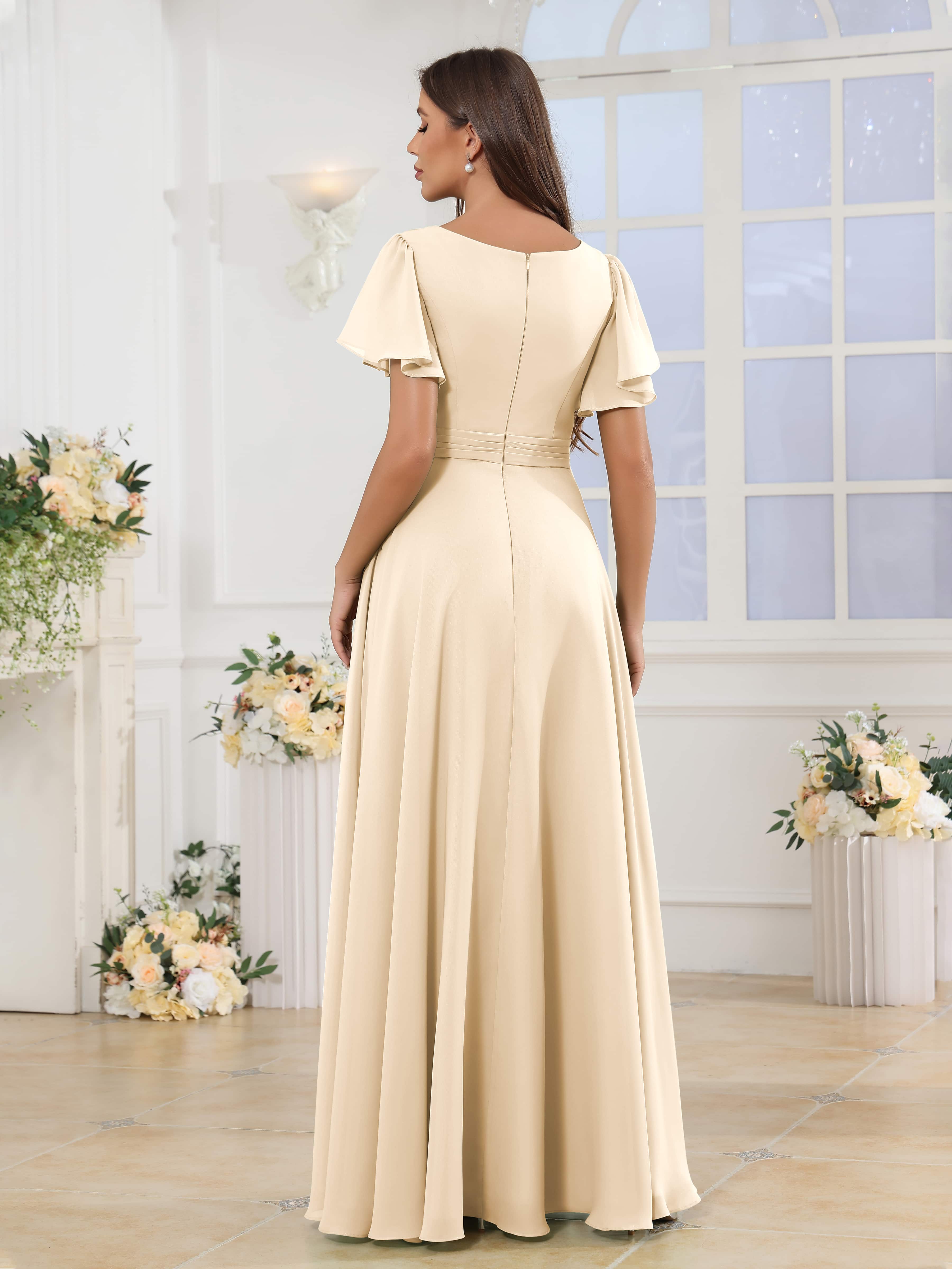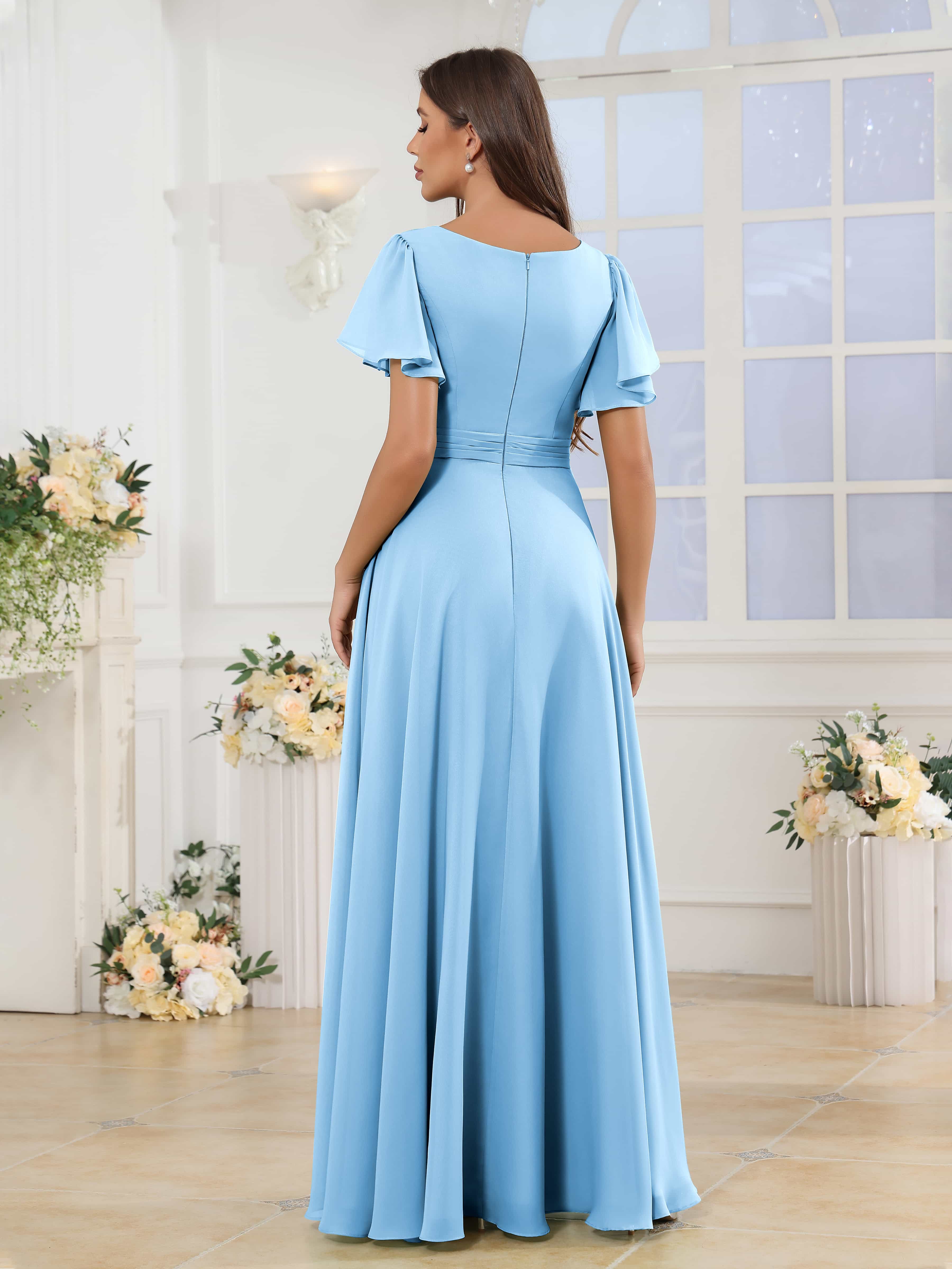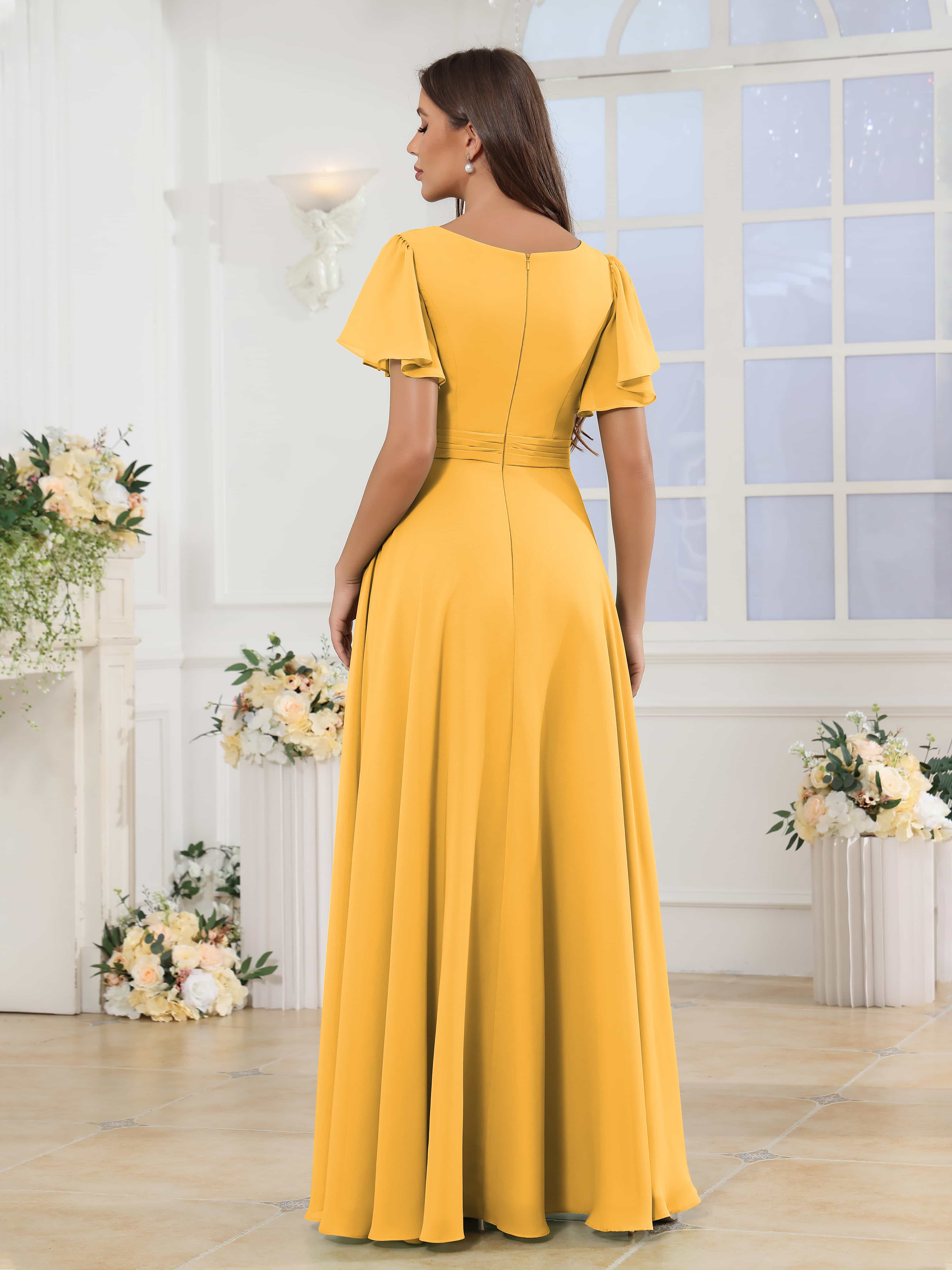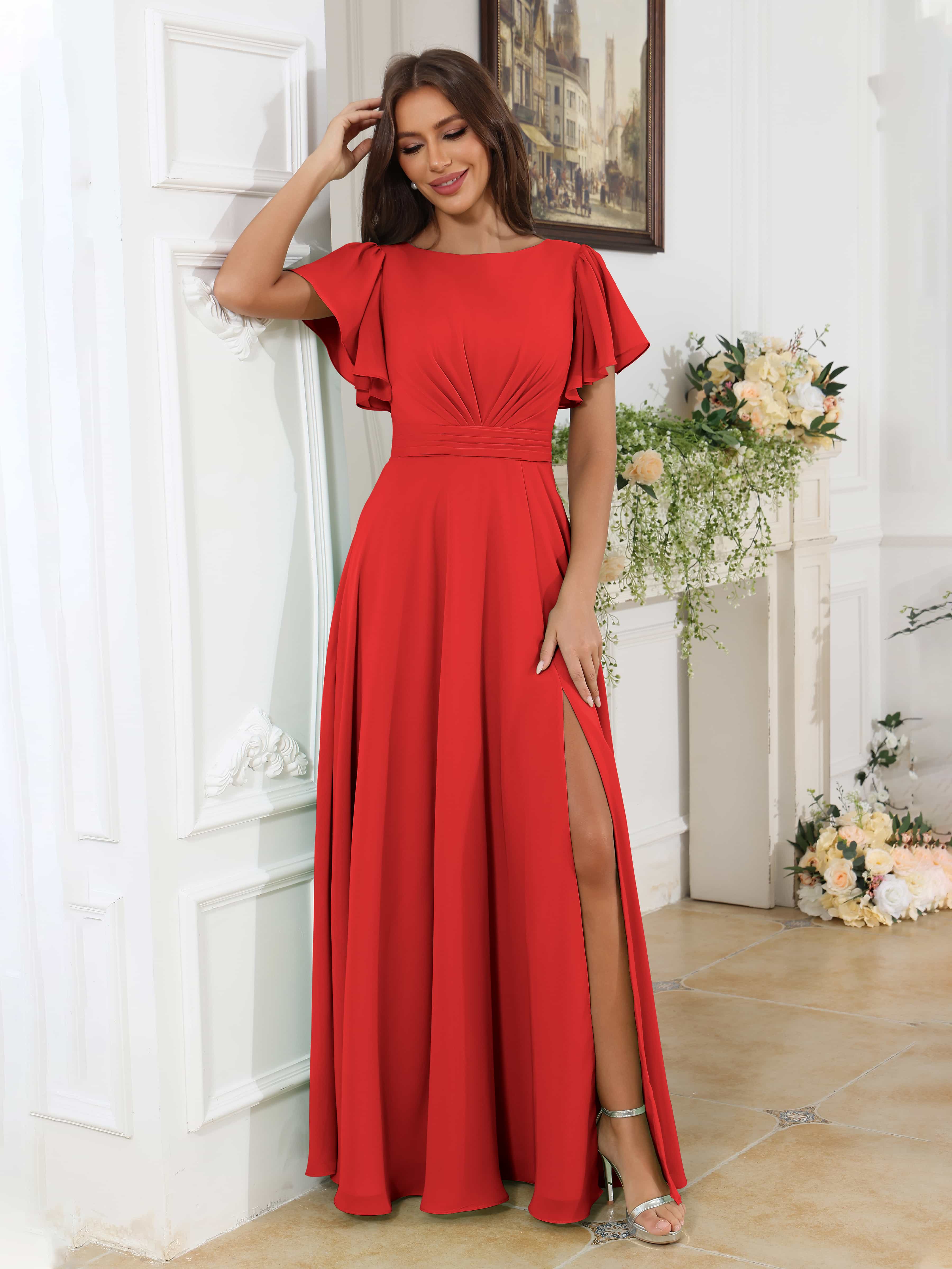 Dani Charming Scoop Short Sleeves Slit Long Chiffon Bridesmaid Dresses