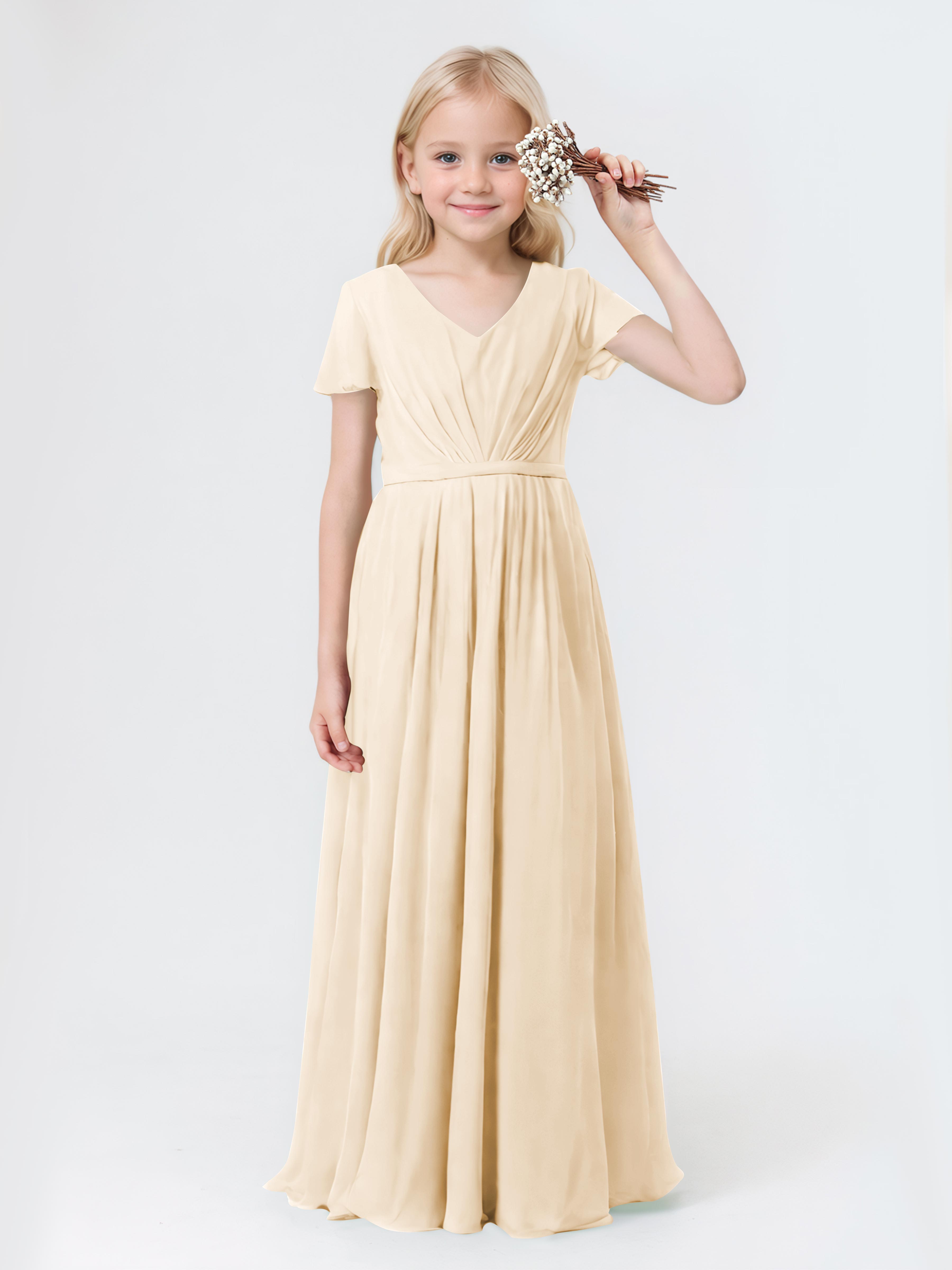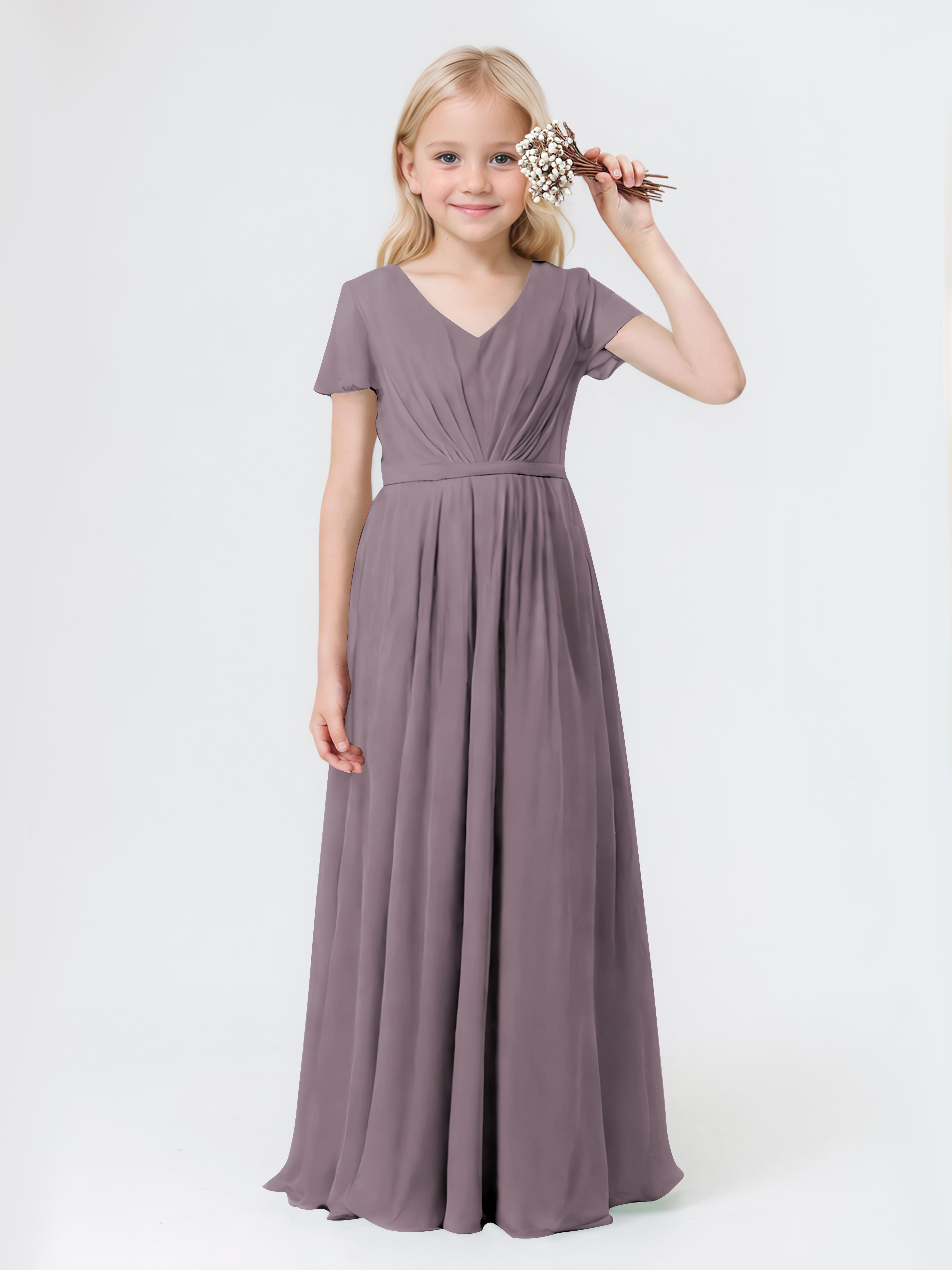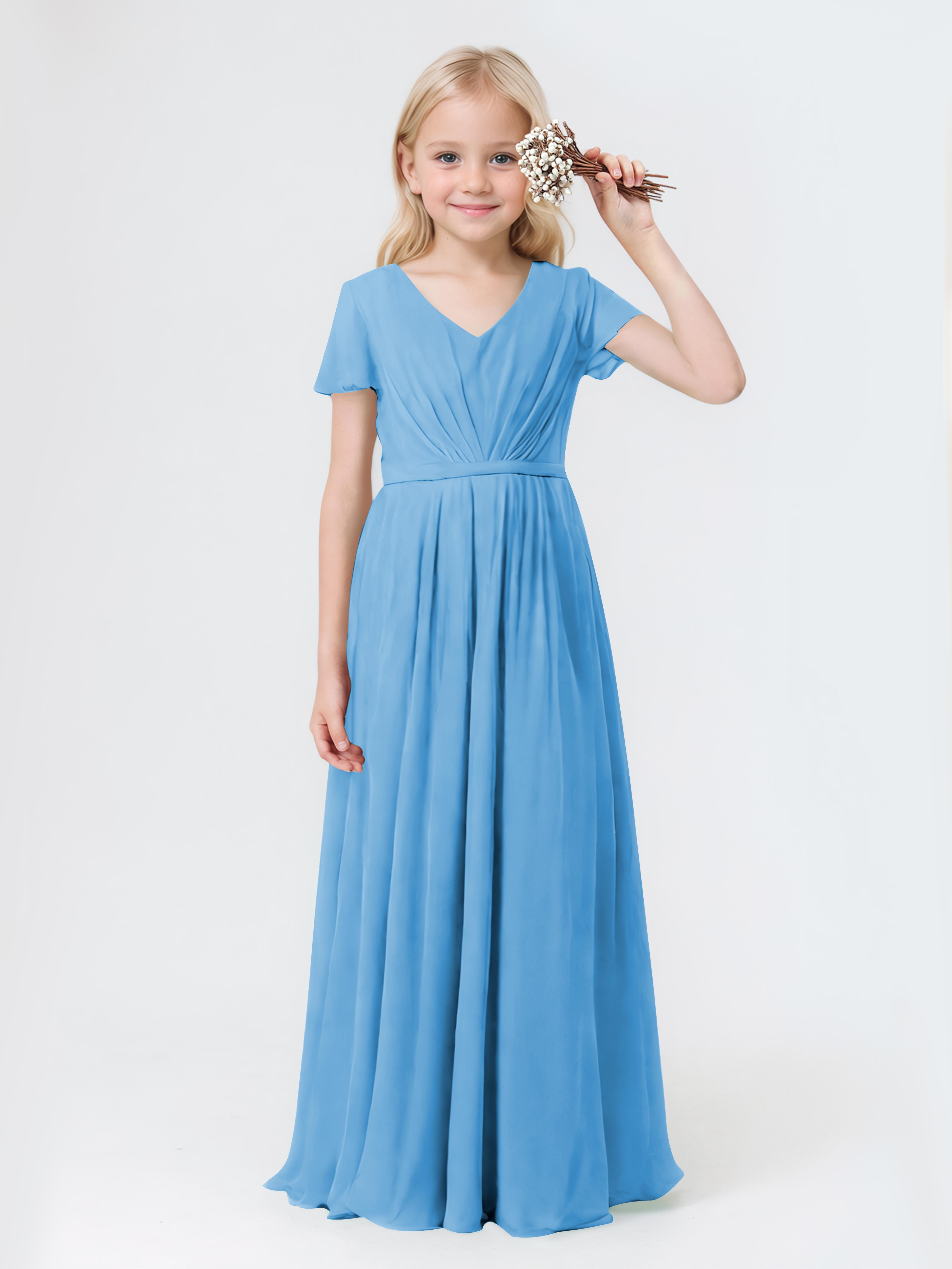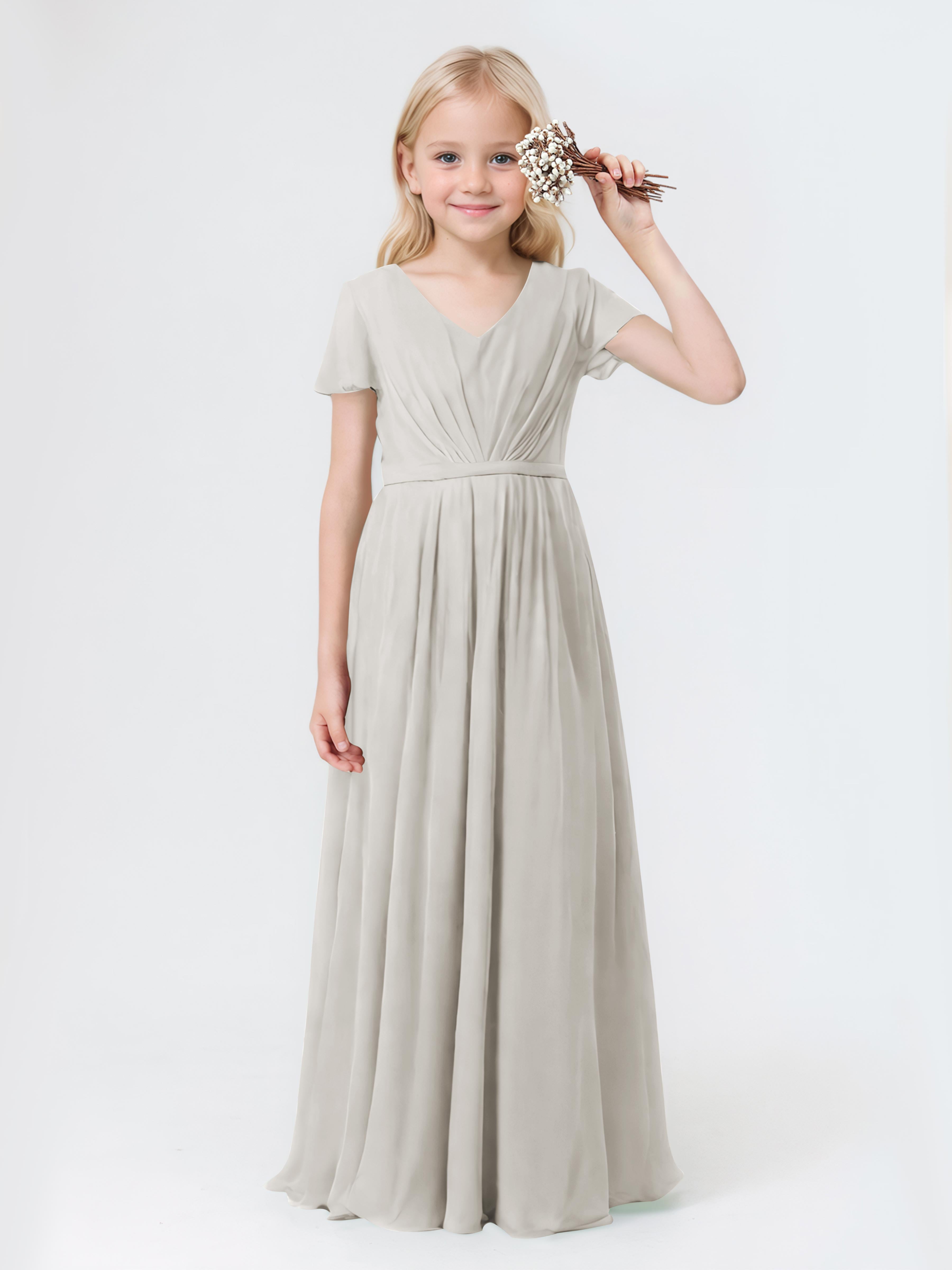 Elegant A-Line Short Sleeves Long Chiffon Junior Bridesmaid Dresses