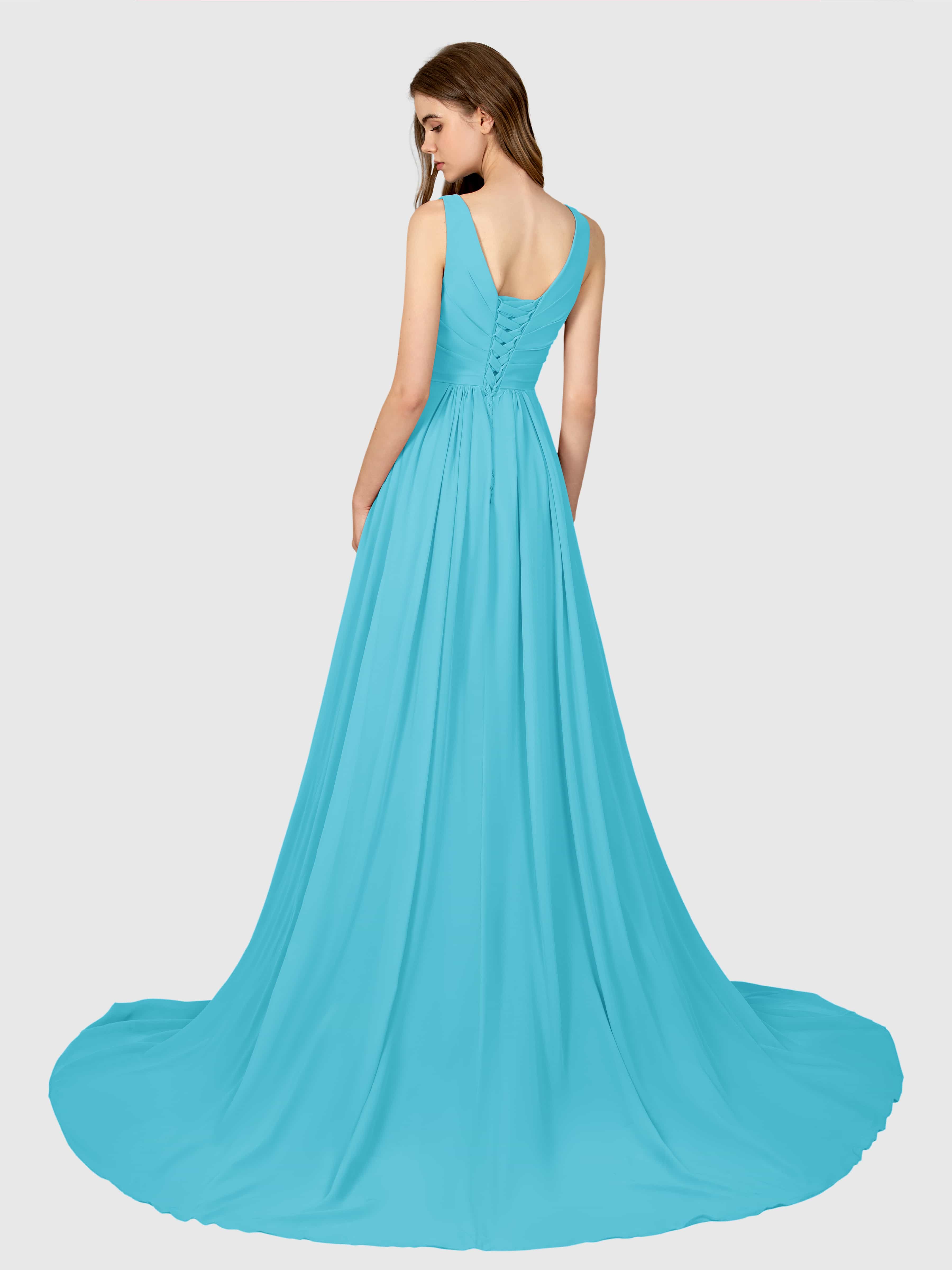 Turn heads in the Gianna dress. With a flowing A-line silhouette, V-neck, ruched waist detail, and lace up back, this beautiful dress is perfect for making a statement at any event. Available in sizes 8-28 with custom size option.