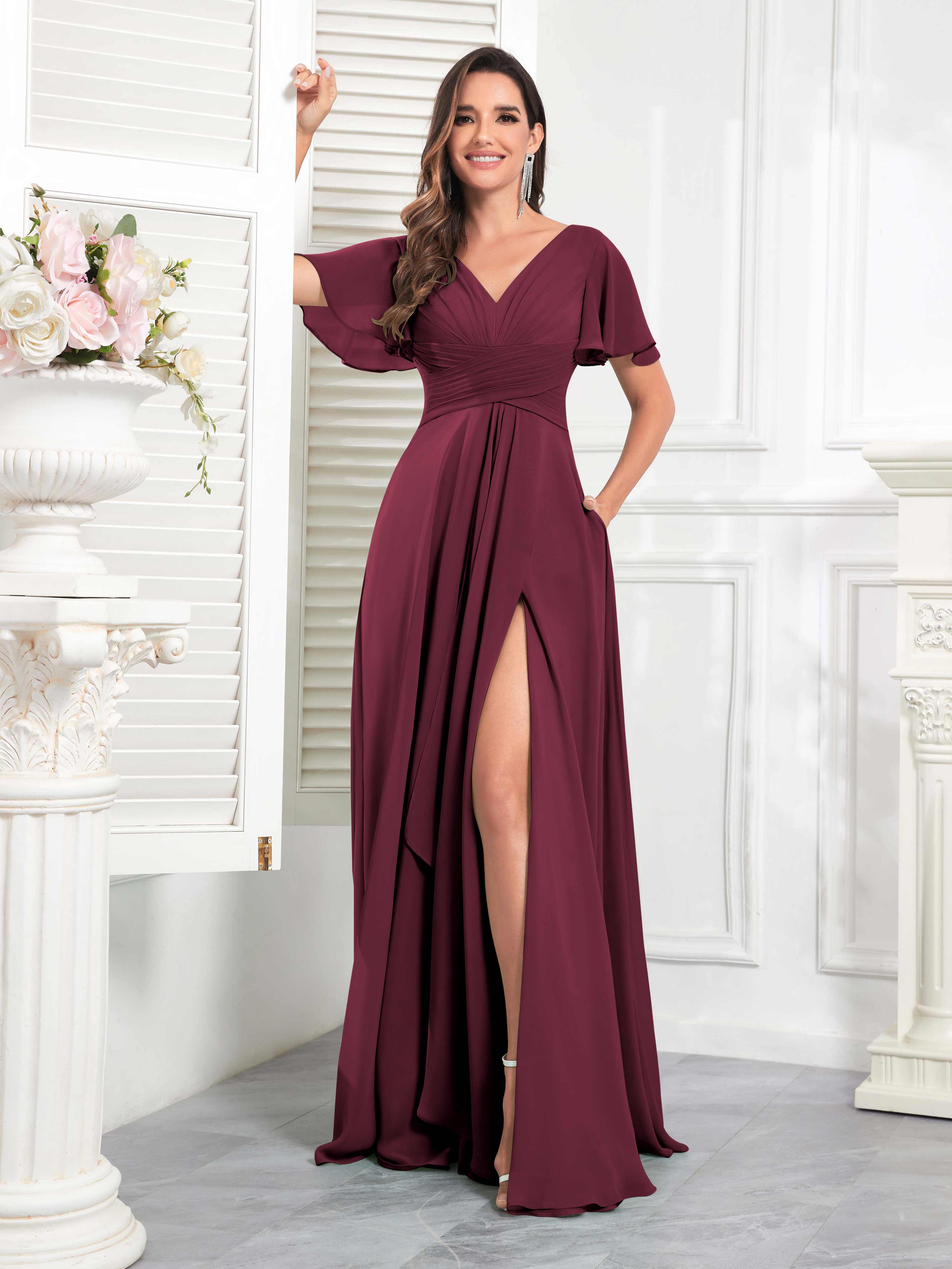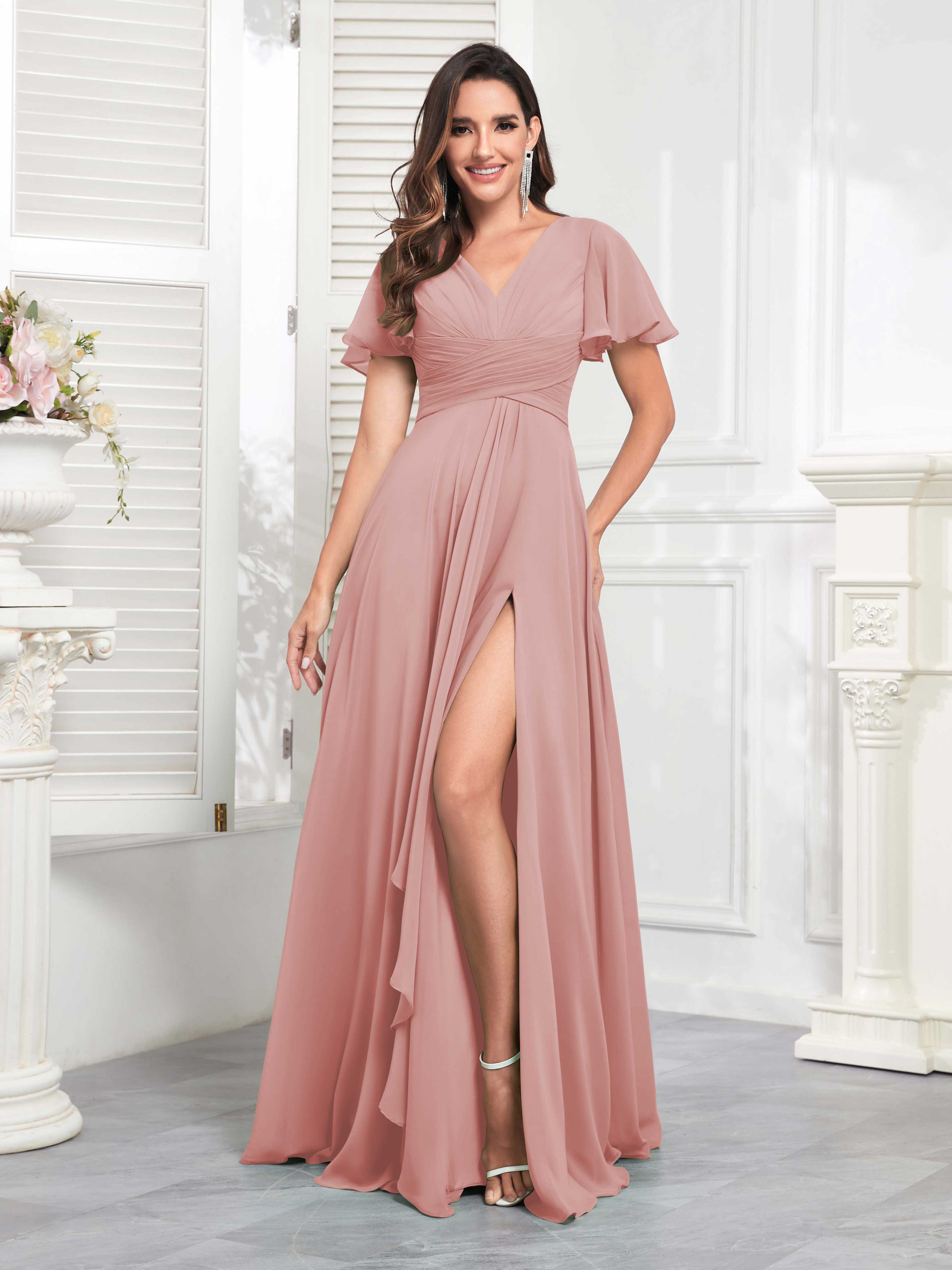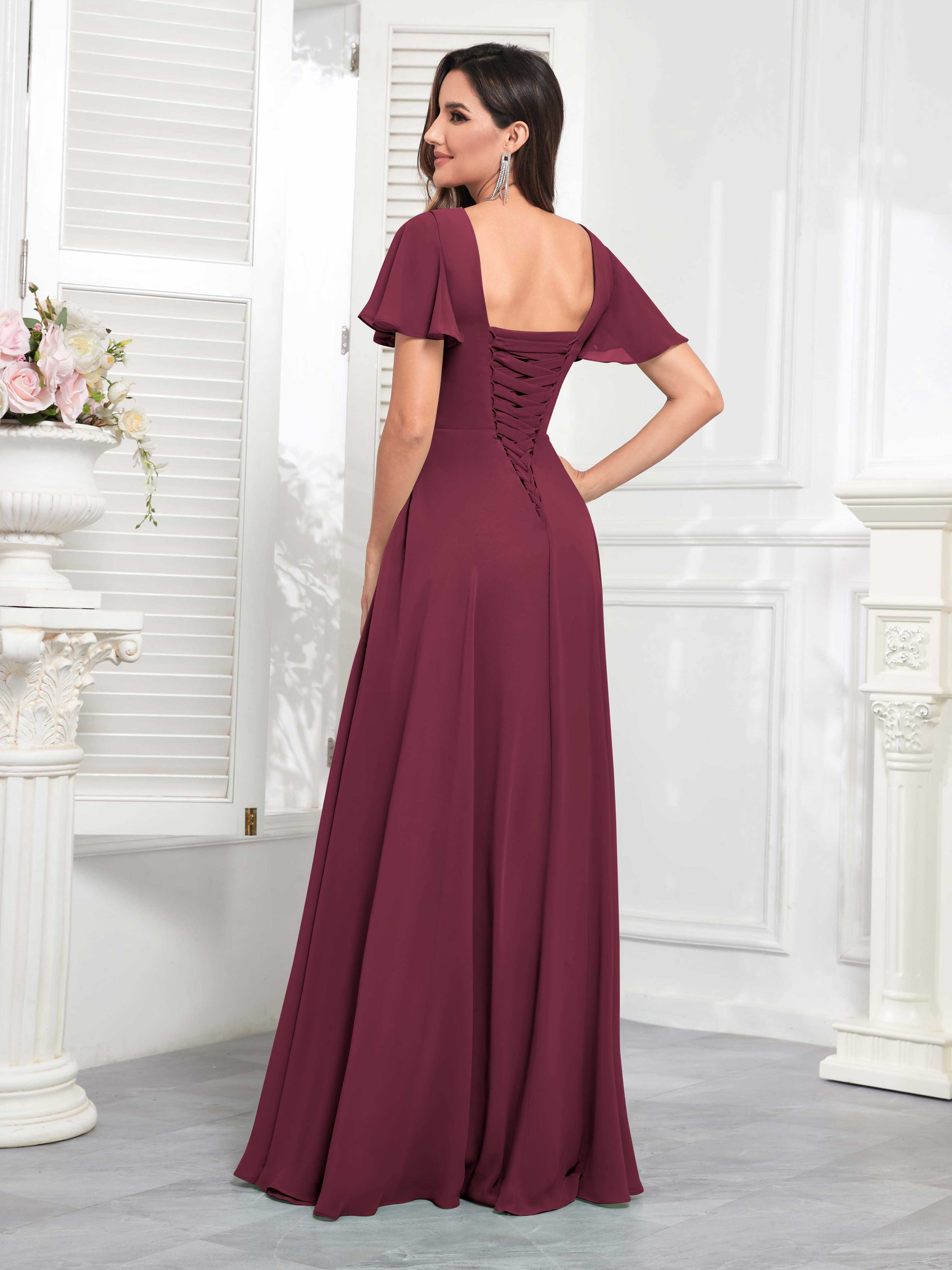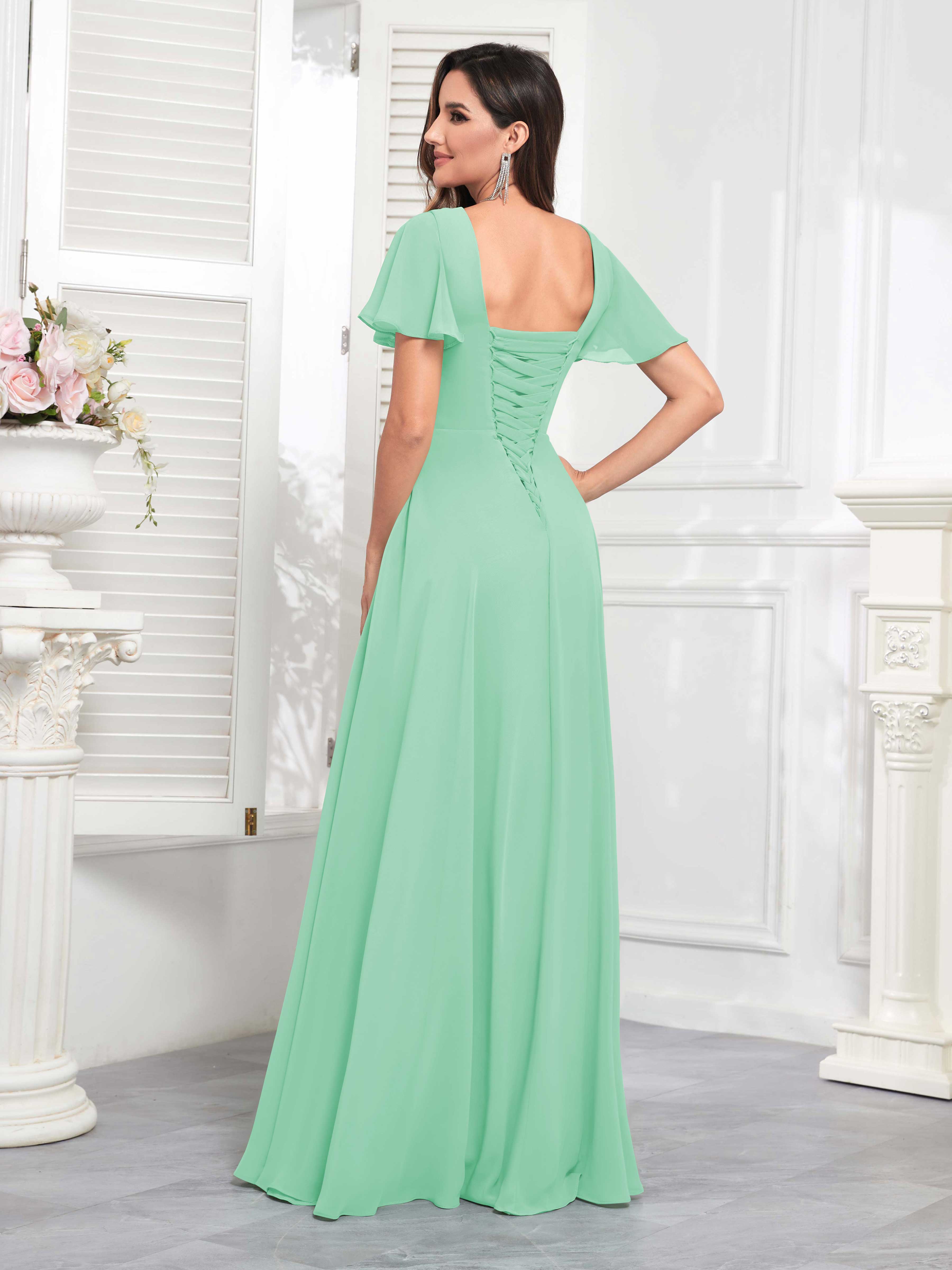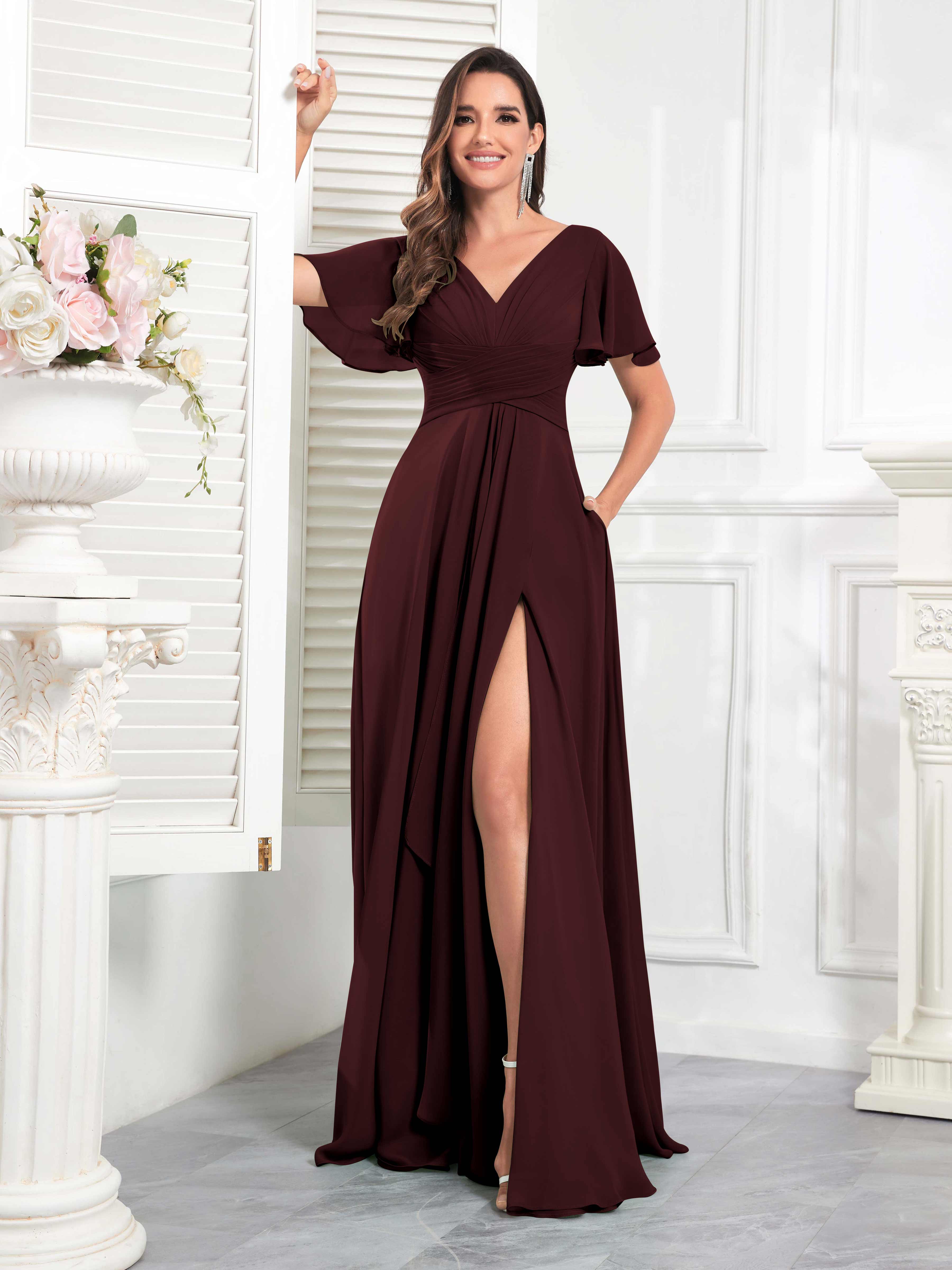 Gracelyn Trendy Short Sleeves Pleated Floor Length Chiffon Bridesmaid Dresses