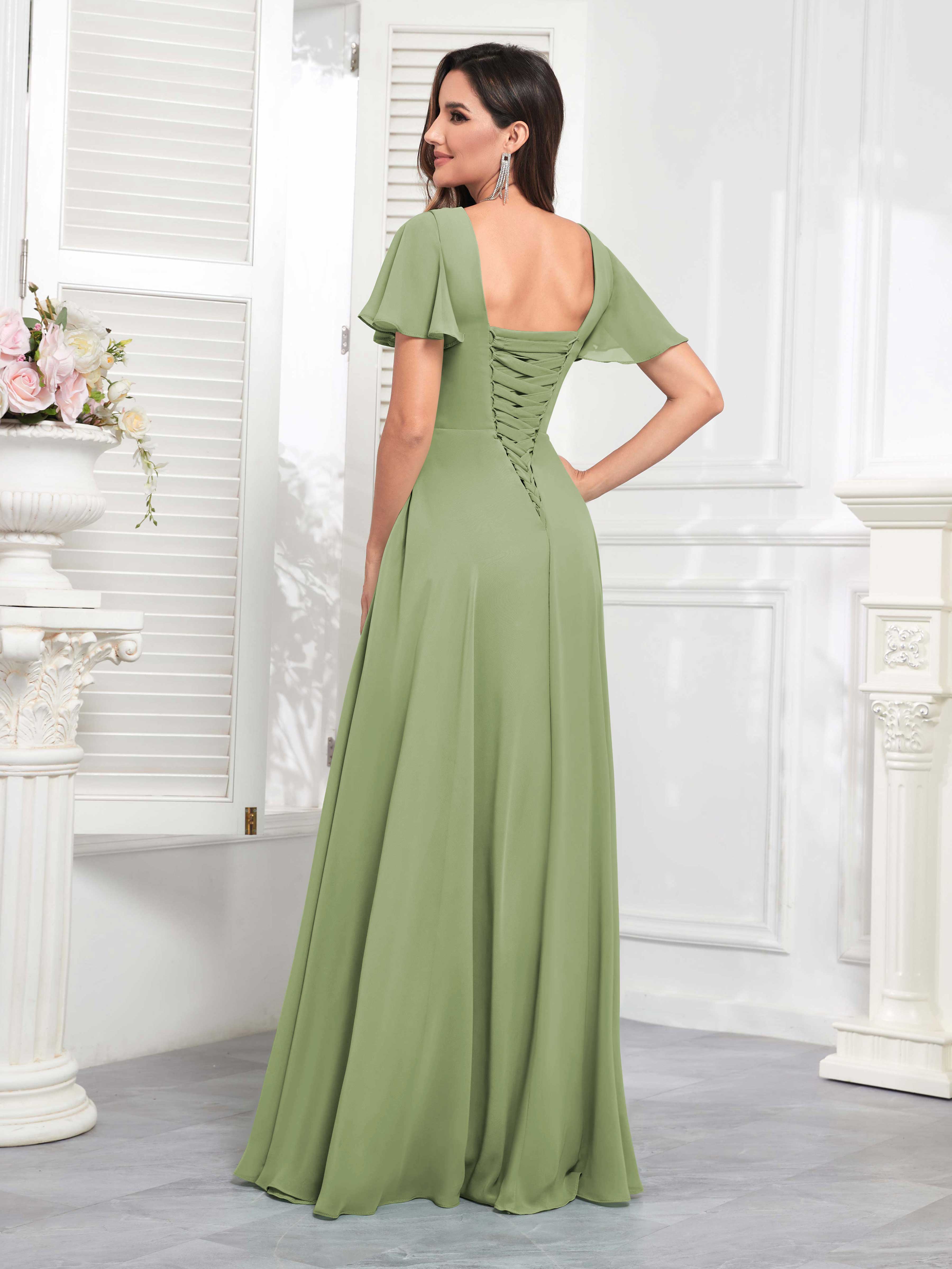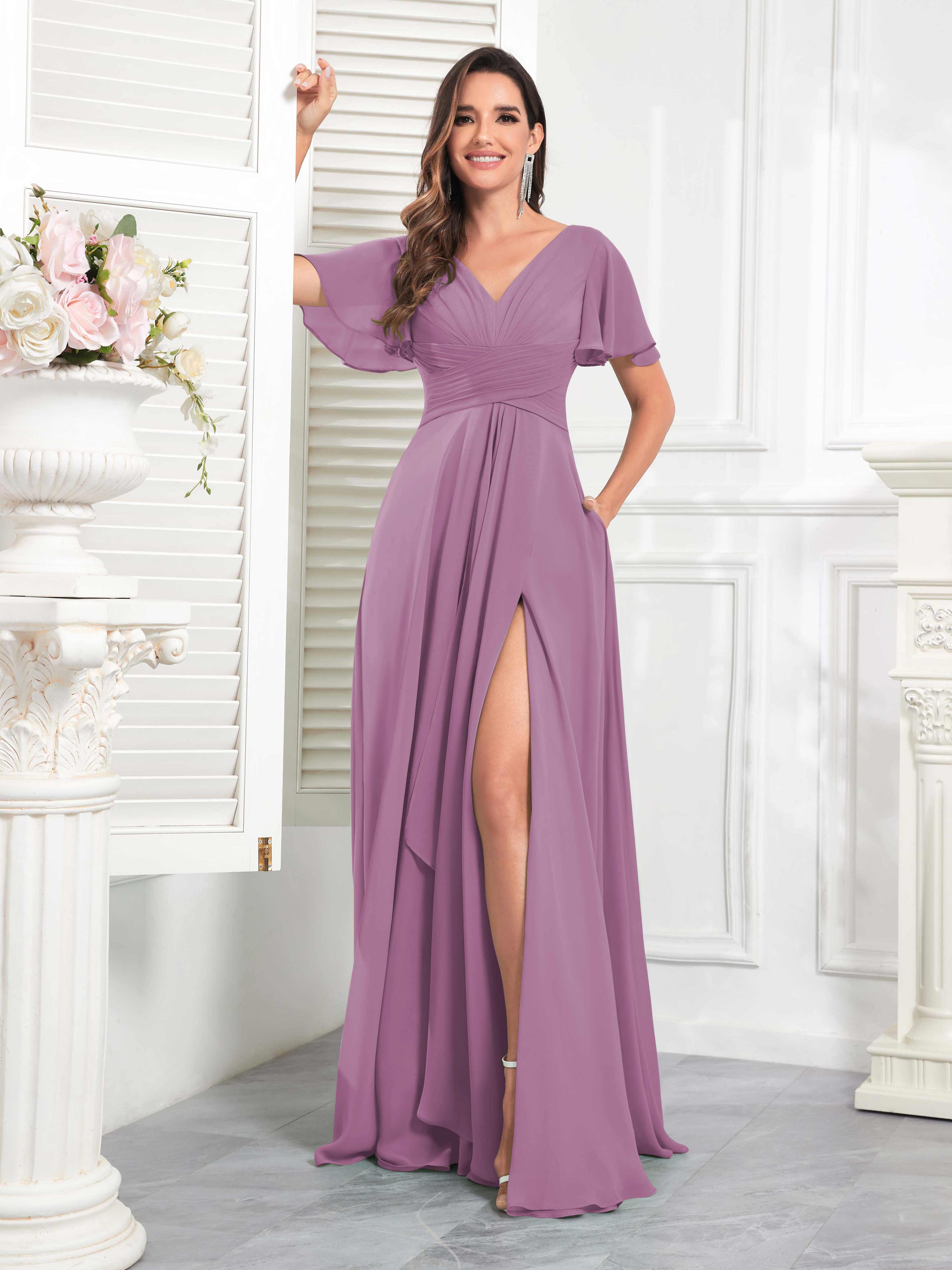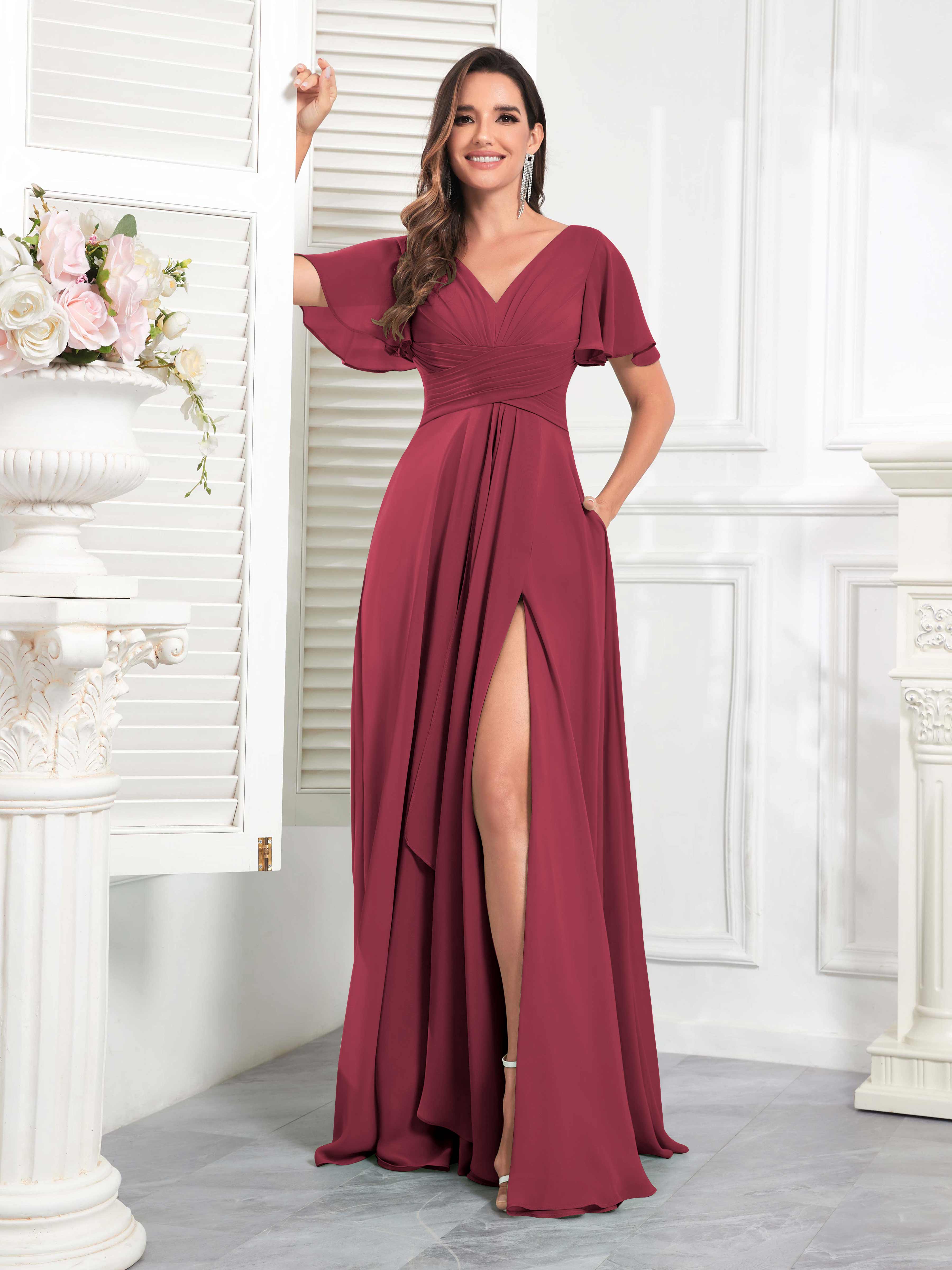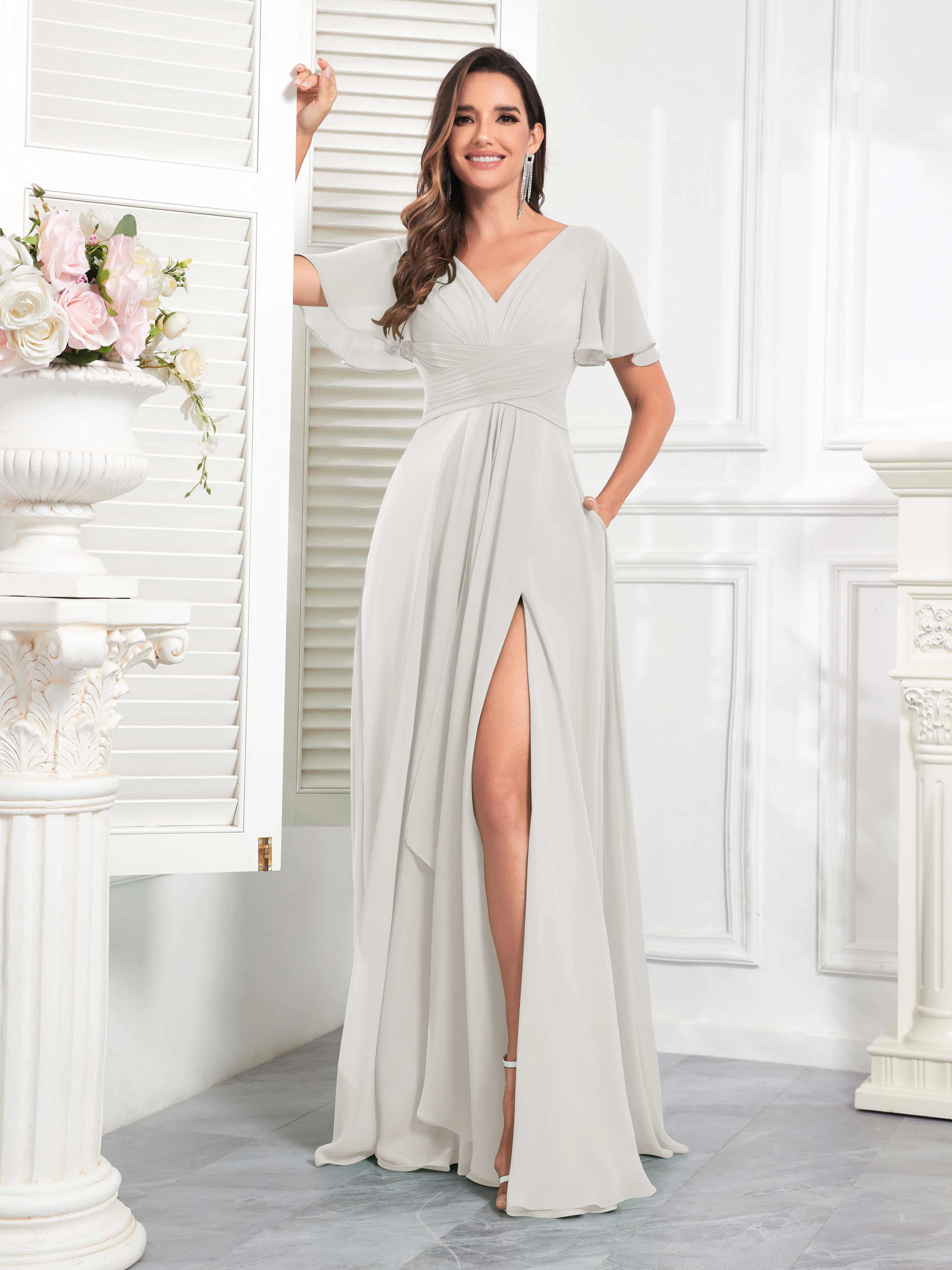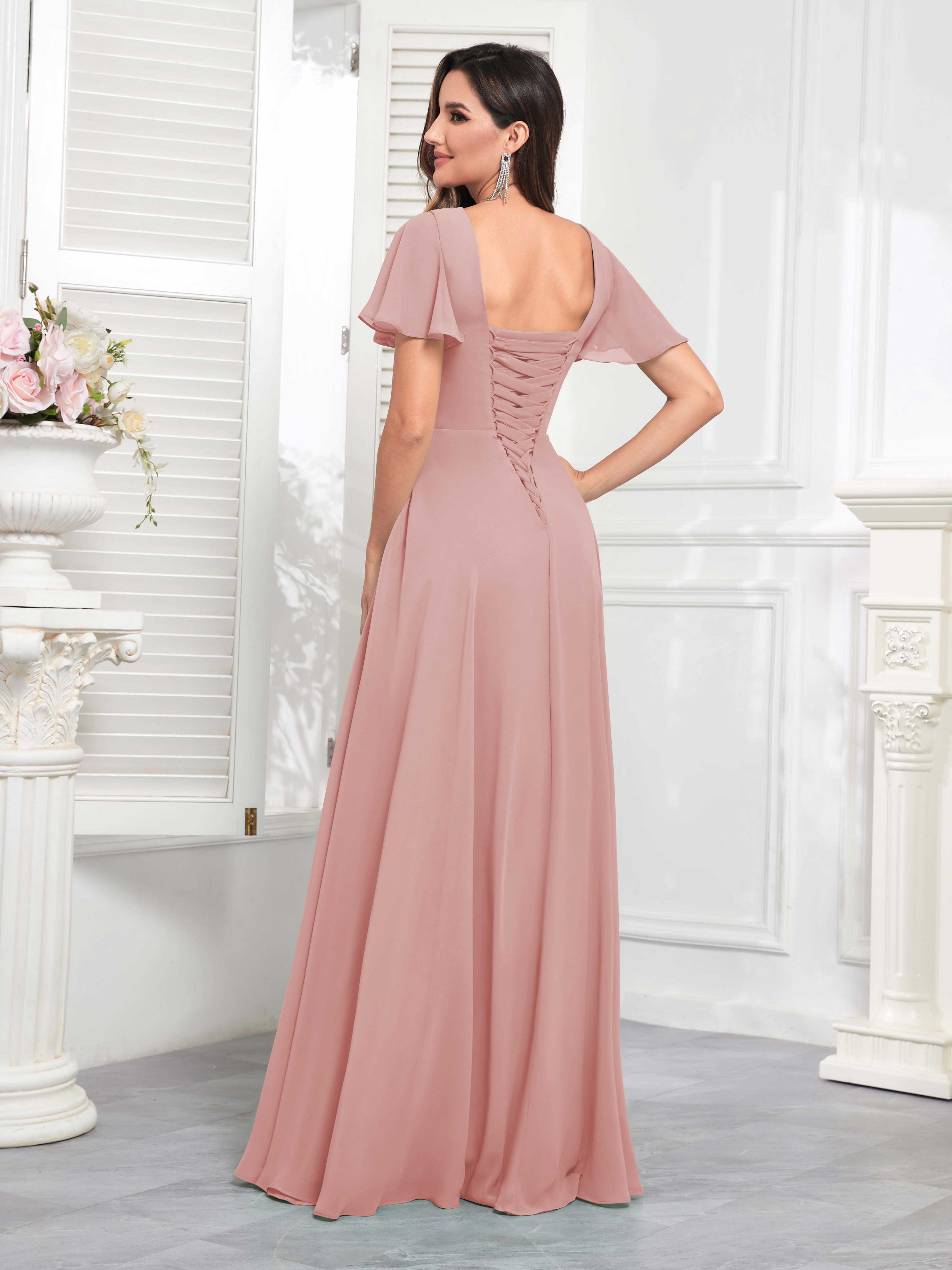 Gracelyn Trendy Short Sleeves Pleated Floor Length Chiffon Bridesmaid Dresses