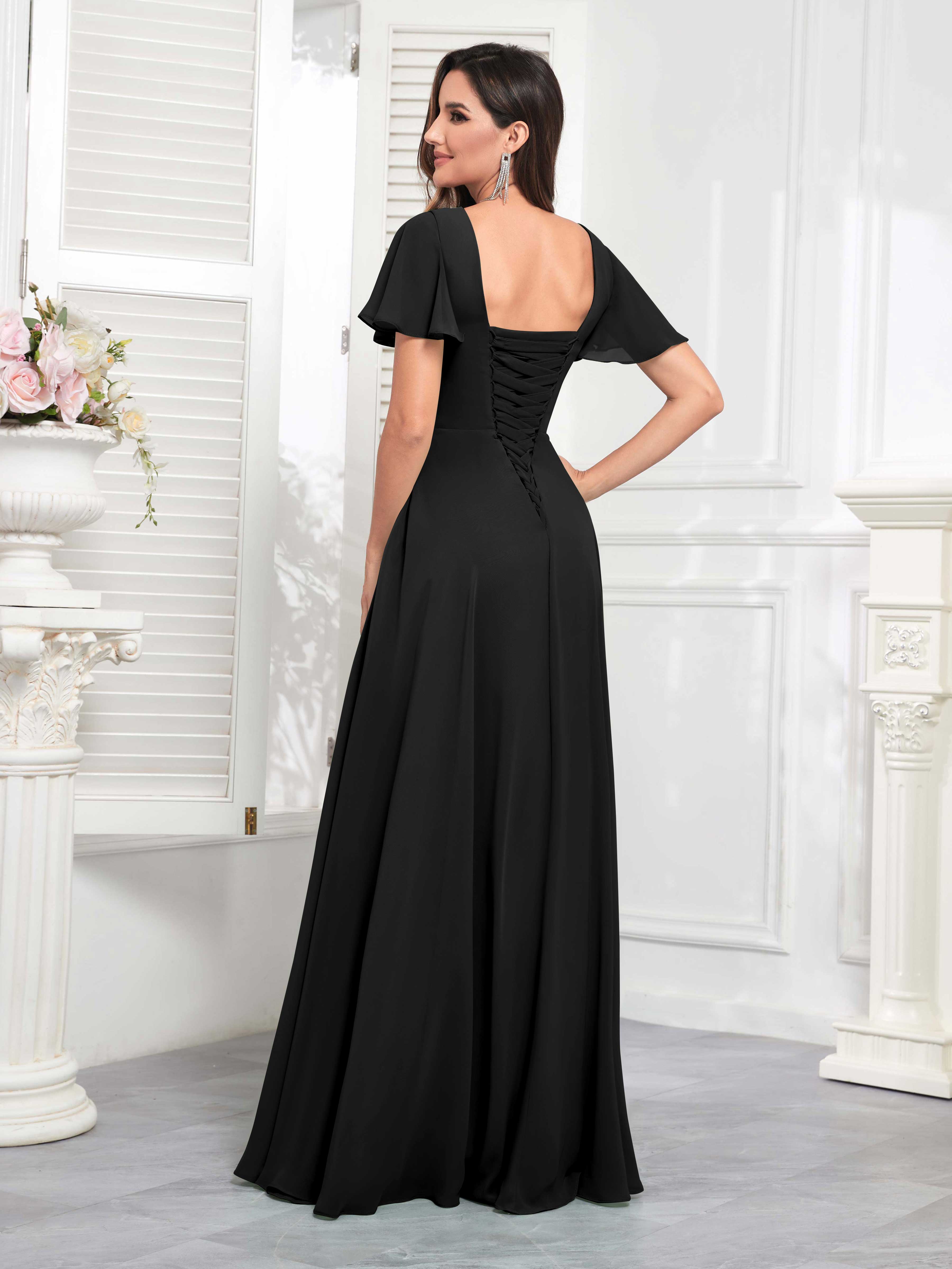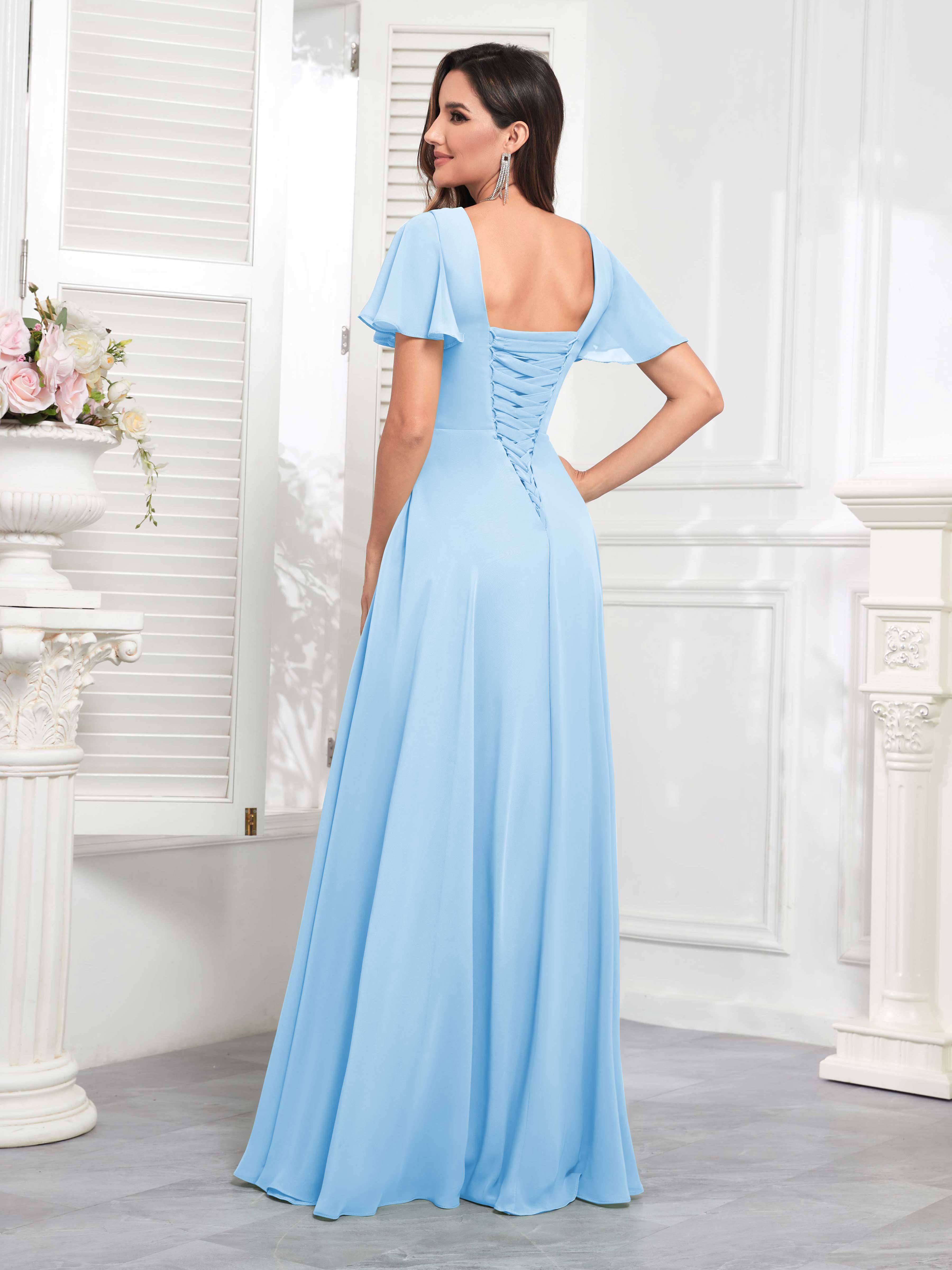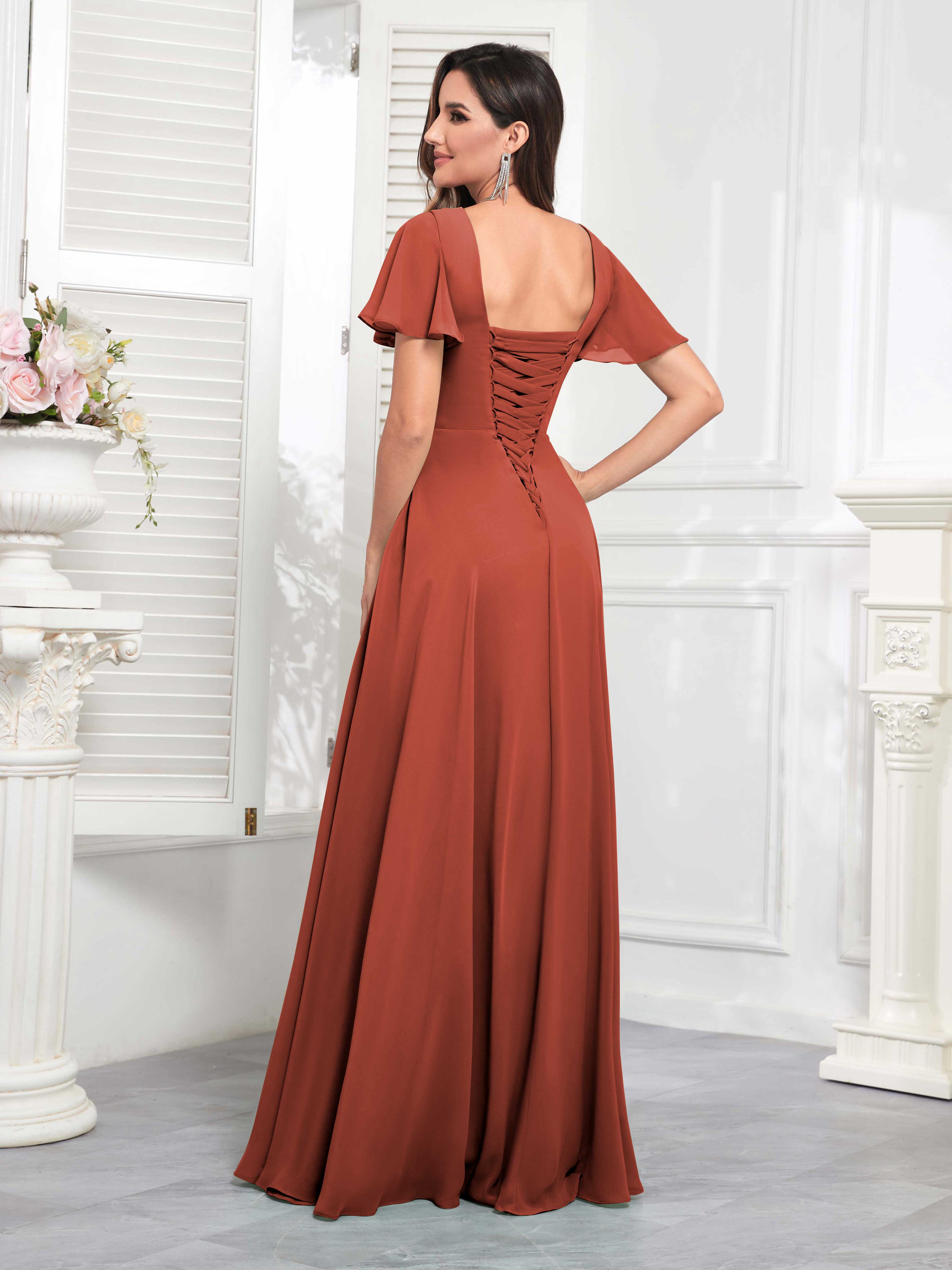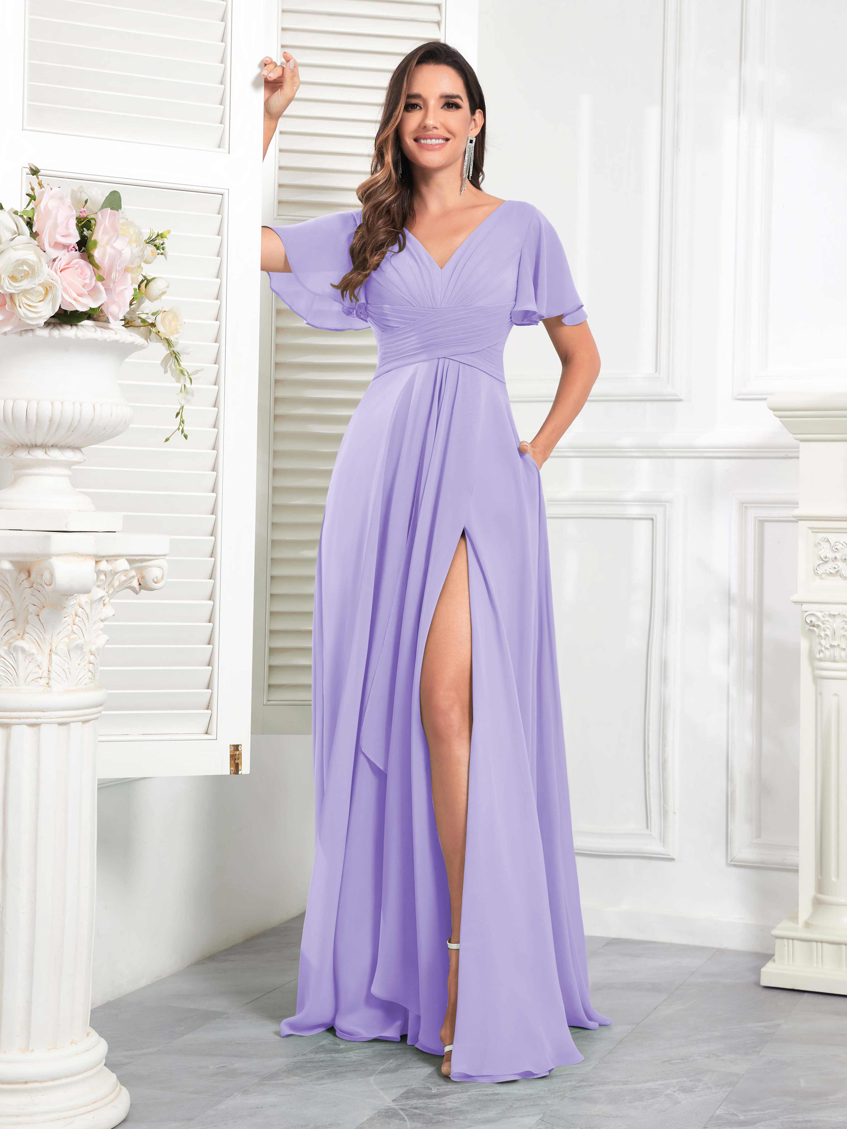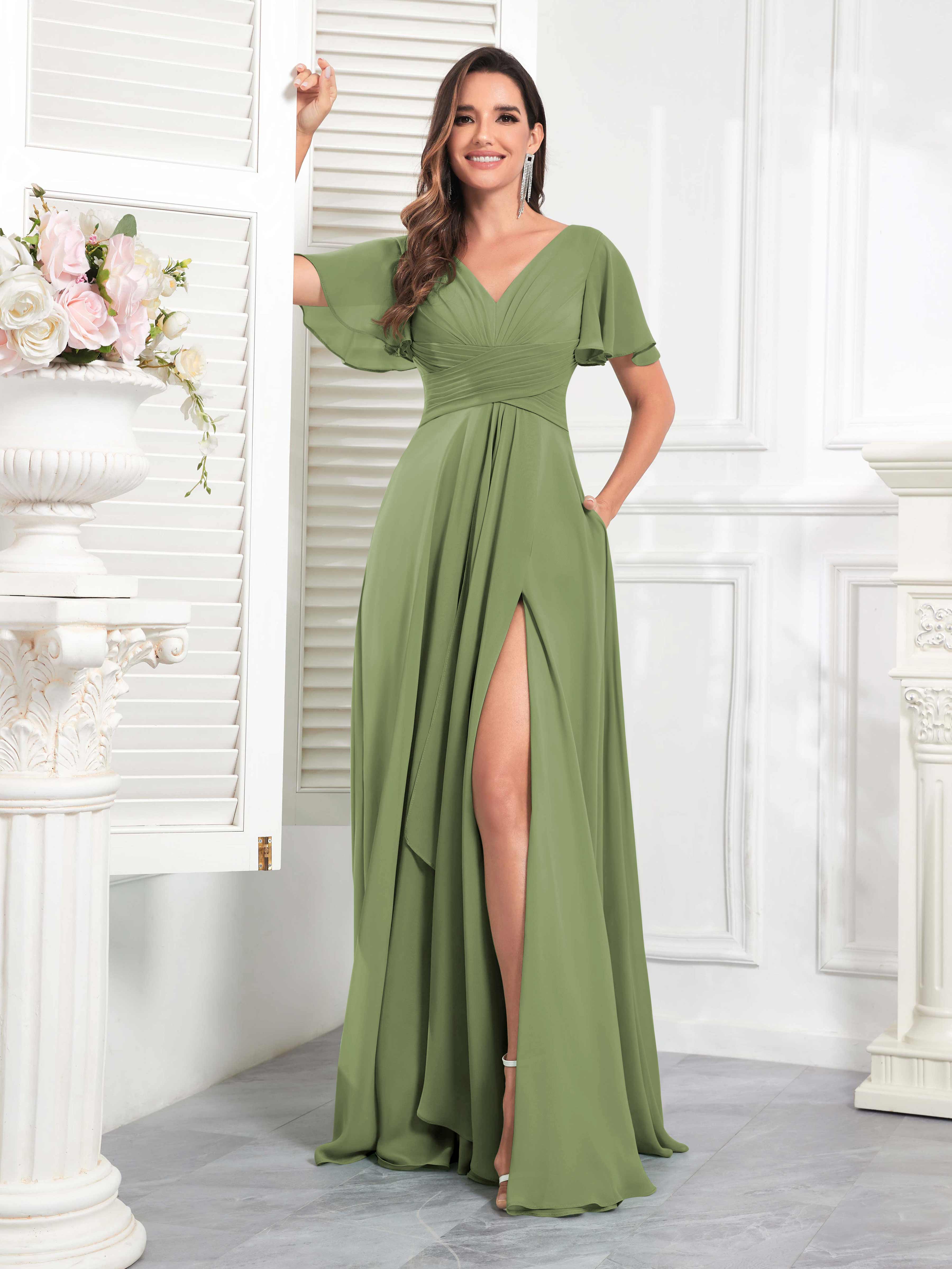 Gracelyn Trendy Short Sleeves Pleated Floor Length Chiffon Bridesmaid Dresses