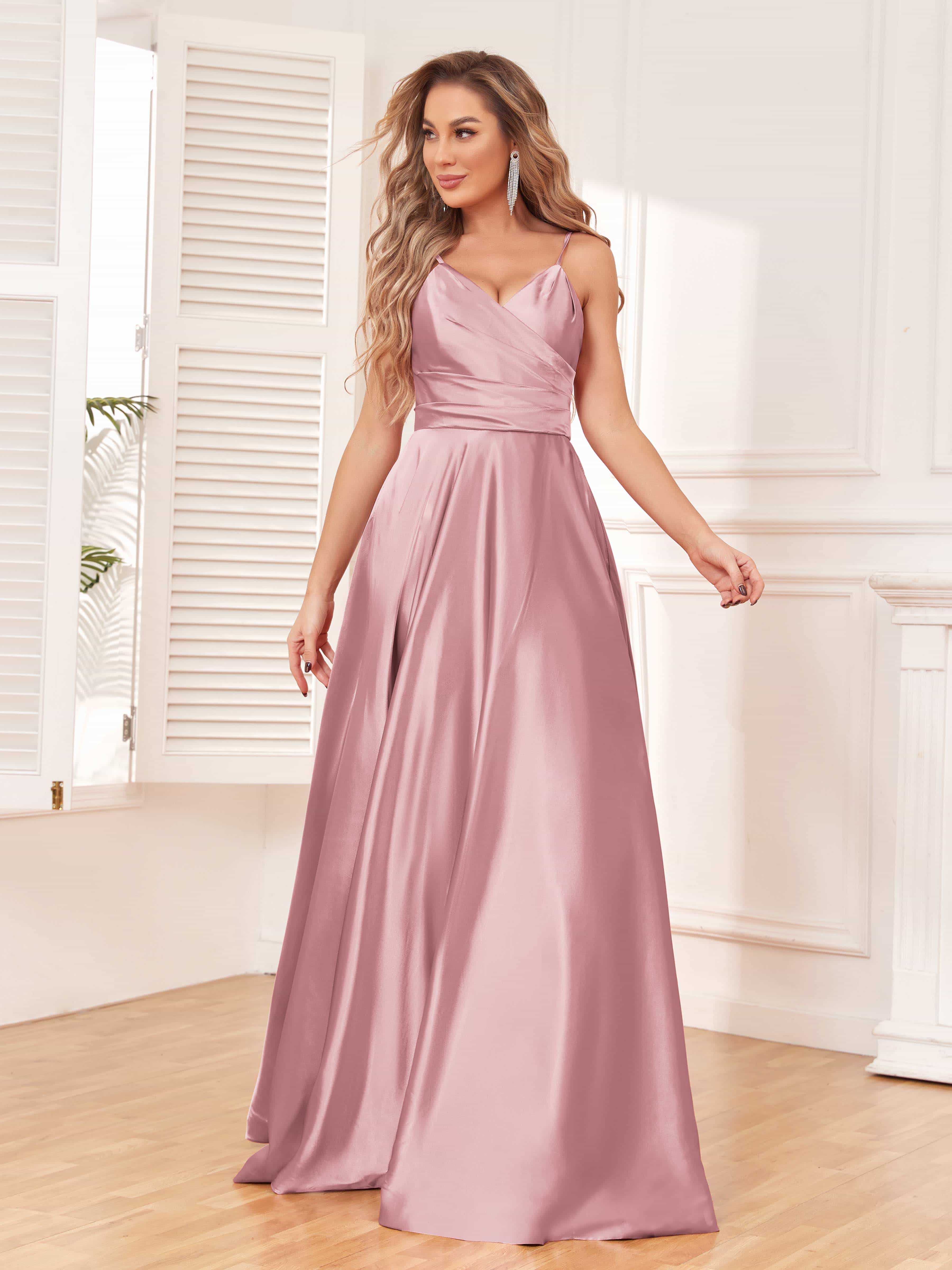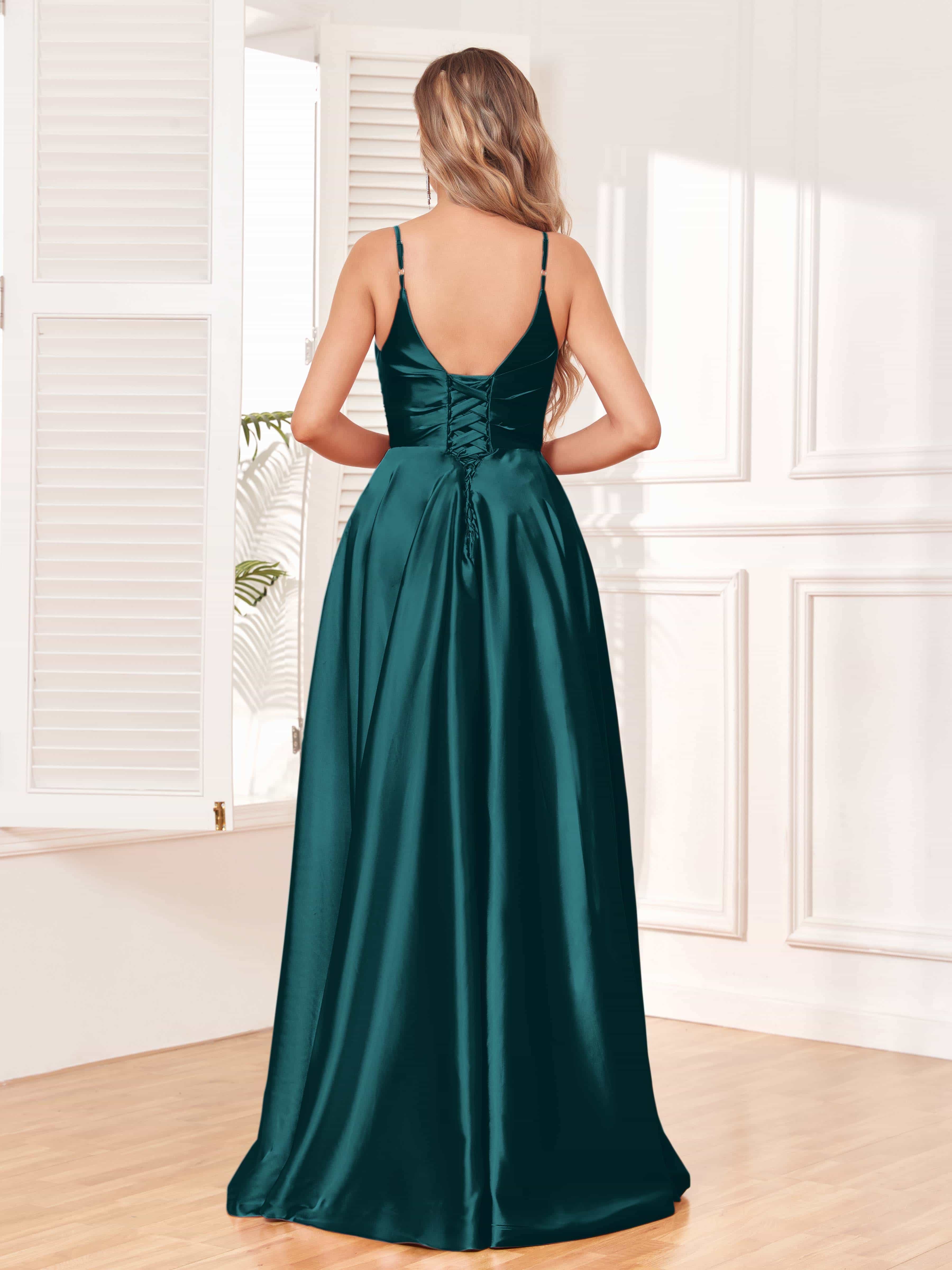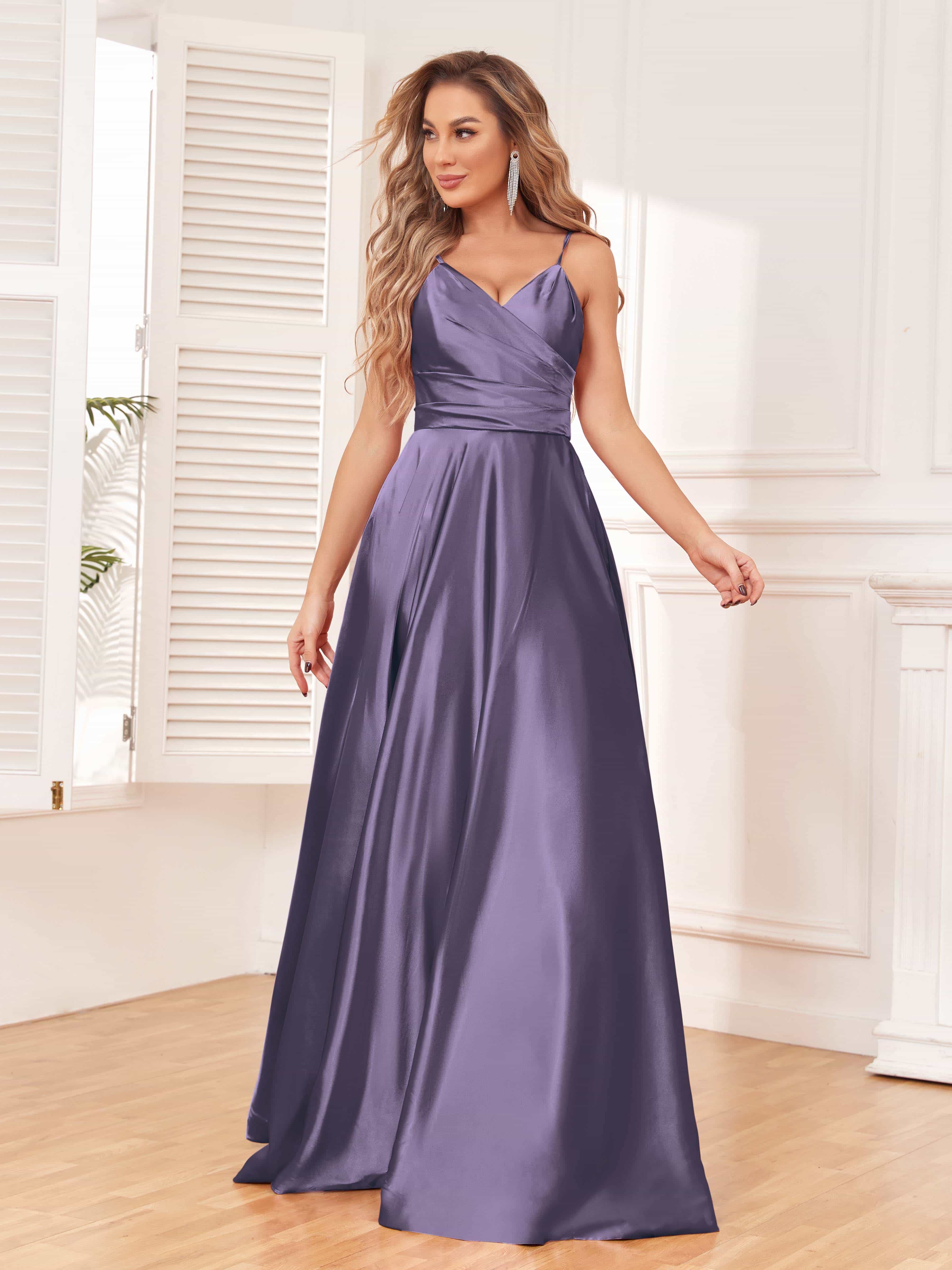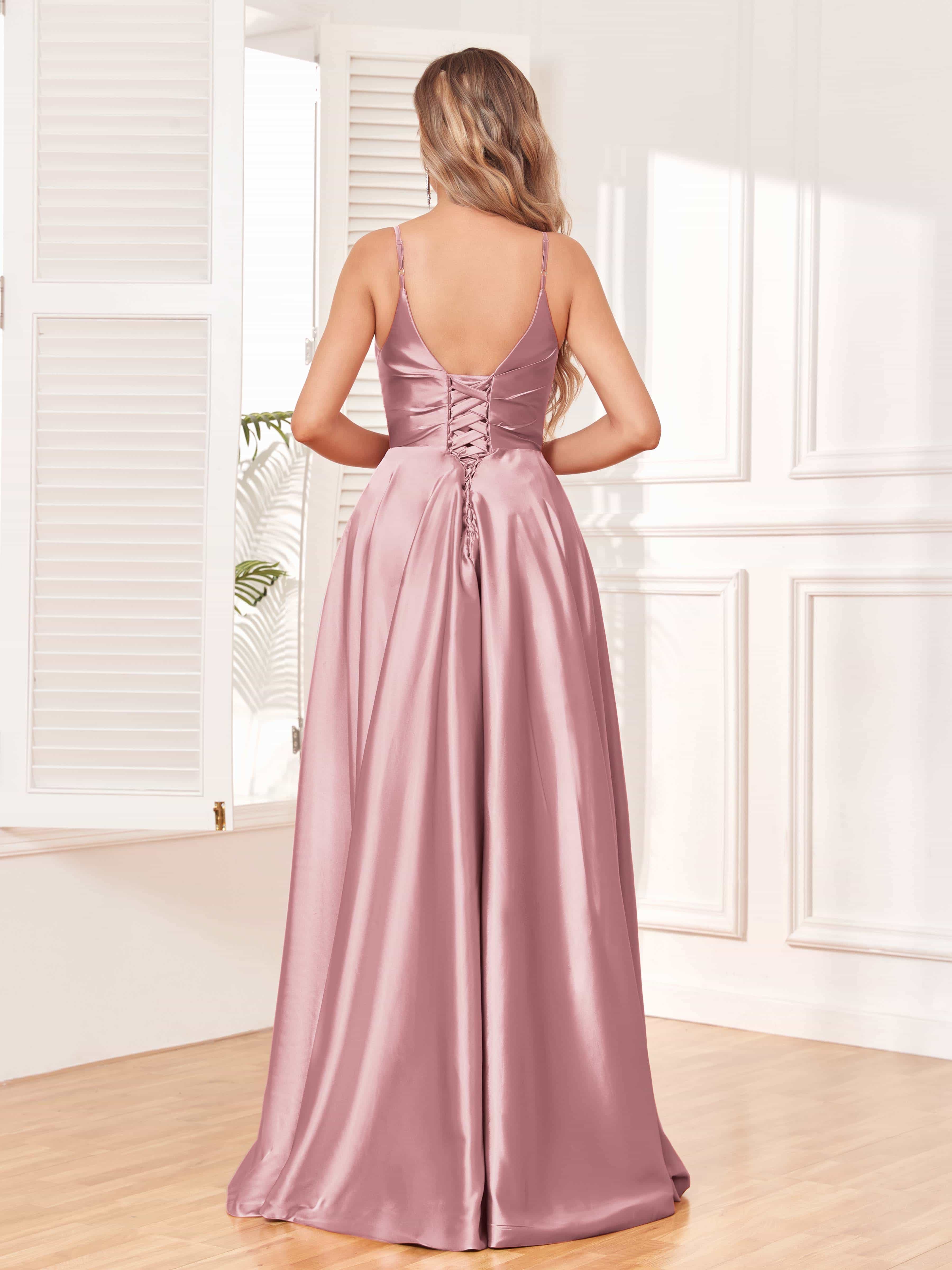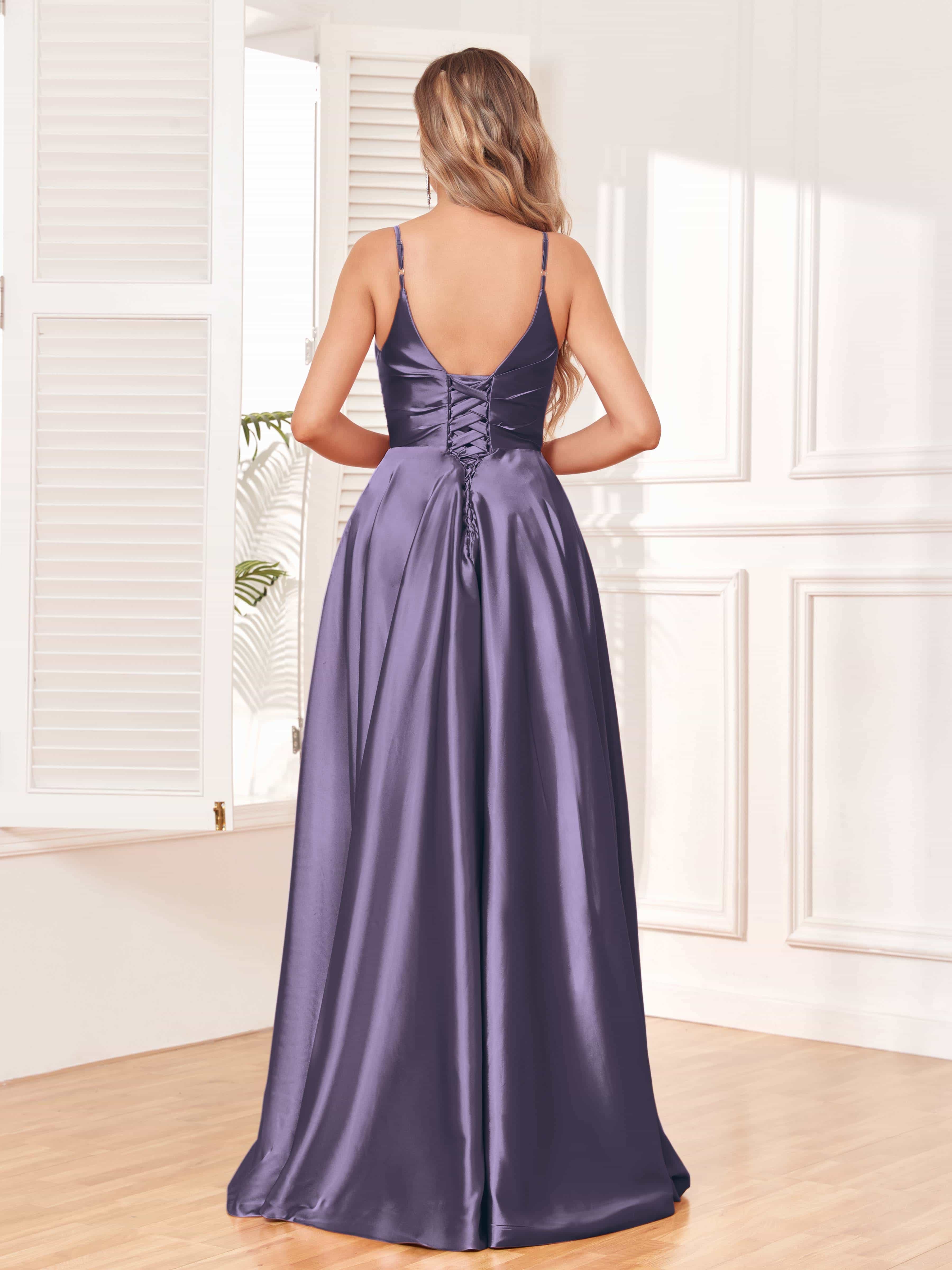 Hazel V-Neck Crossed Straps Slit Satin Dresses
