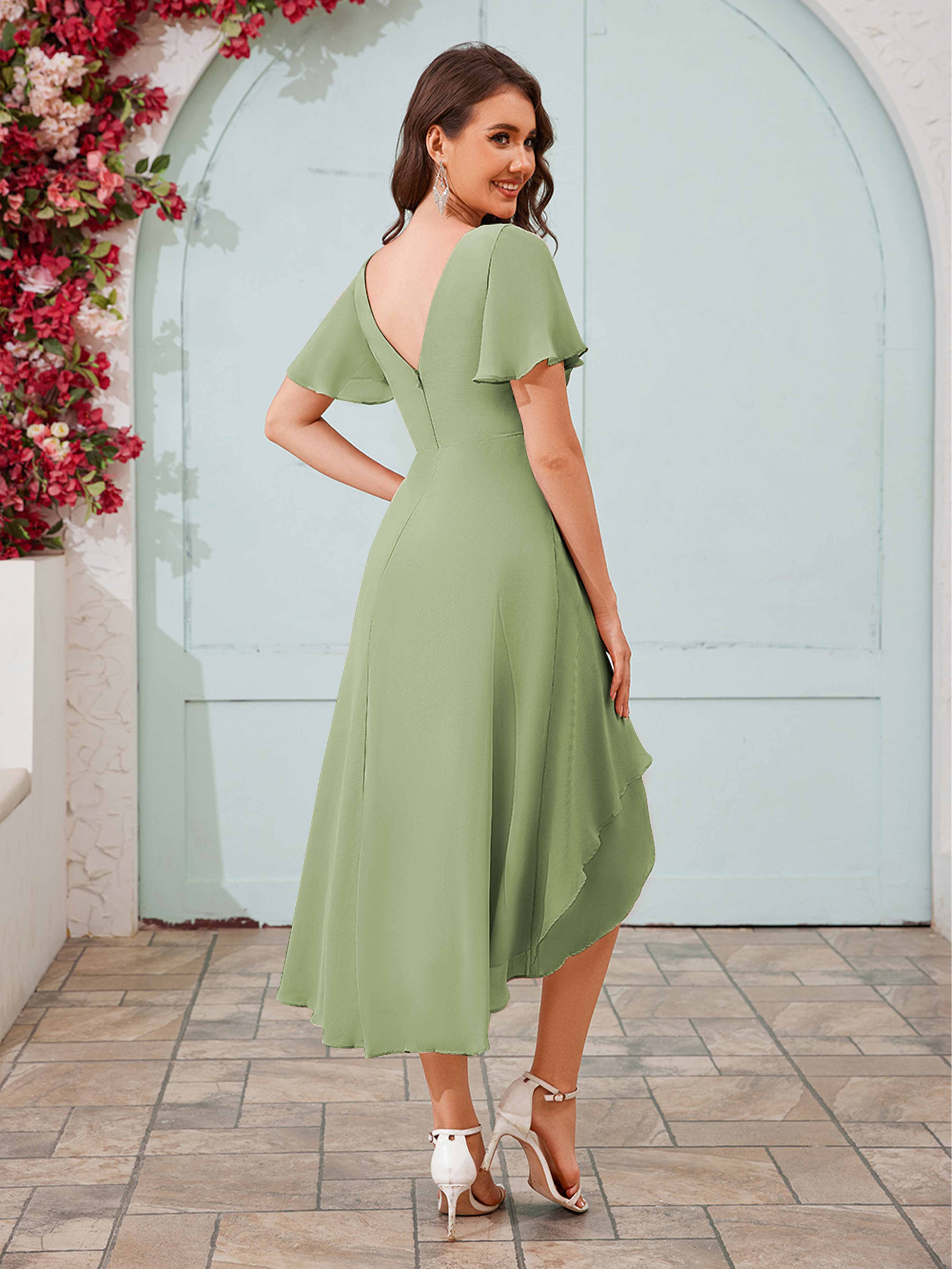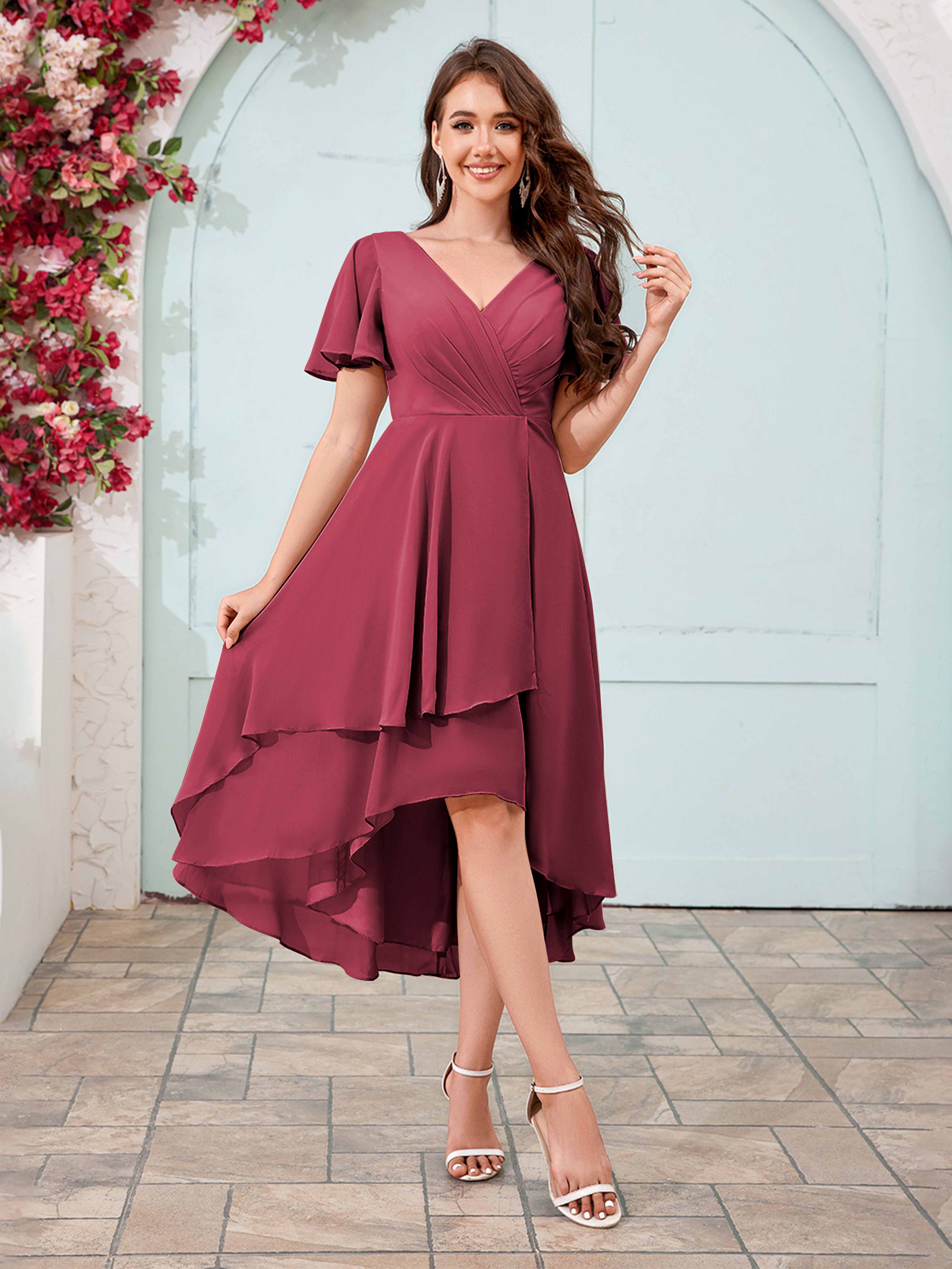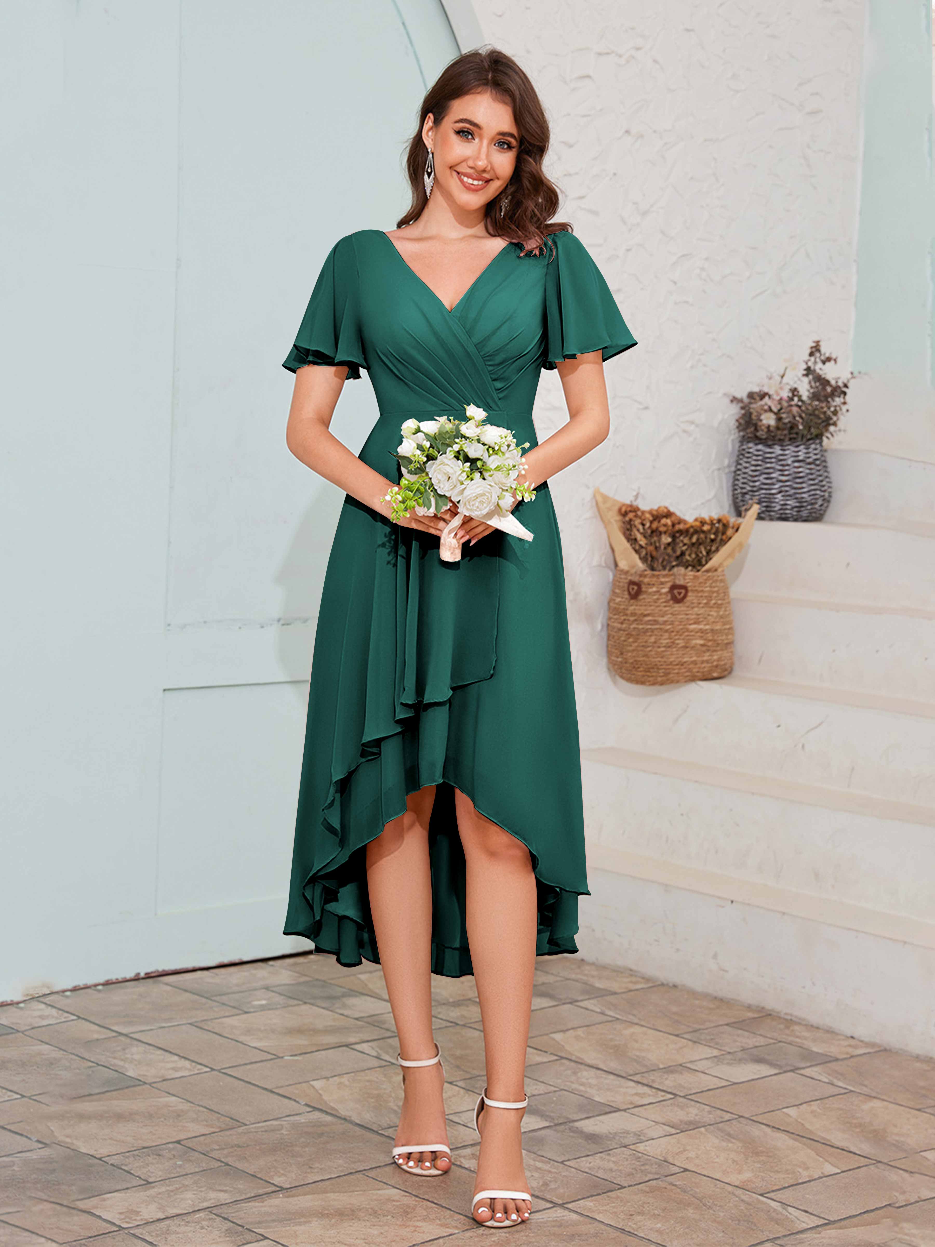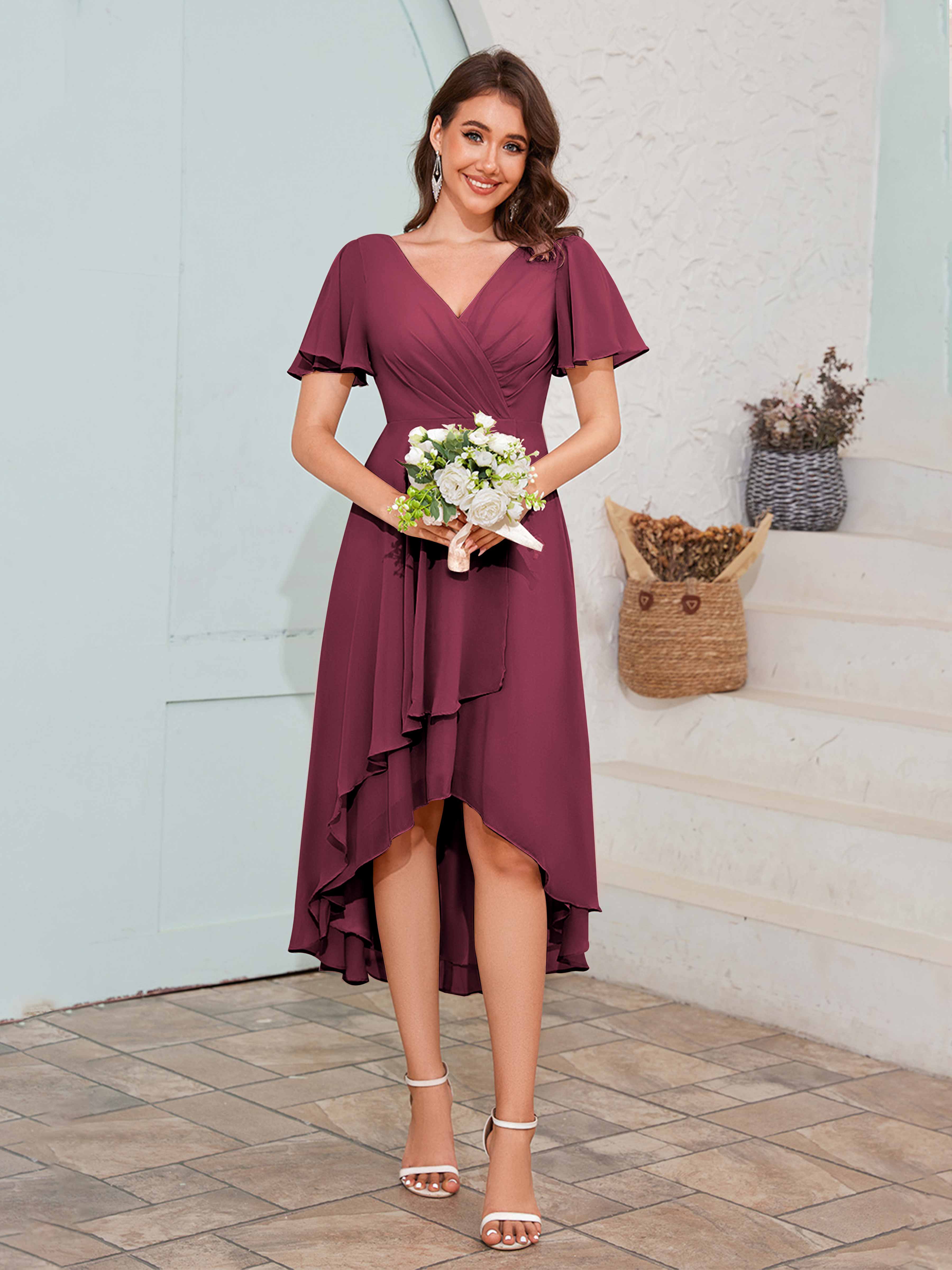 Helen Chic V Neck Ruched High Low Chiffon Bridesmaid Dresses