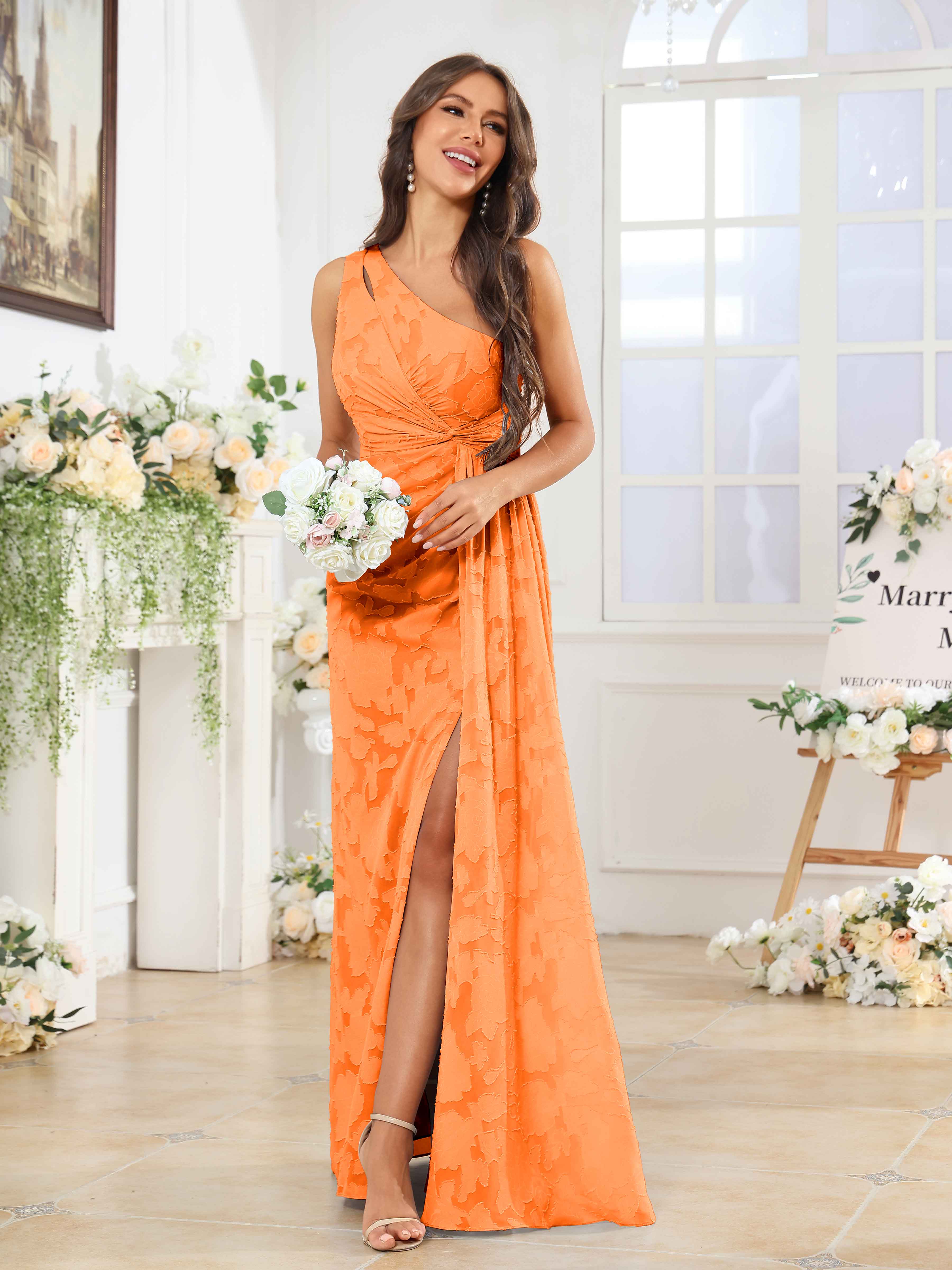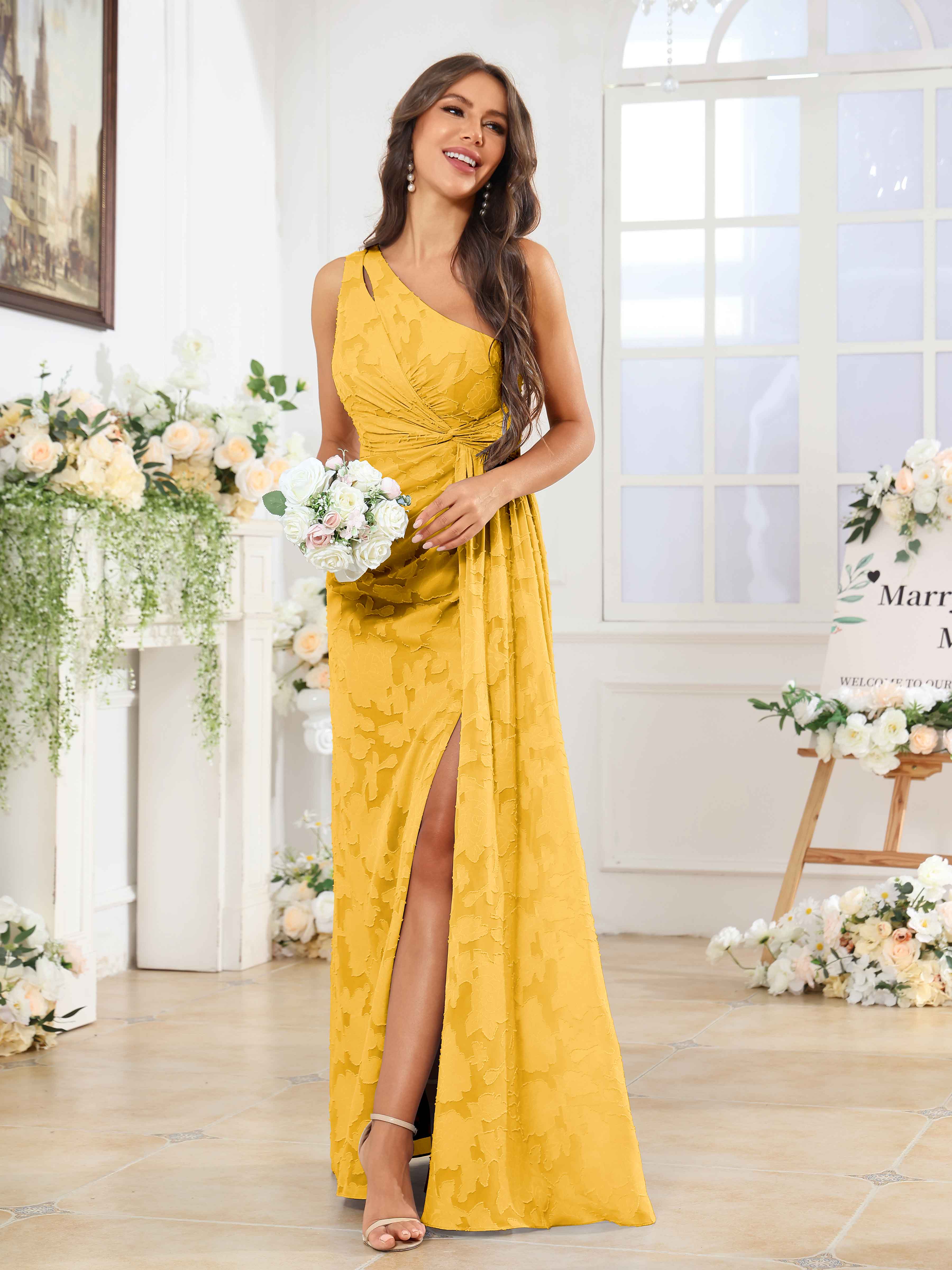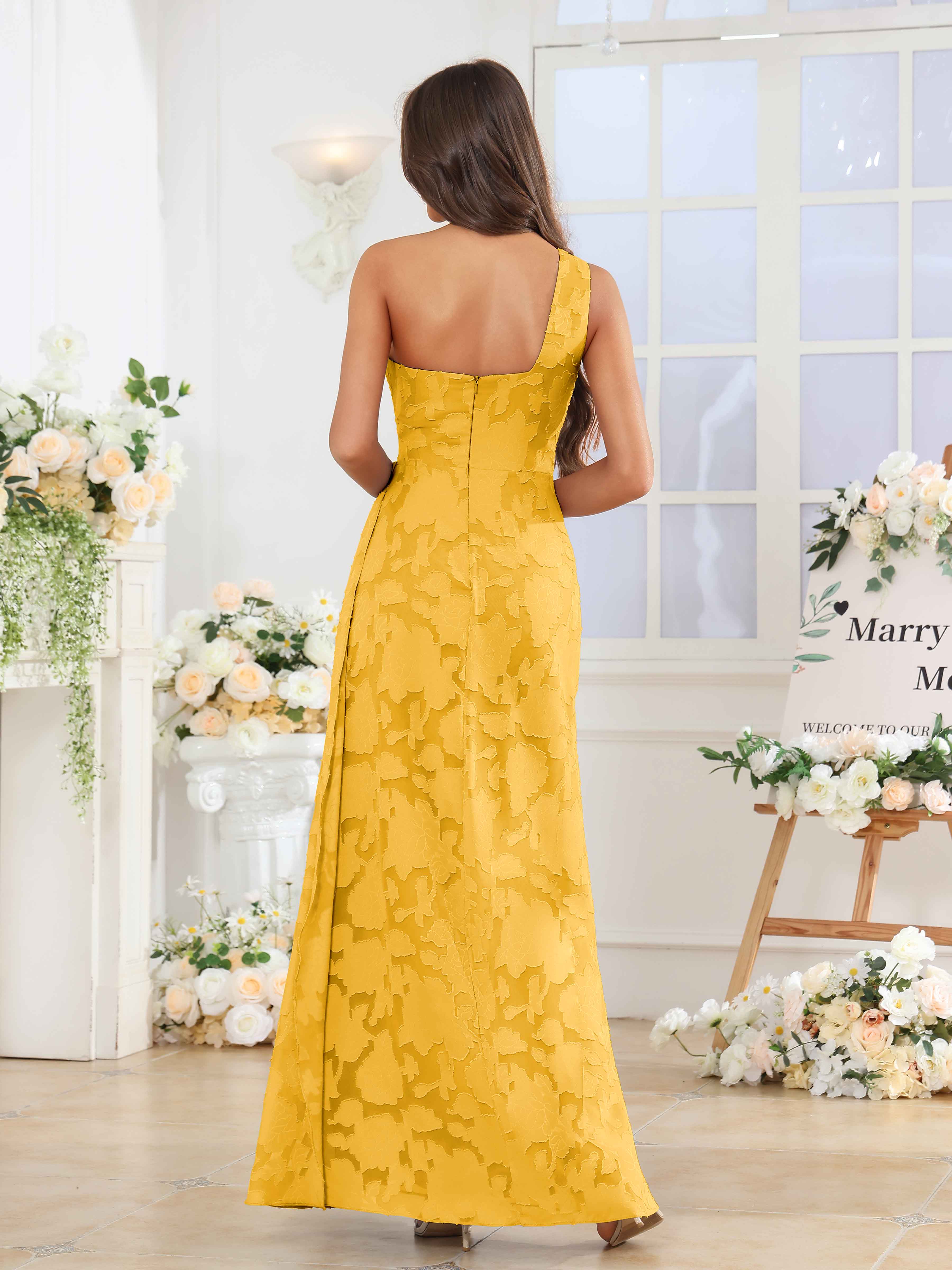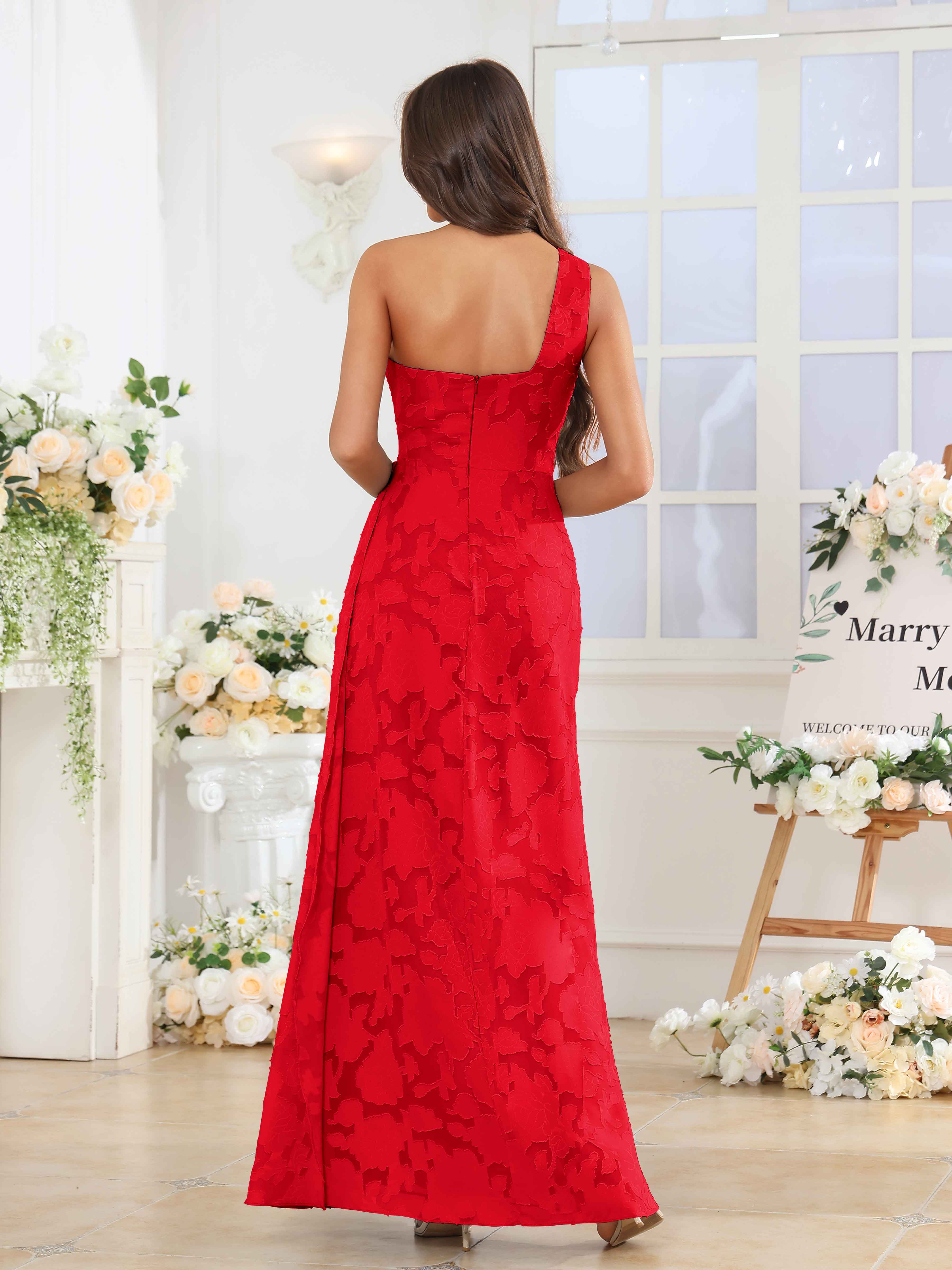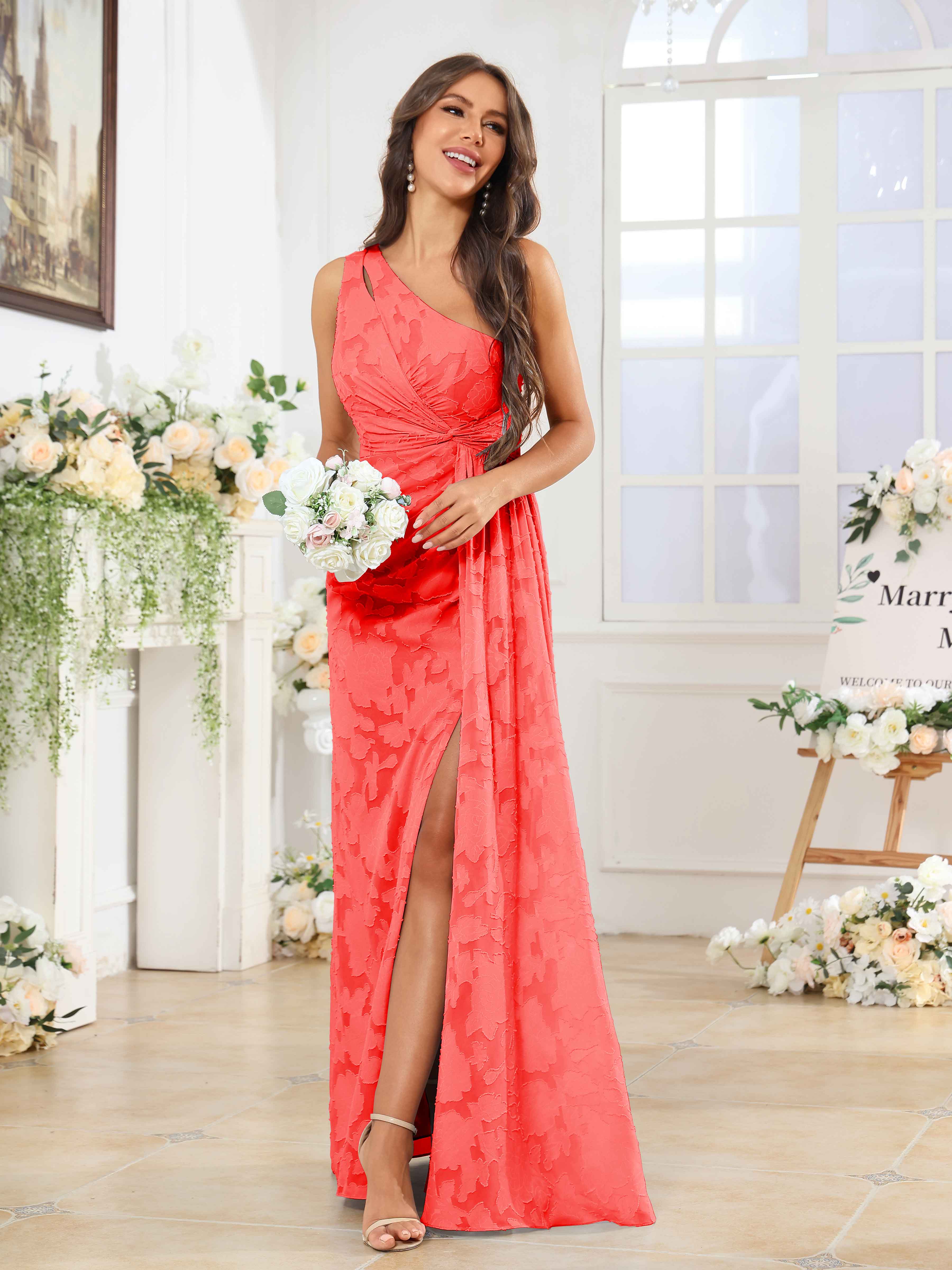Hollis Enchanting One Shoulder Pleated Slit Long Floral Lace Bridesmaid Dresses