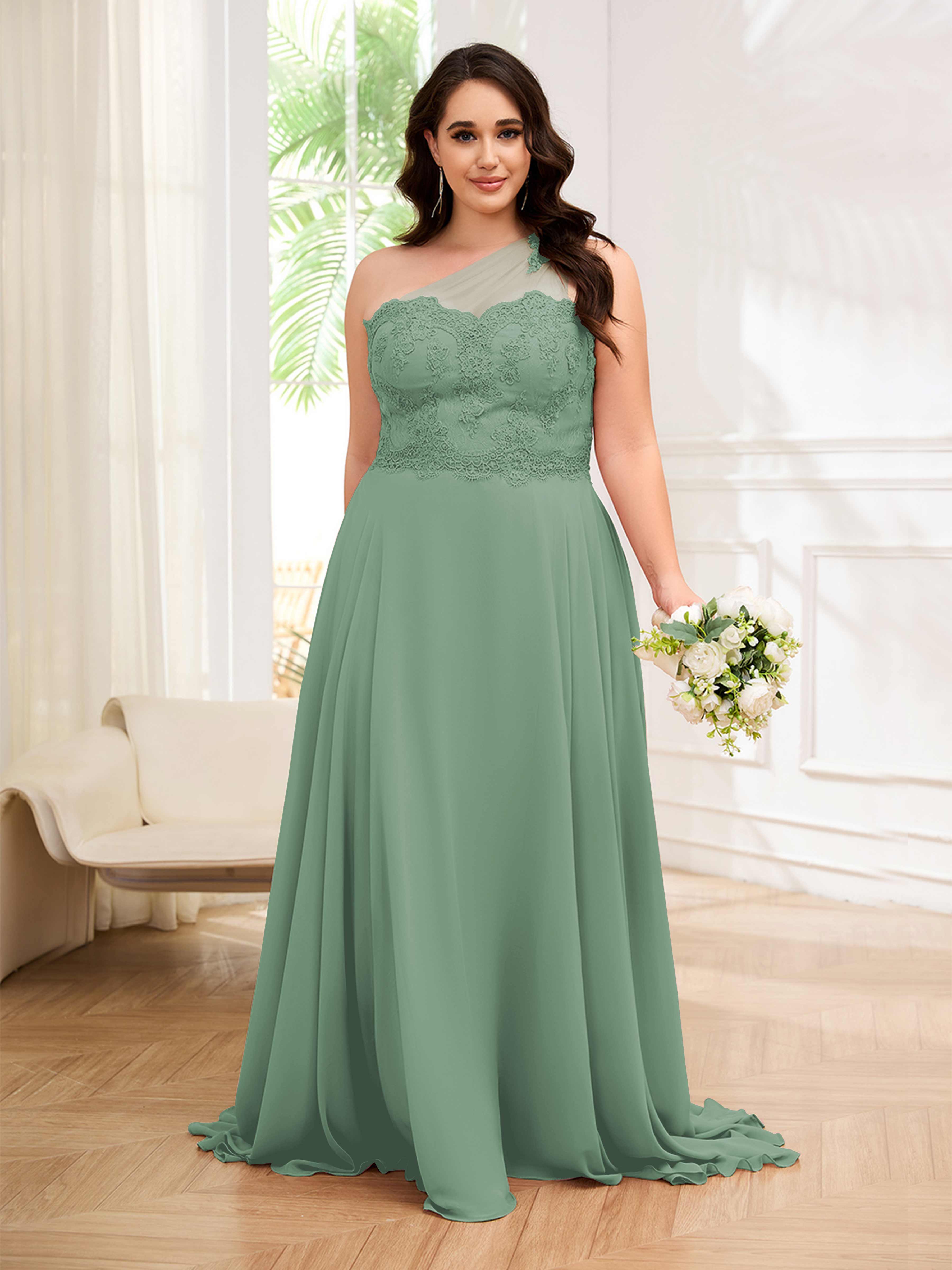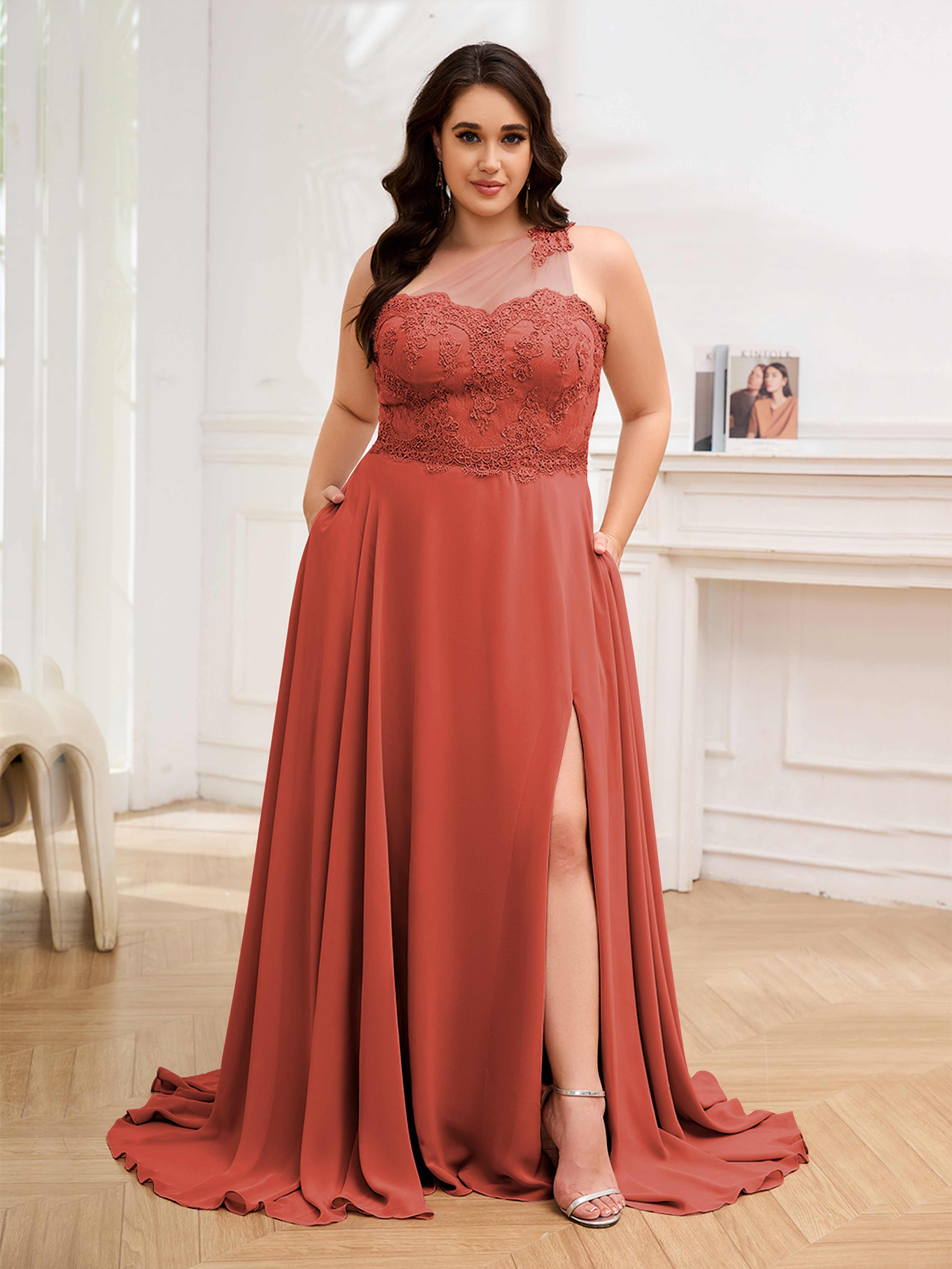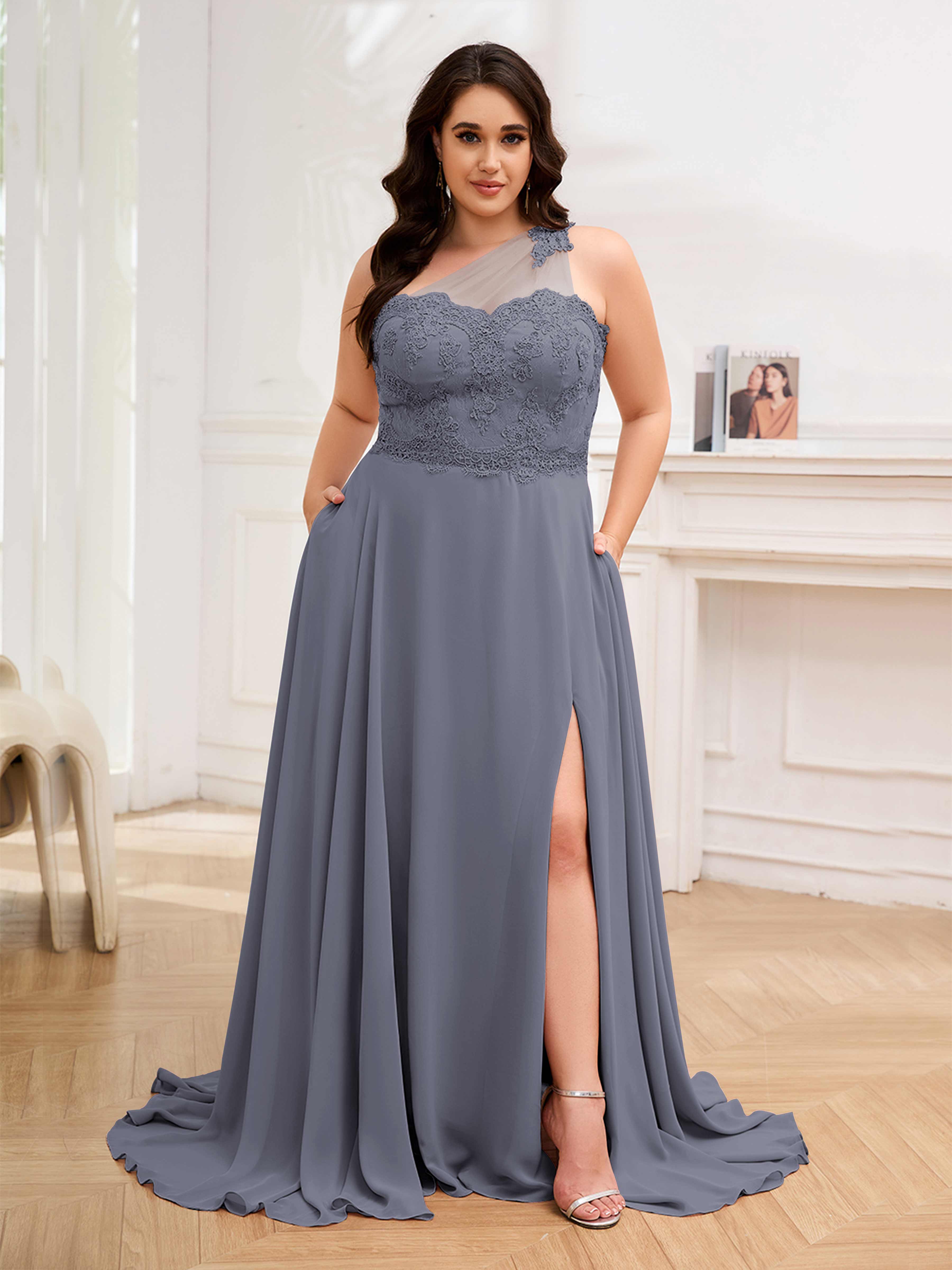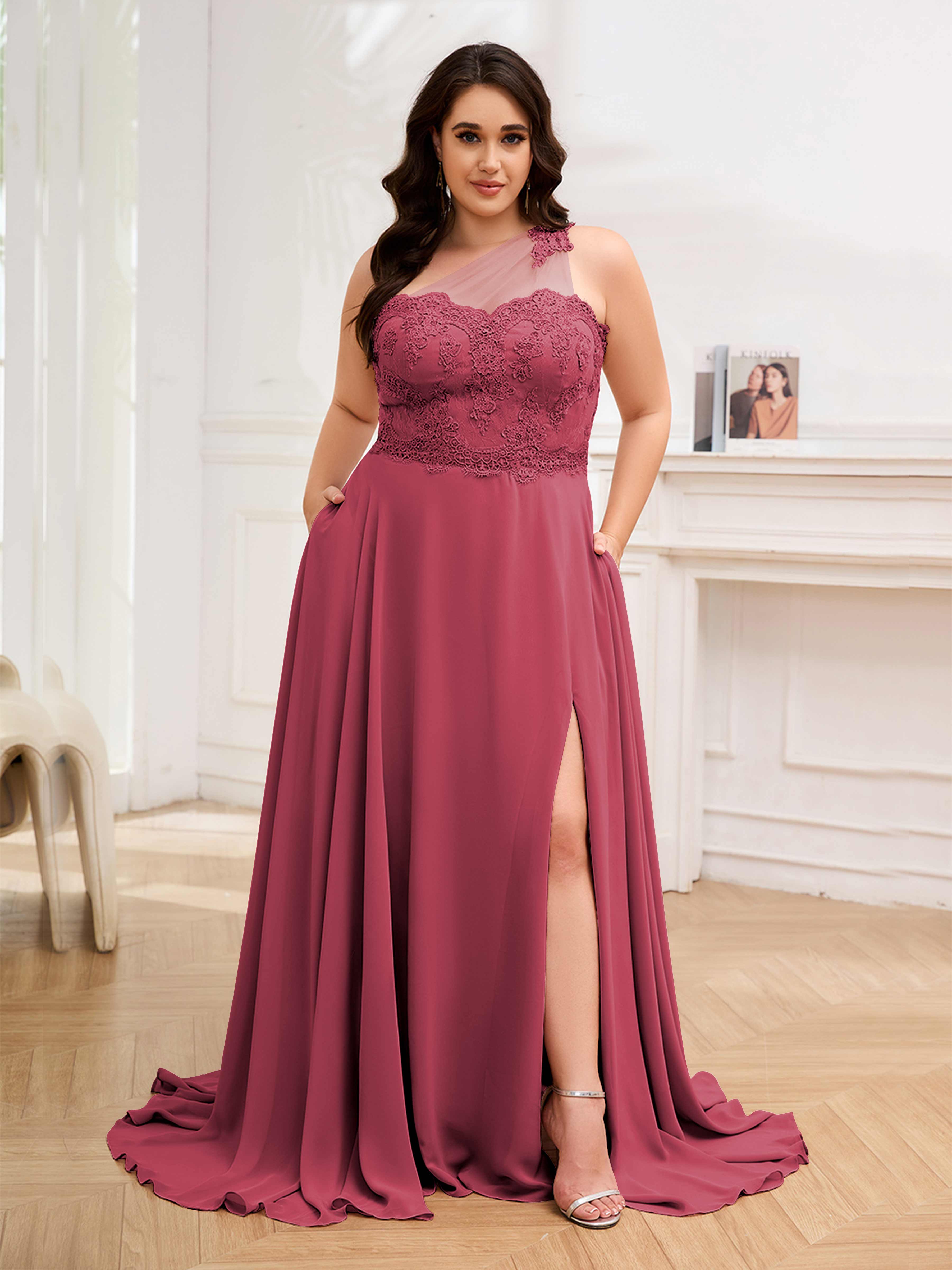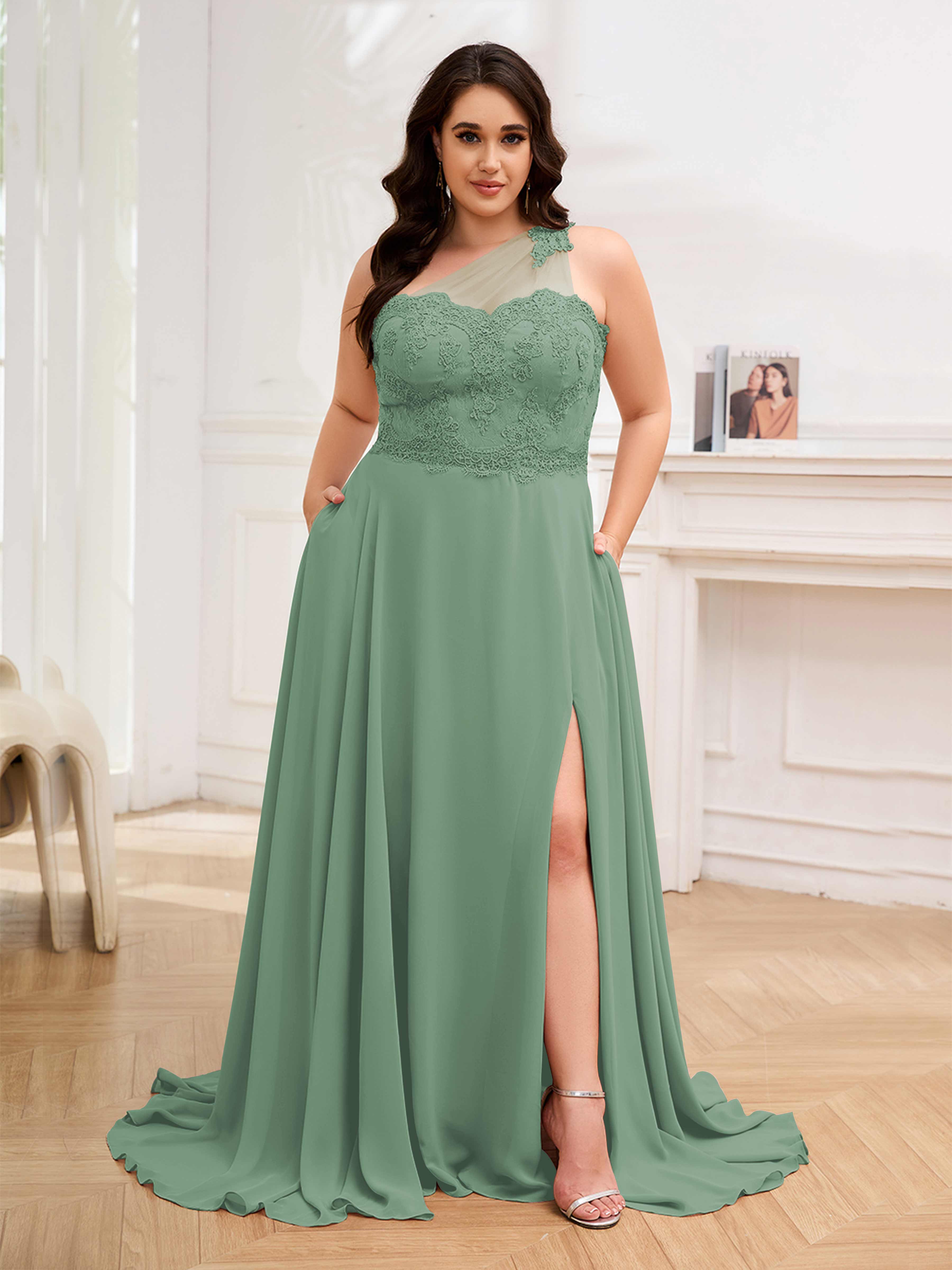 Imani Elegant One Shoulder Pockets Floor Length Lace Plus Size Bridesmaid Dresses