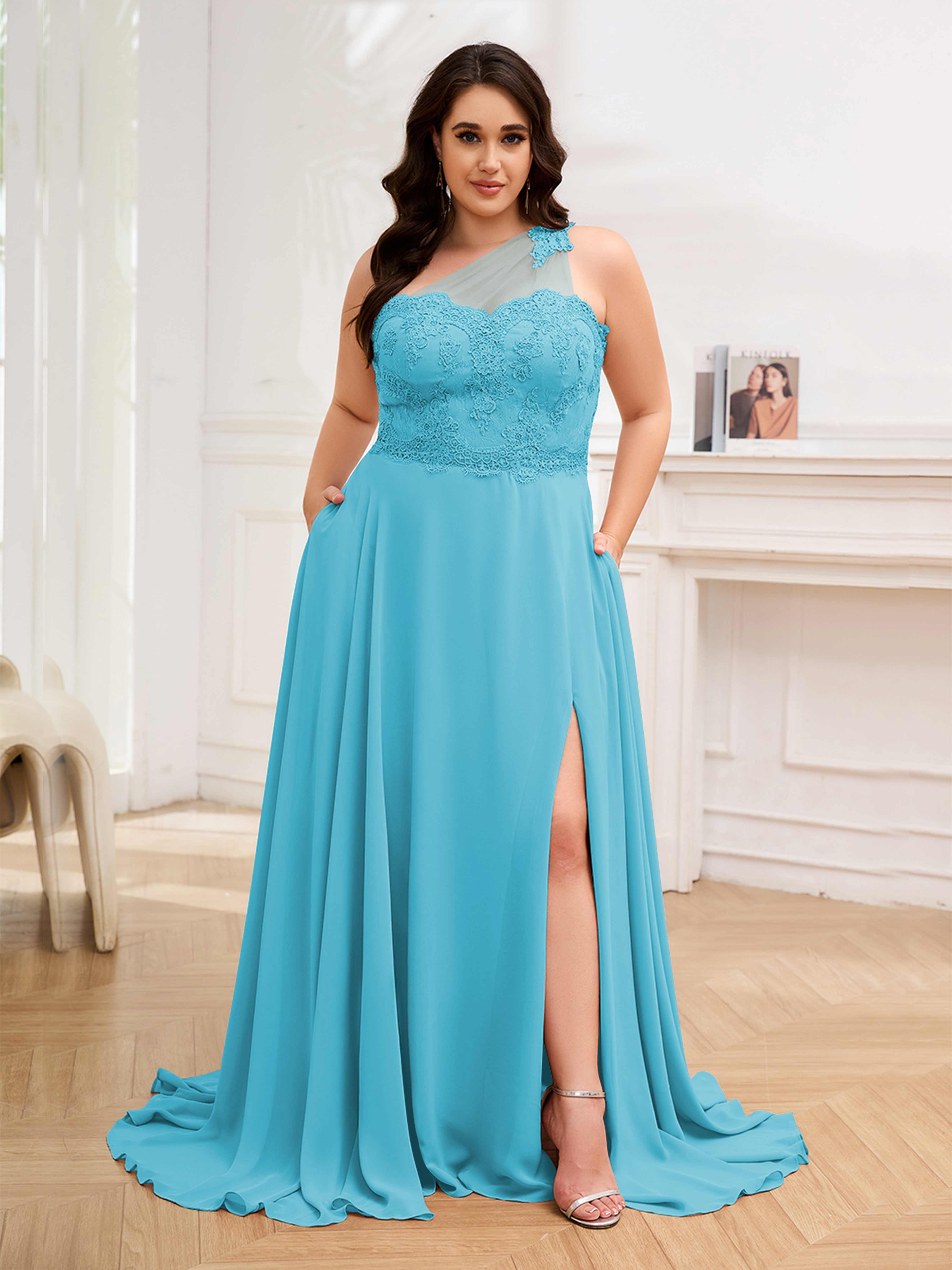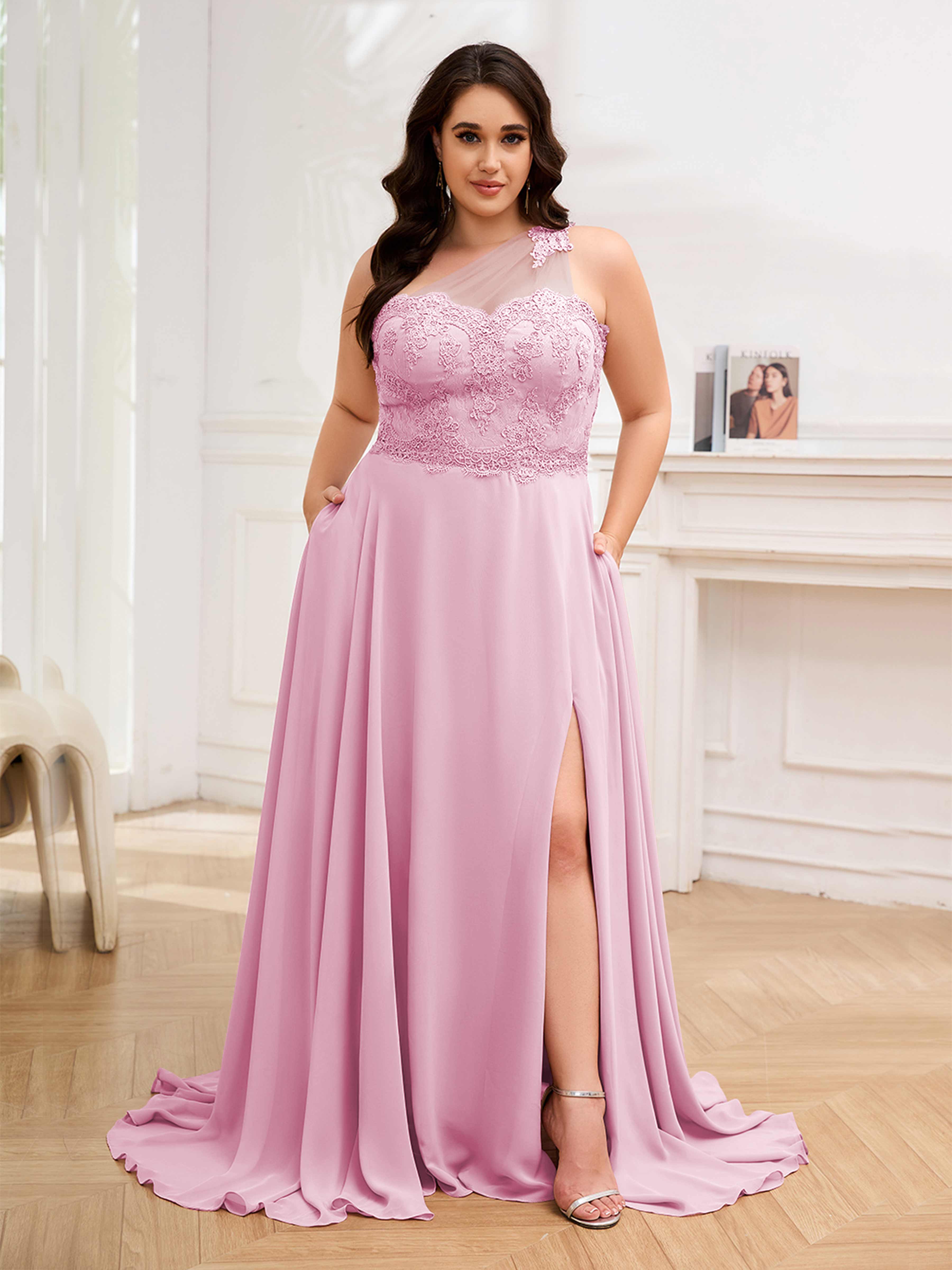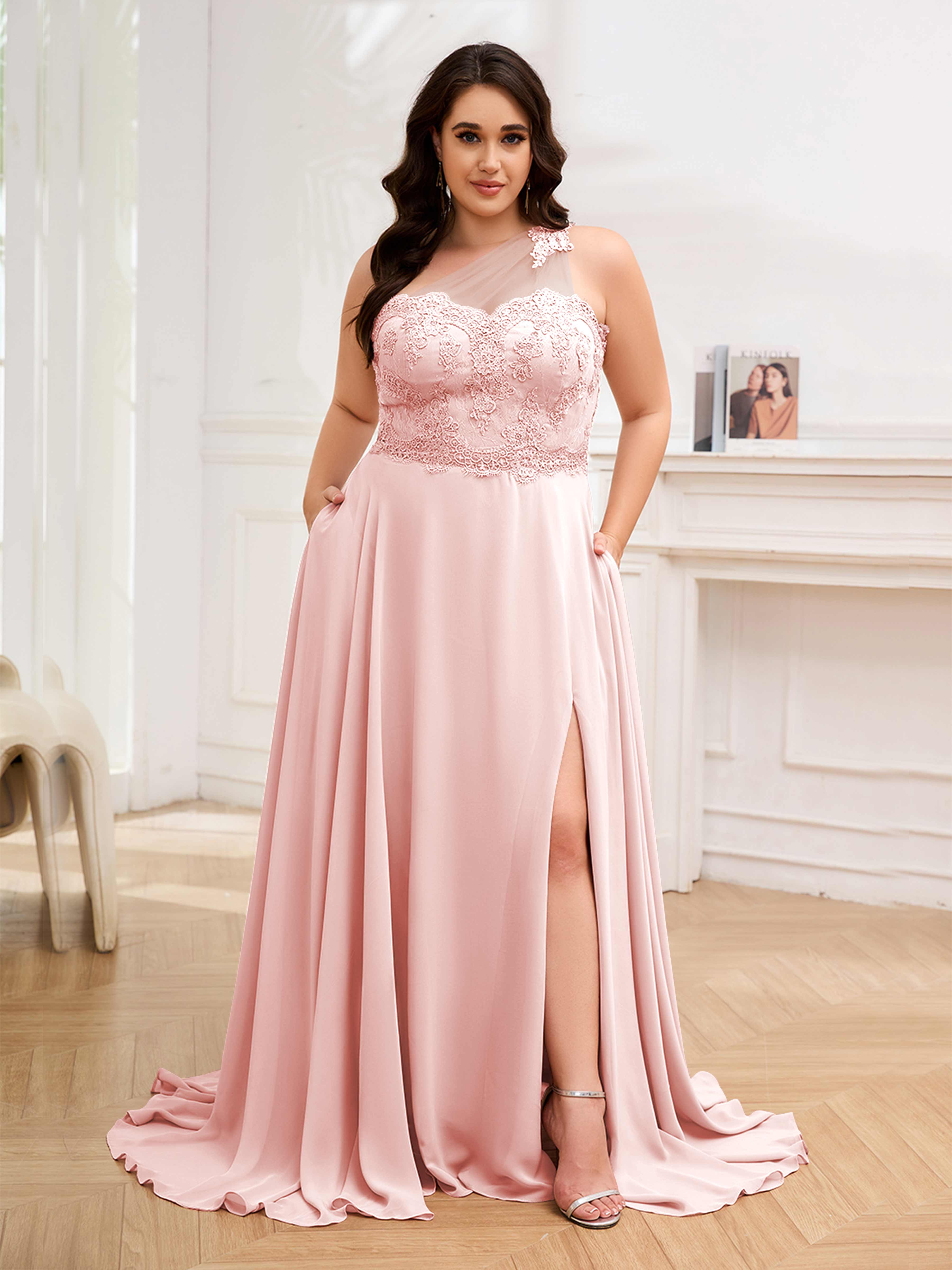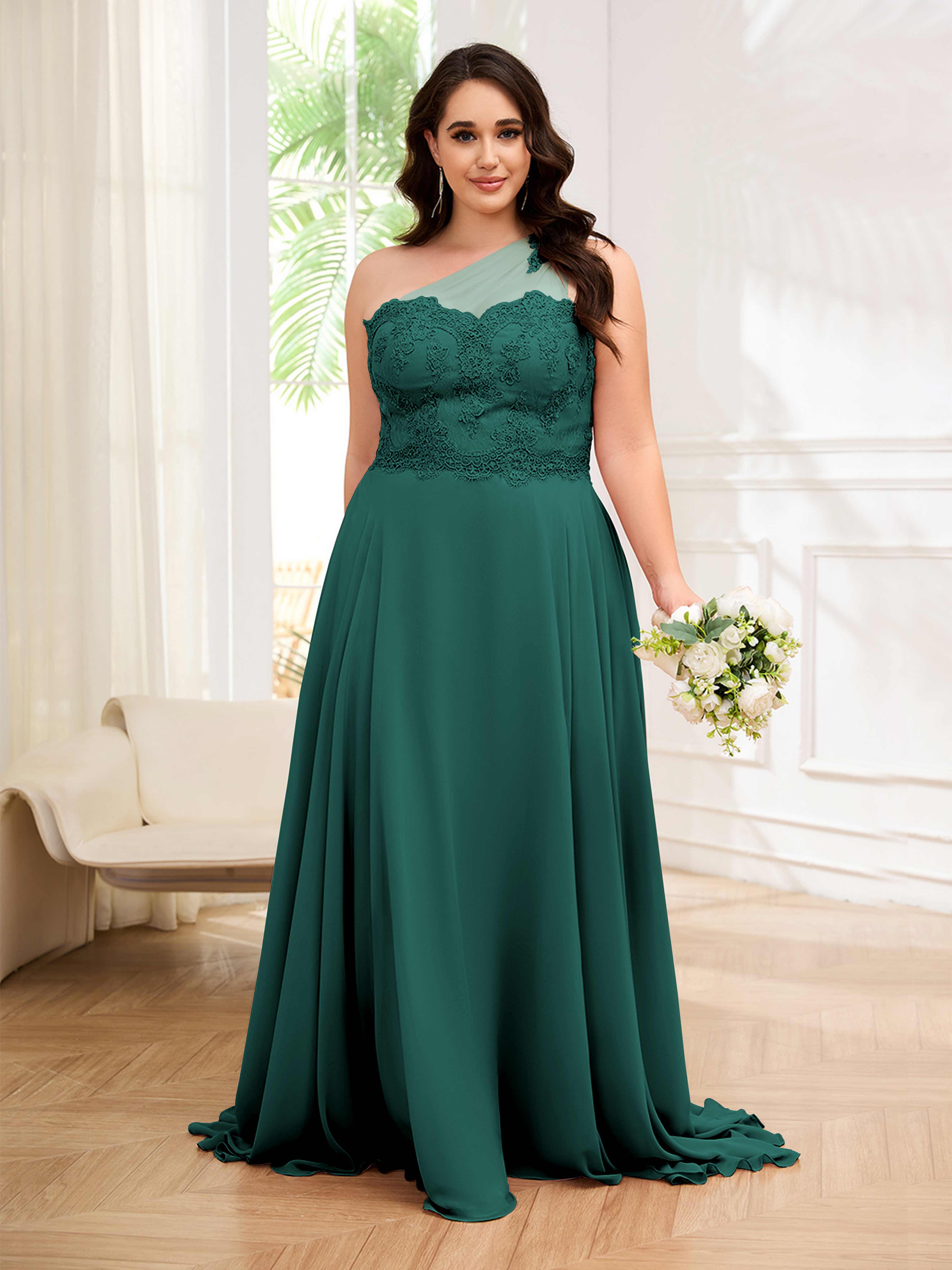 Imani Elegant One Shoulder Pockets Floor Length Lace Plus Size Bridesmaid Dresses