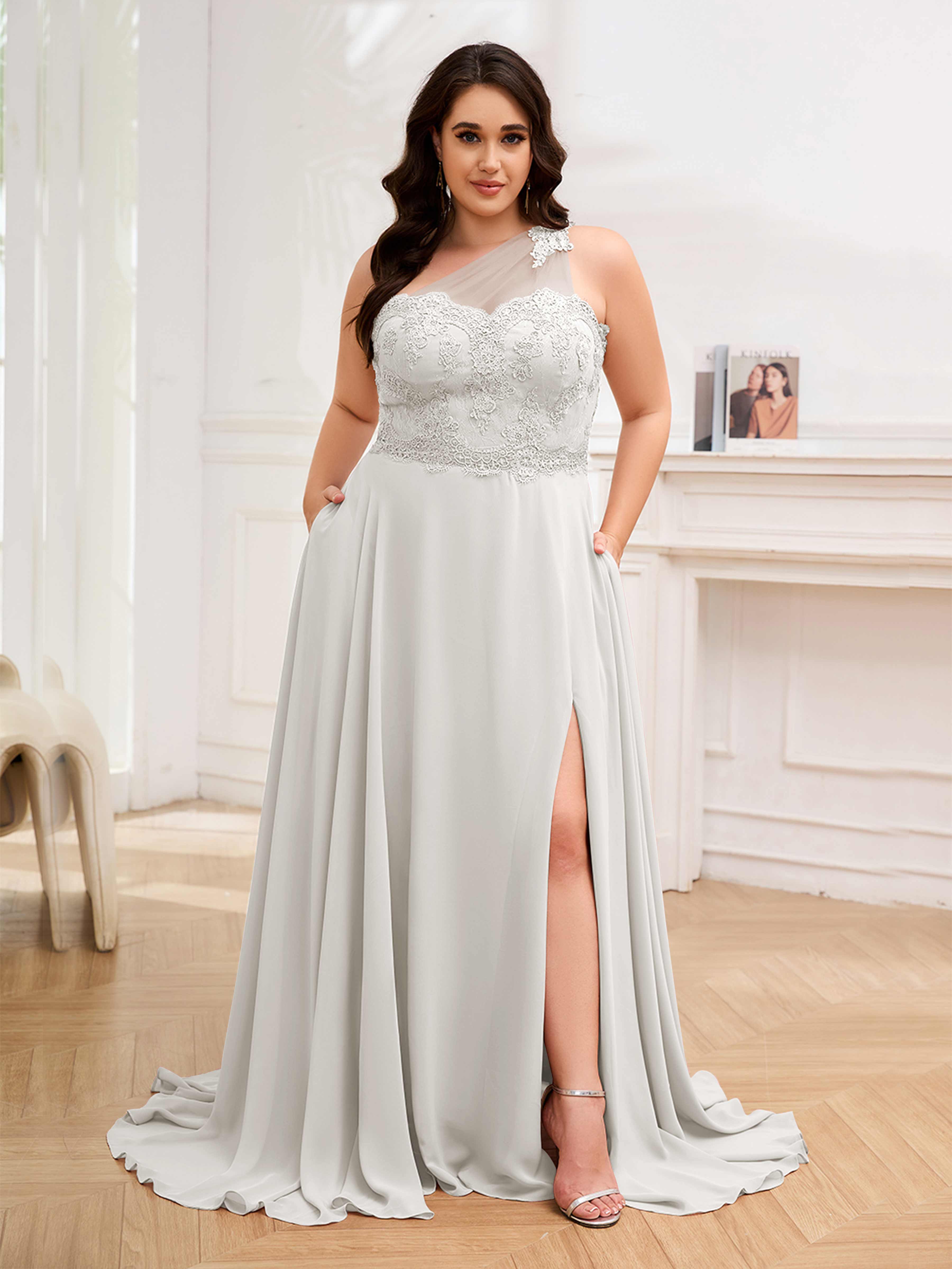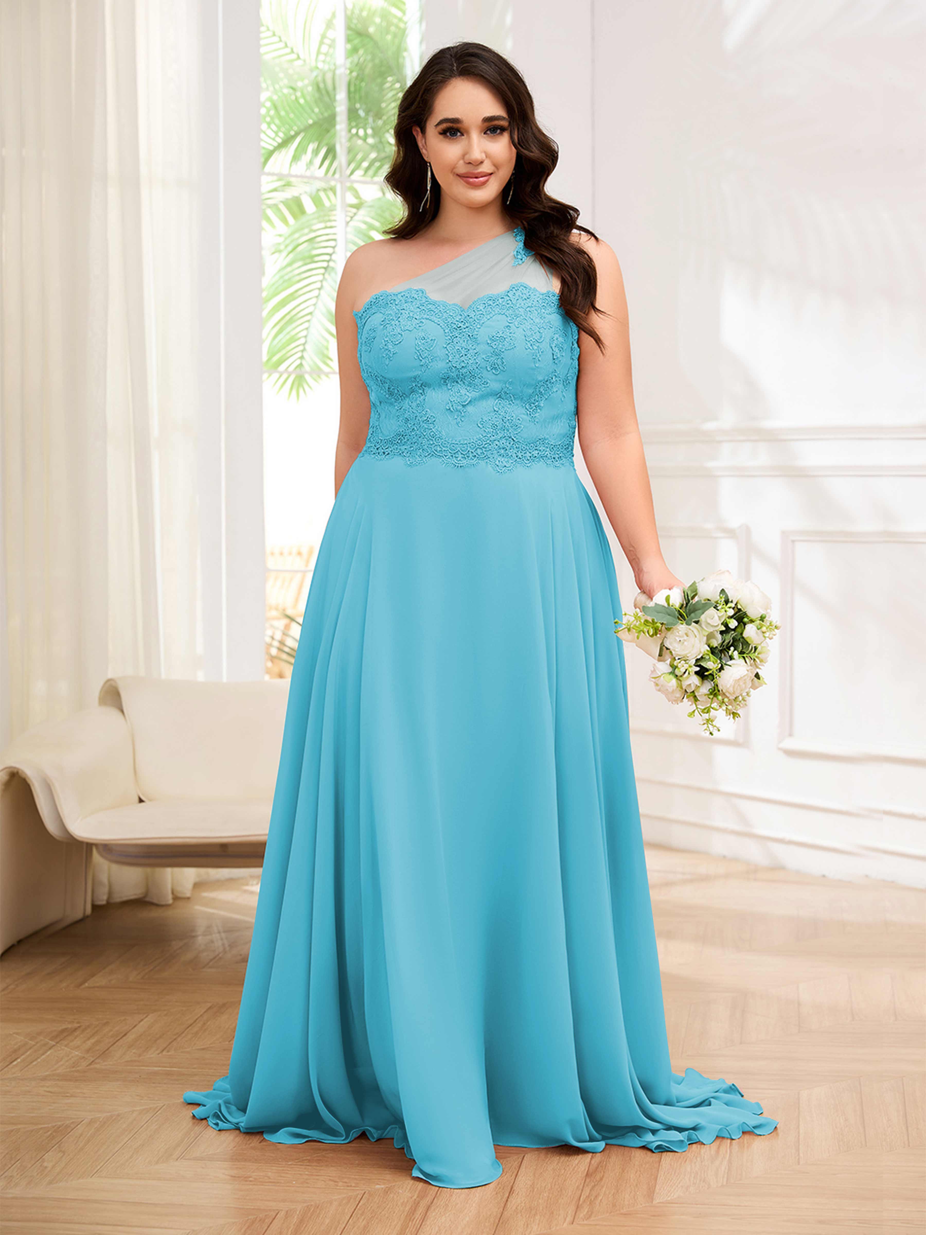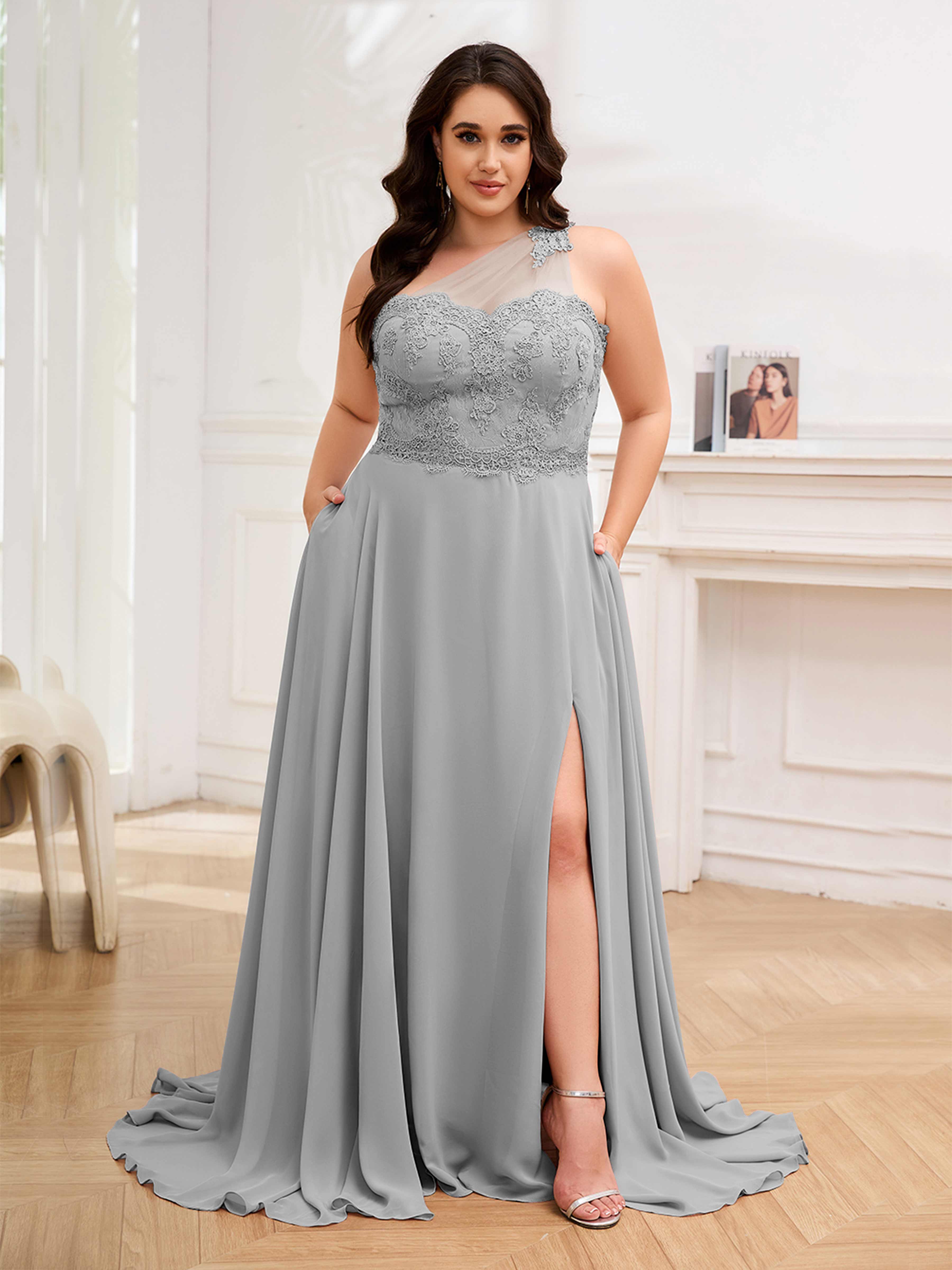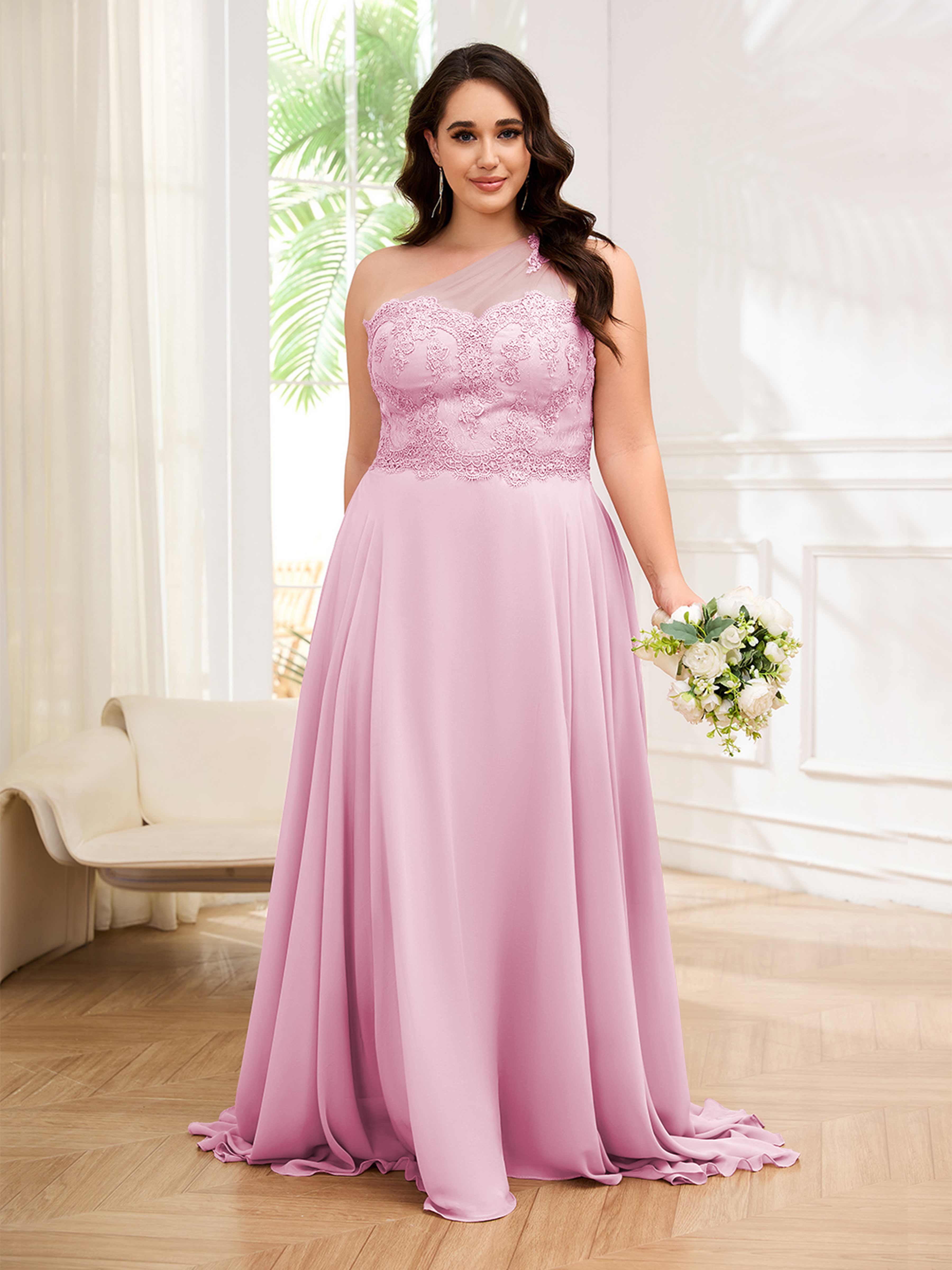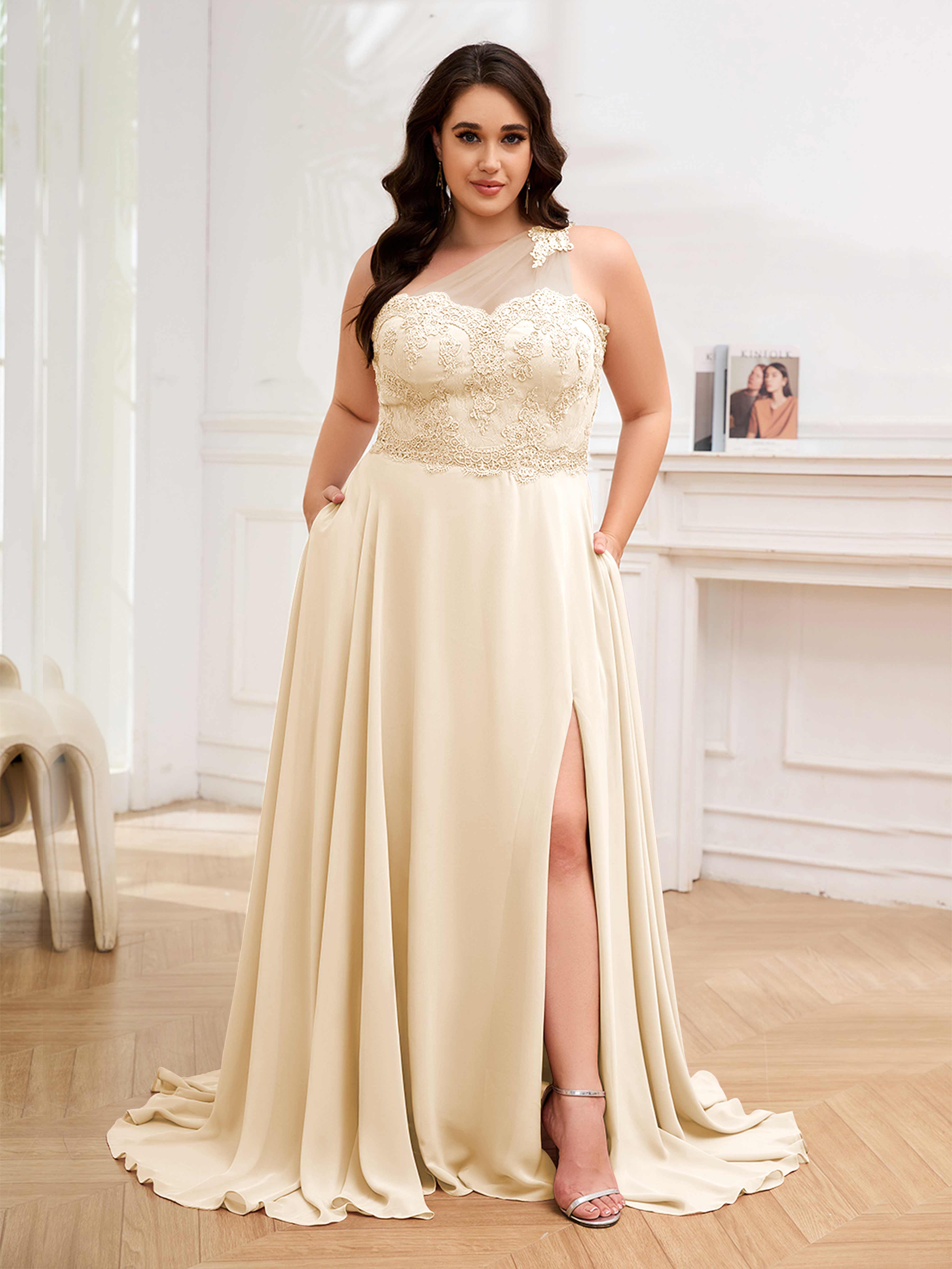Imani Elegant One Shoulder Pockets Floor Length Lace Plus Size Bridesmaid Dresses
