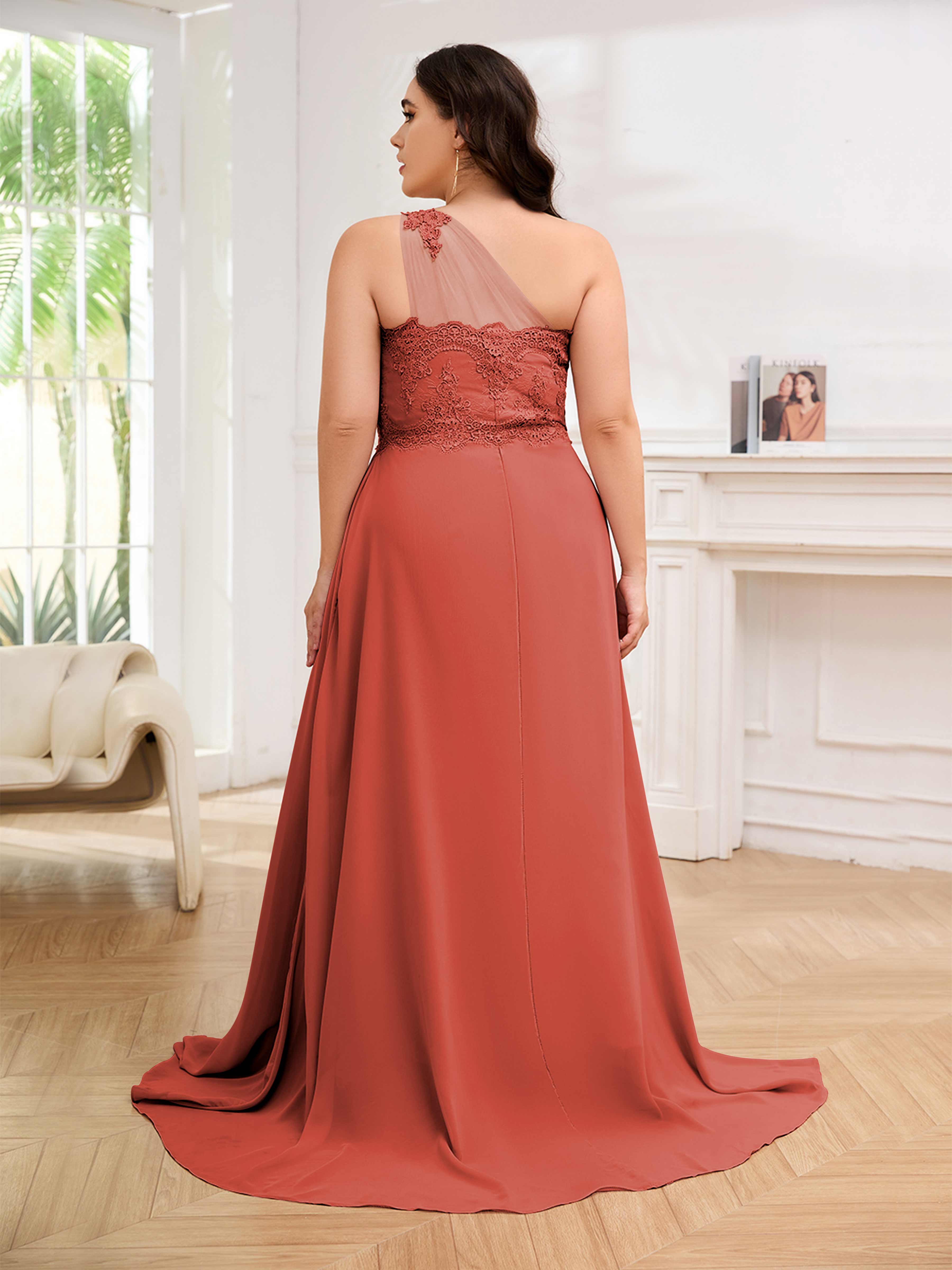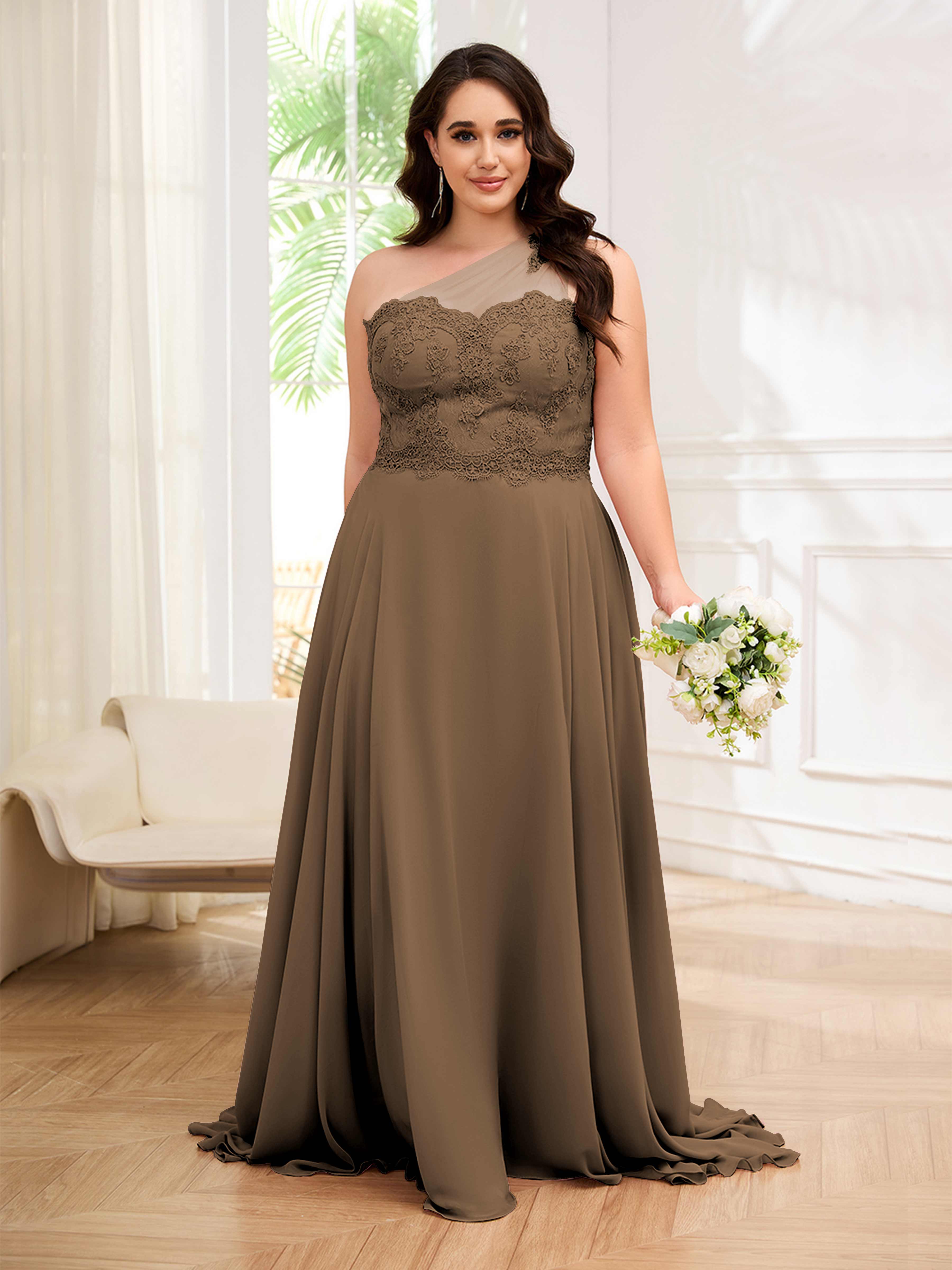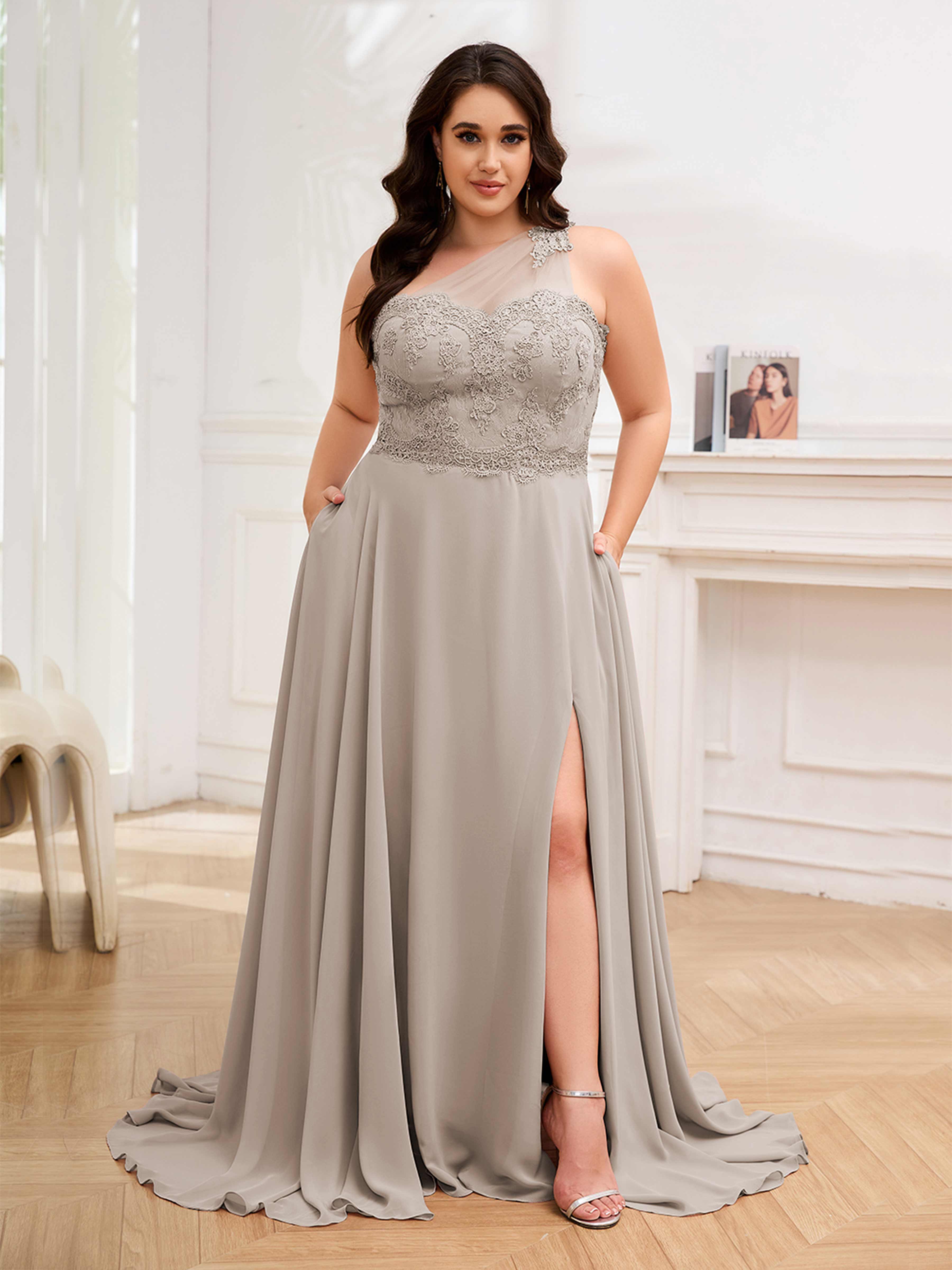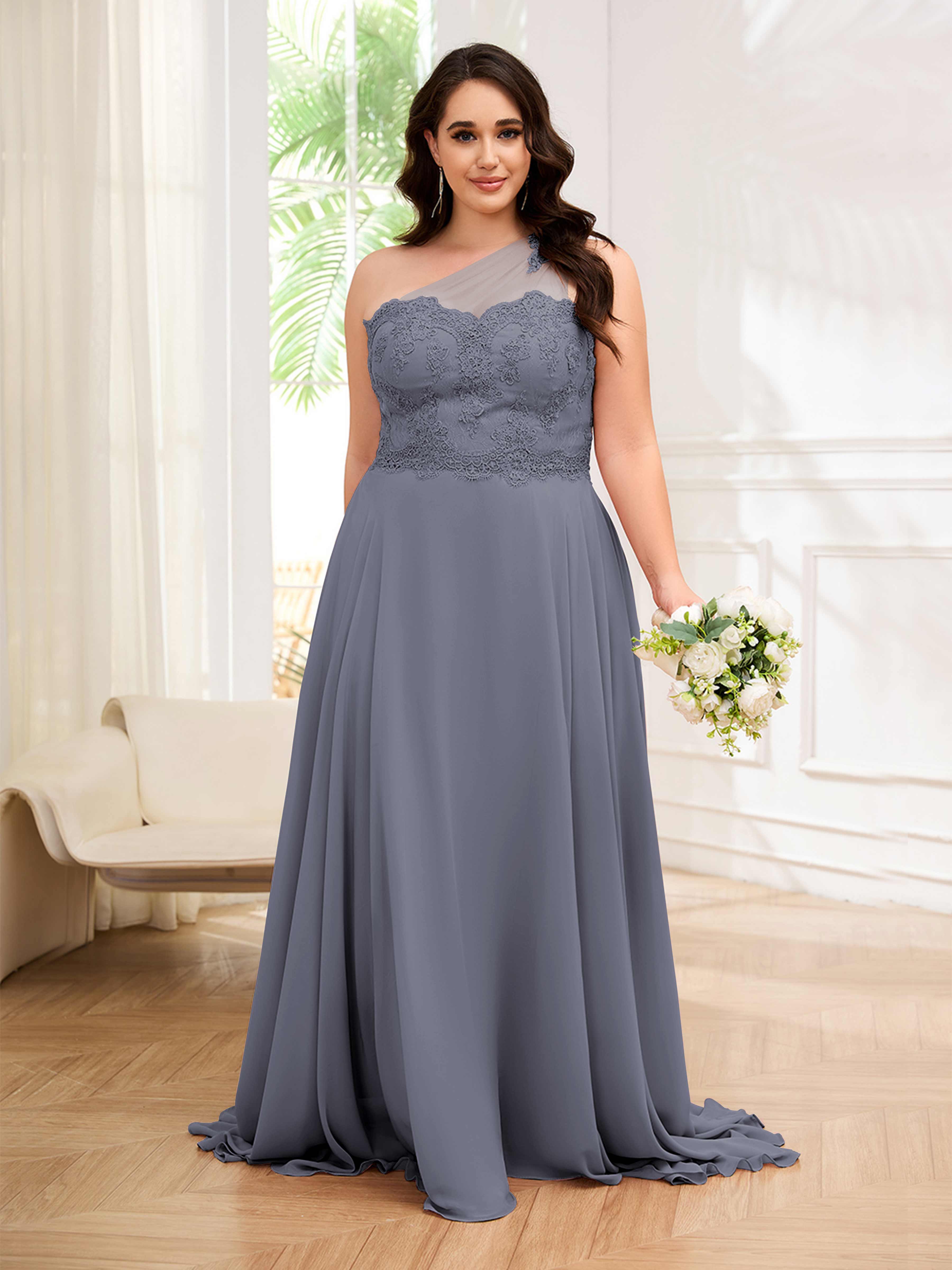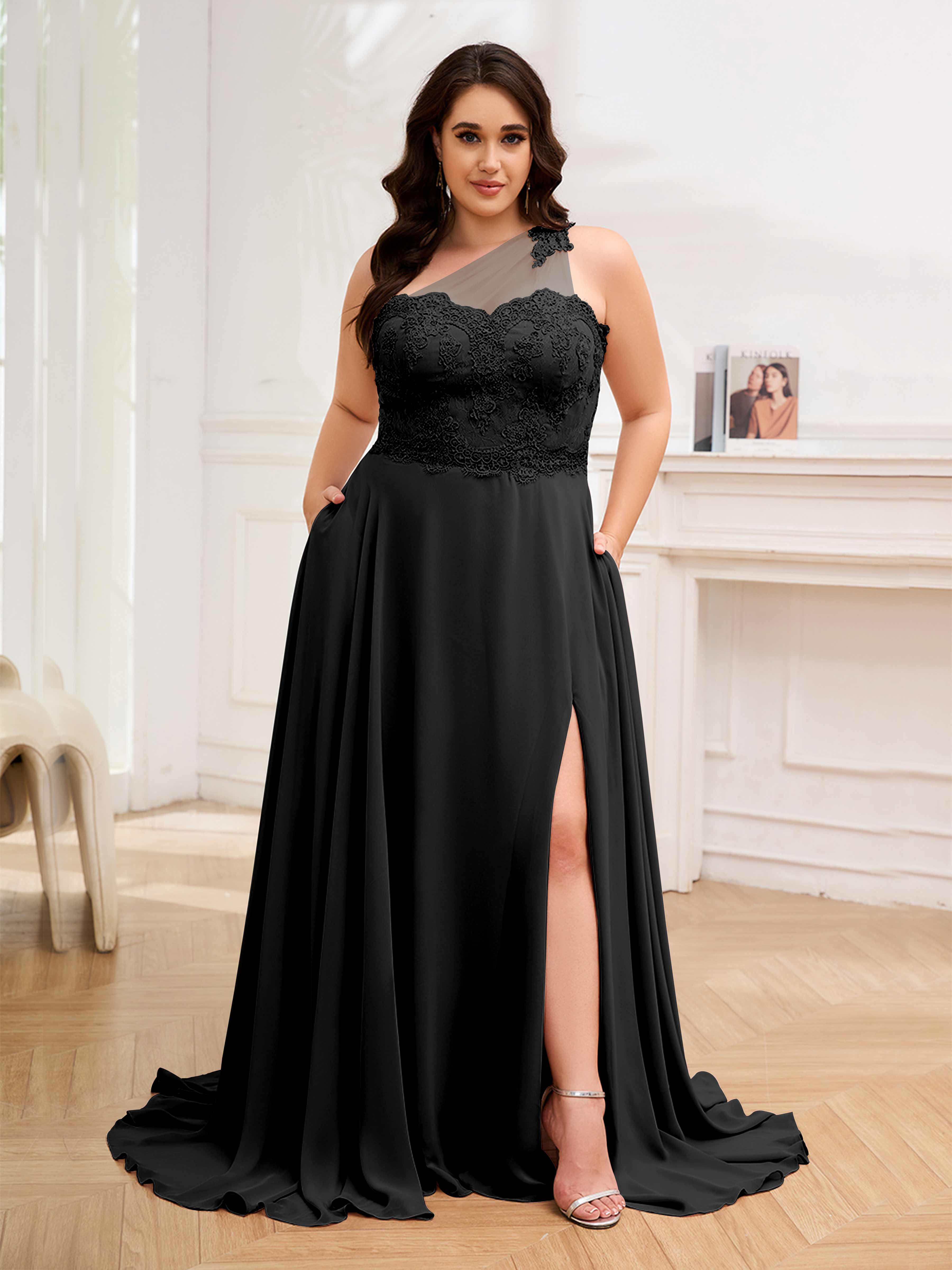 Imani Elegant One Shoulder Pockets Floor Length Lace Plus Size Bridesmaid Dresses
