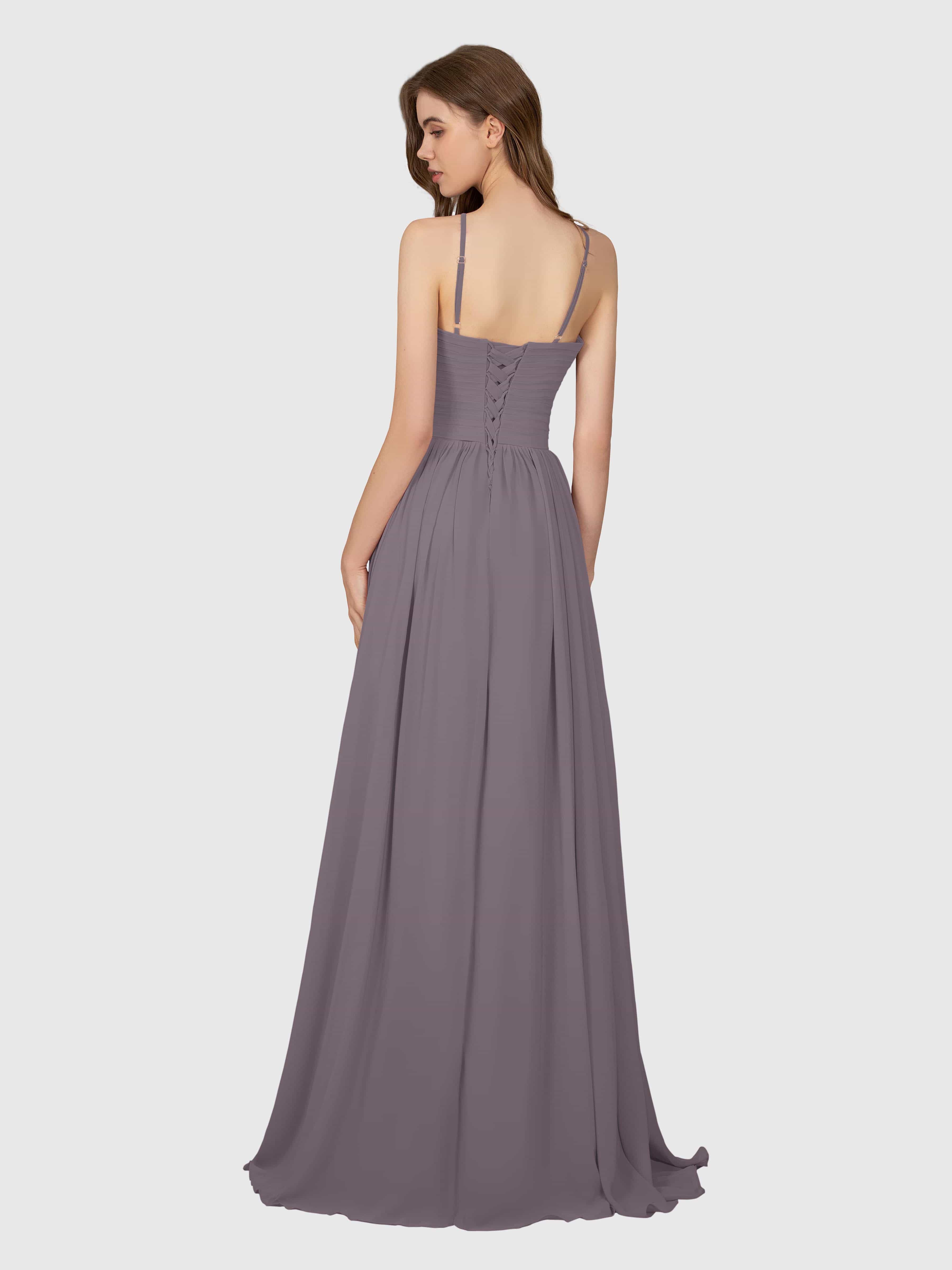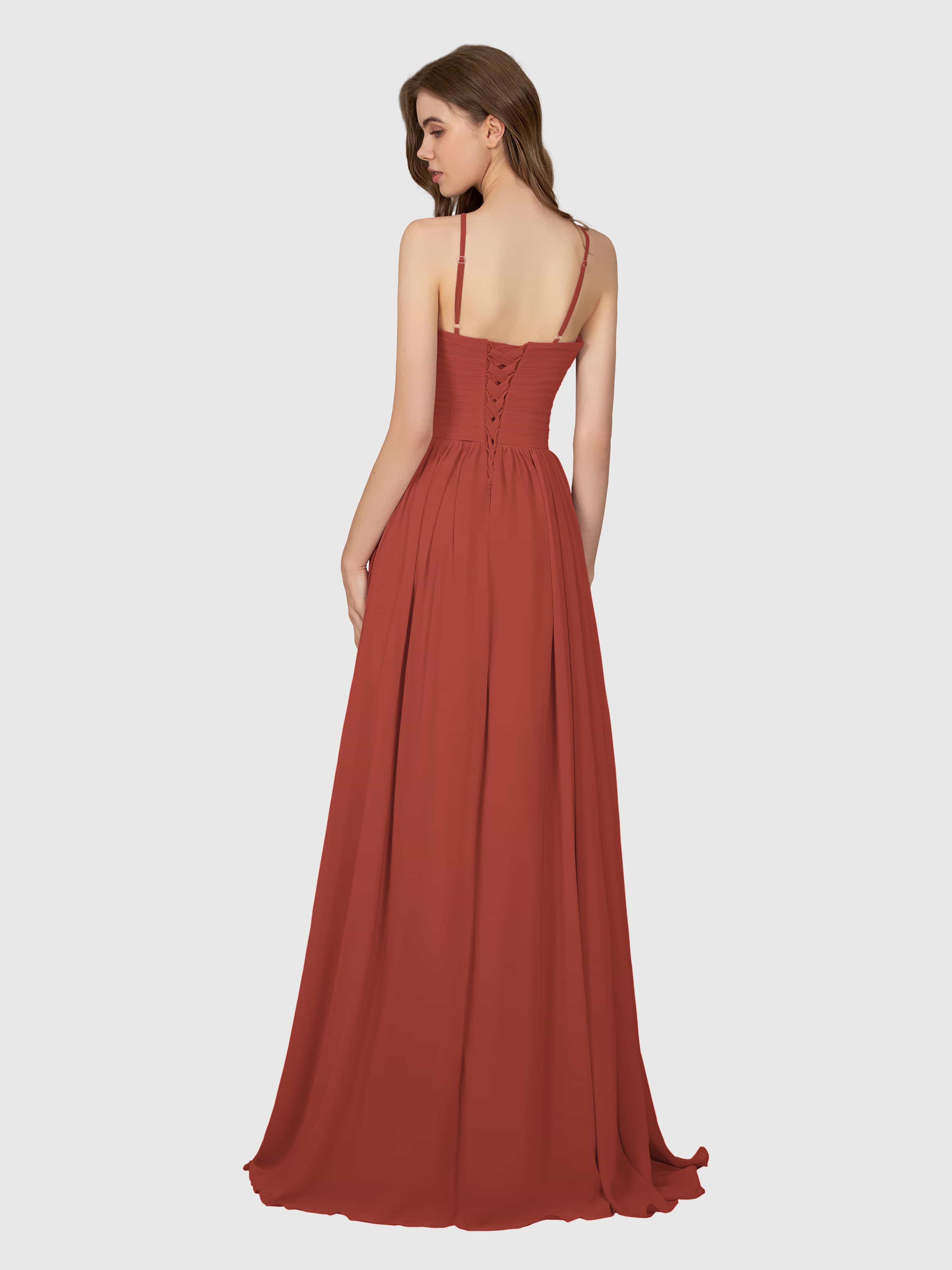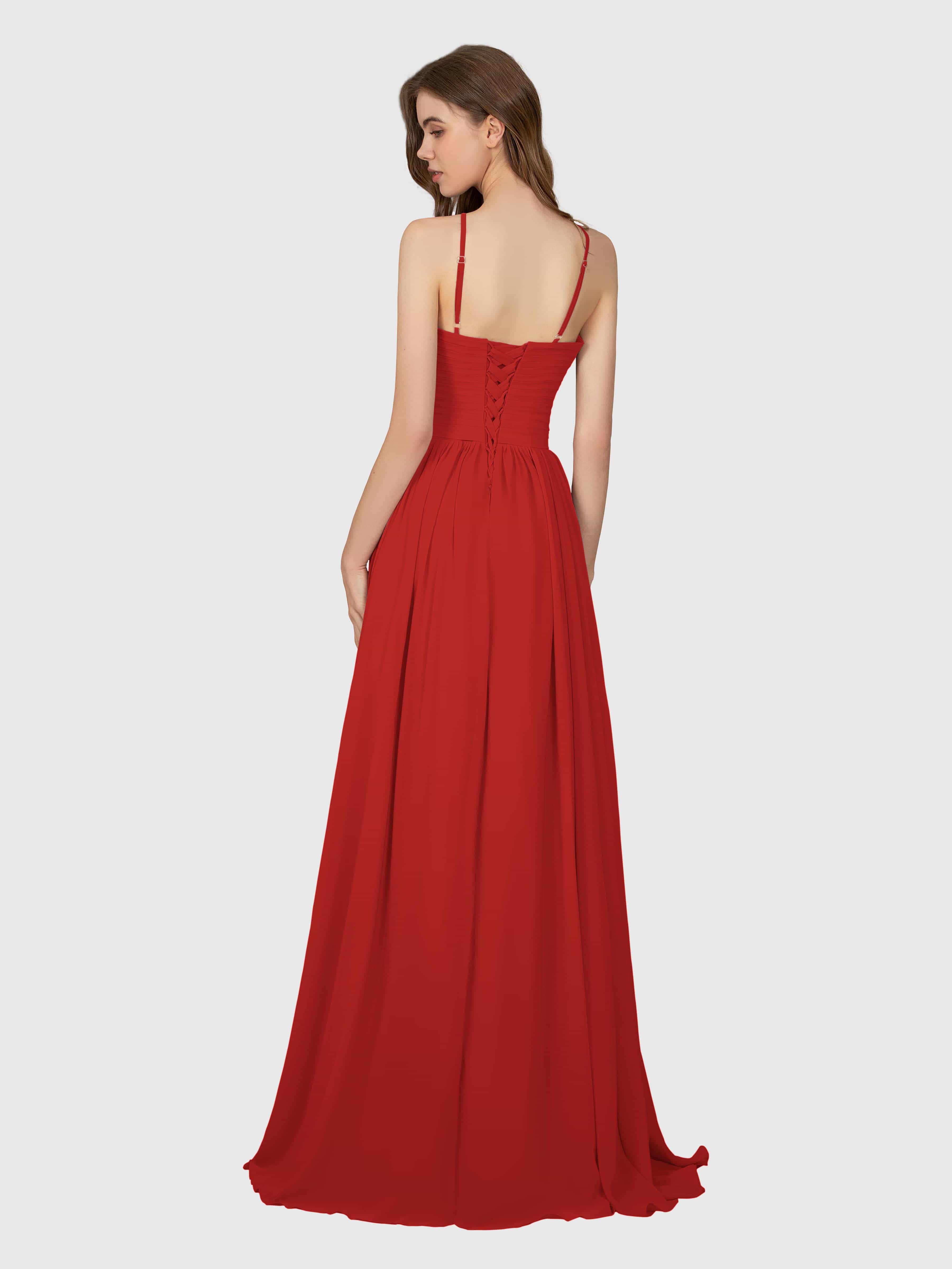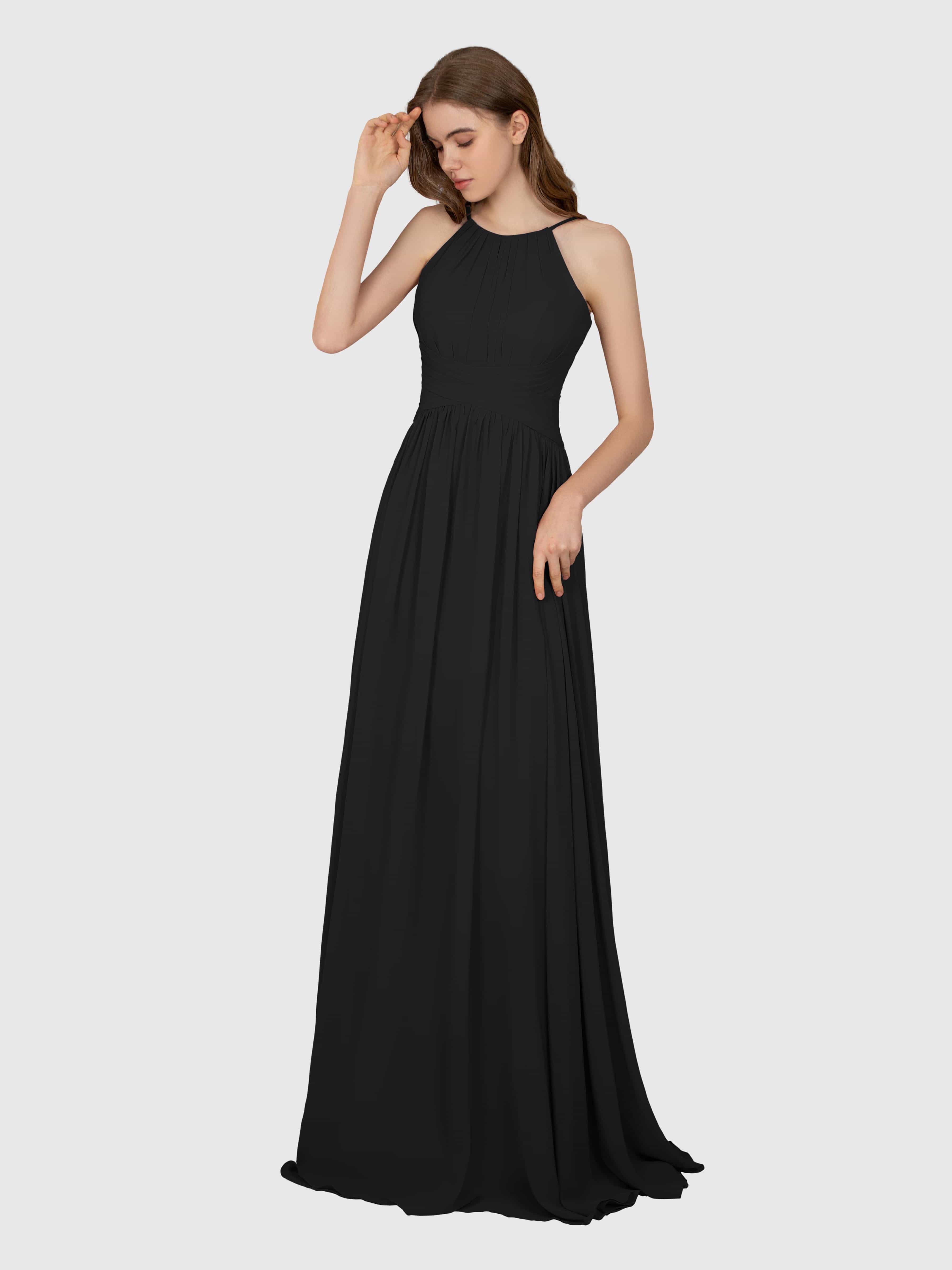 This gorgeous dress is designed with a halter neckline, lace-up back, and sultry A-line silhouette. Crafted from chiffon non-stretch fabric and featuring embellished ruching, this floor-length gown offers a comfortable fit with padded, boned bodice and is available in sizes 8-28.
