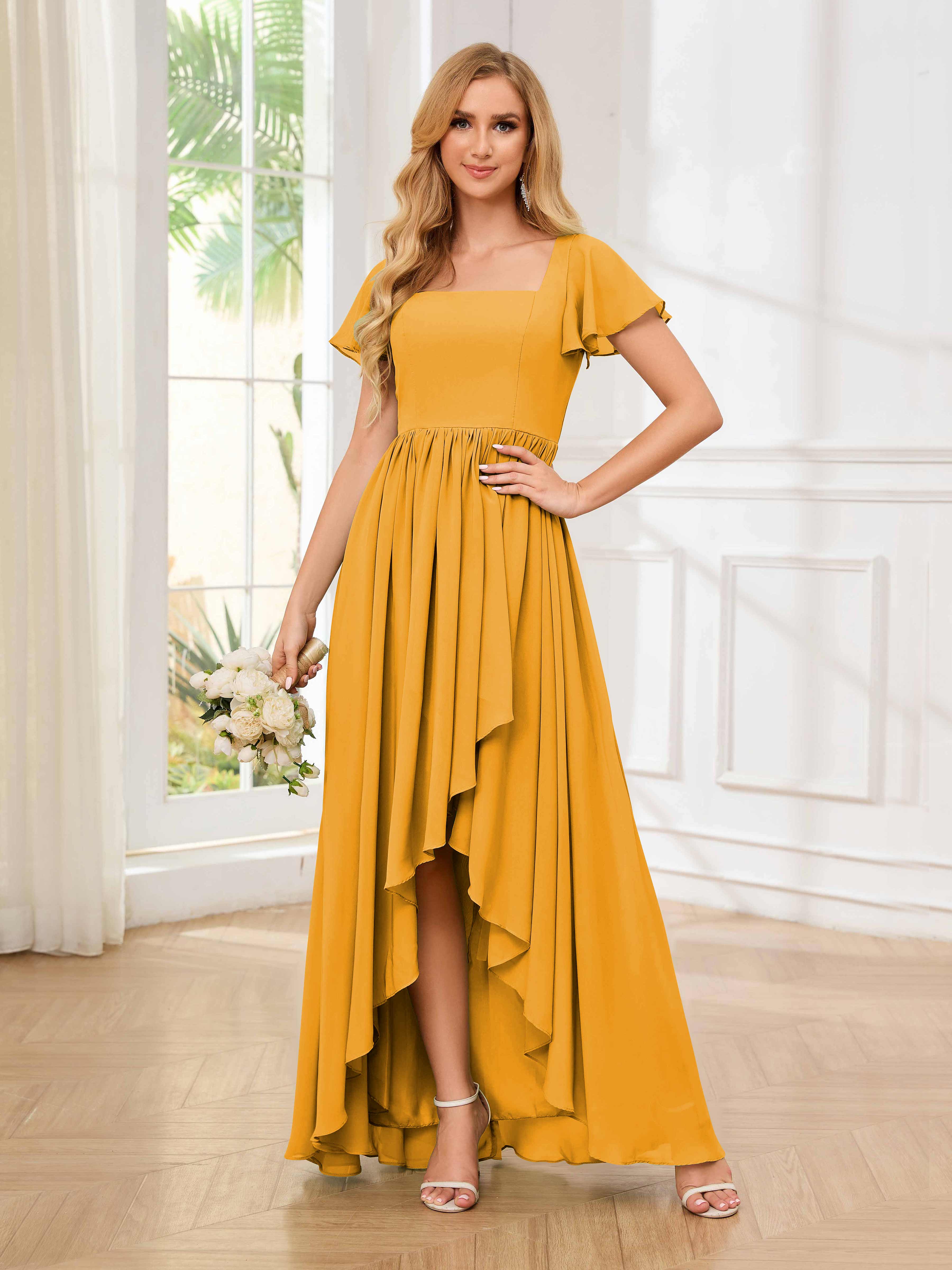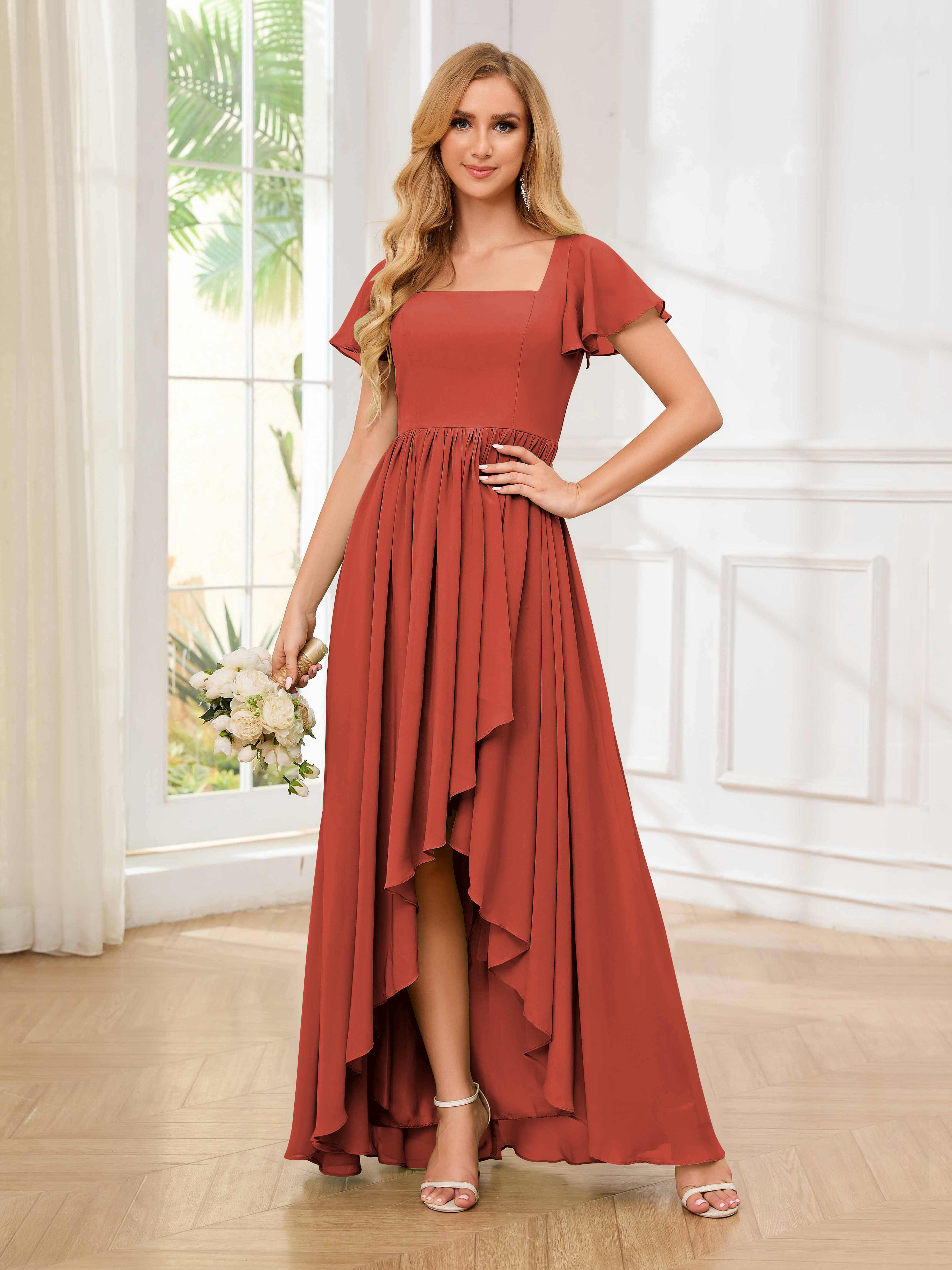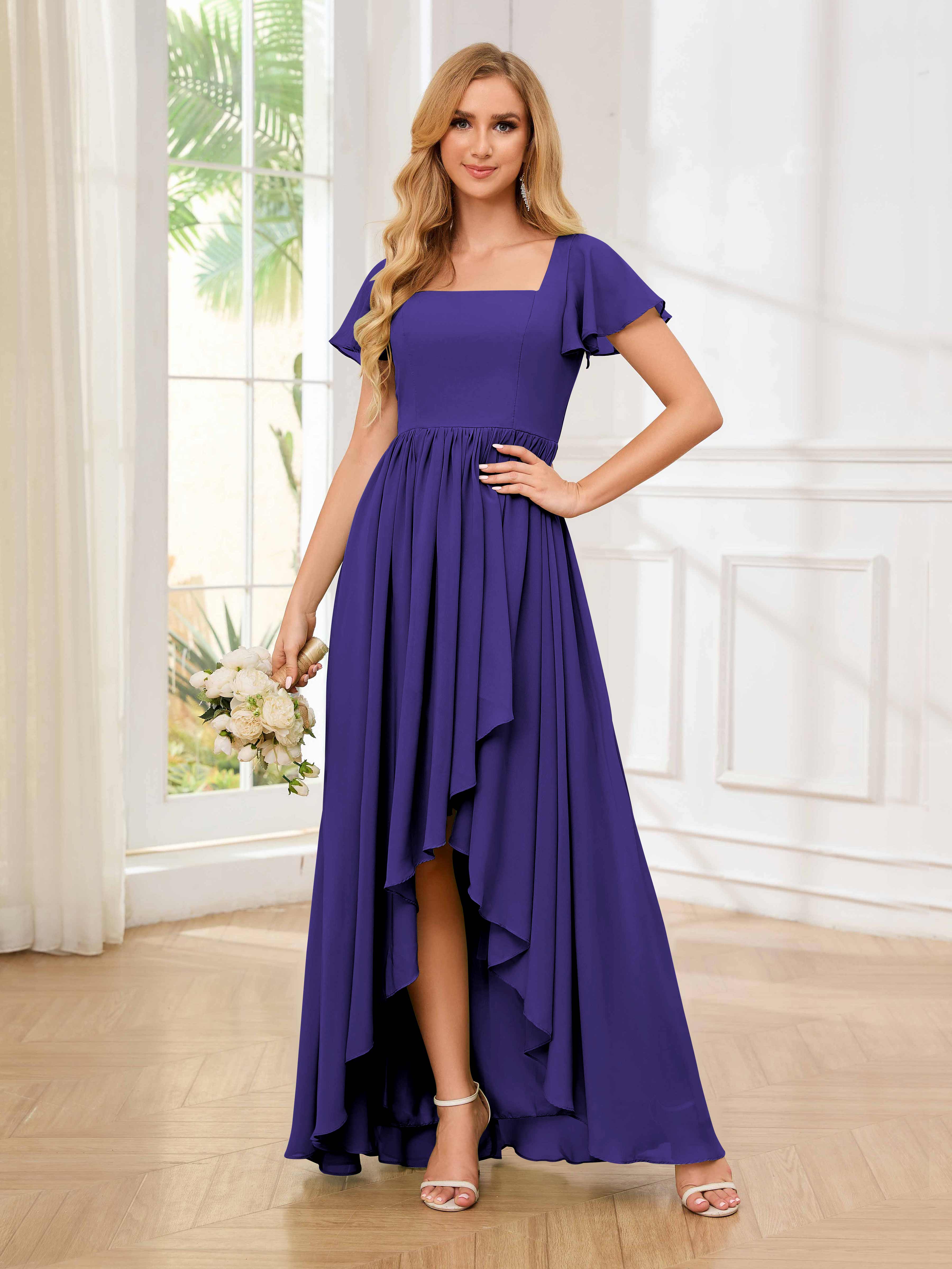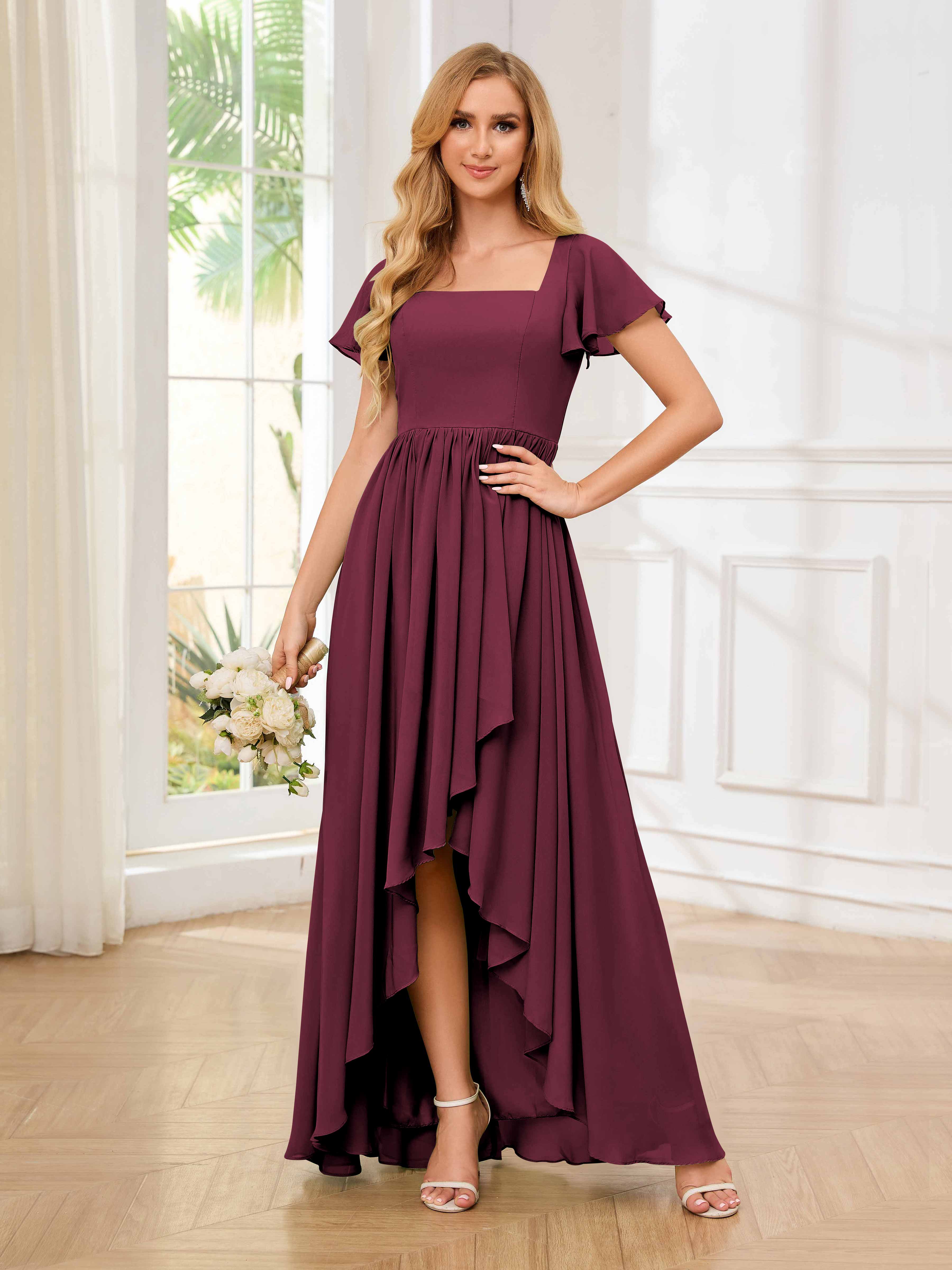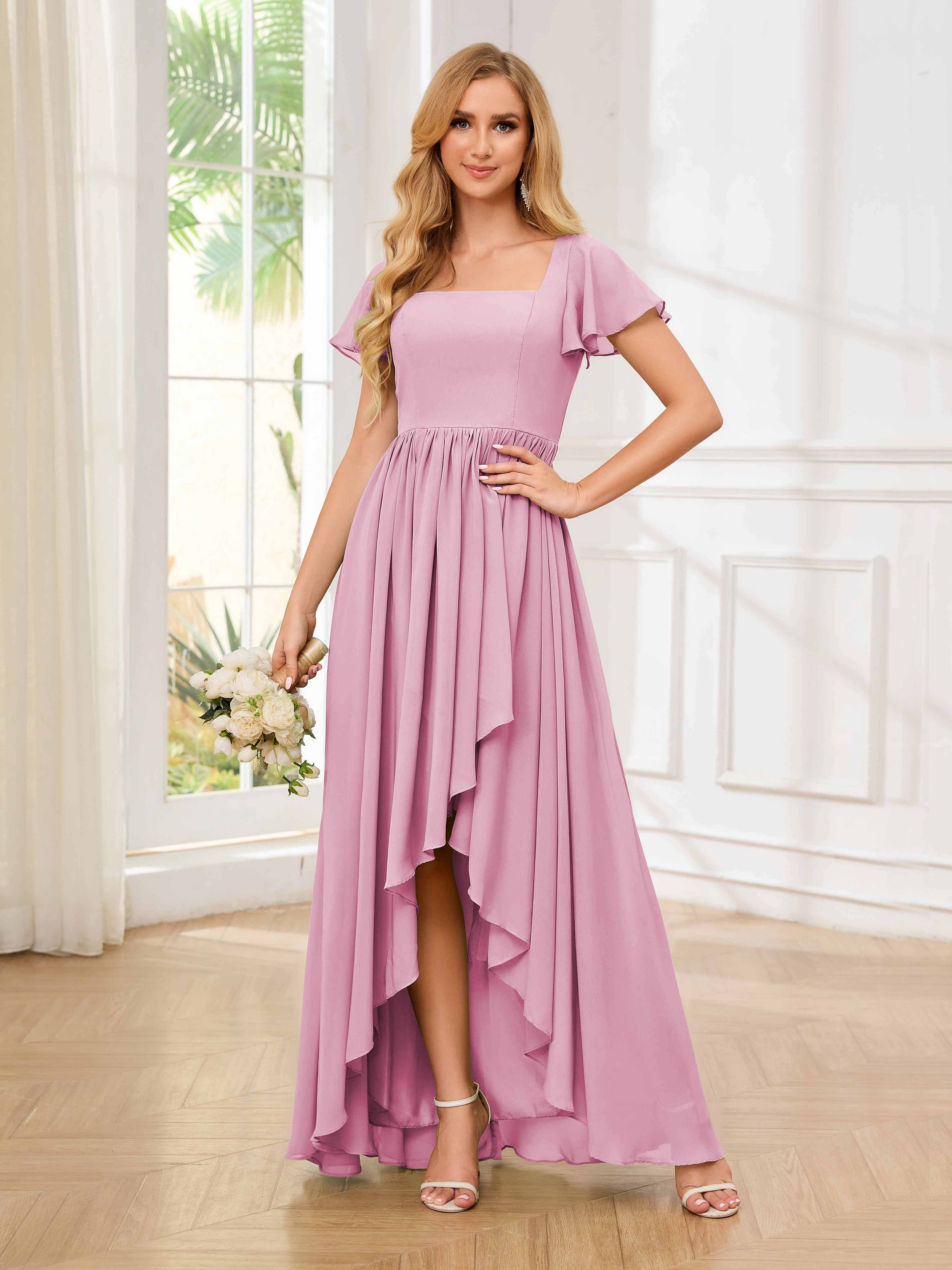 Itzel Modern Square Short Sleeves Pleated High Low Chiffon Bridesmaid Dresses