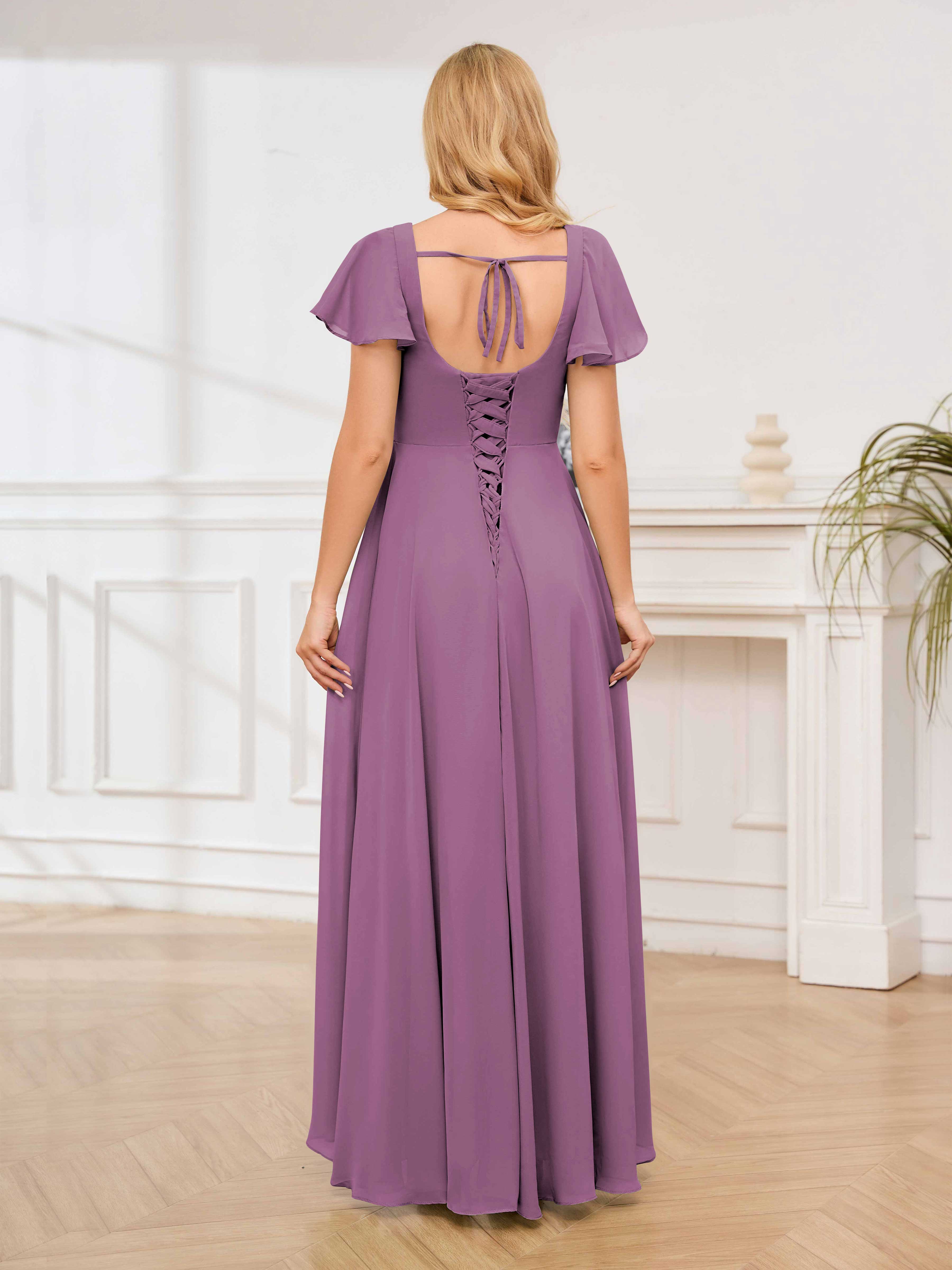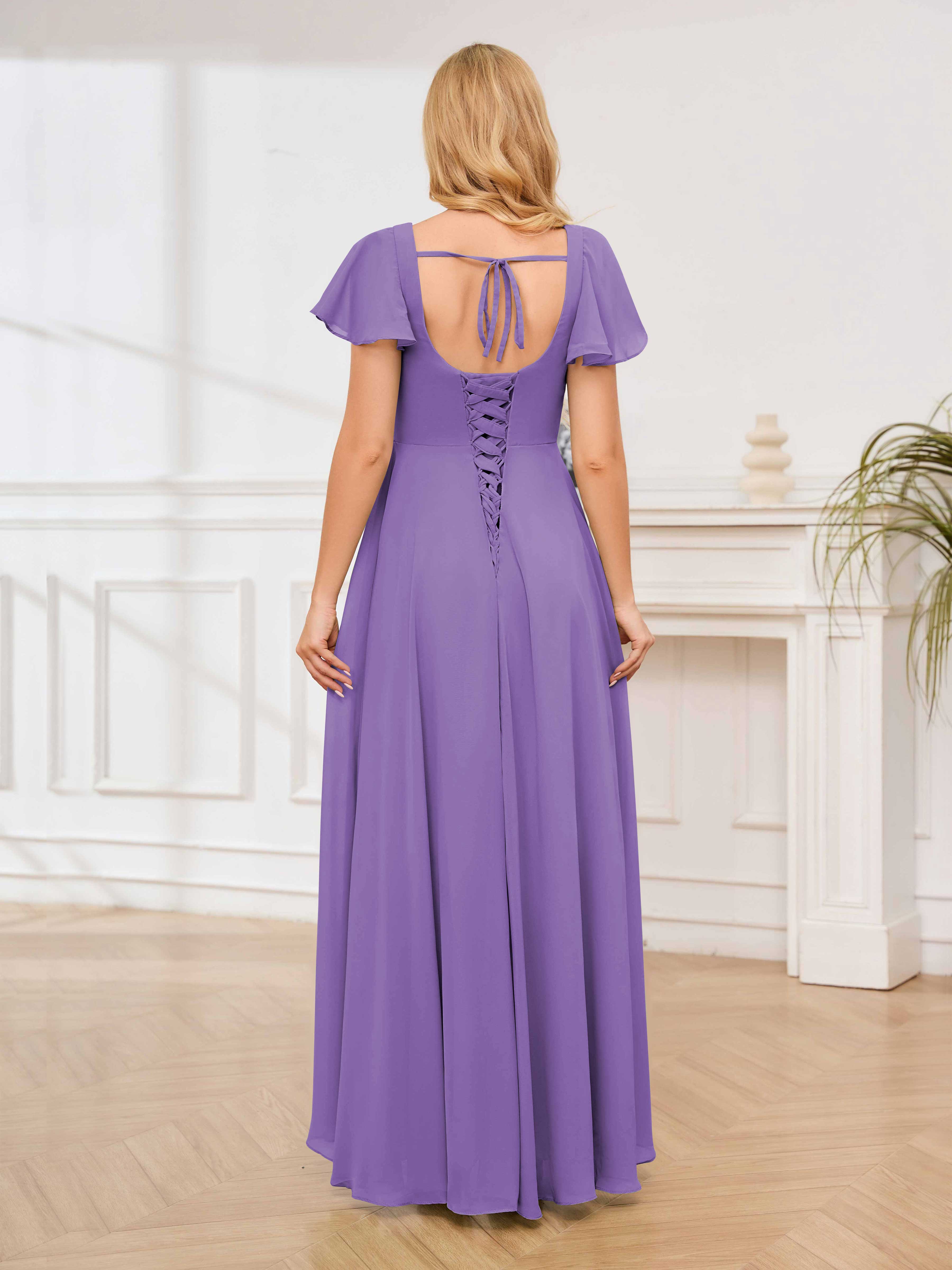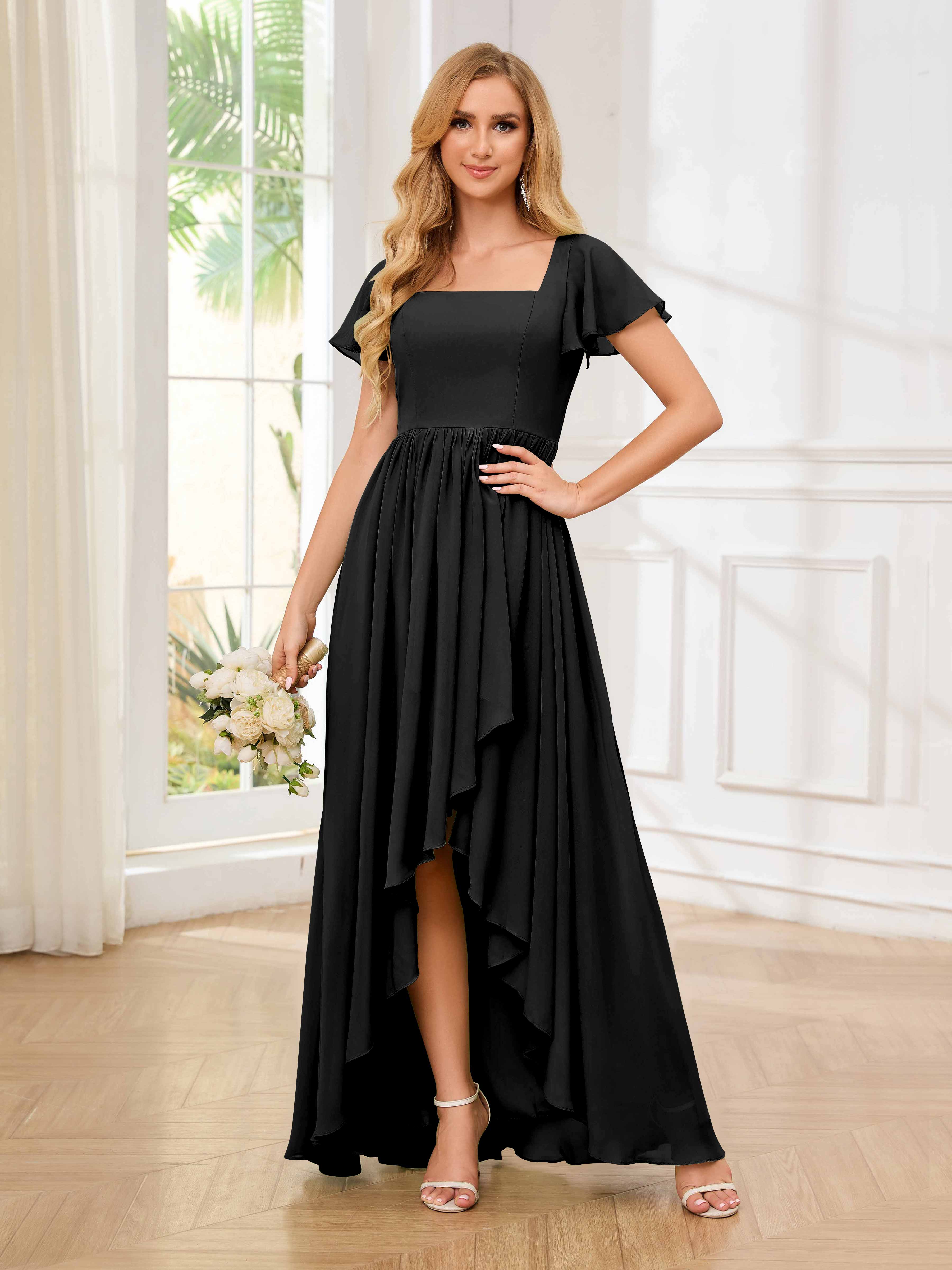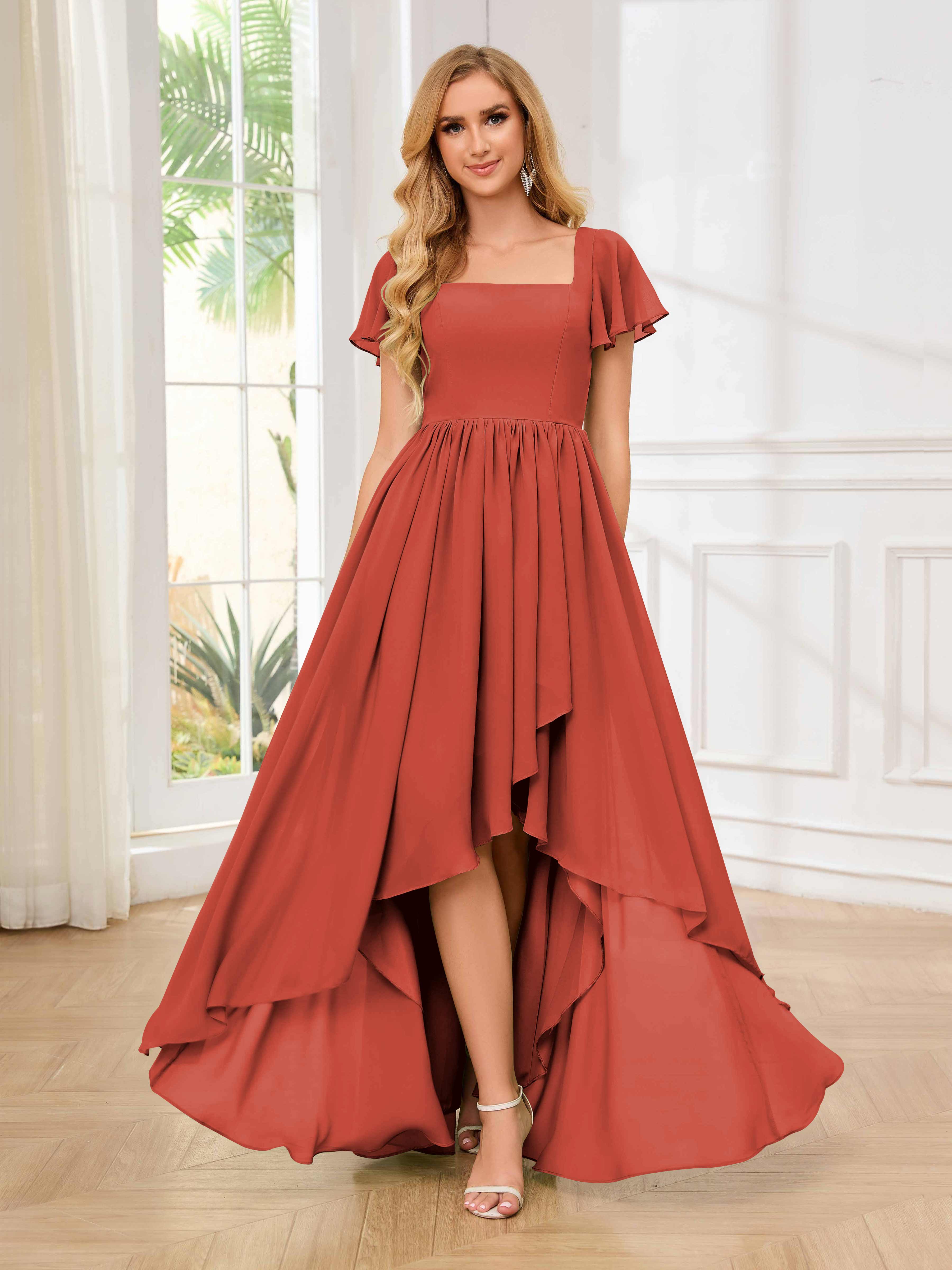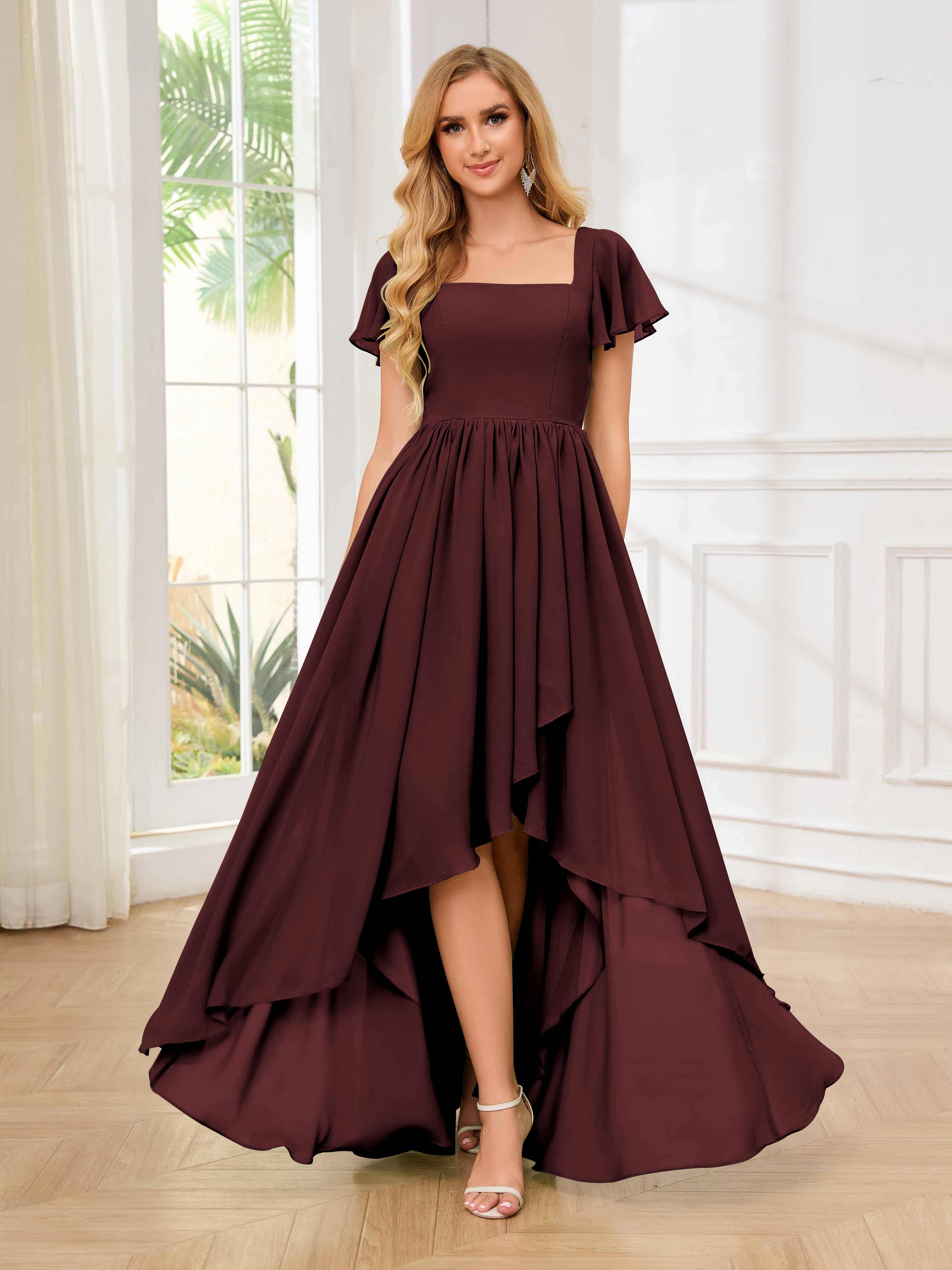 Itzel Modern Square Short Sleeves Pleated High Low Chiffon Bridesmaid Dresses