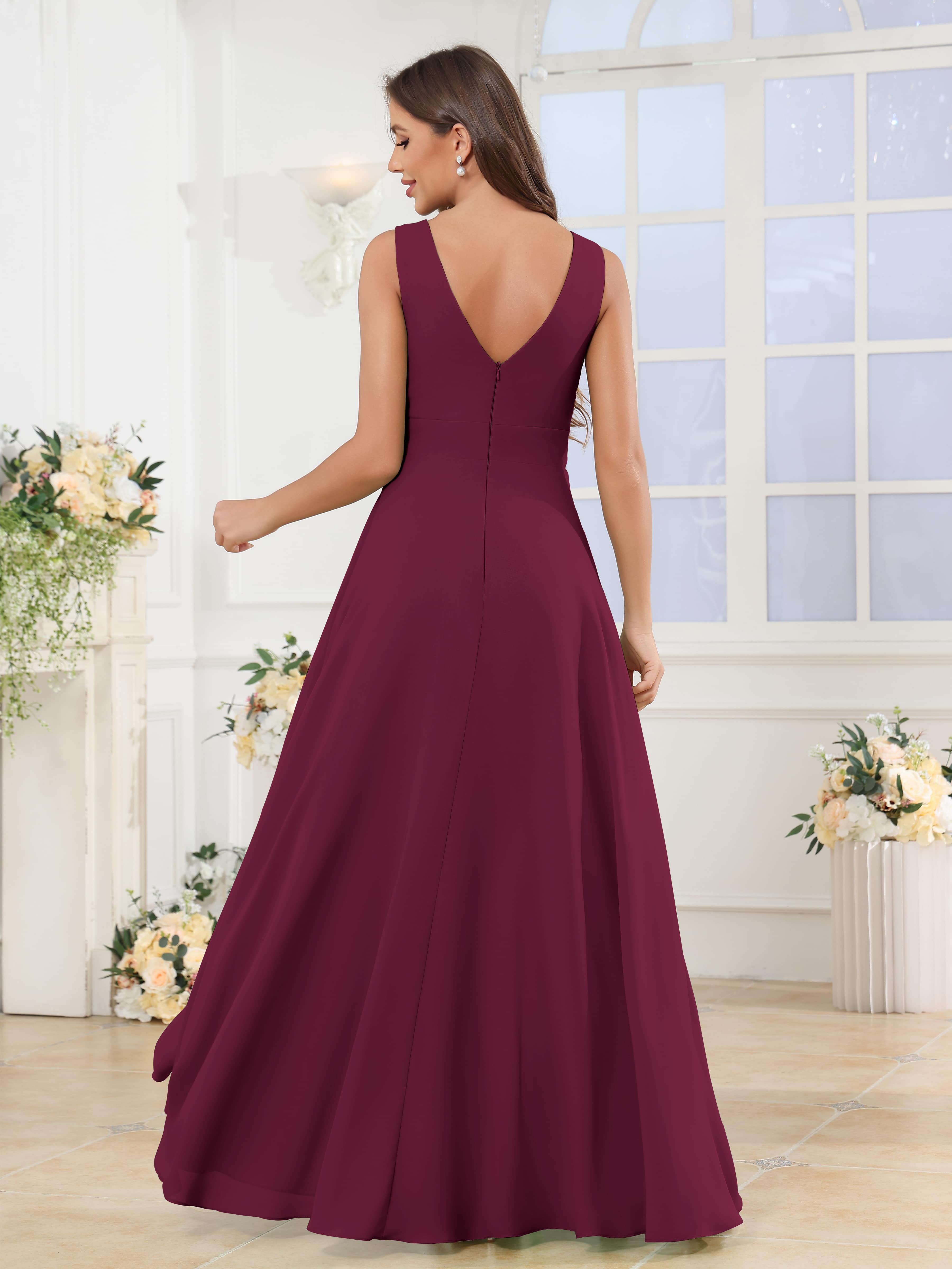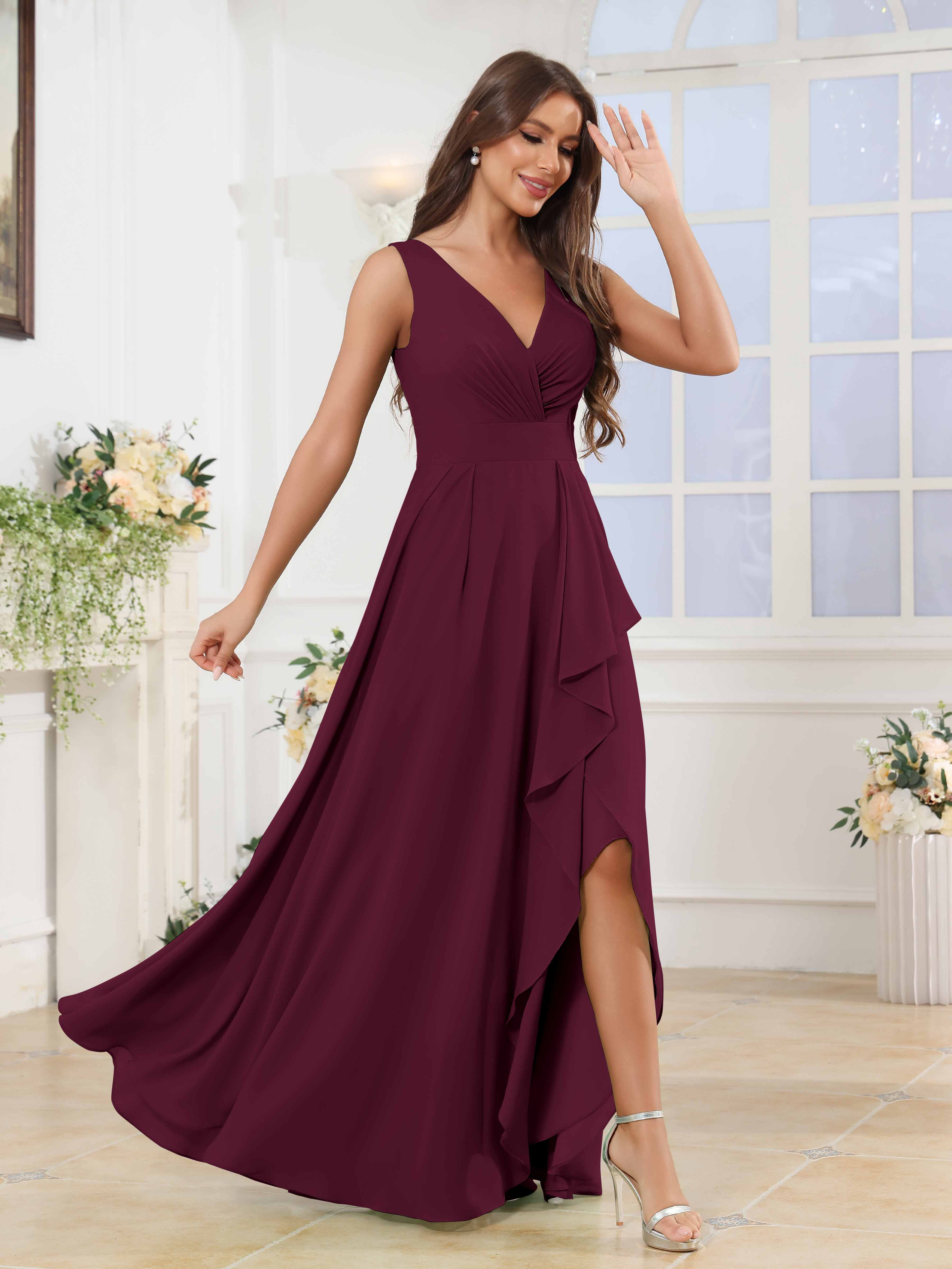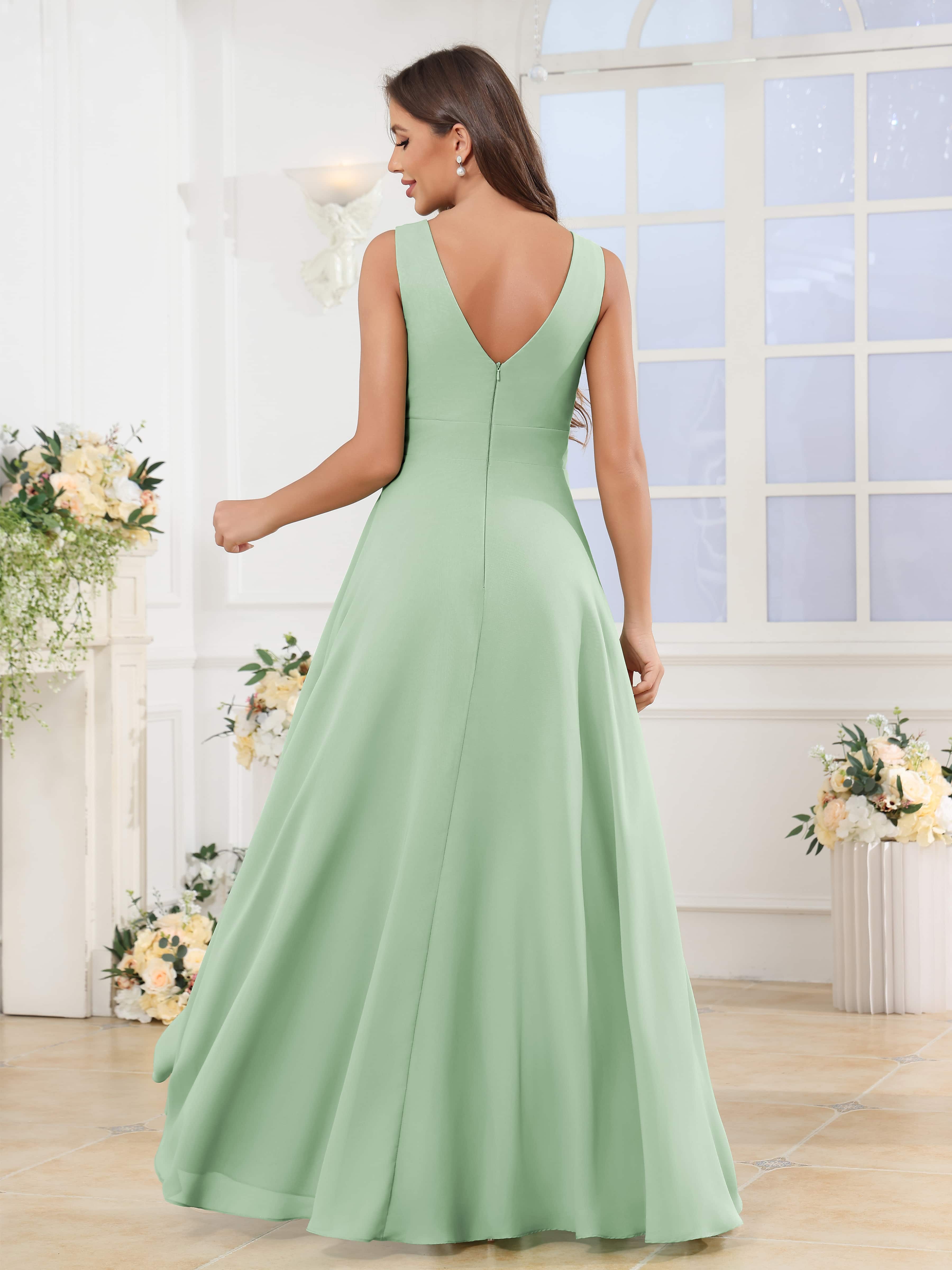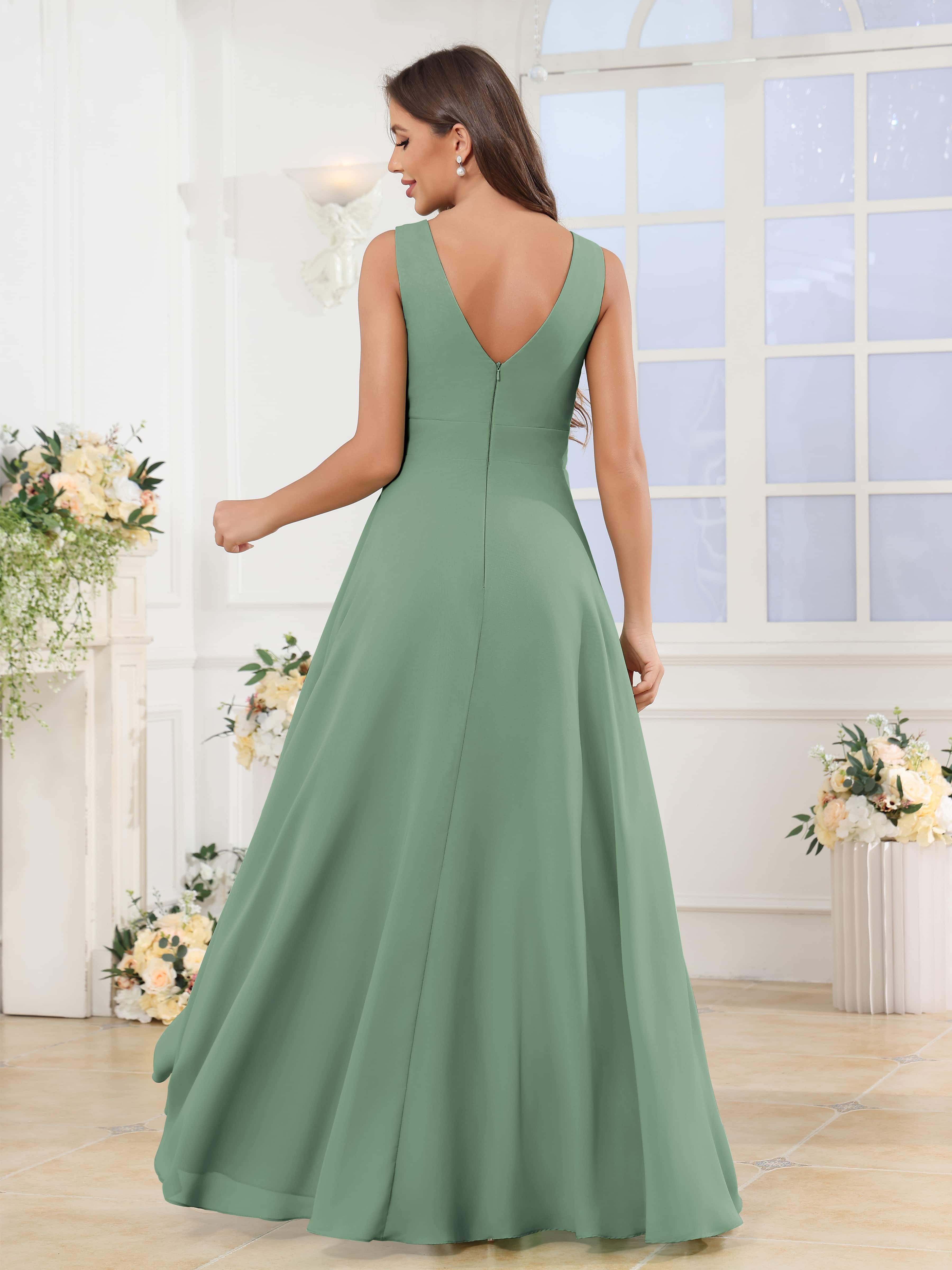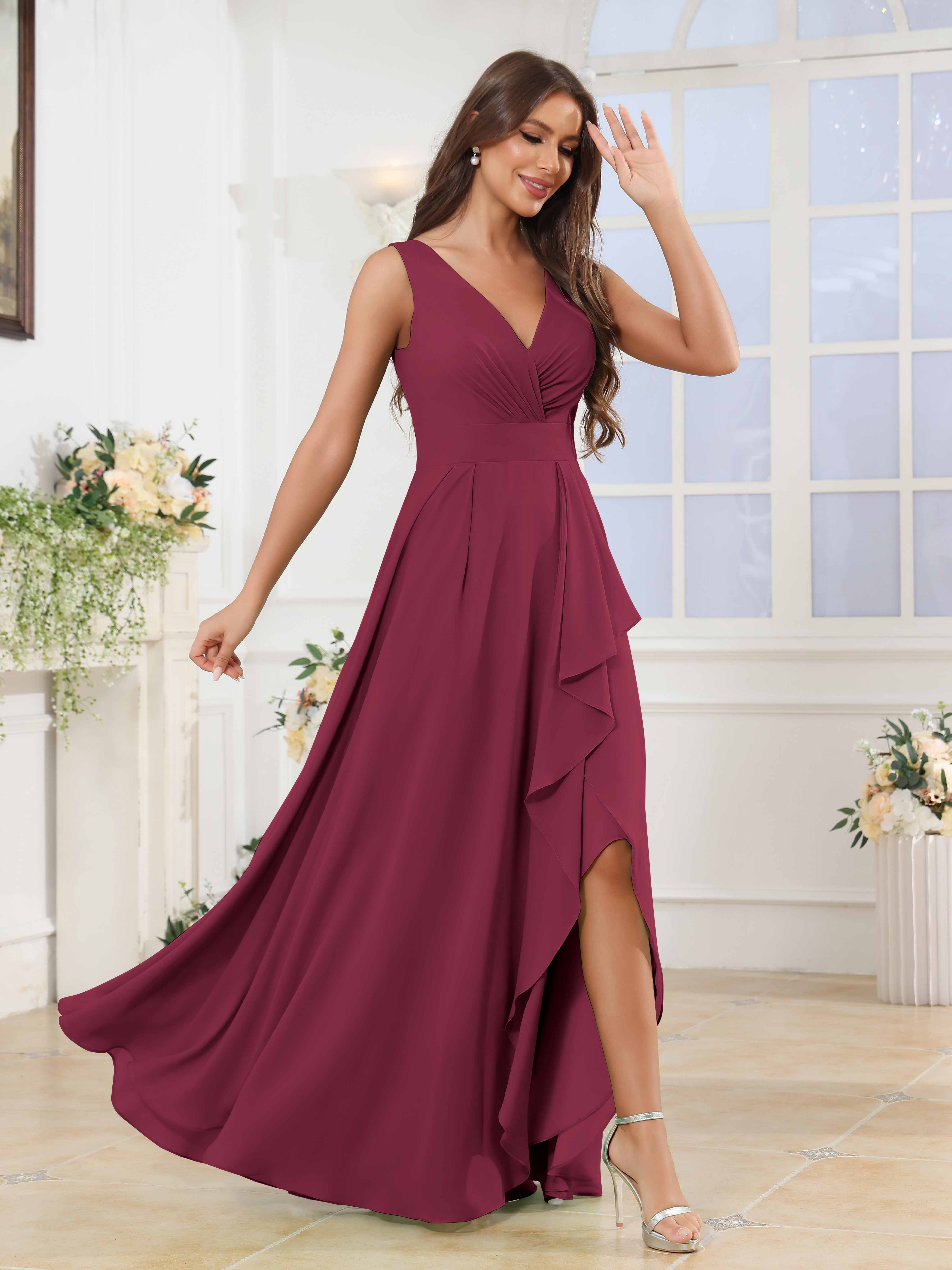 Jolie Timeless V-Neck Pleated Ruffles Long Chiffon Bridesmaid Dresses