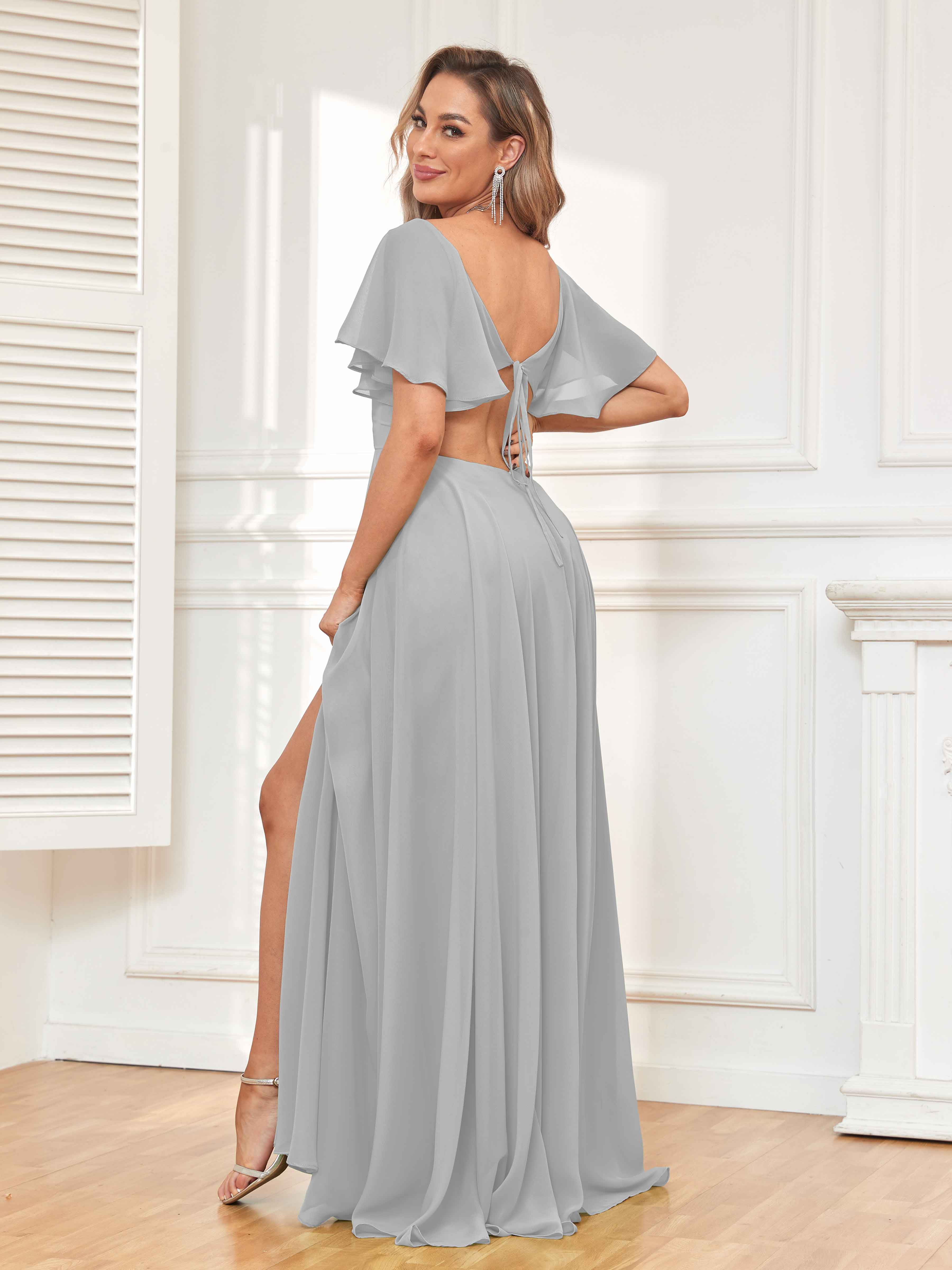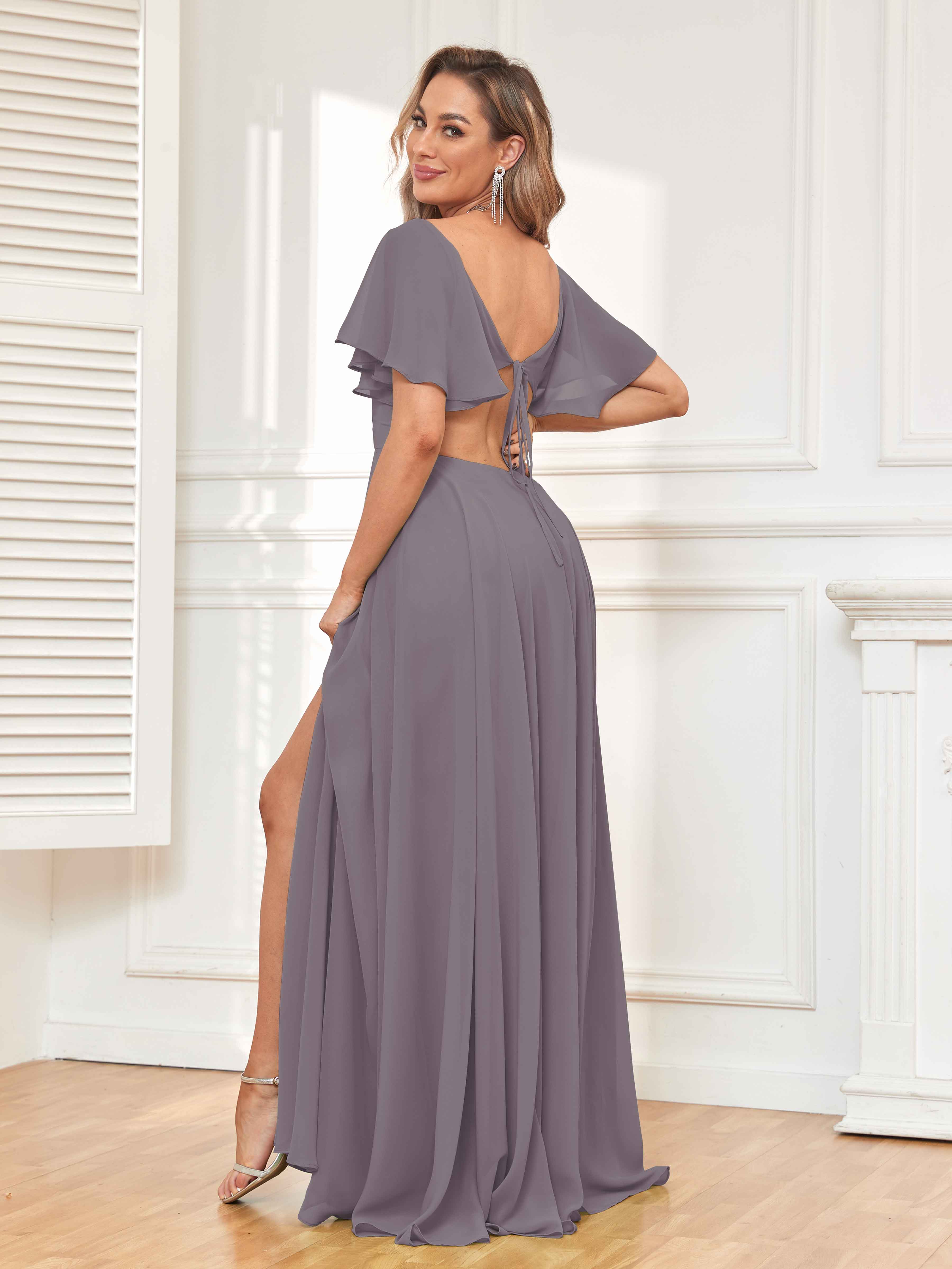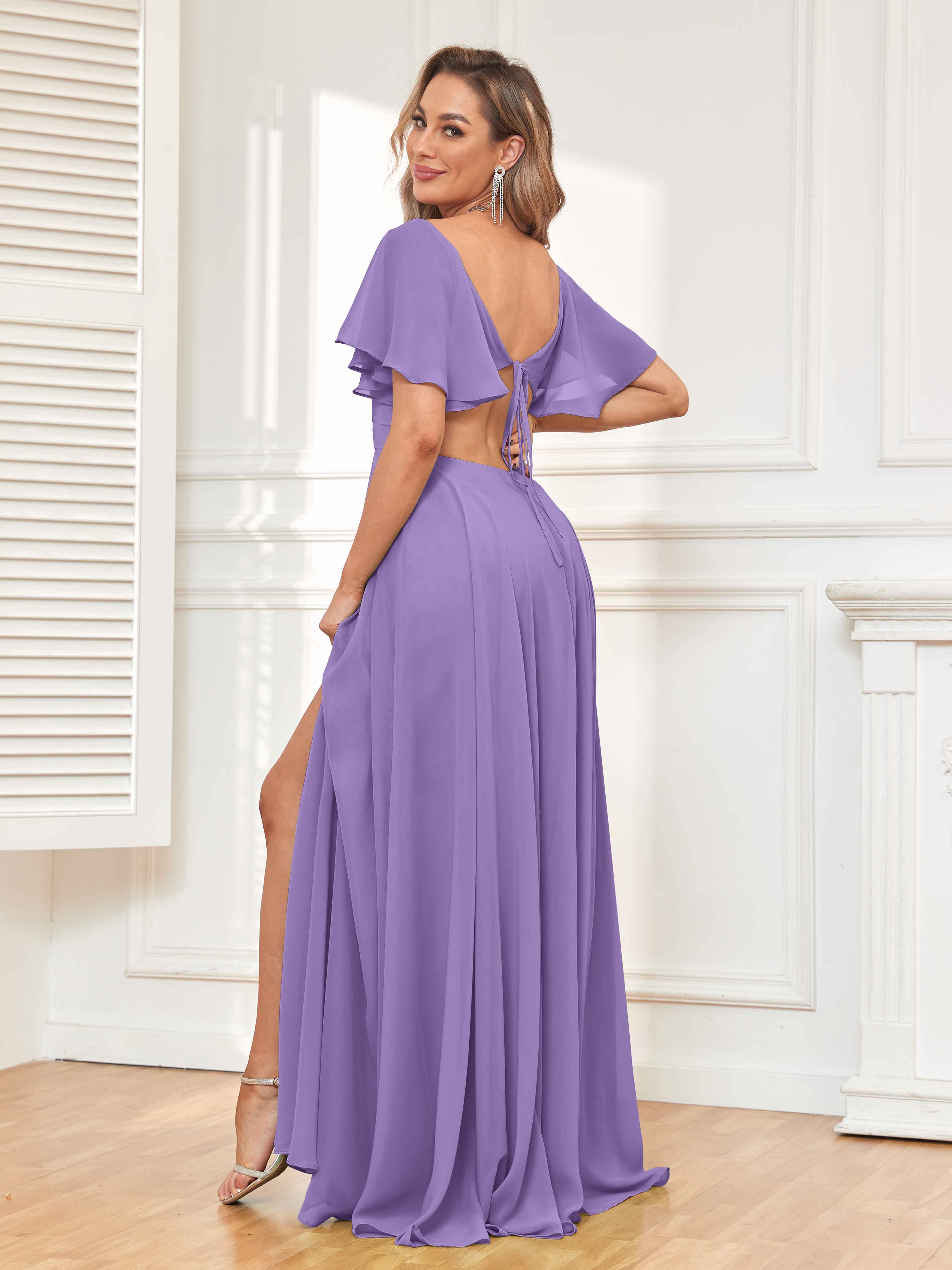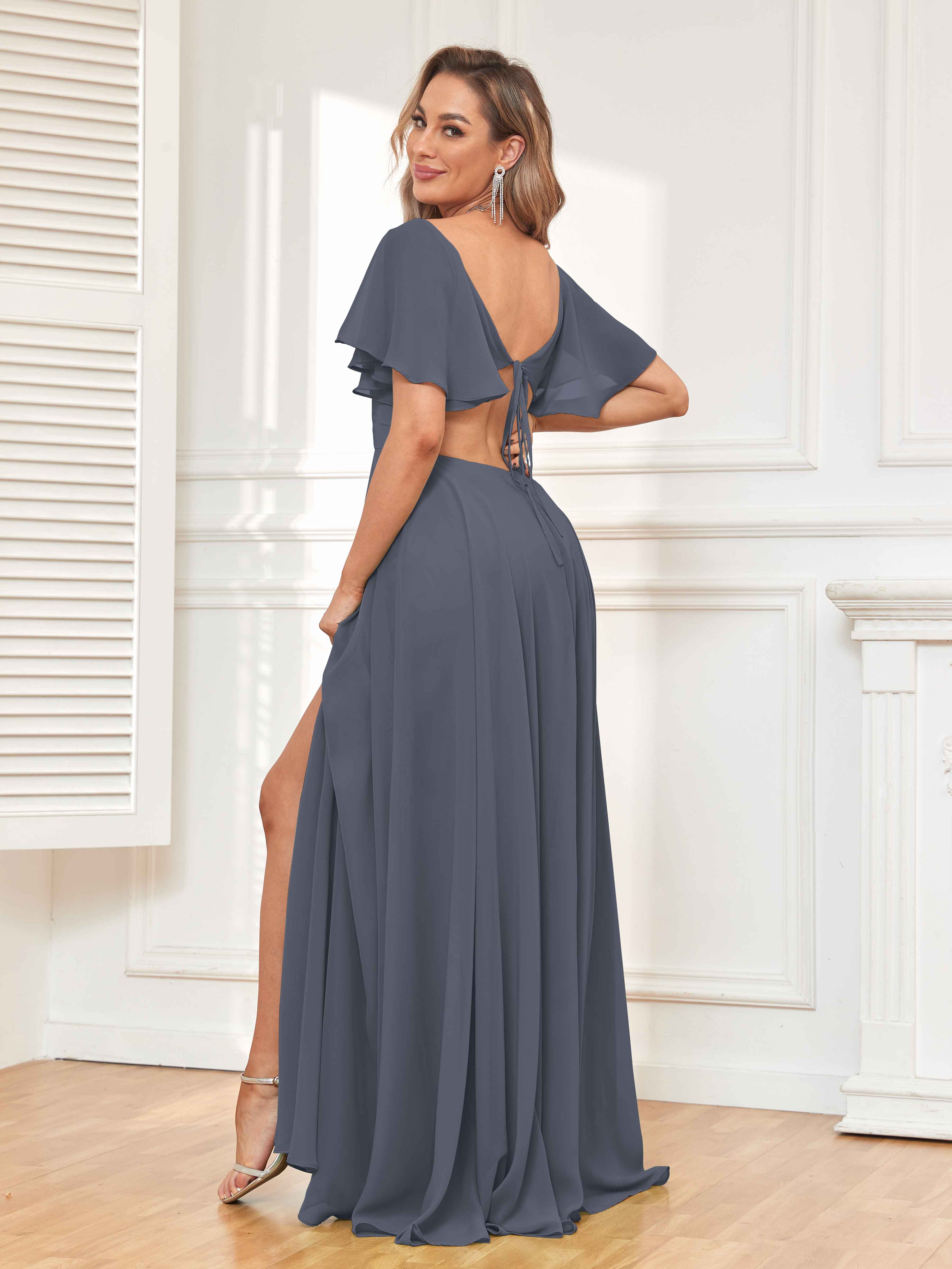 Josephine Modest Tie Back Slit Chiffon Bridesmaid Dresses With Ruffles