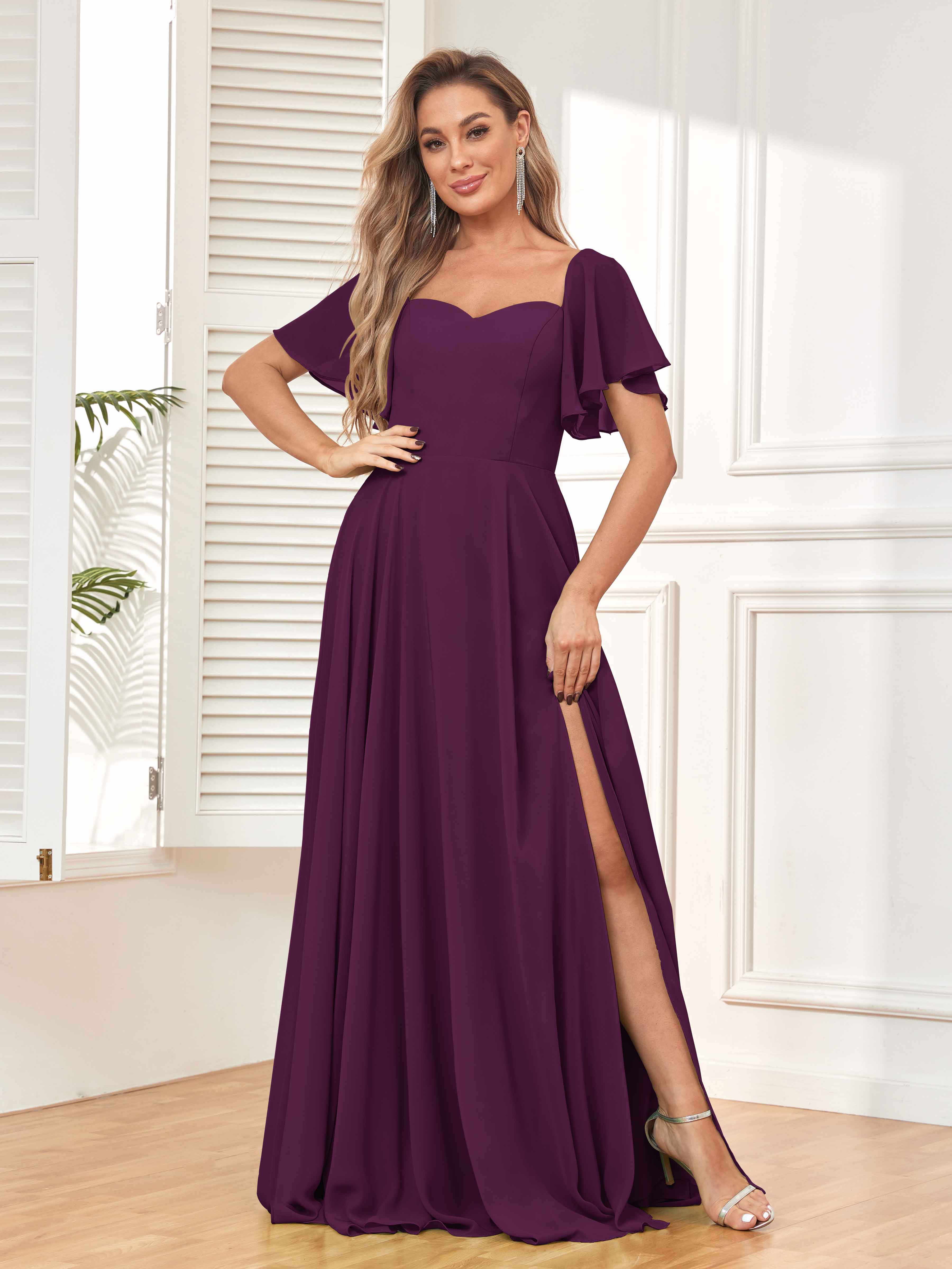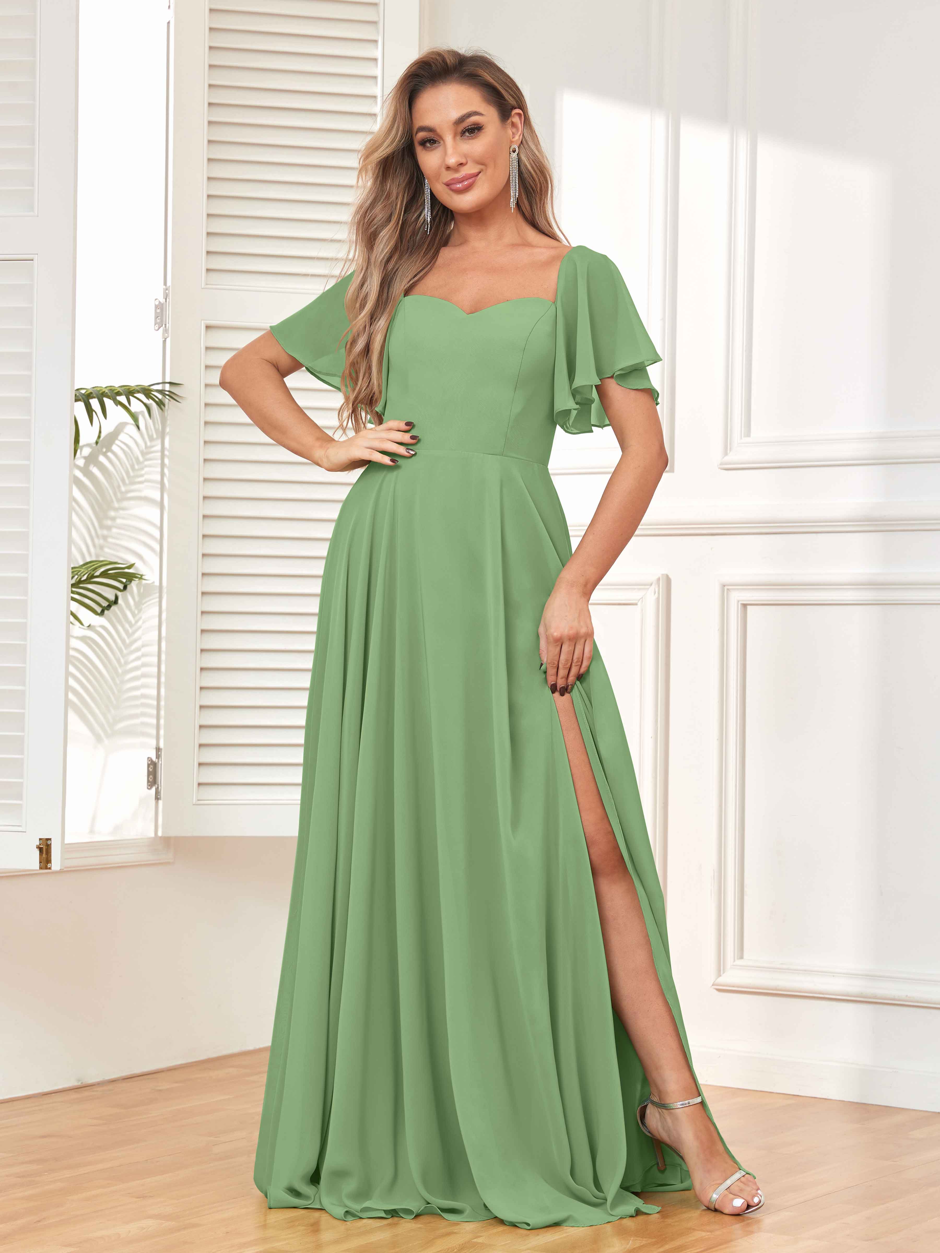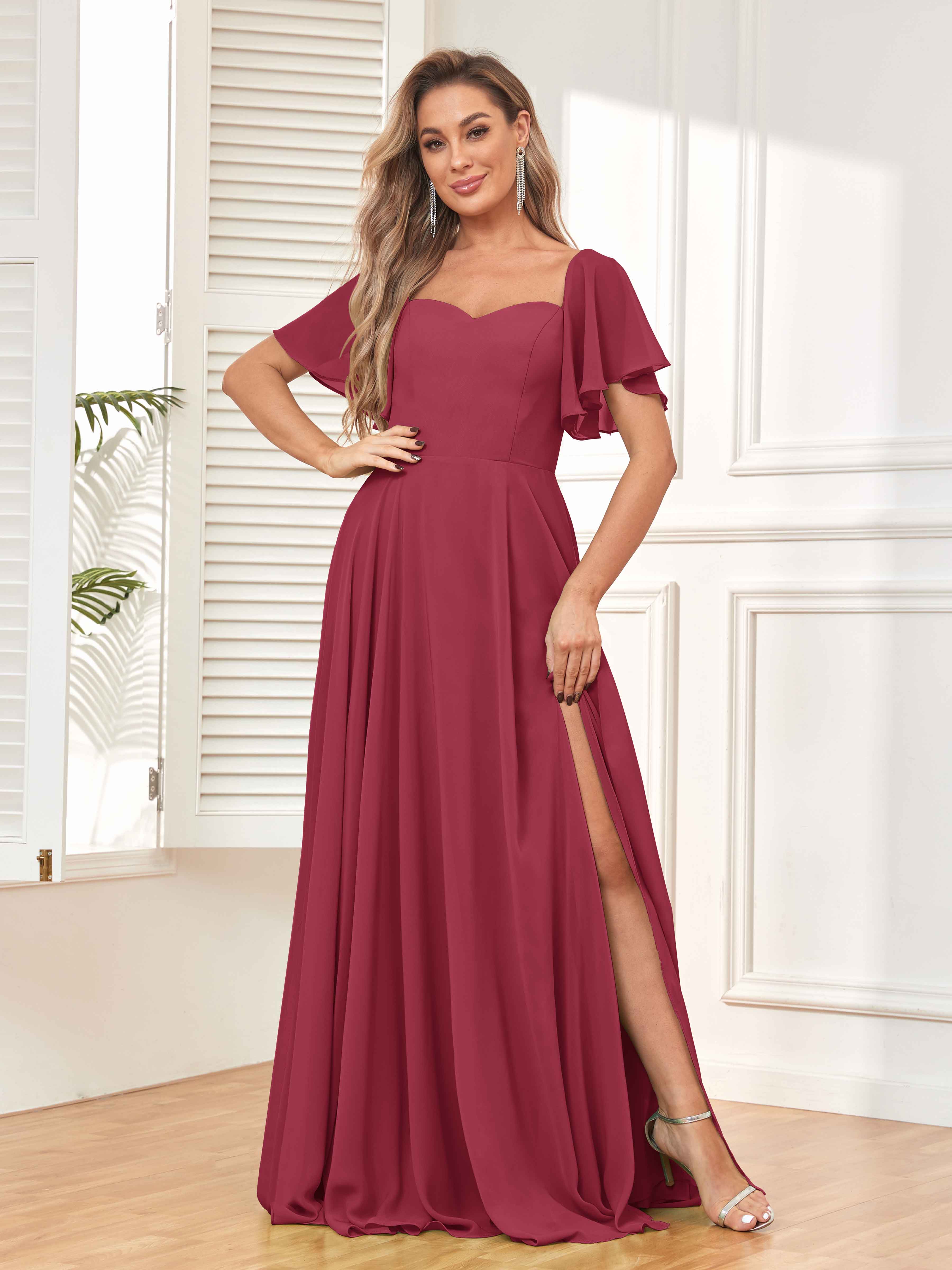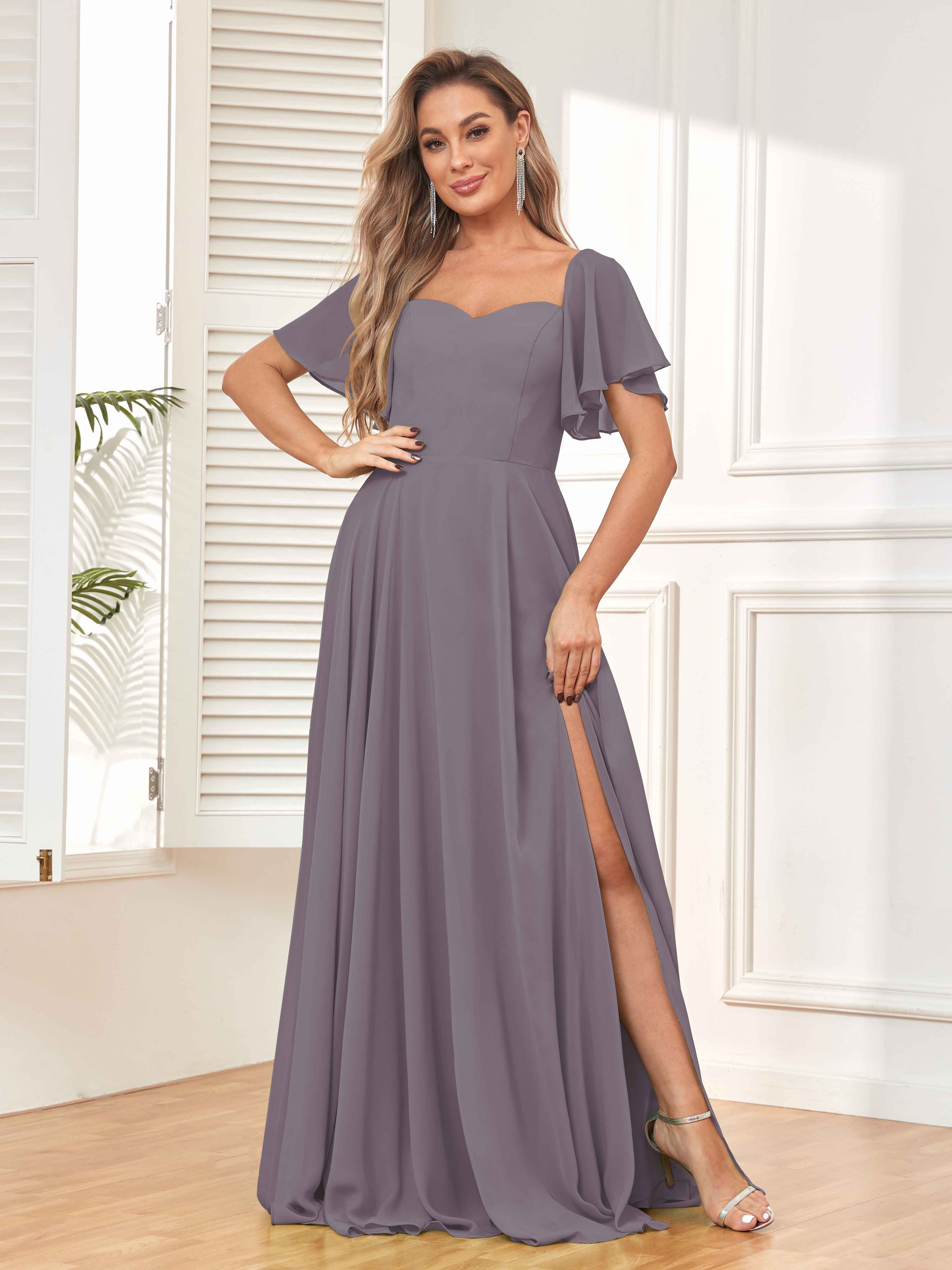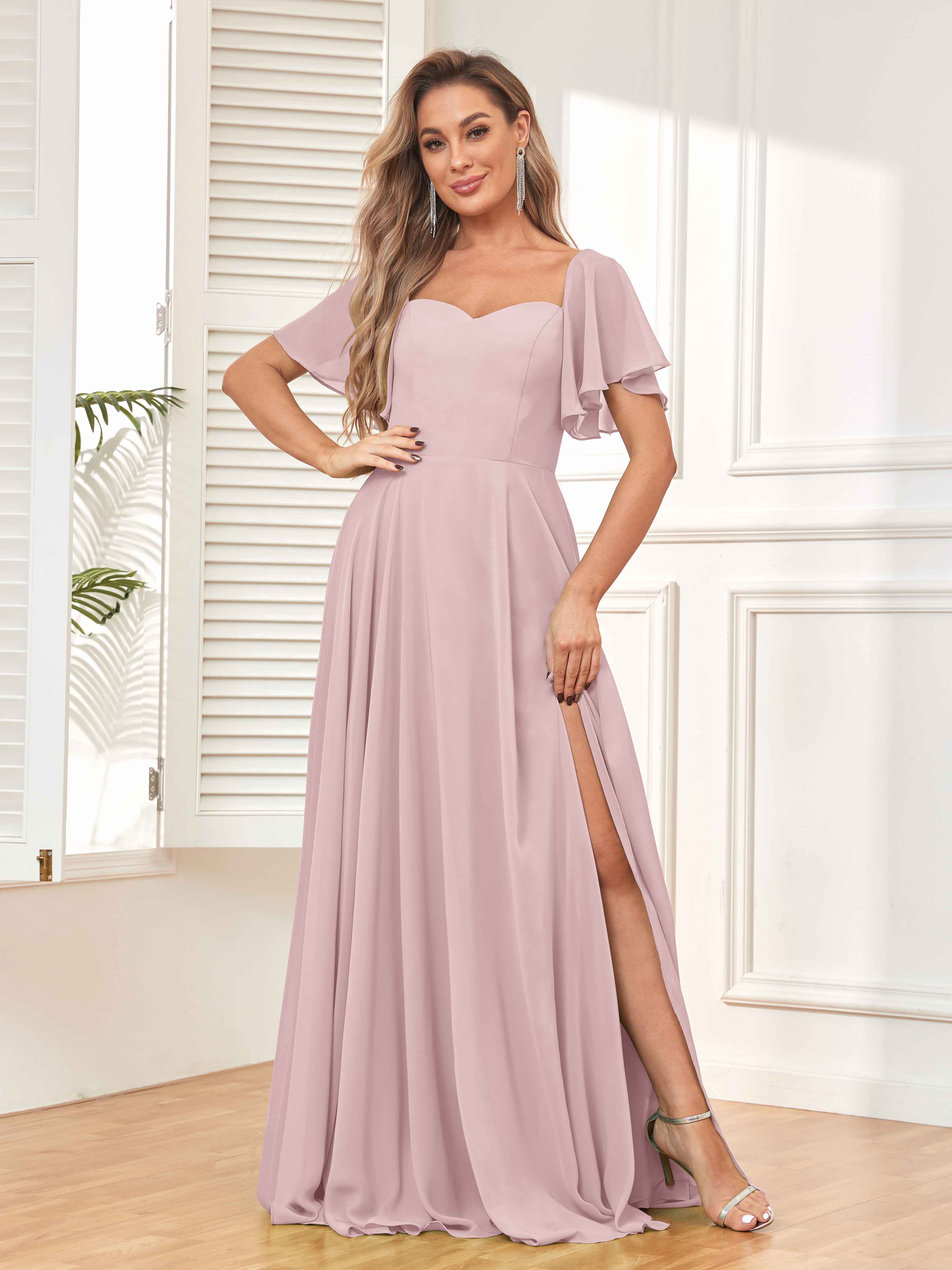 Josephine Modest Tie Back Slit Chiffon Bridesmaid Dresses With Ruffles