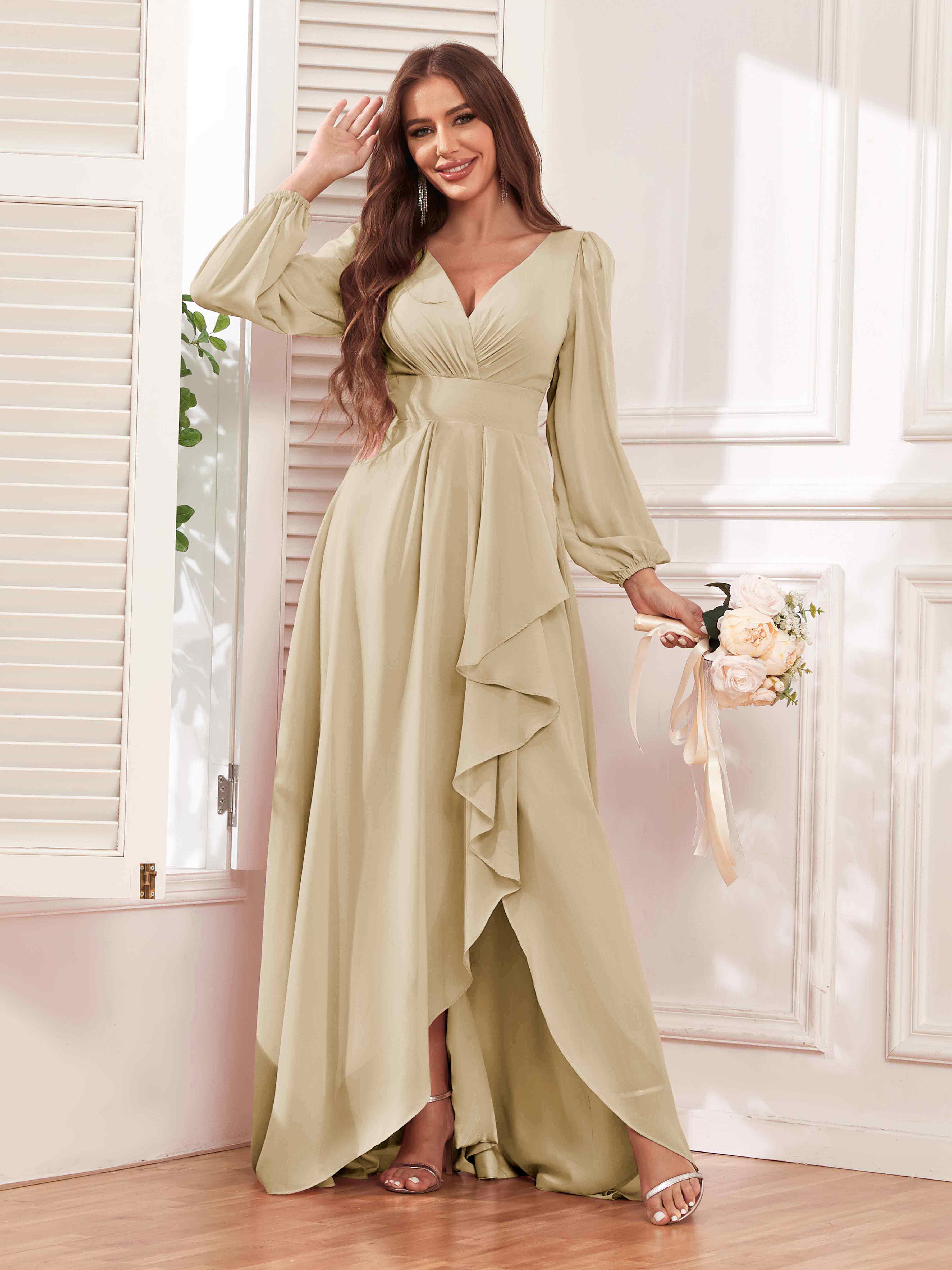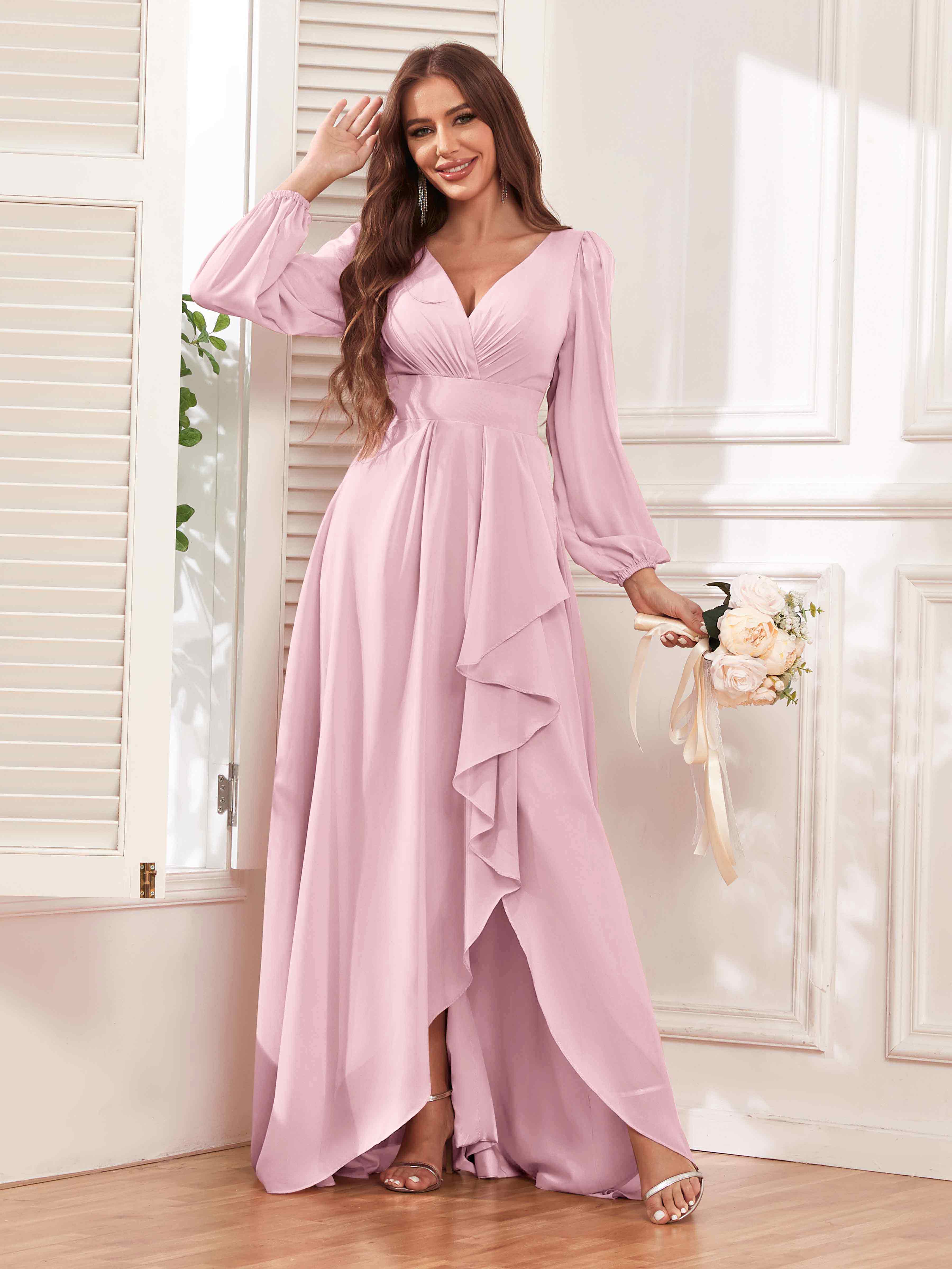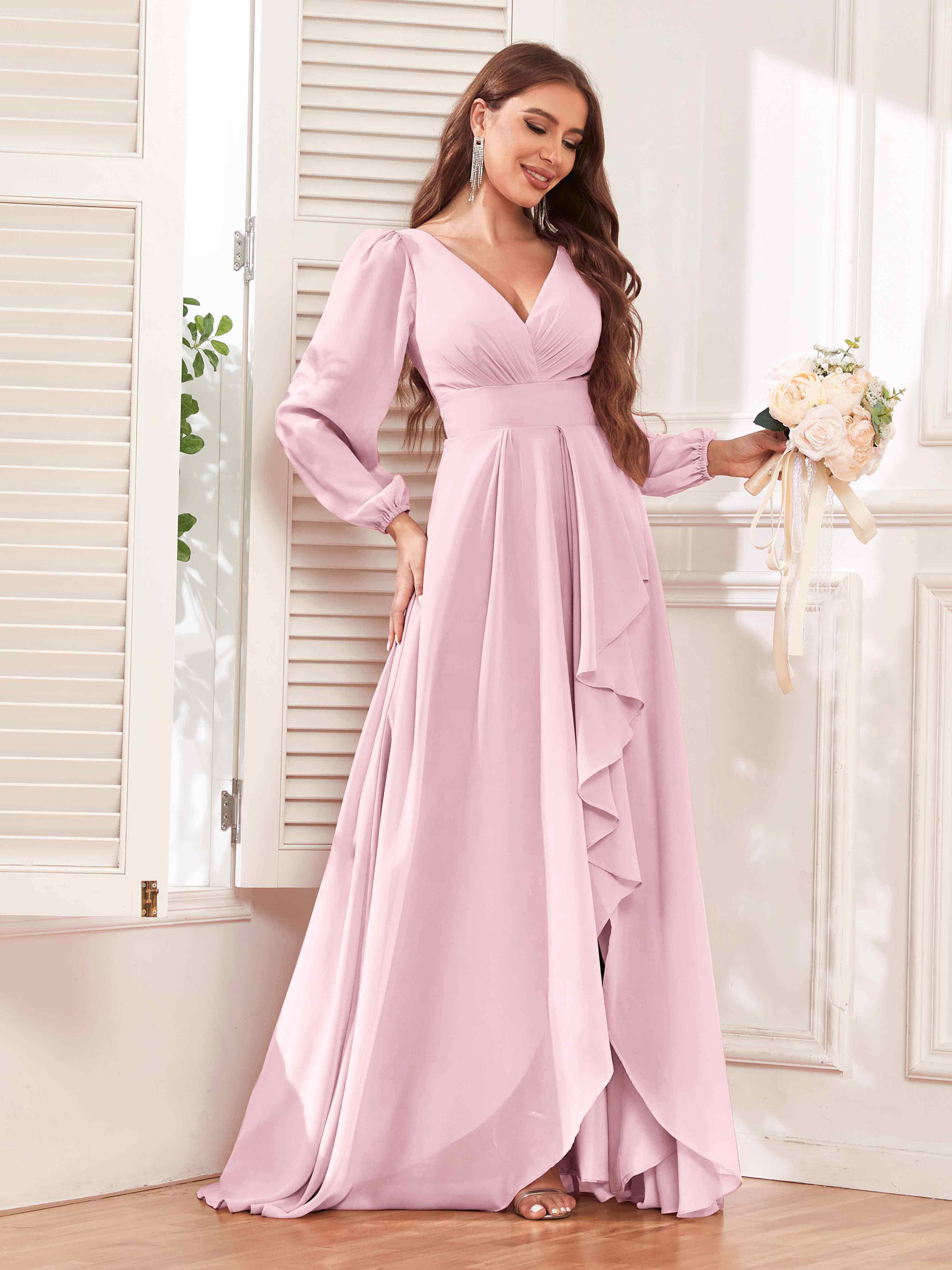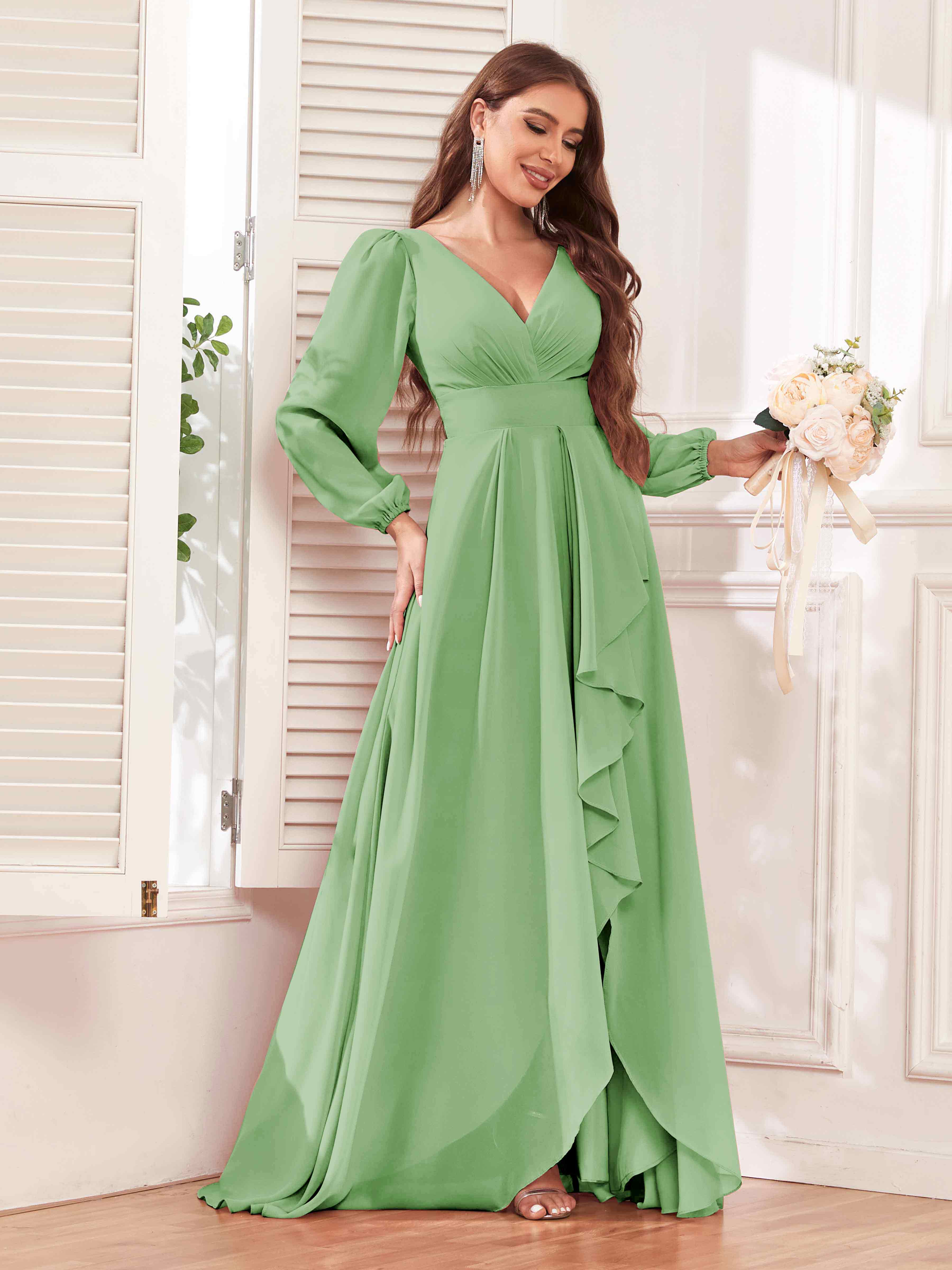 Julianna Modest V Neck Long Sleeves Ruffles Chiffon Bridesmaid Dresses