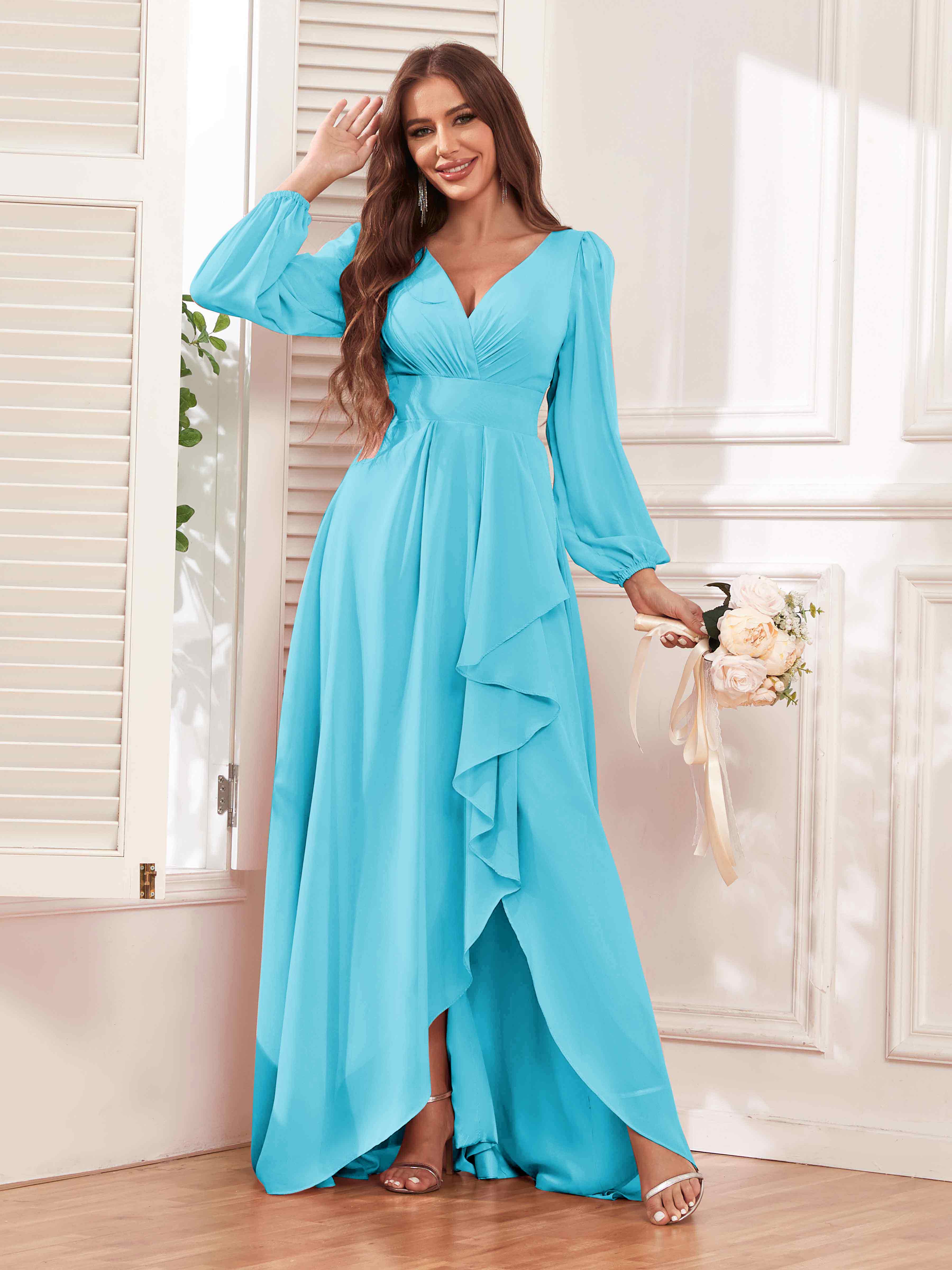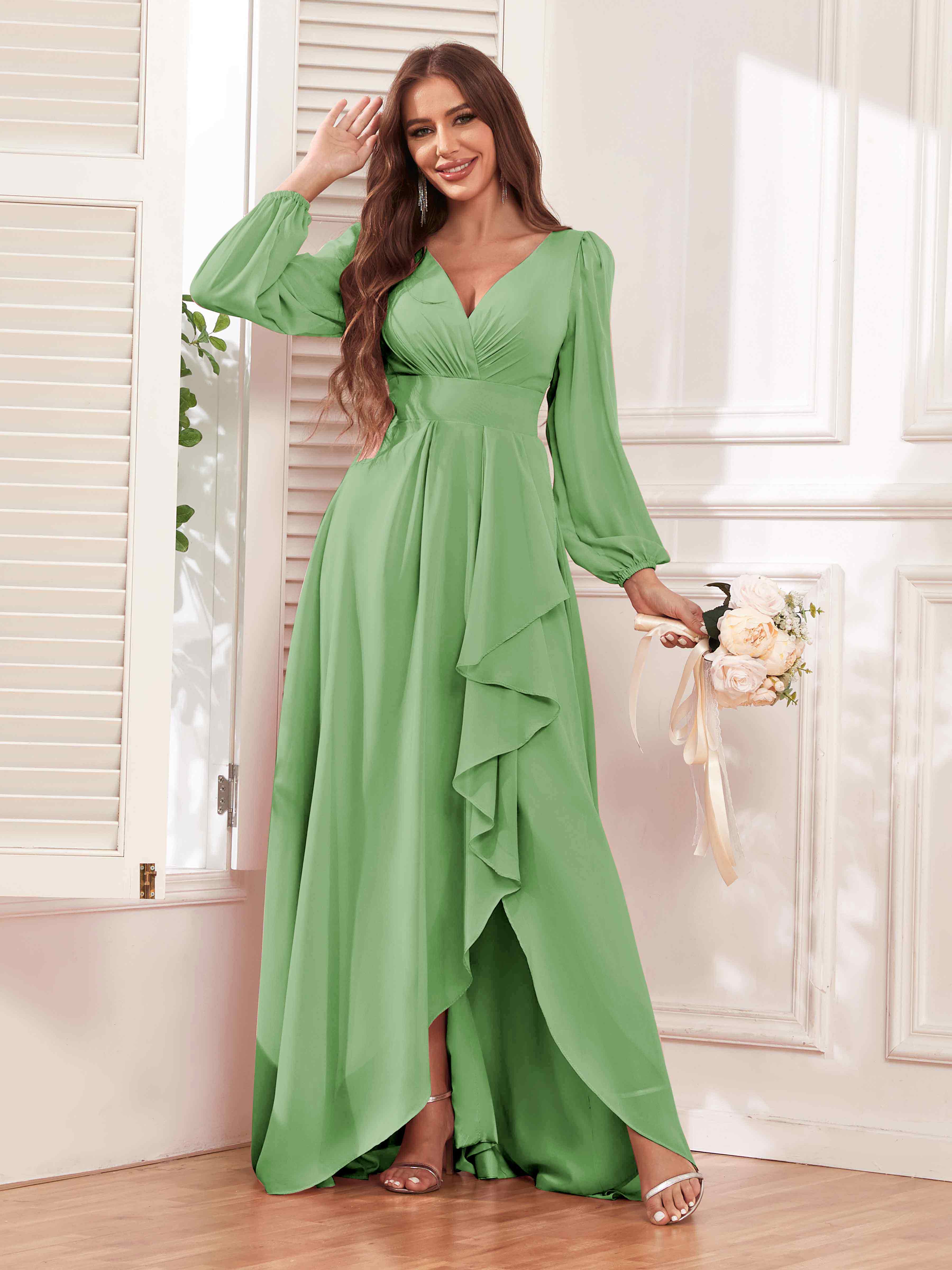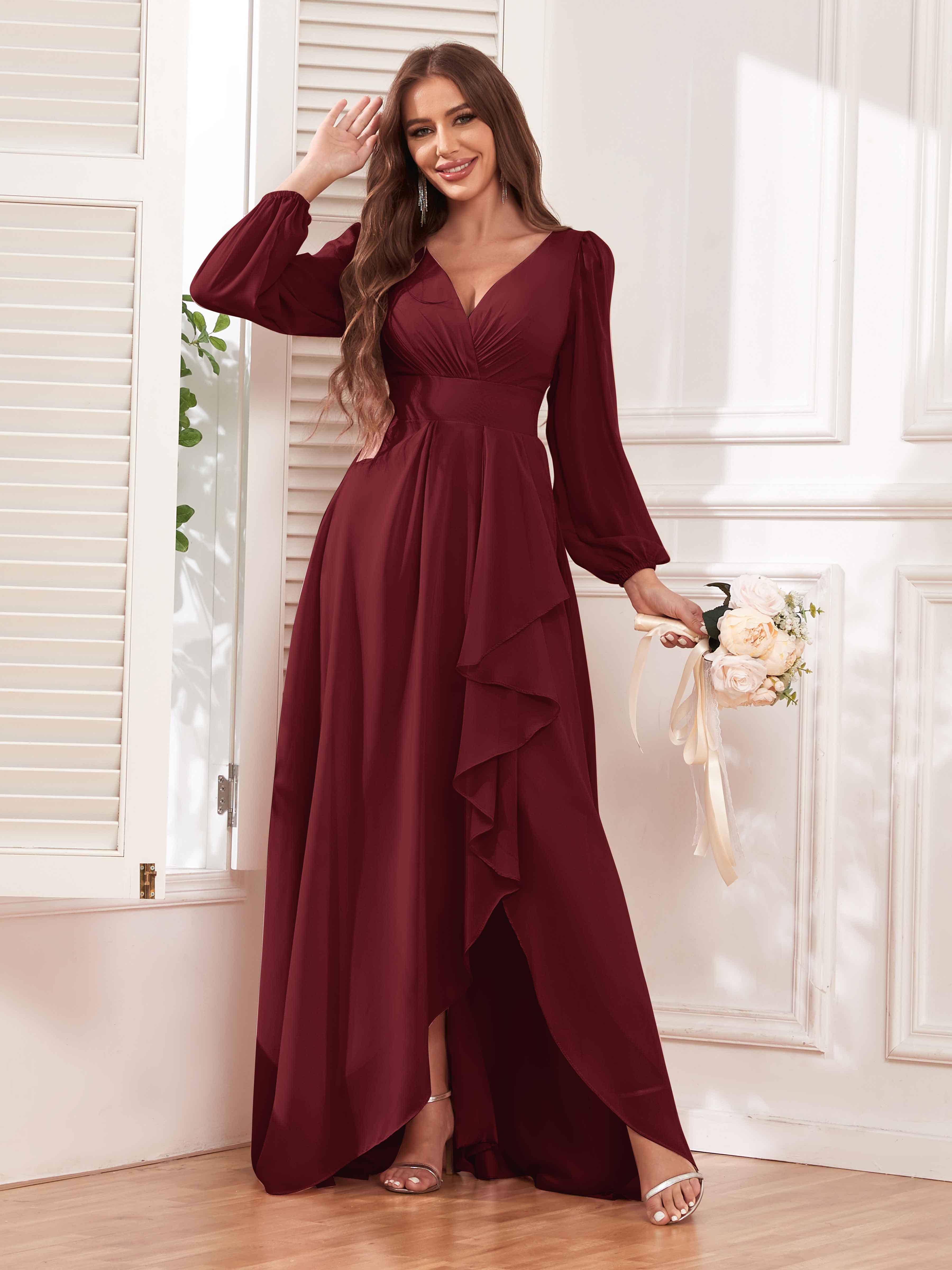 Julianna Modest V Neck Long Sleeves Ruffles Chiffon Bridesmaid Dresses