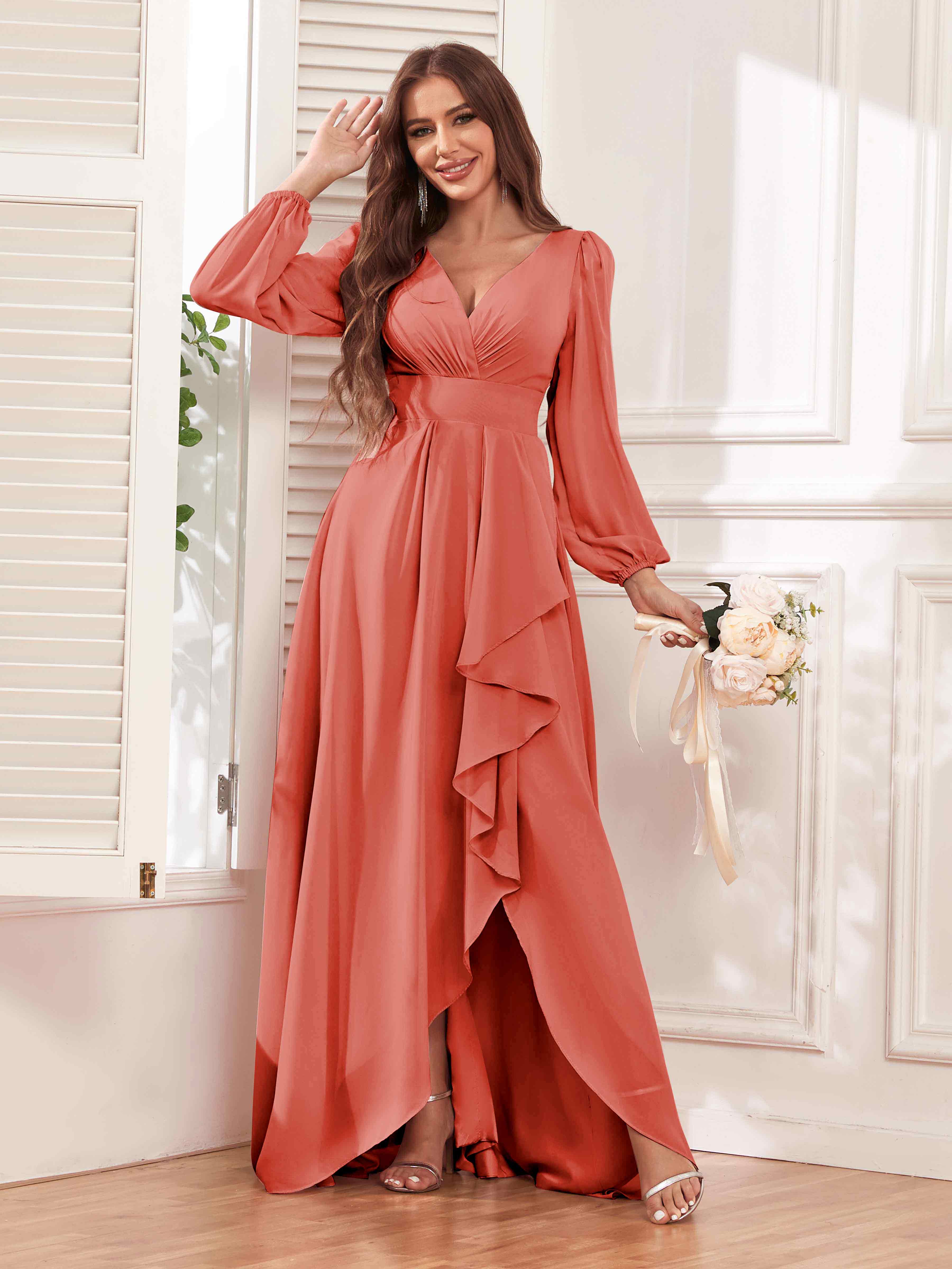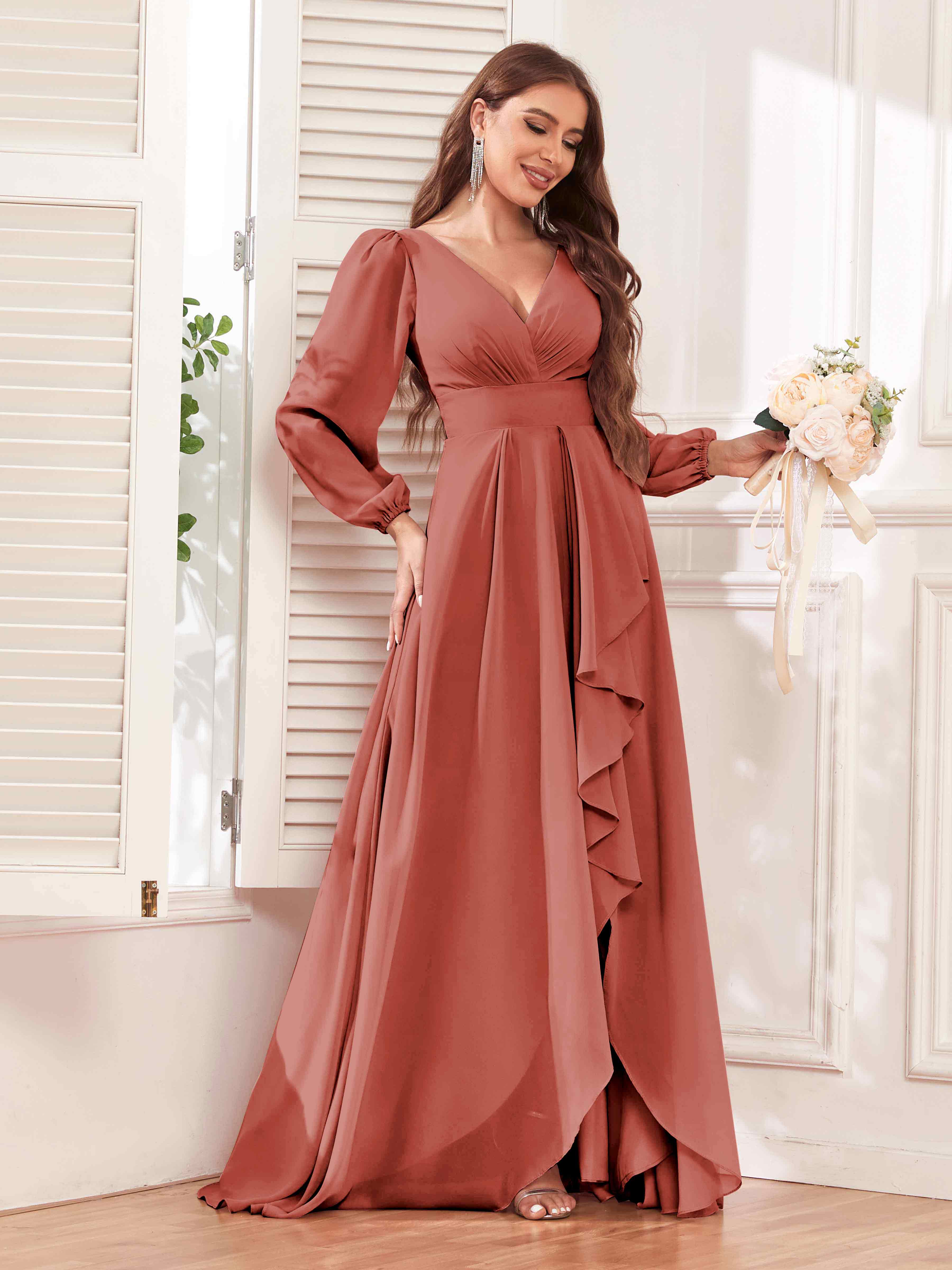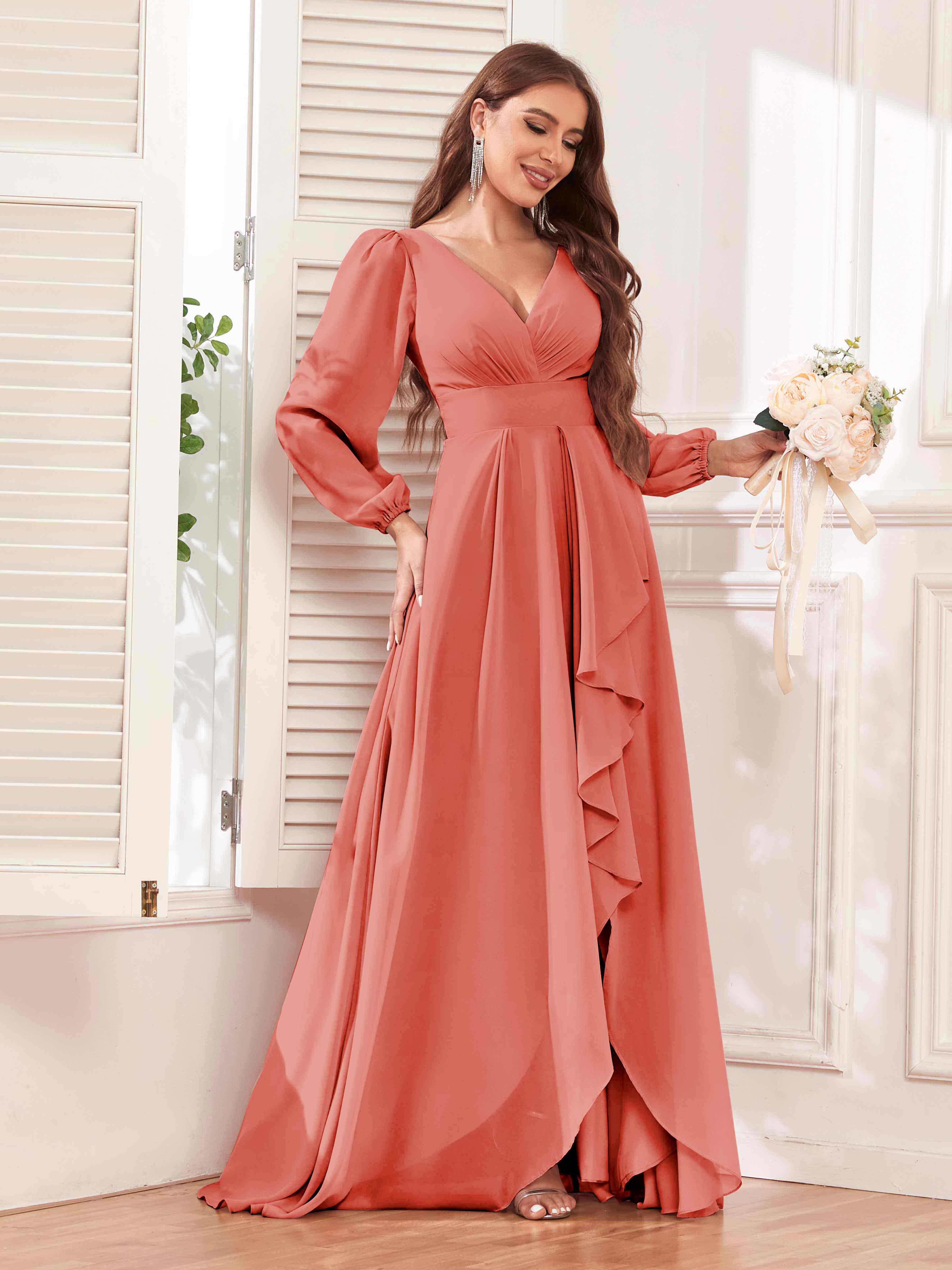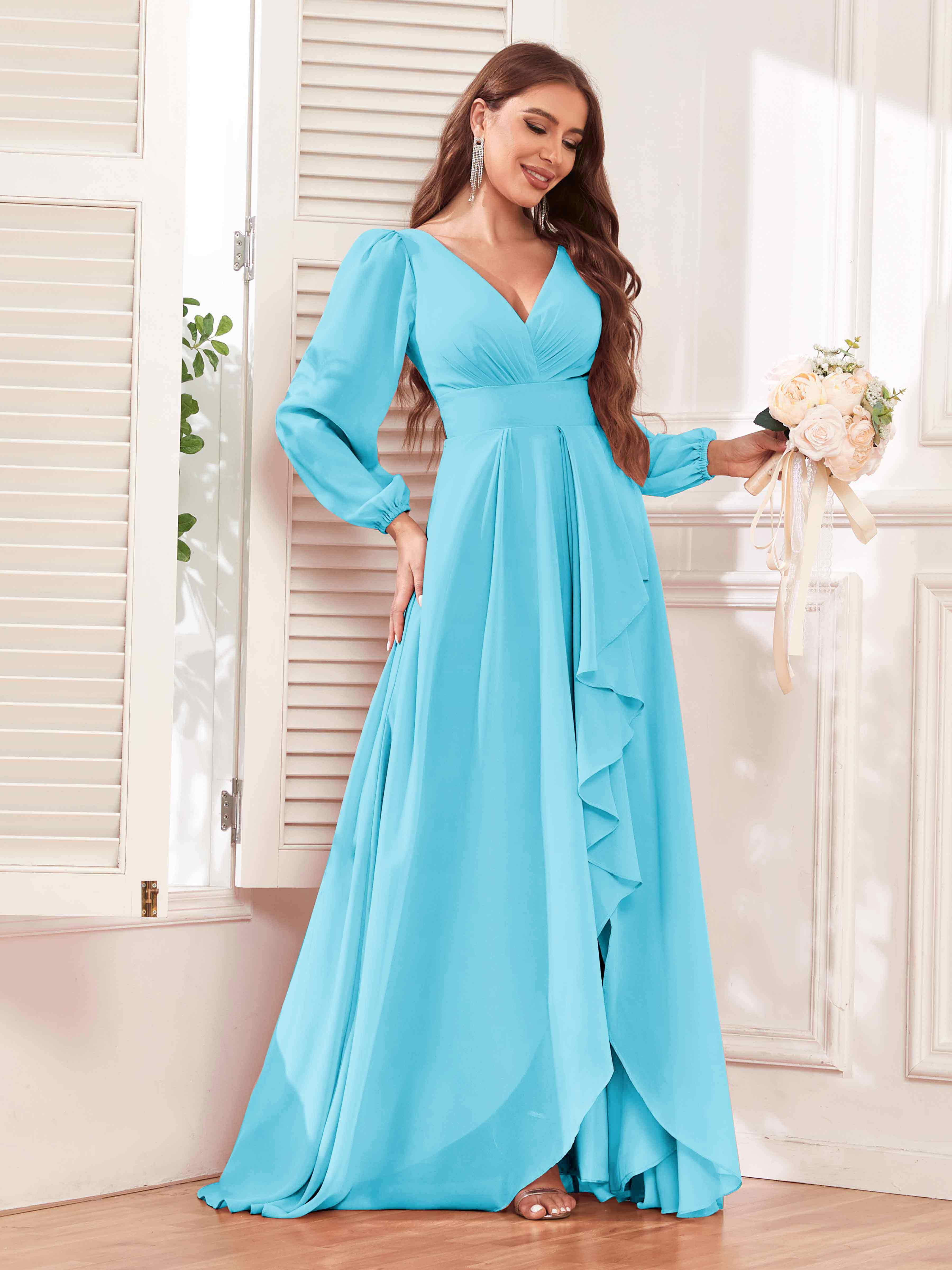 Julianna Modest V Neck Long Sleeves Ruffles Chiffon Bridesmaid Dresses