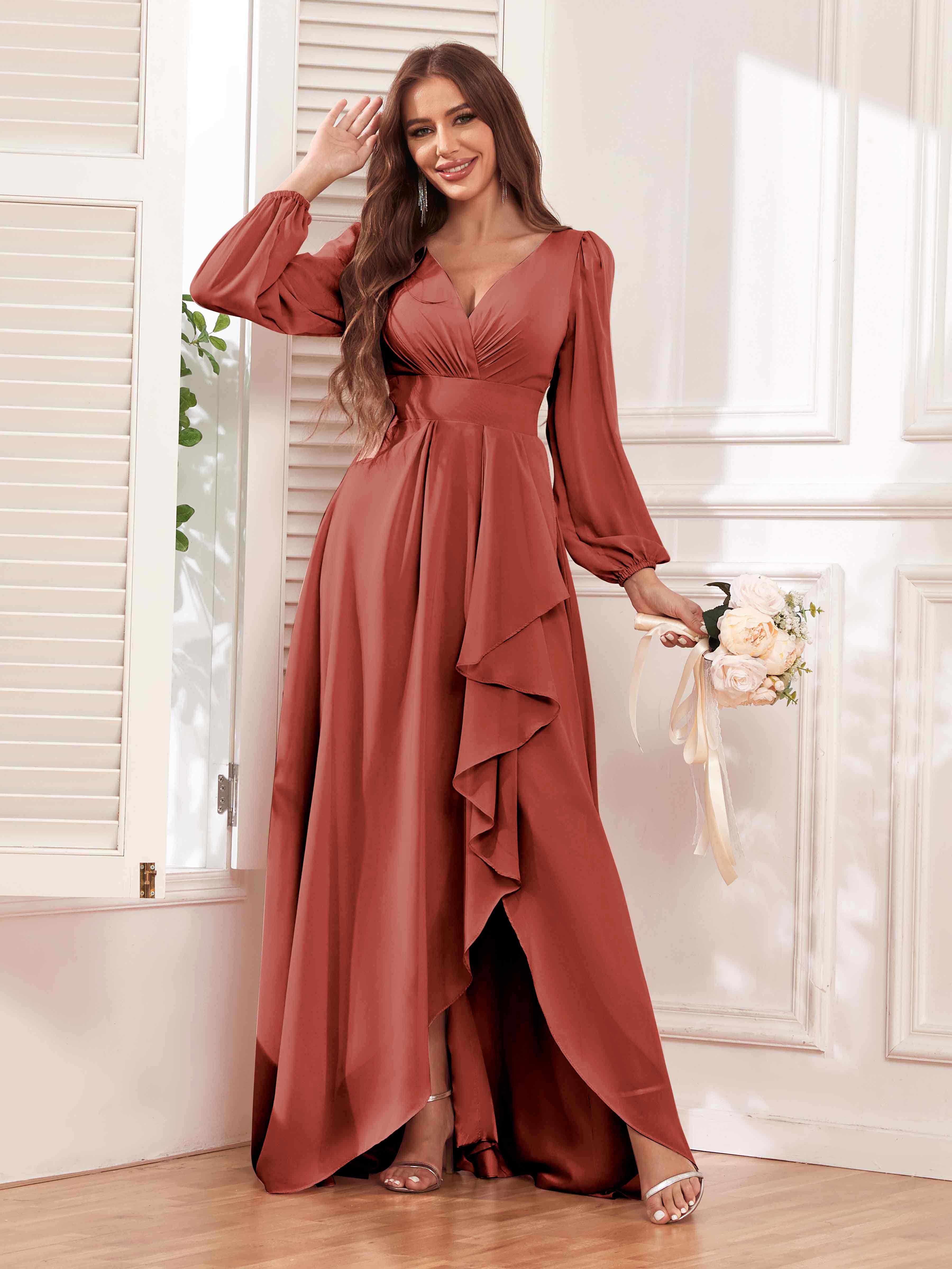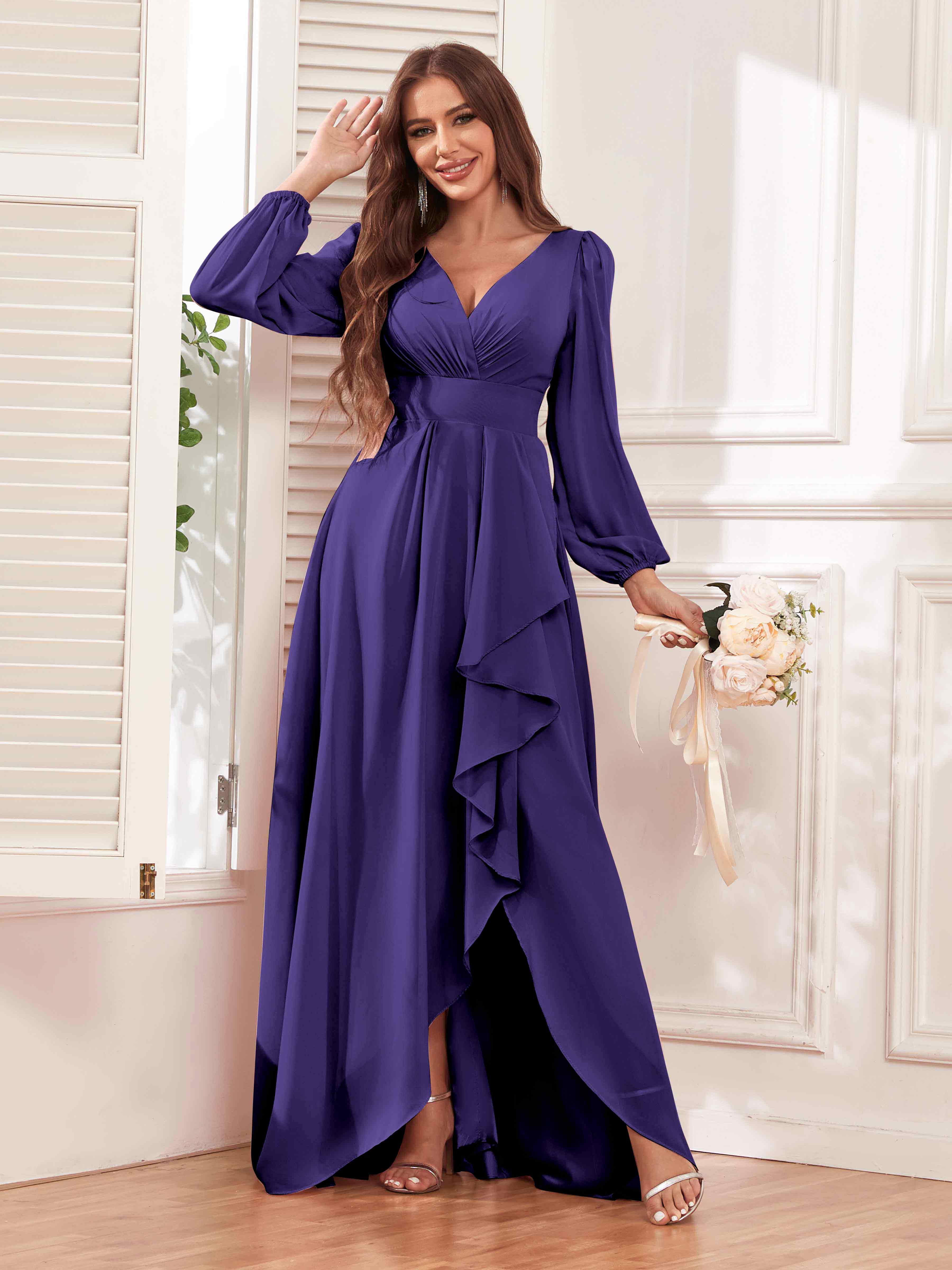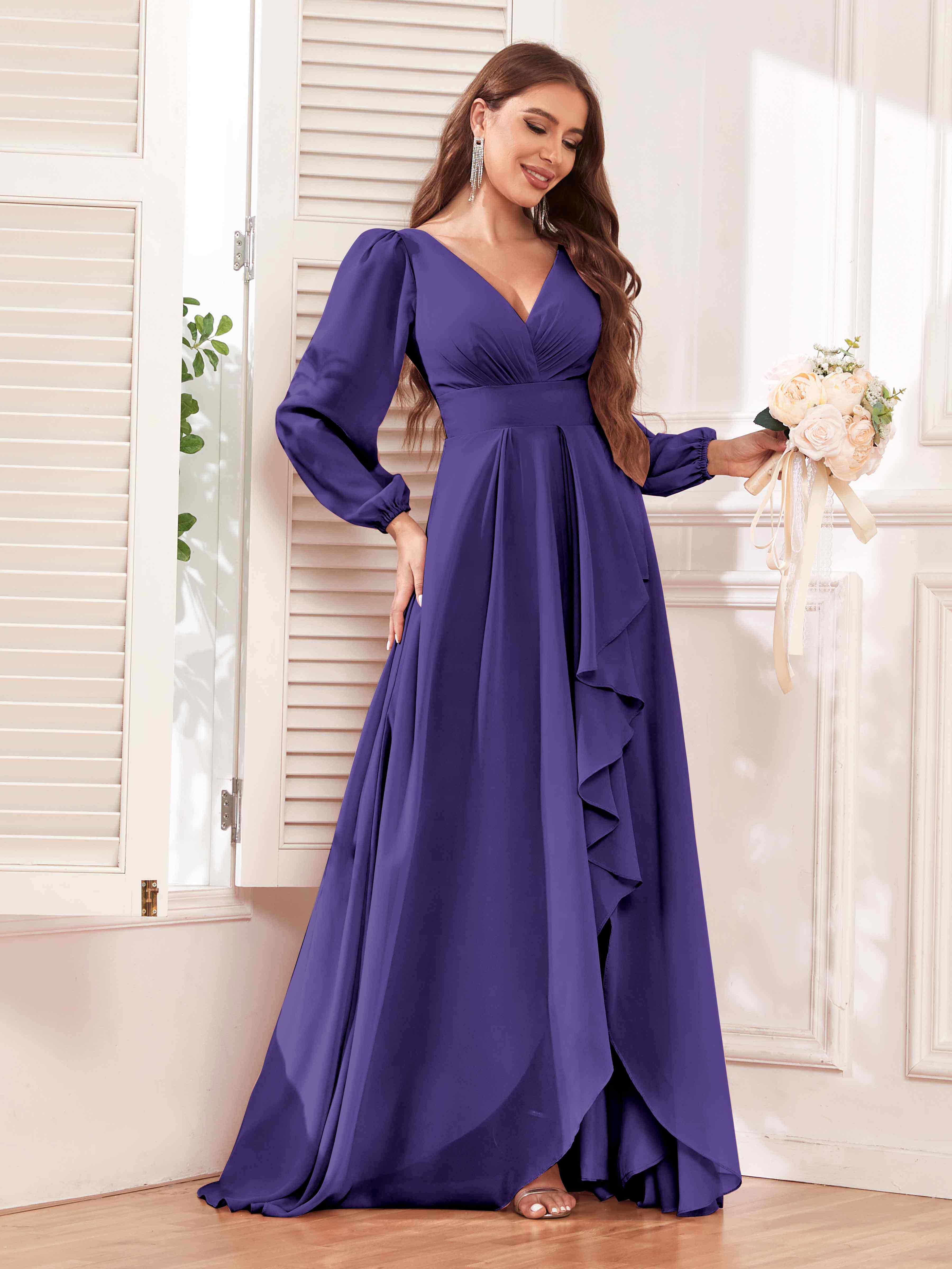 Discover the trendy elegance of Pomuyoo's Julianna dress. This captivating gown features stylish long sleeves, cascading ruffles, and flowing chiffon fabric. Embrace modern charm and make a statement as a bridesmaid. Shop now and exude grace and sophistication with this fashionable dress!