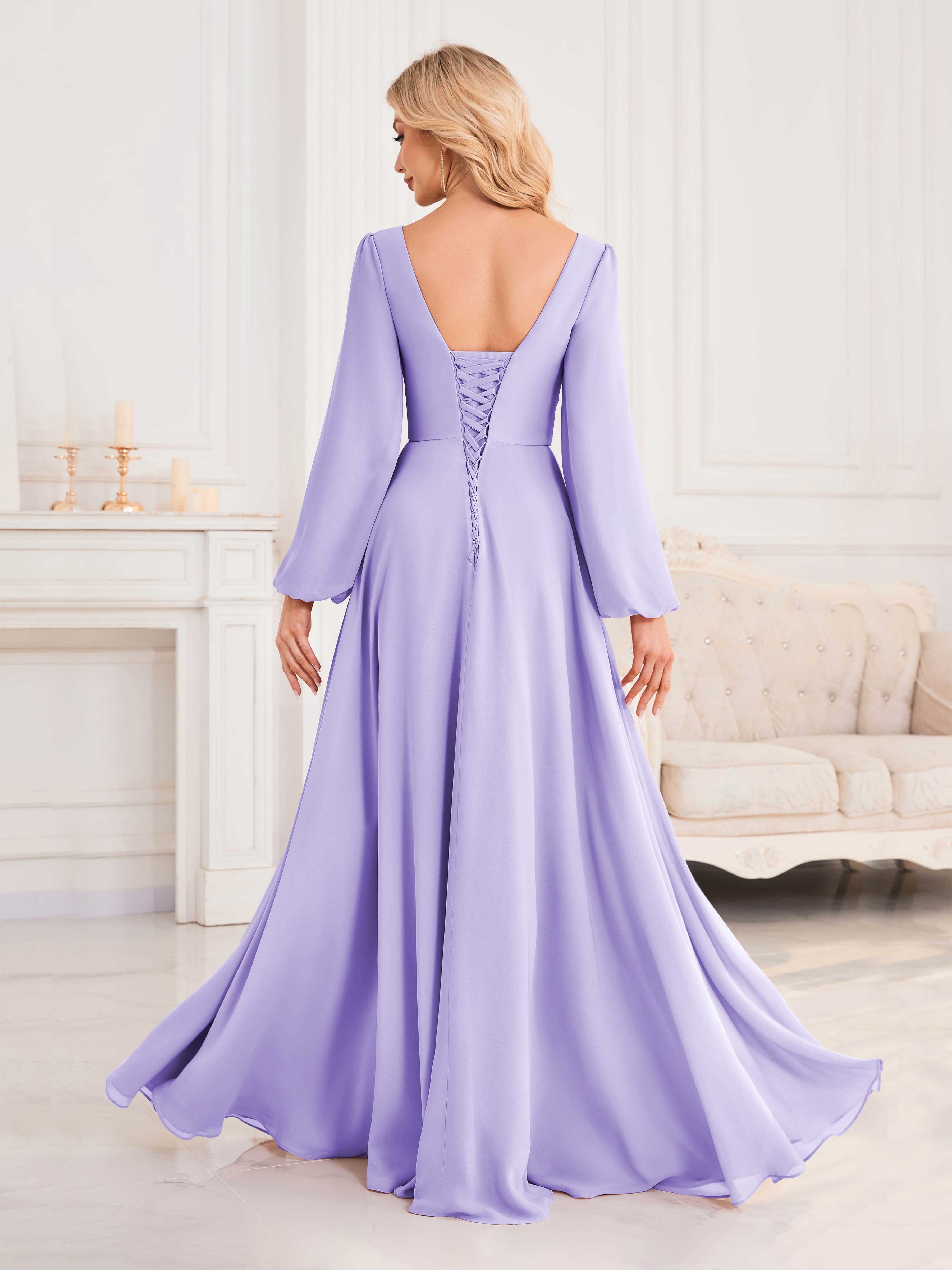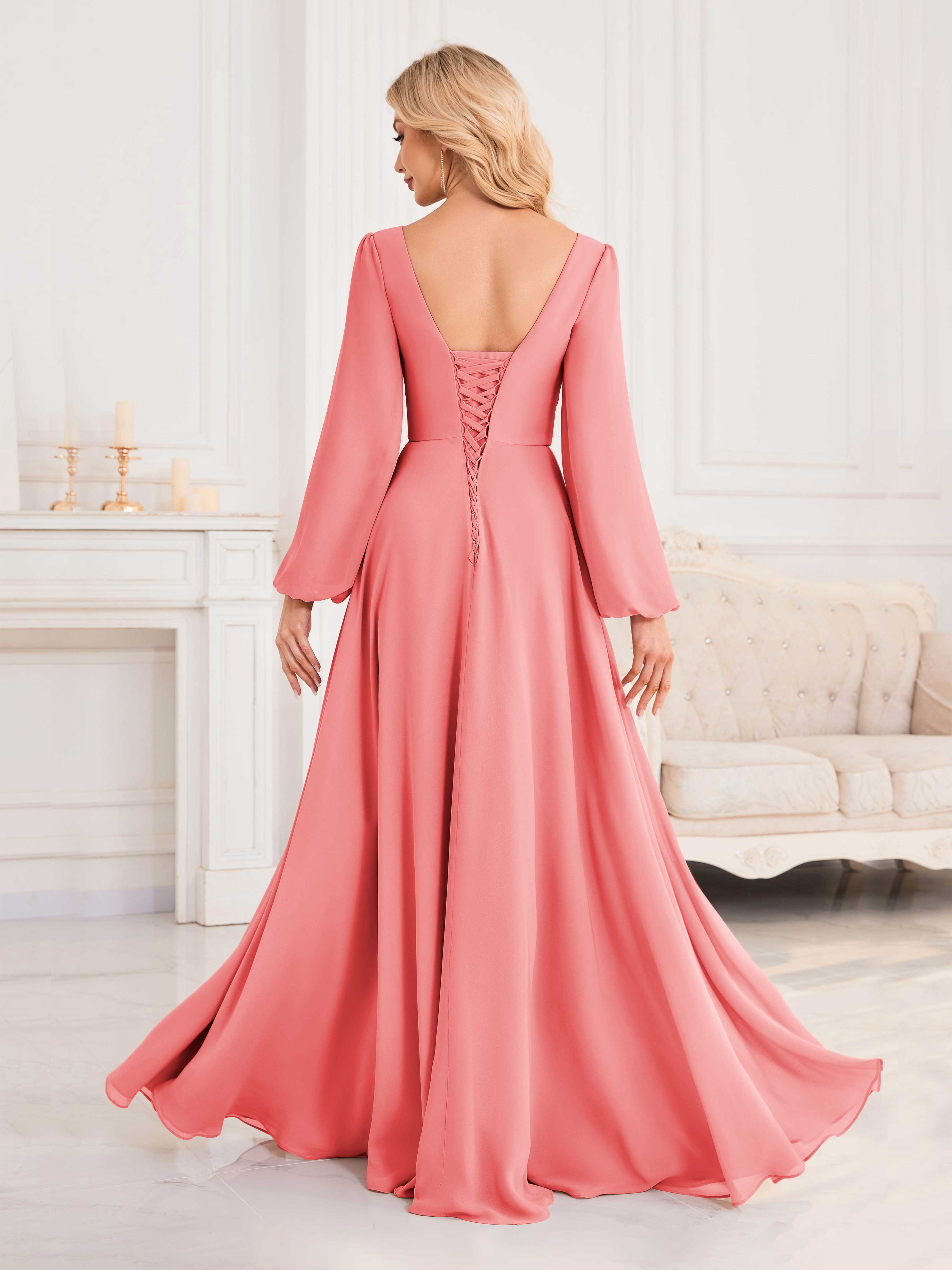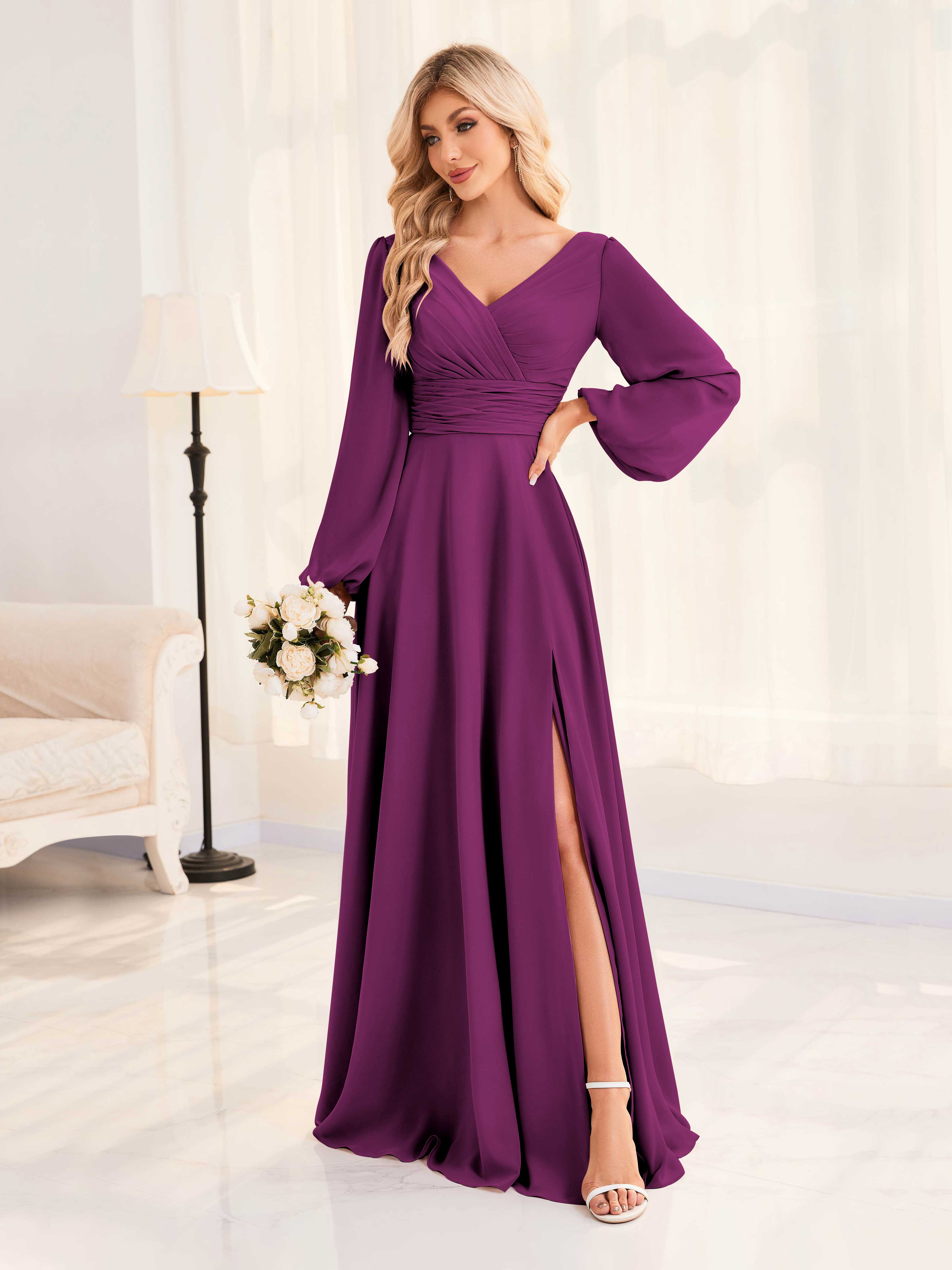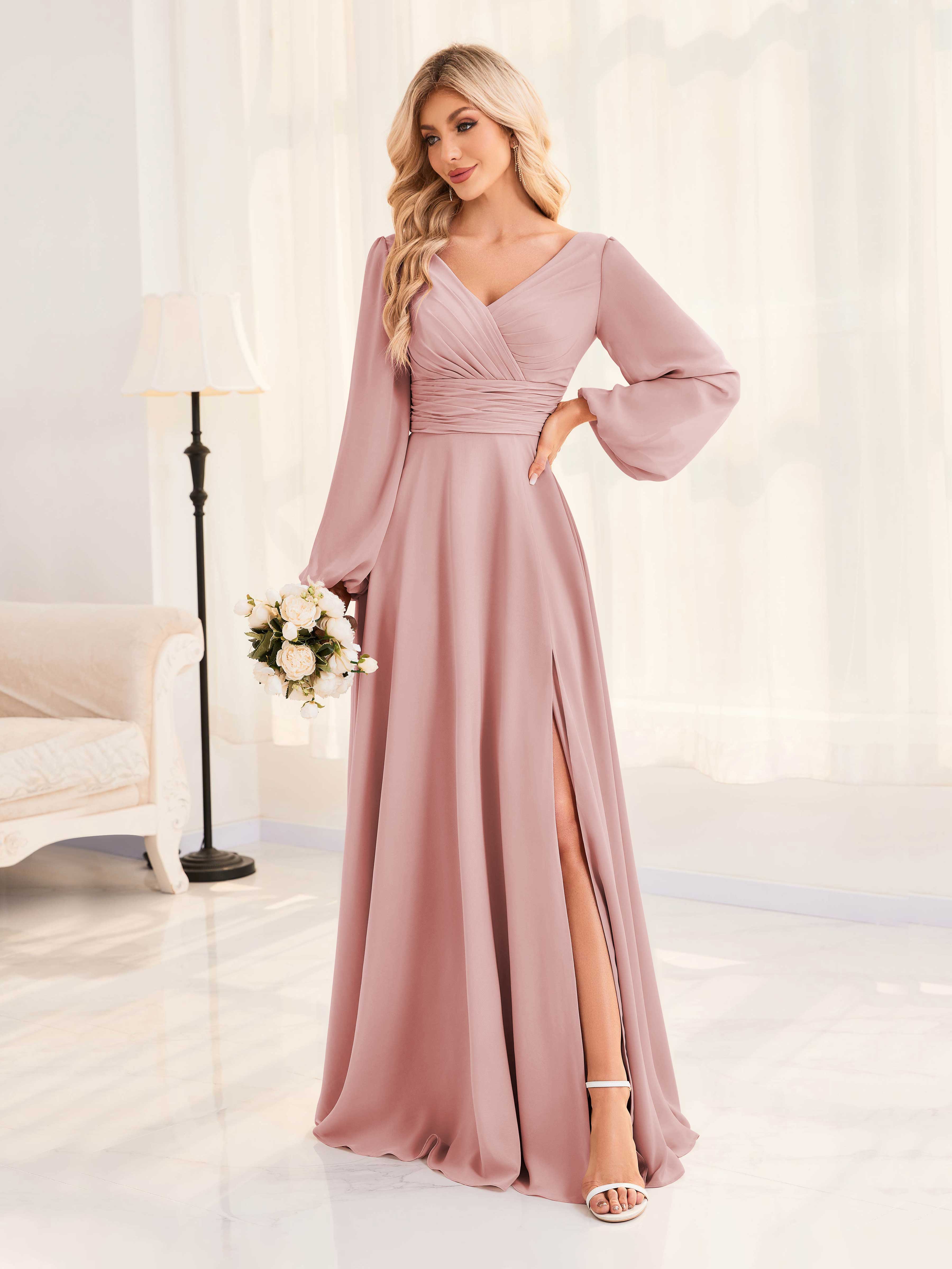Julie Modest V Neck Pleated Slit Long Chiffon Bridesmaid Dresses