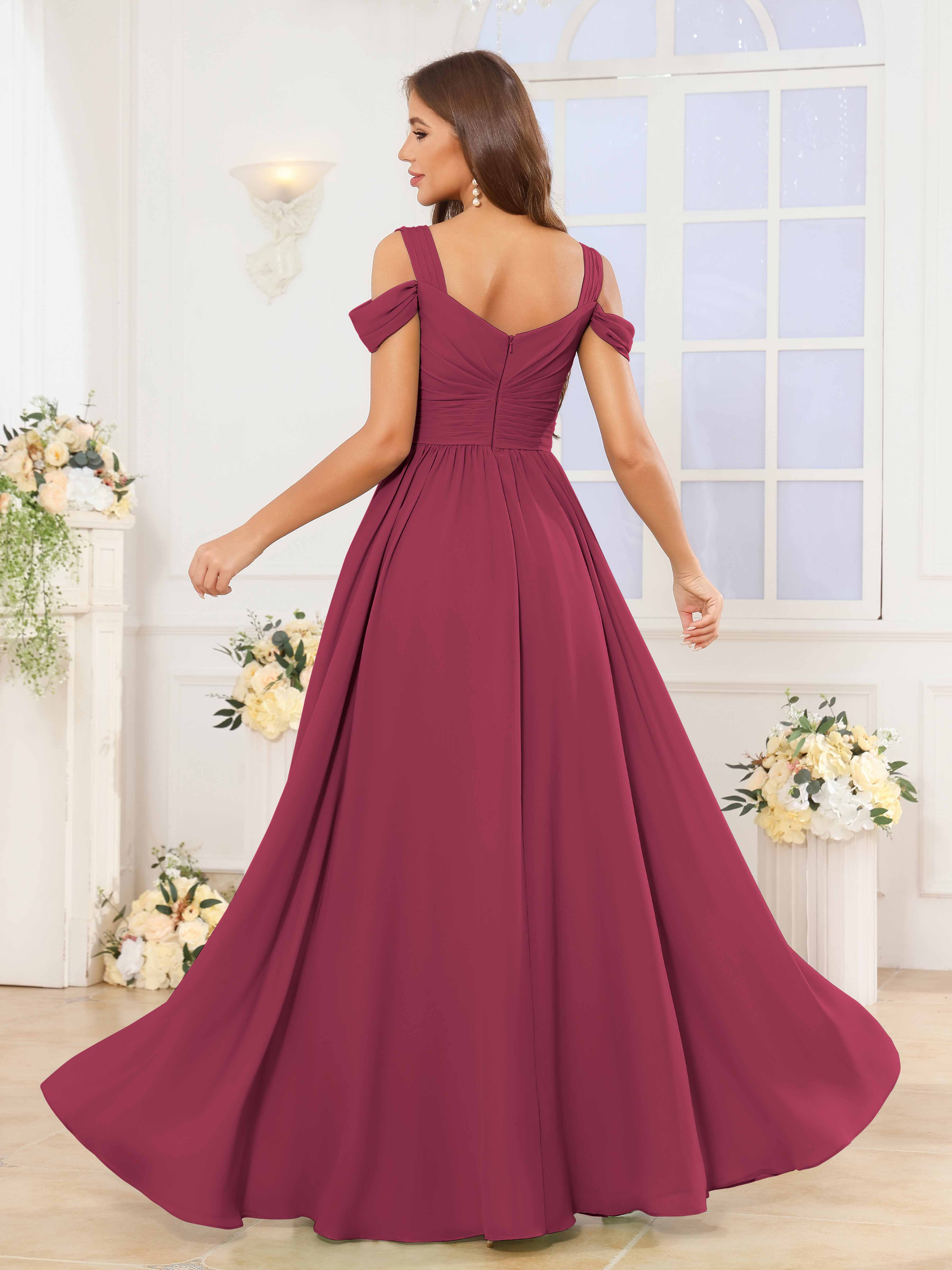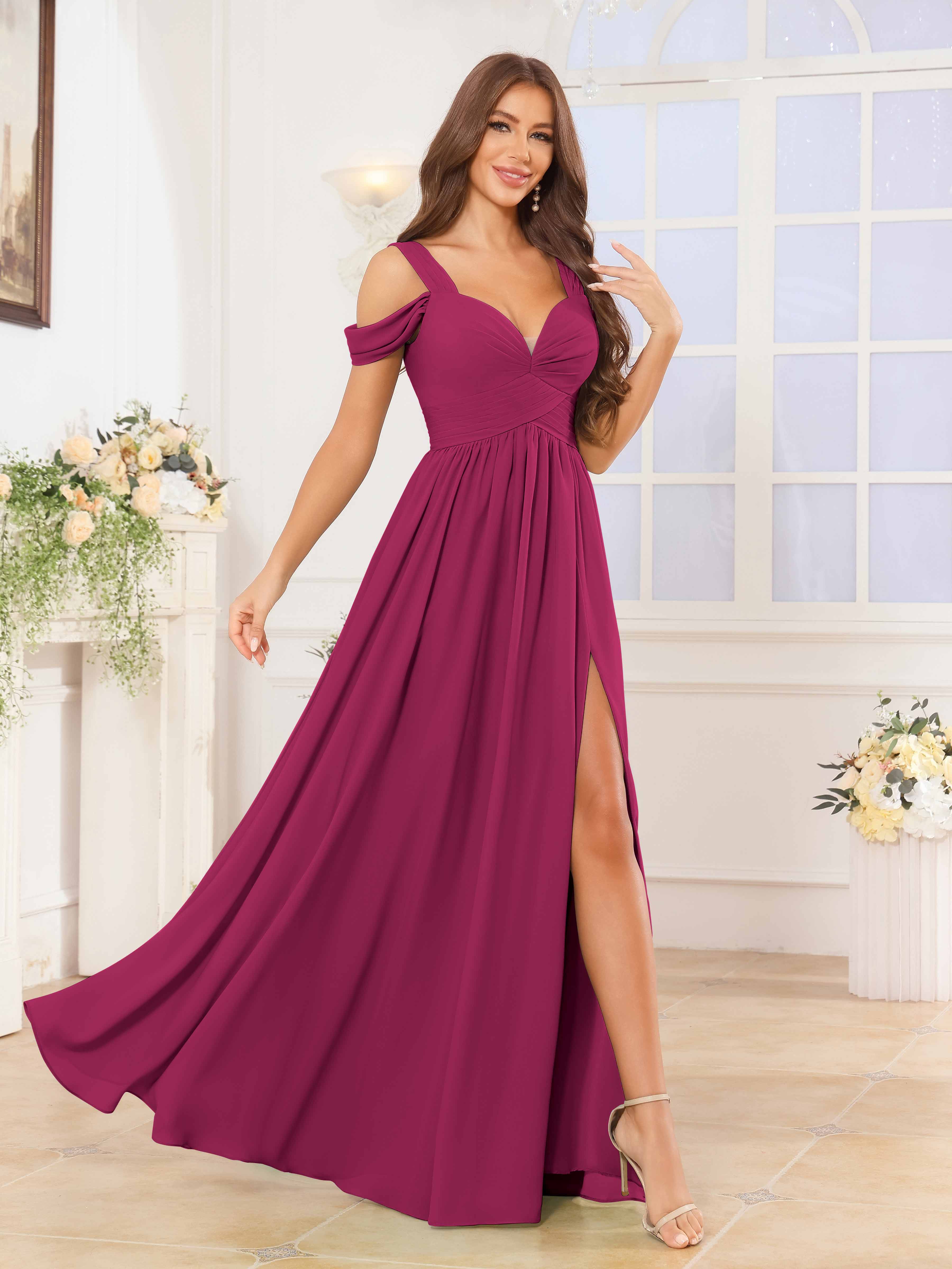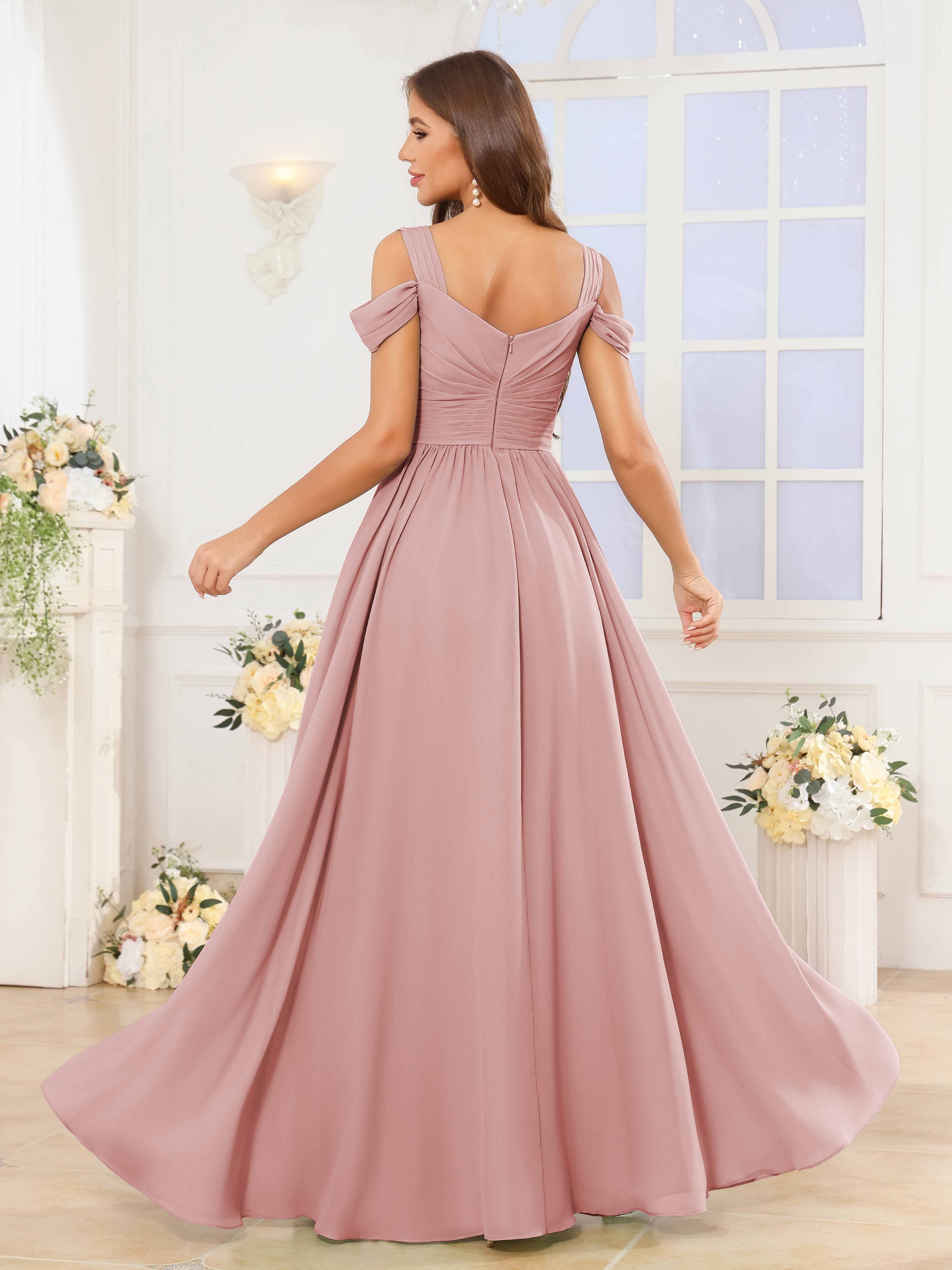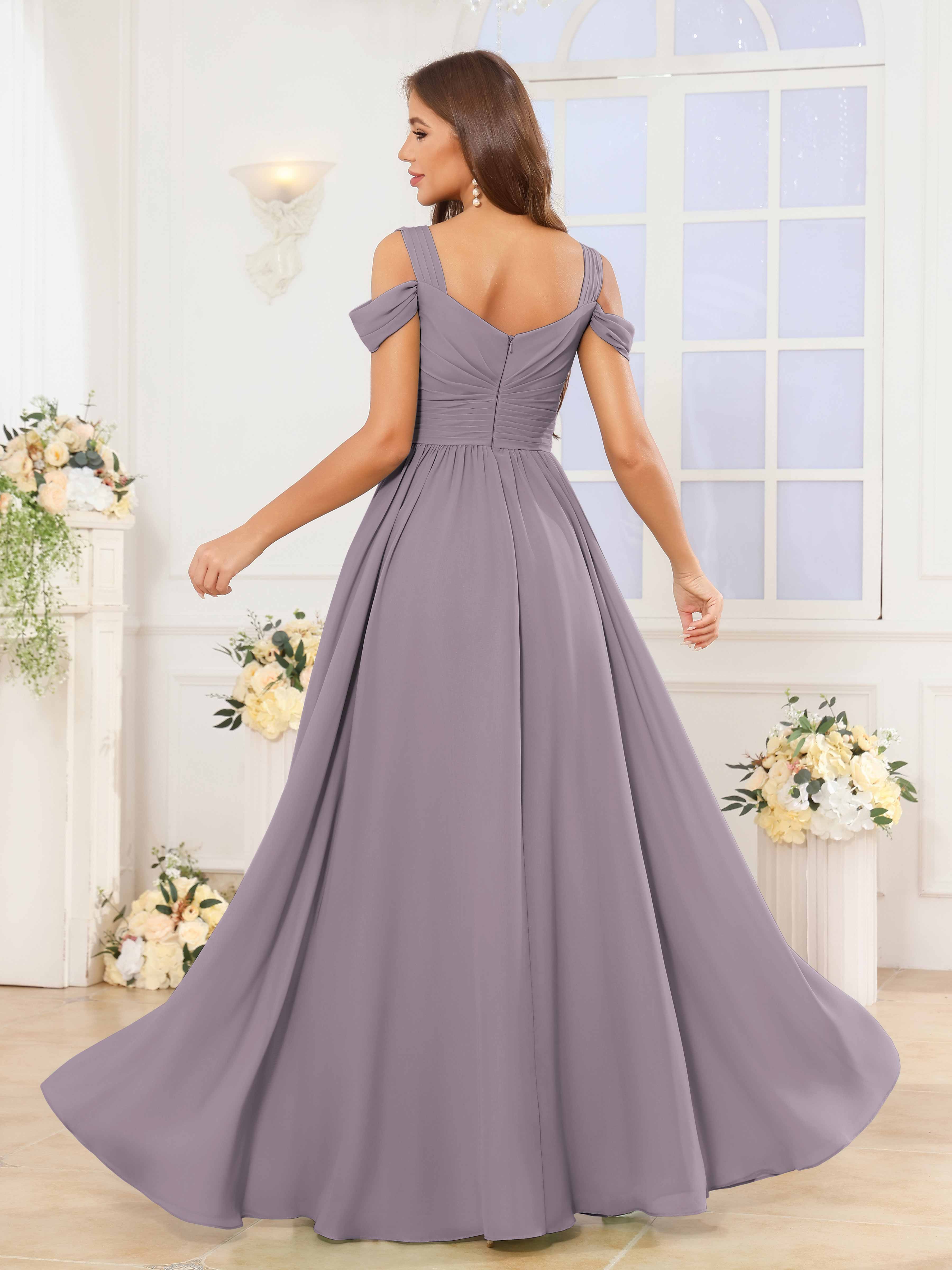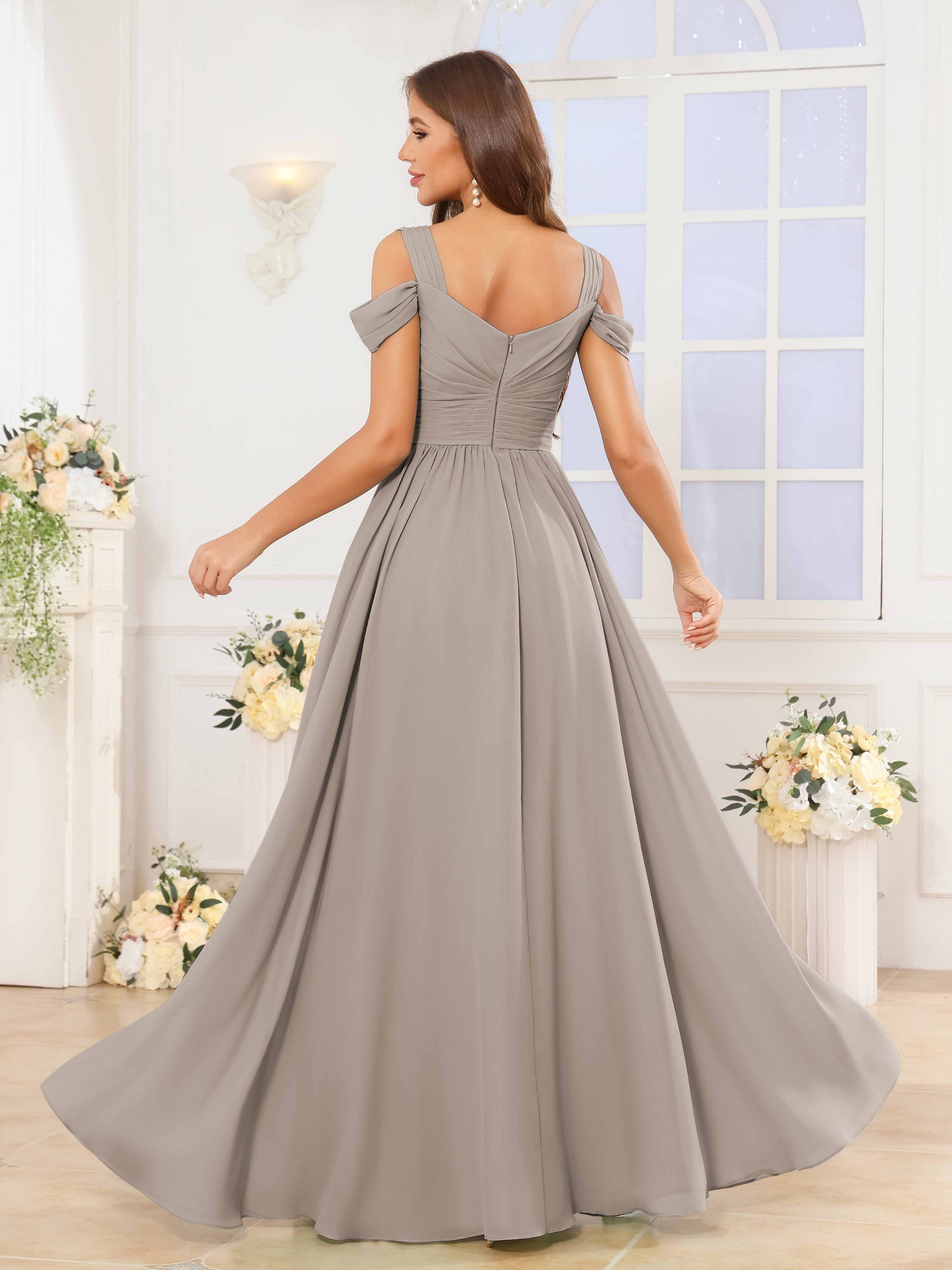 The Katelyn bridesmaid dress features a flowing chiffon fabric that drapes elegantly to the floor, creating a graceful silhouette. Its V-neckline and ruched detailing enhance the figure, while the slit adds a subtle touch of allure and ease of movement. Designed for comfort and style, this dress is an expert choice for sophisticated wedding parties seeking timeless elegance.
