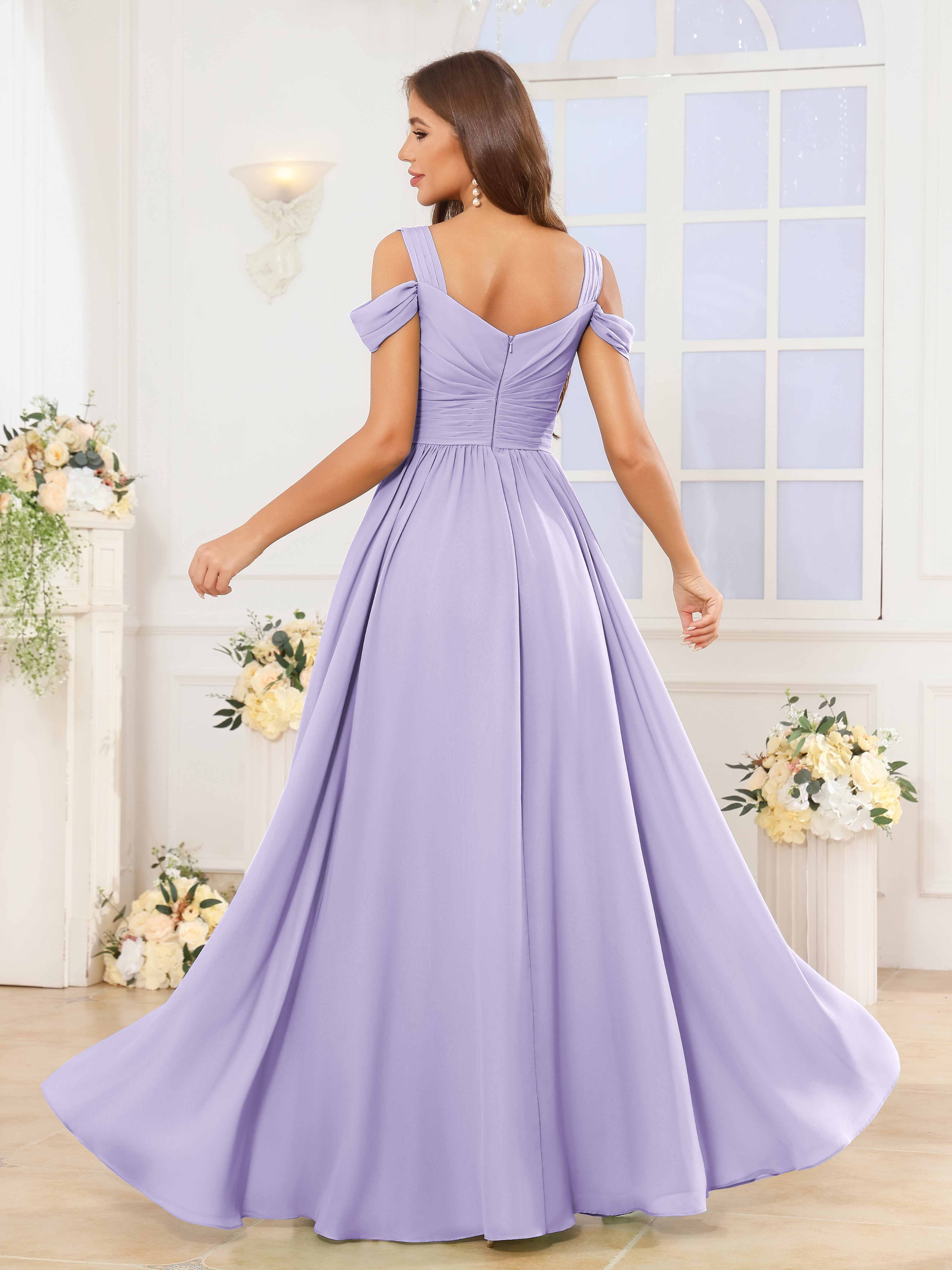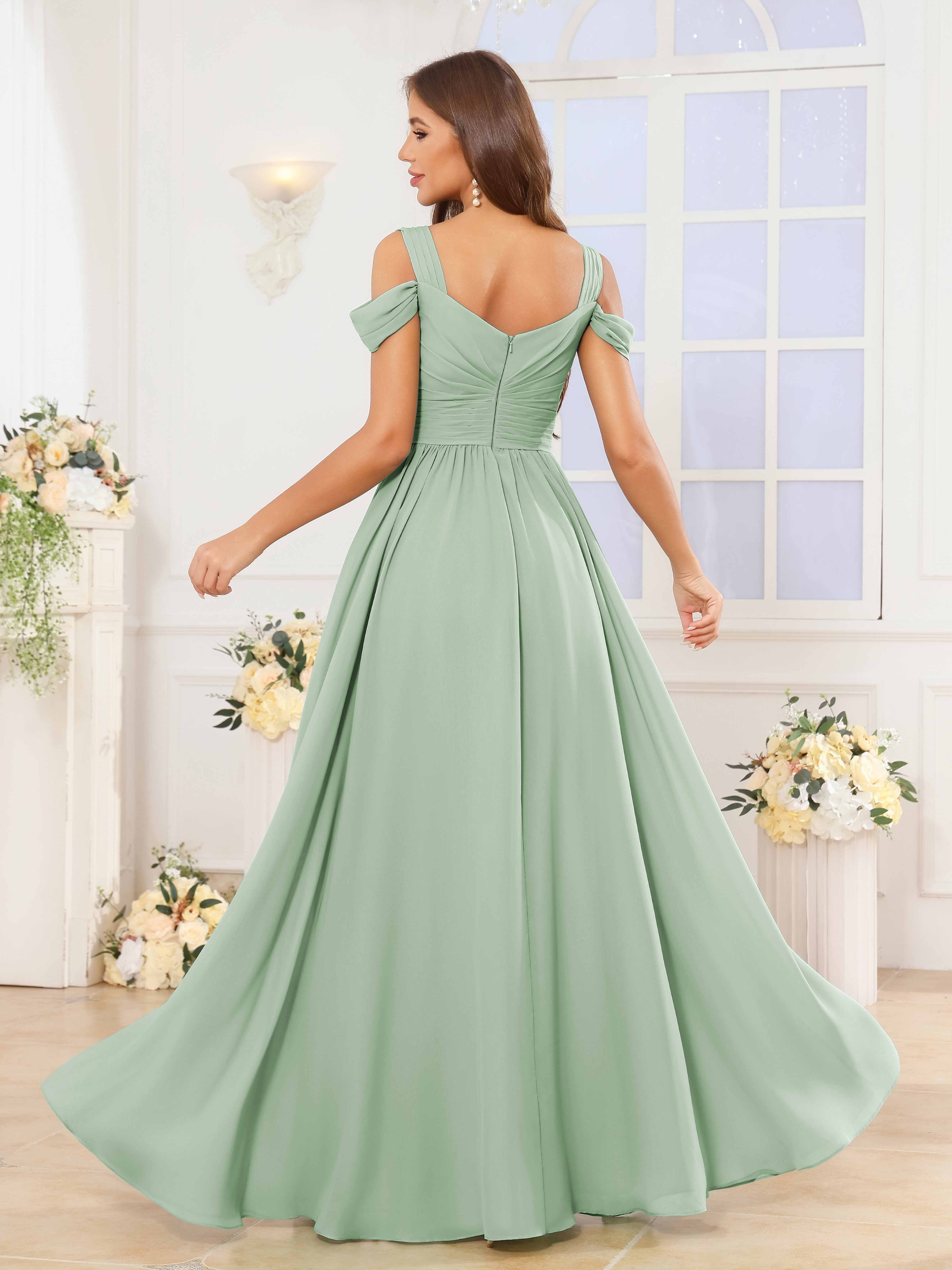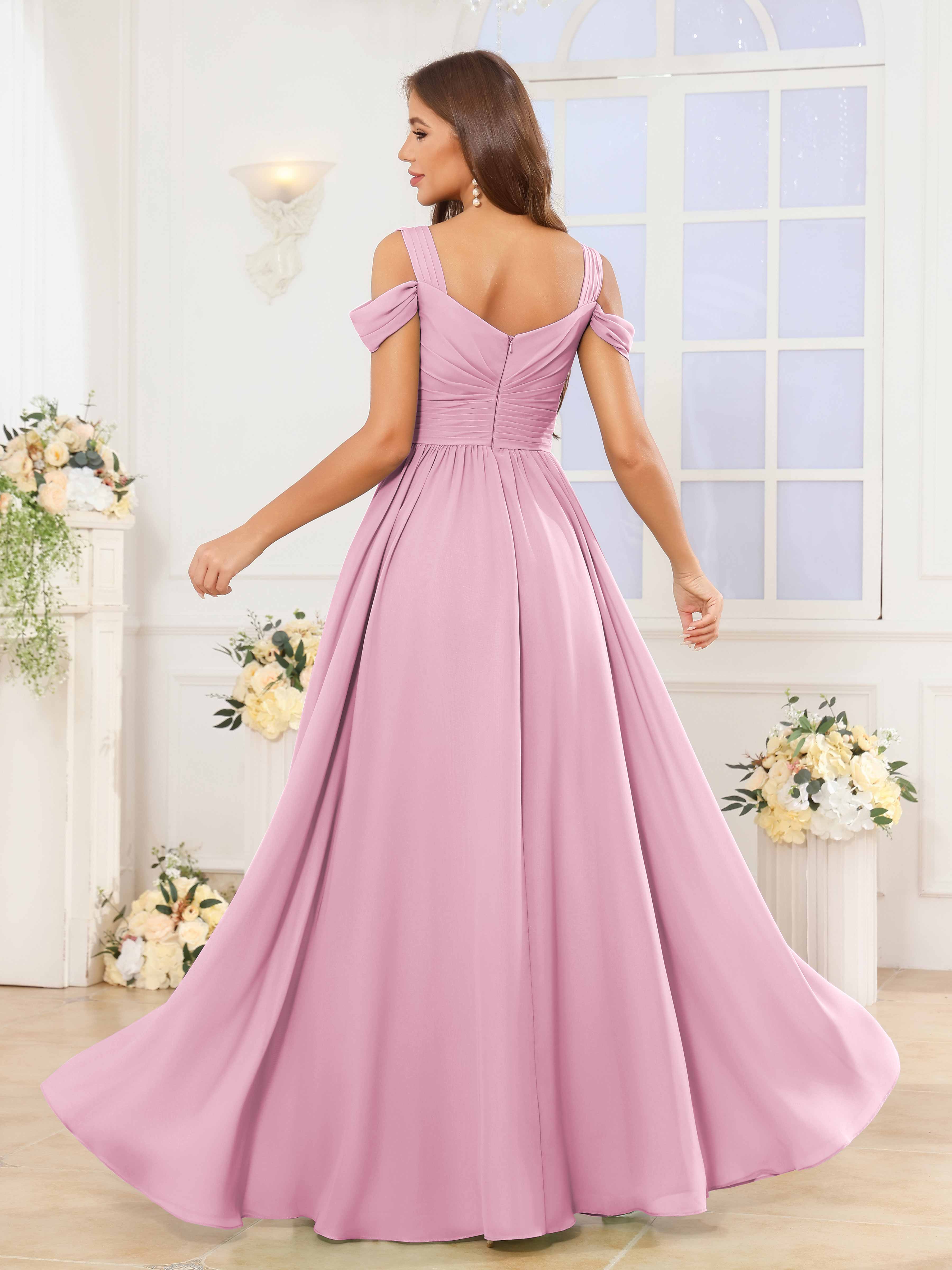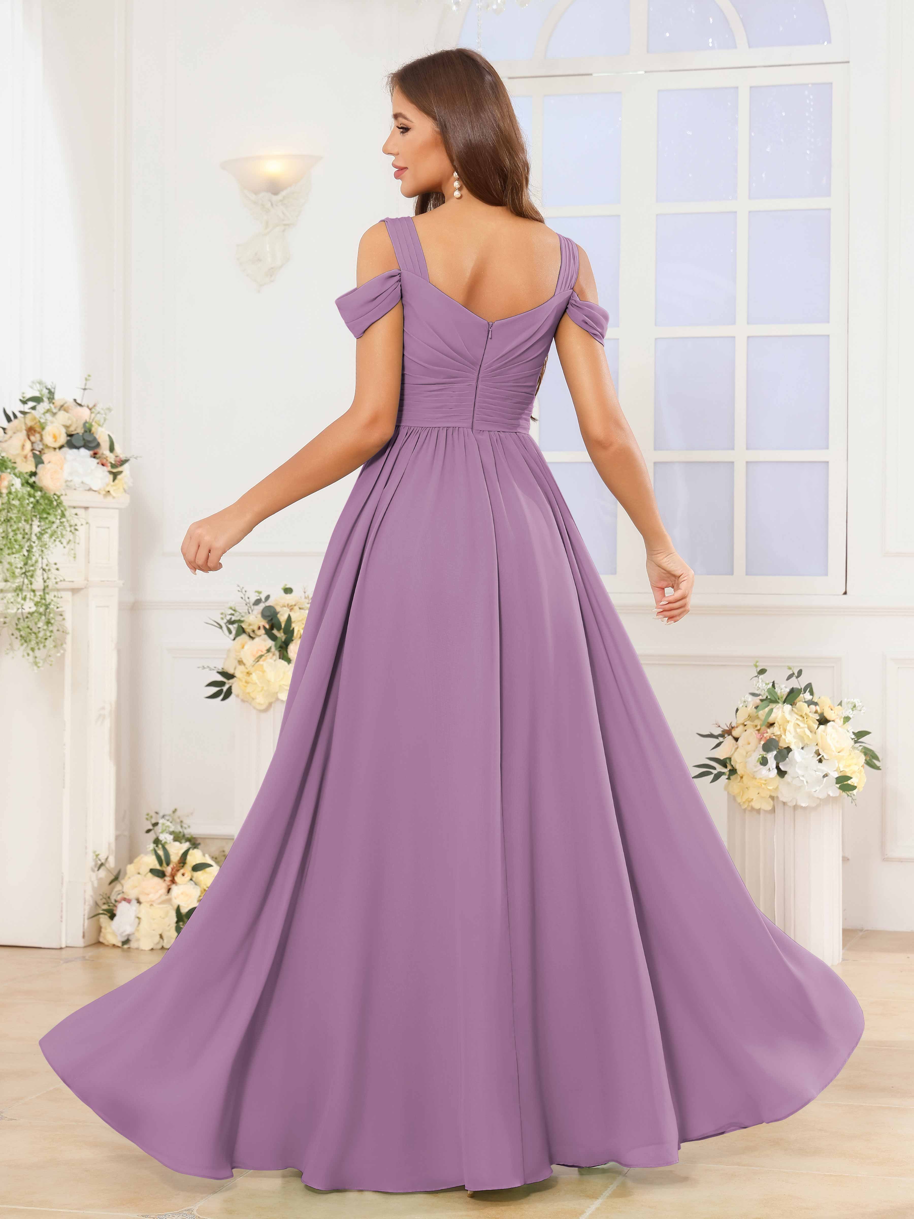 The Katelyn bridesmaid dress features a flowing chiffon fabric that drapes elegantly to the floor, creating a graceful silhouette. Its V-neckline and ruched detailing enhance the figure, while the slit adds a subtle touch of allure and ease of movement. Designed for comfort and style, this dress is an expert choice for sophisticated wedding parties seeking timeless elegance.