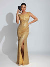 Laelith Sparkling Cowl Ruched Slit Long Sequins Prom Dresses