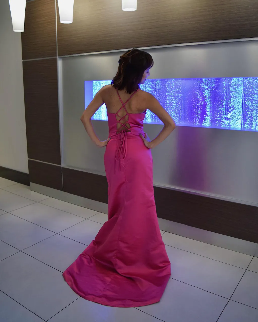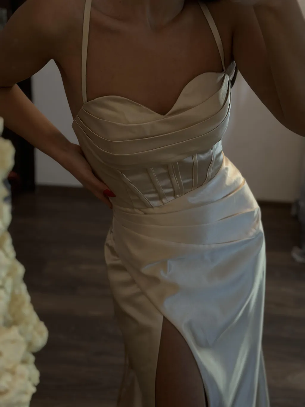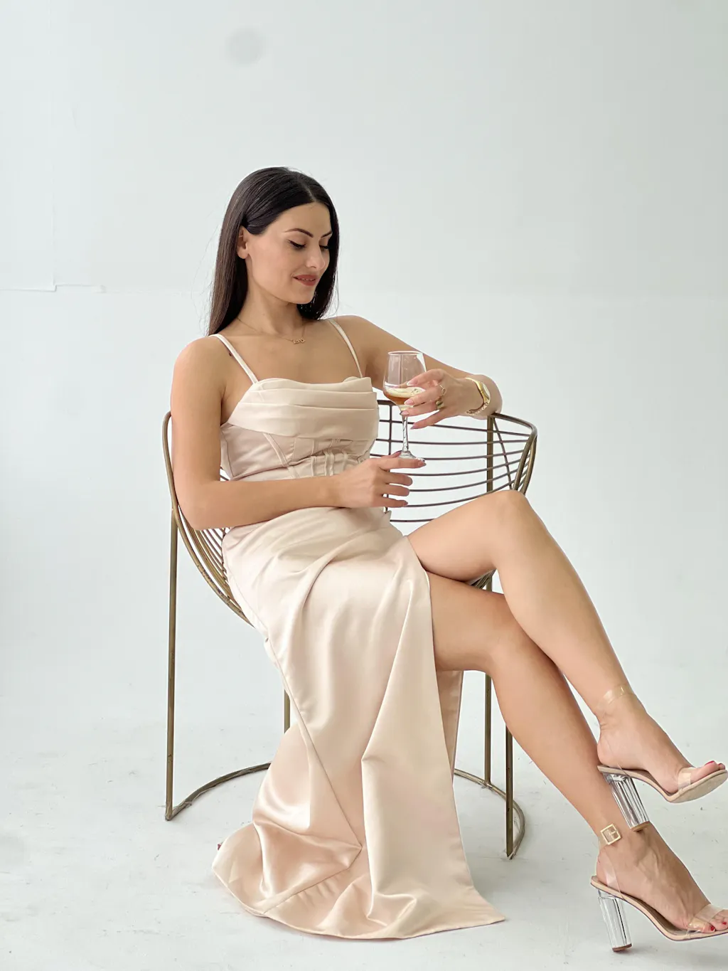 Madison Stylish Pleated Cowl Fishbone Slit Satin Dresses