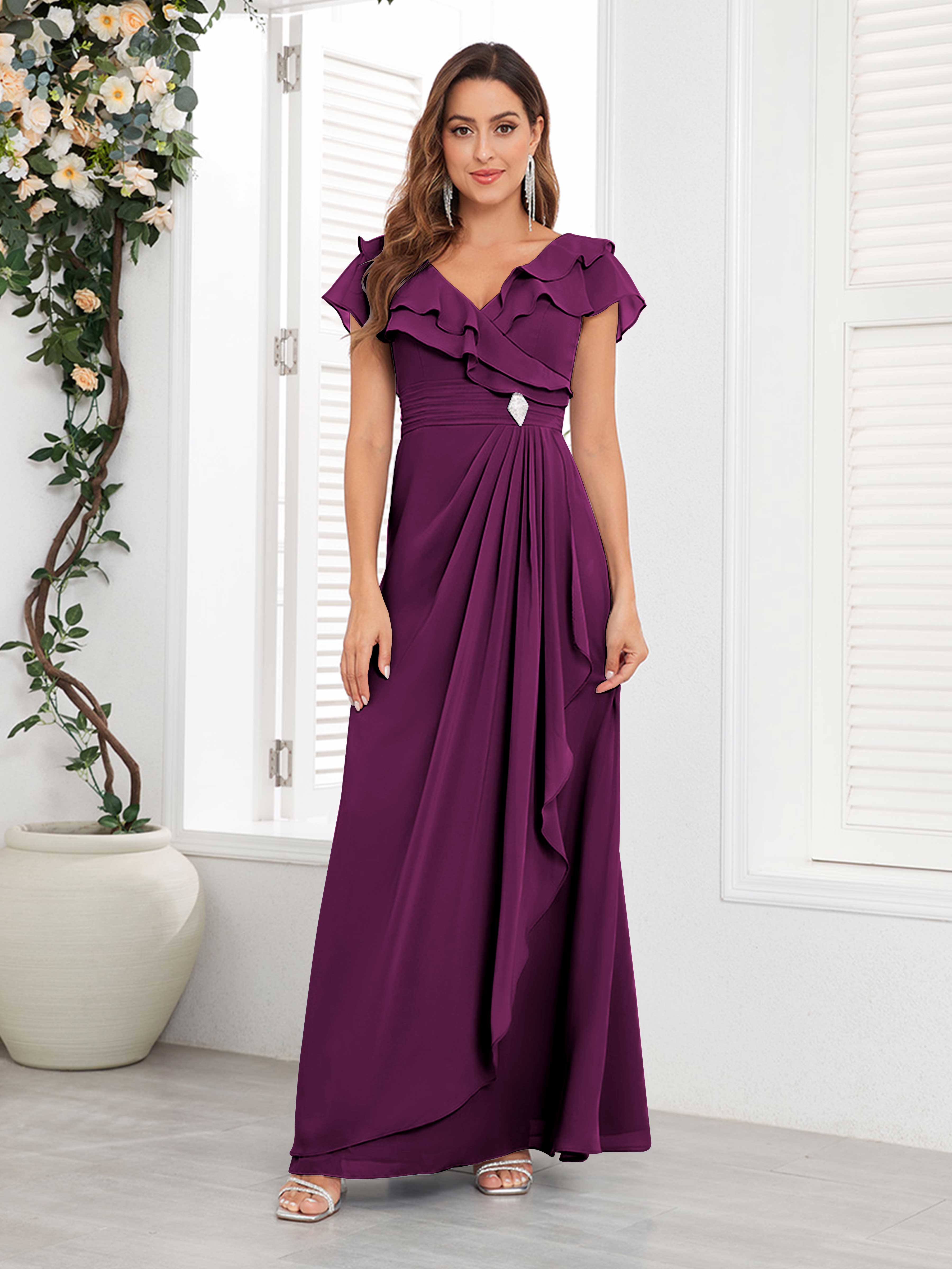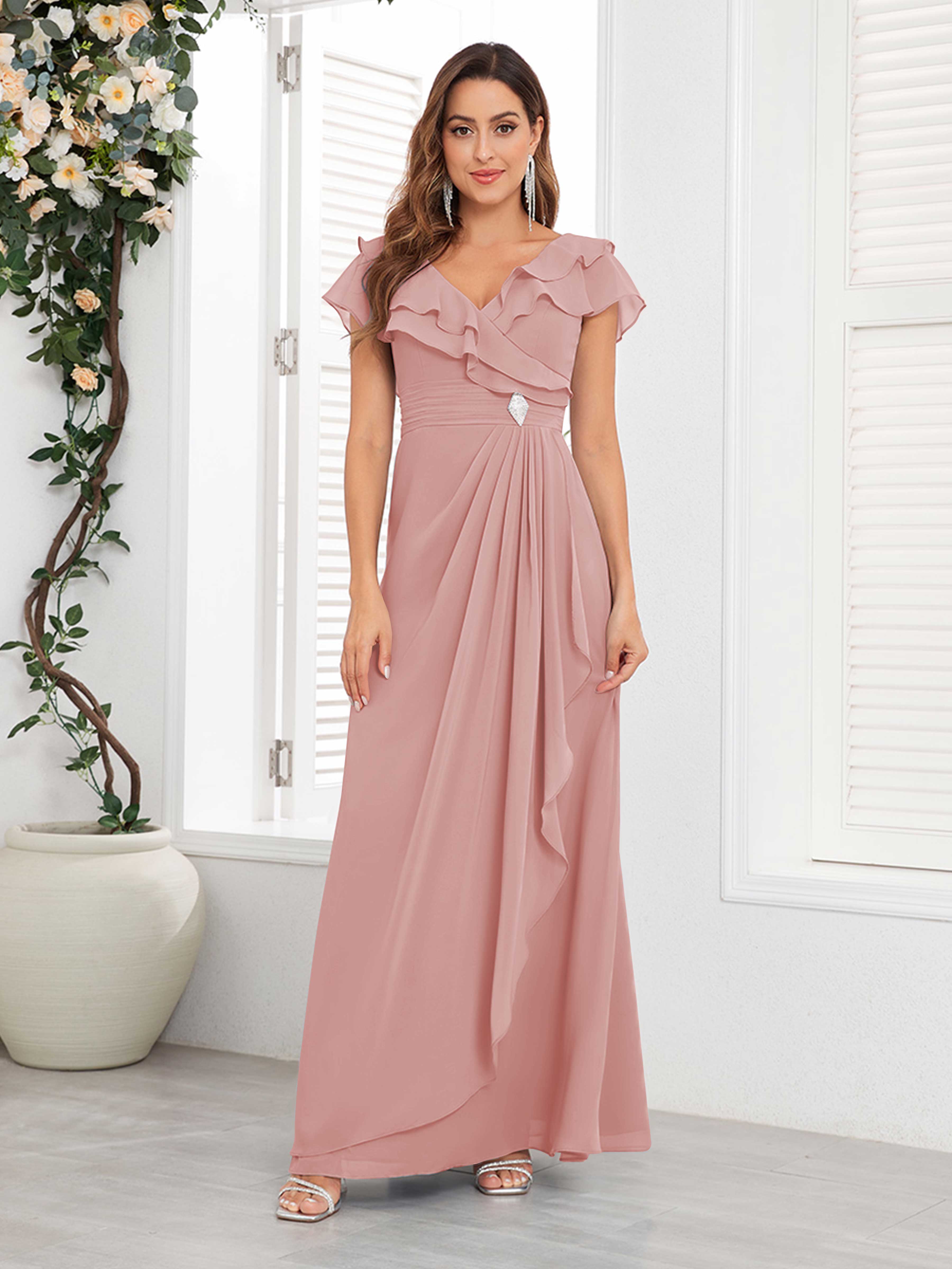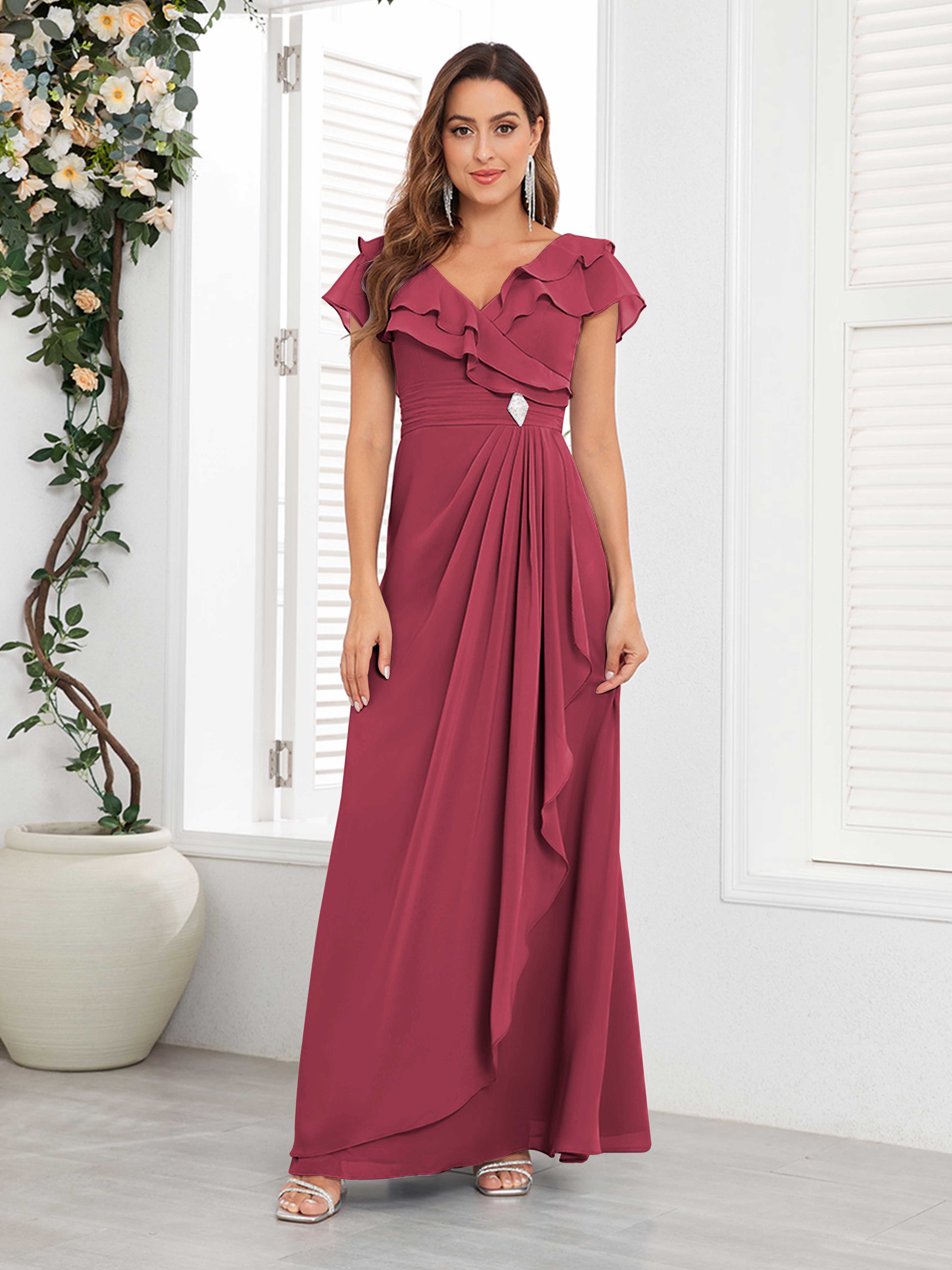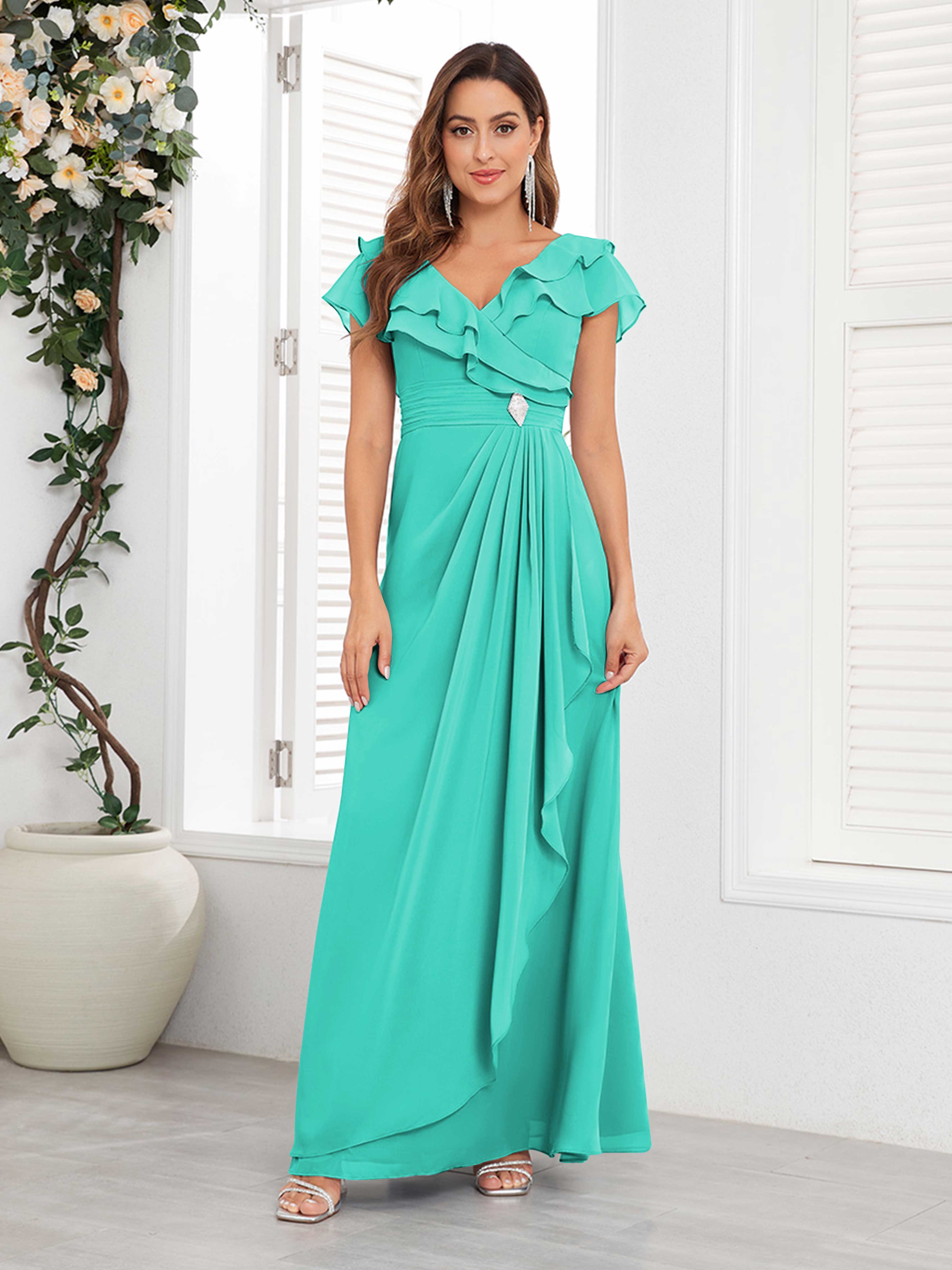 Meadow Trendy V Neck Ruffles Beaded Long Chiffon Mother Of The Bride Dresses