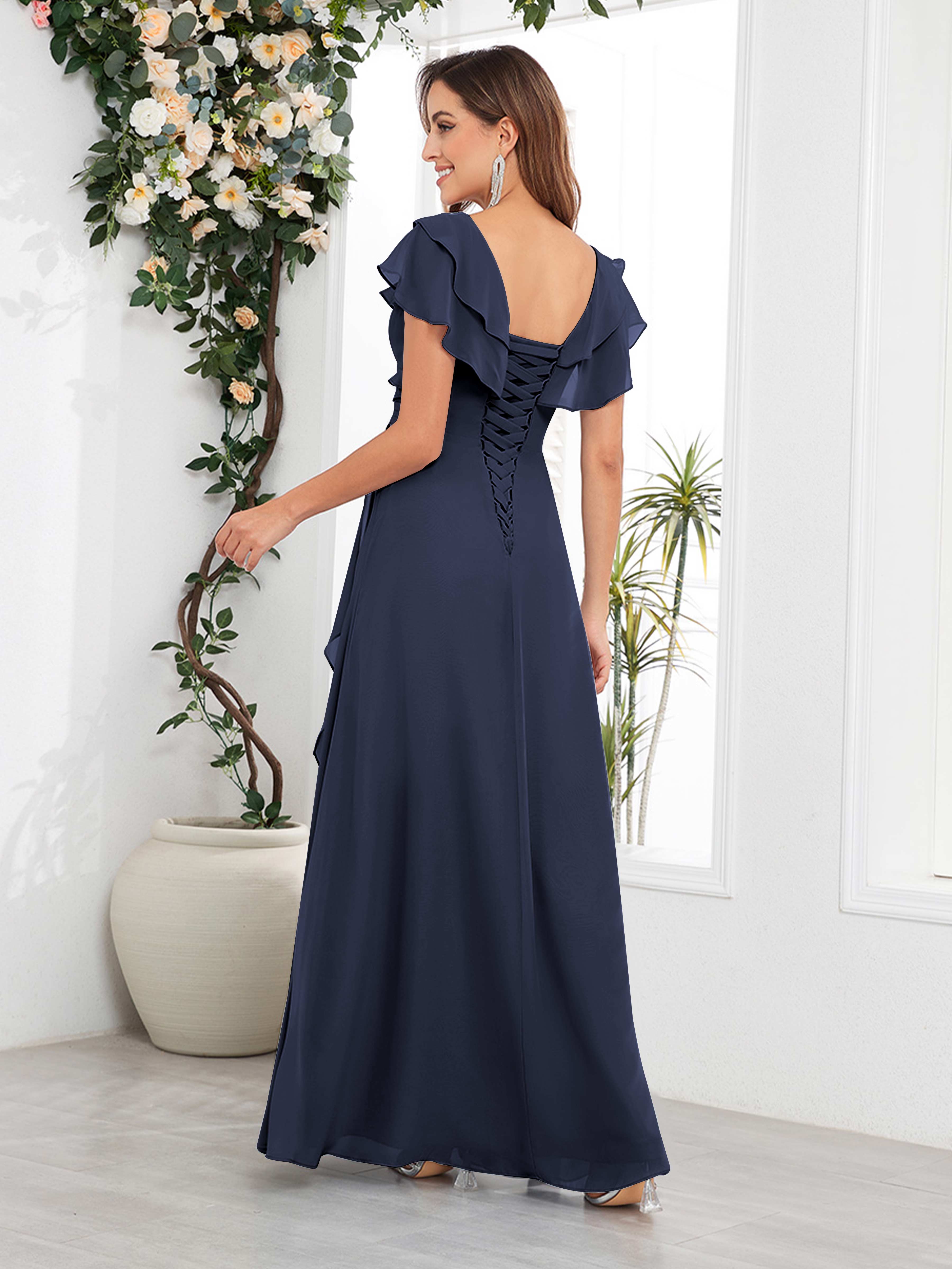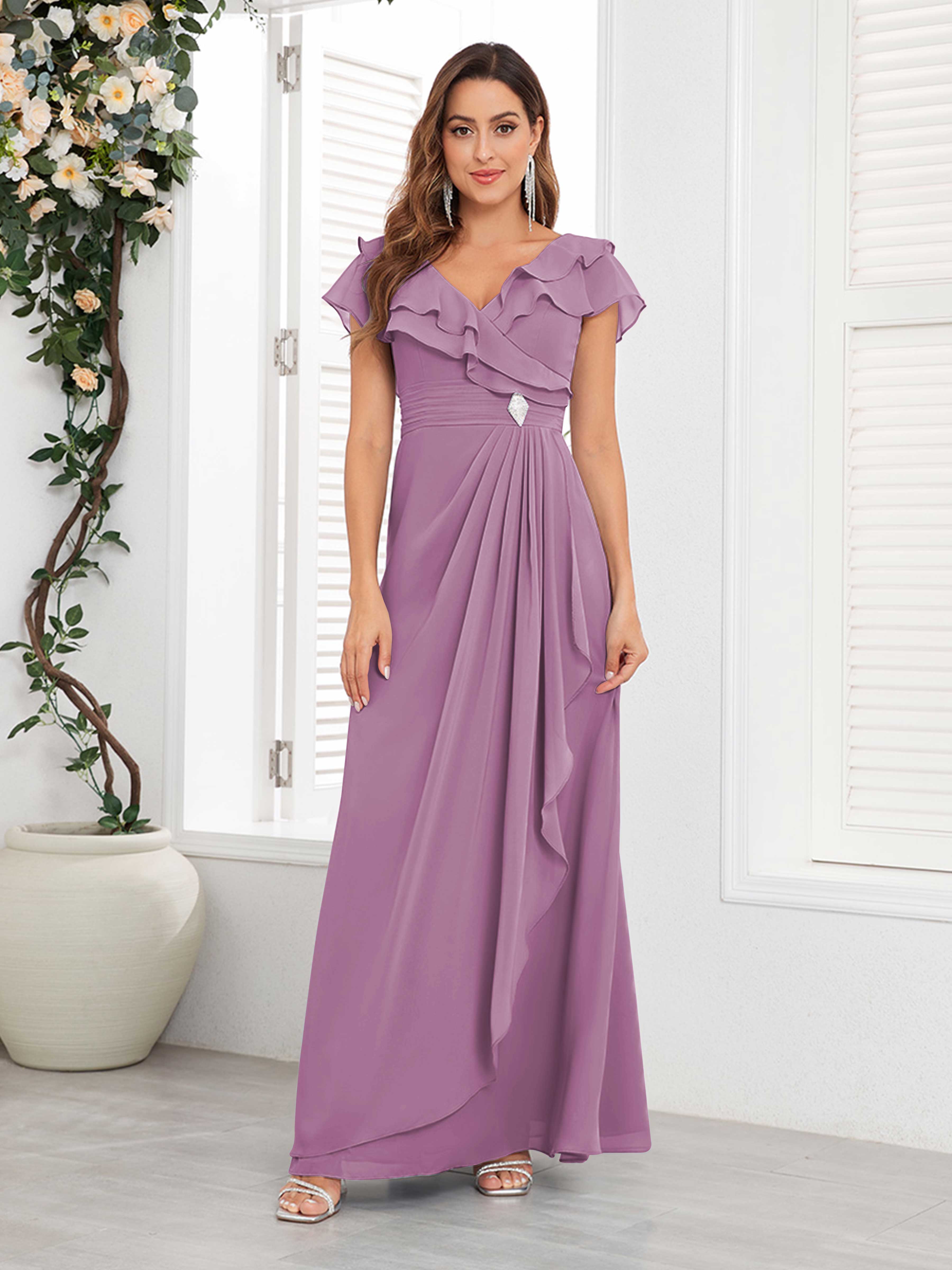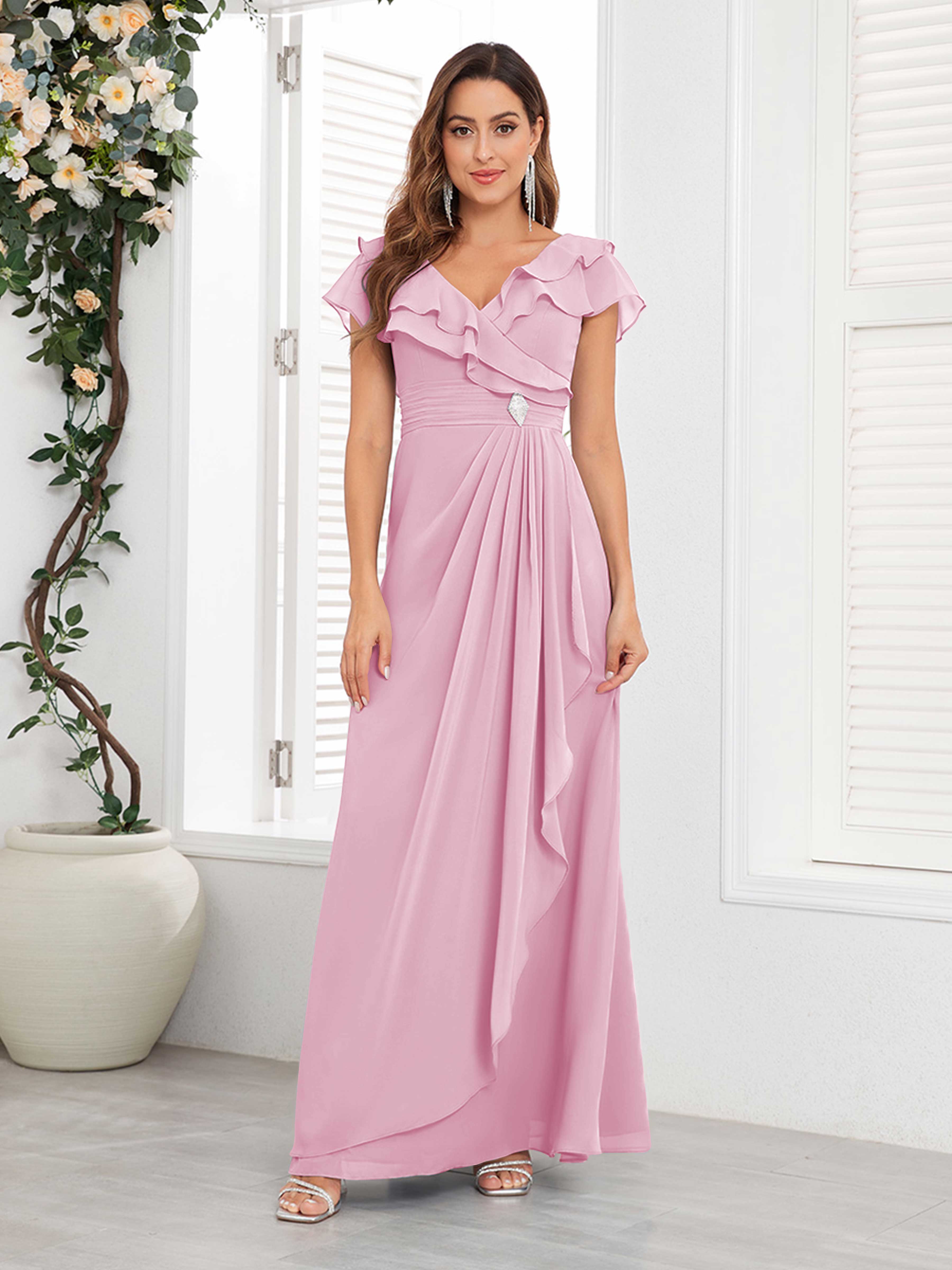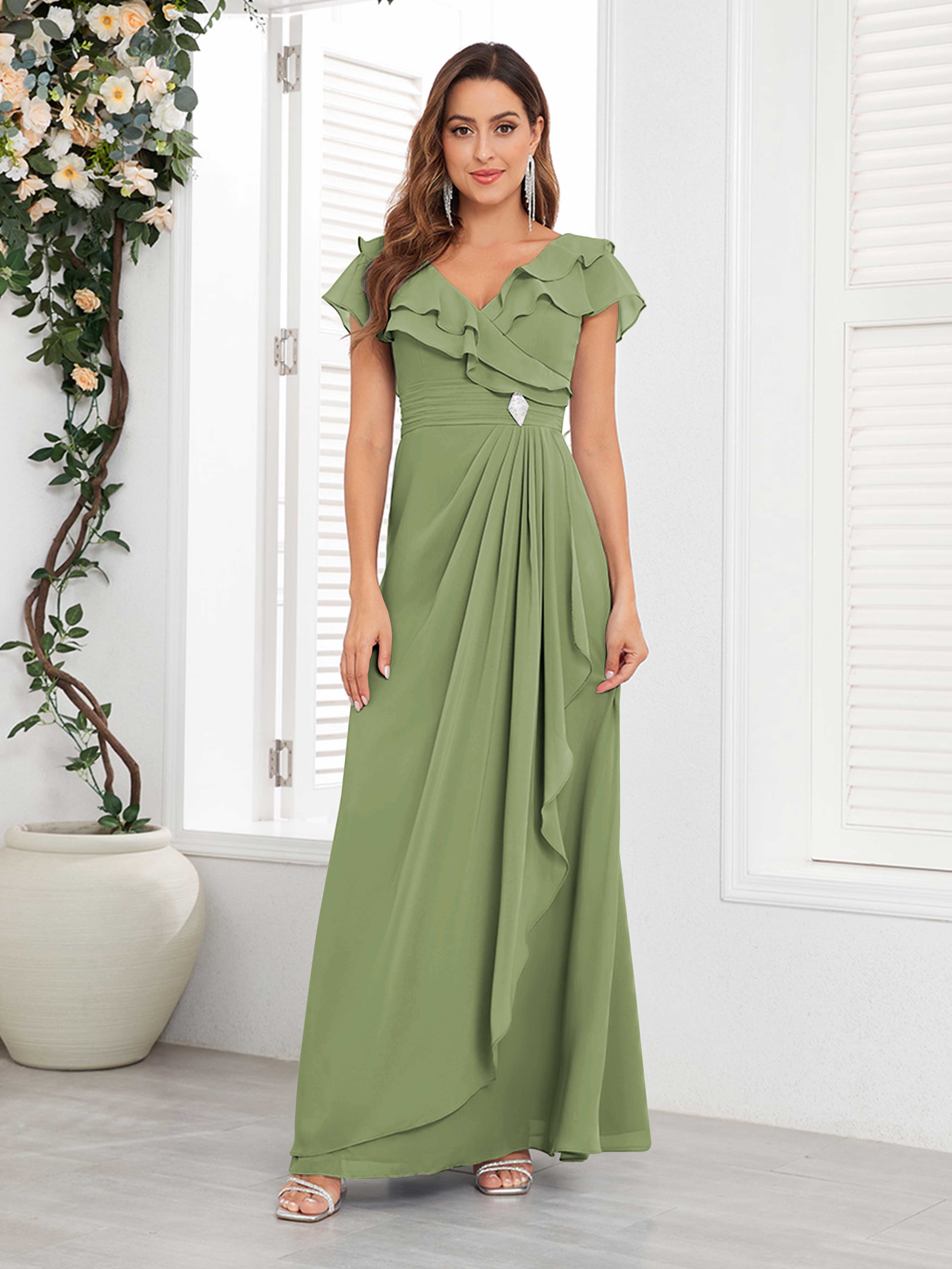 Meadow Trendy V Neck Ruffles Beaded Long Chiffon Mother Of The Bride Dresses