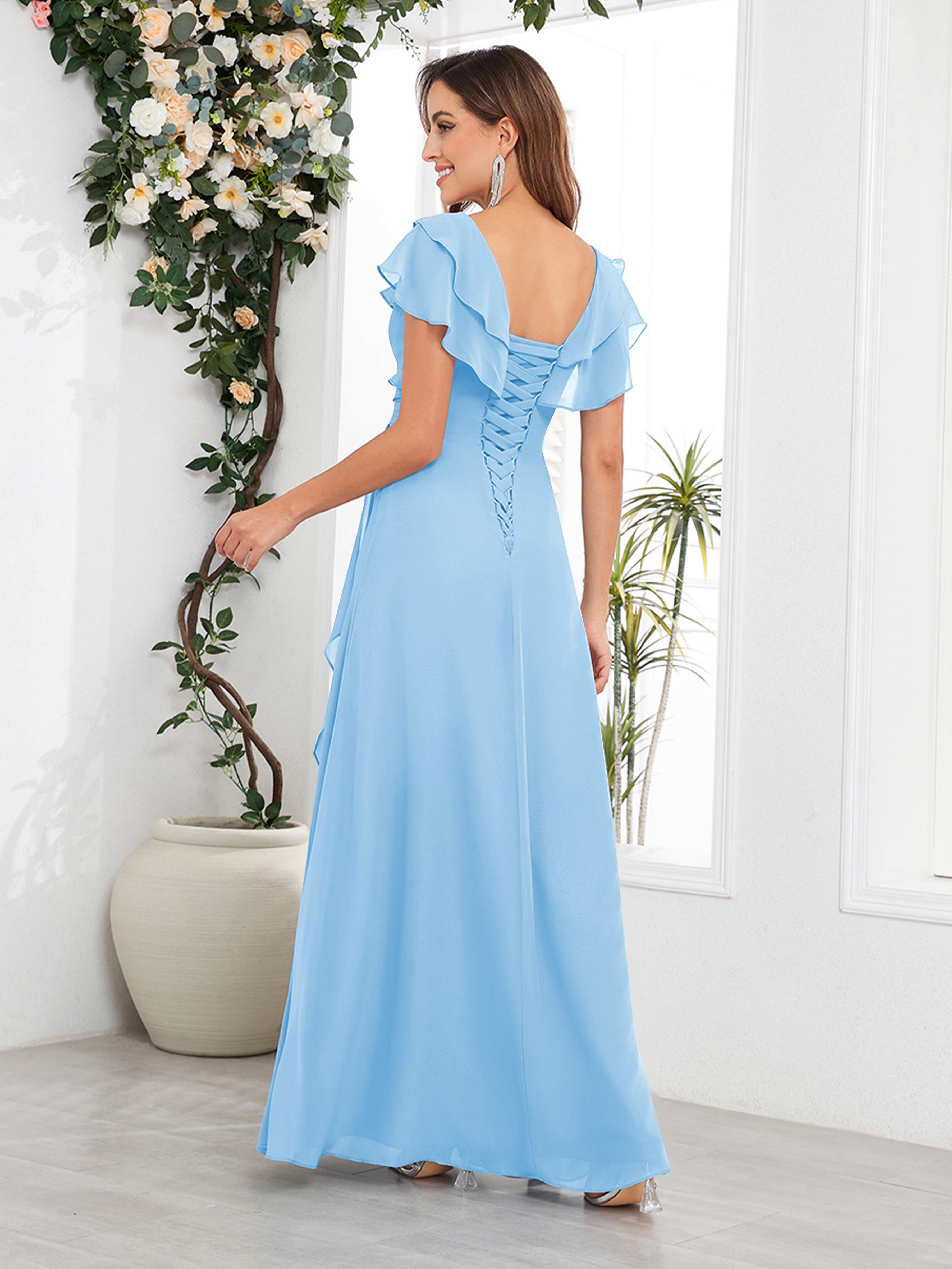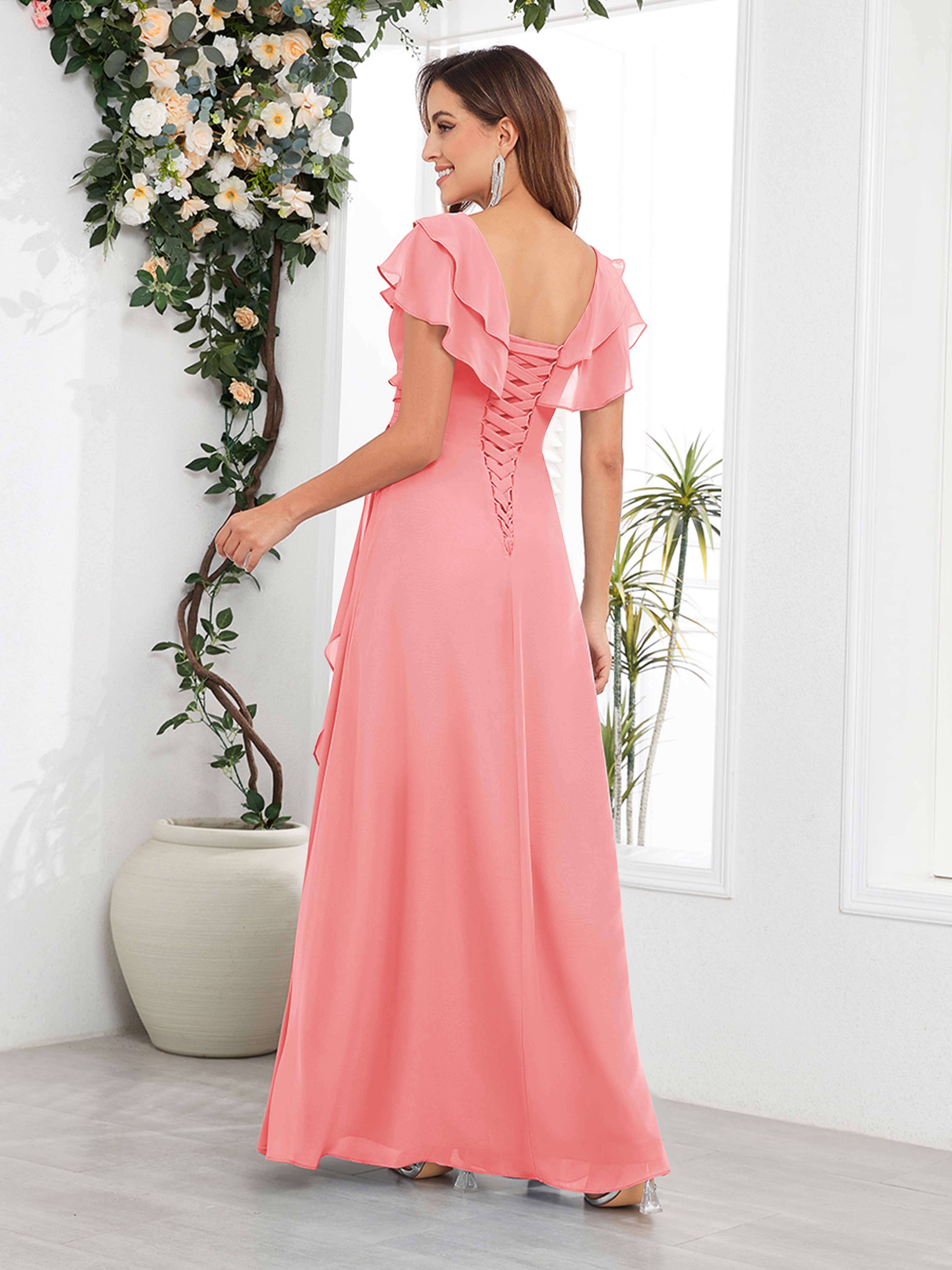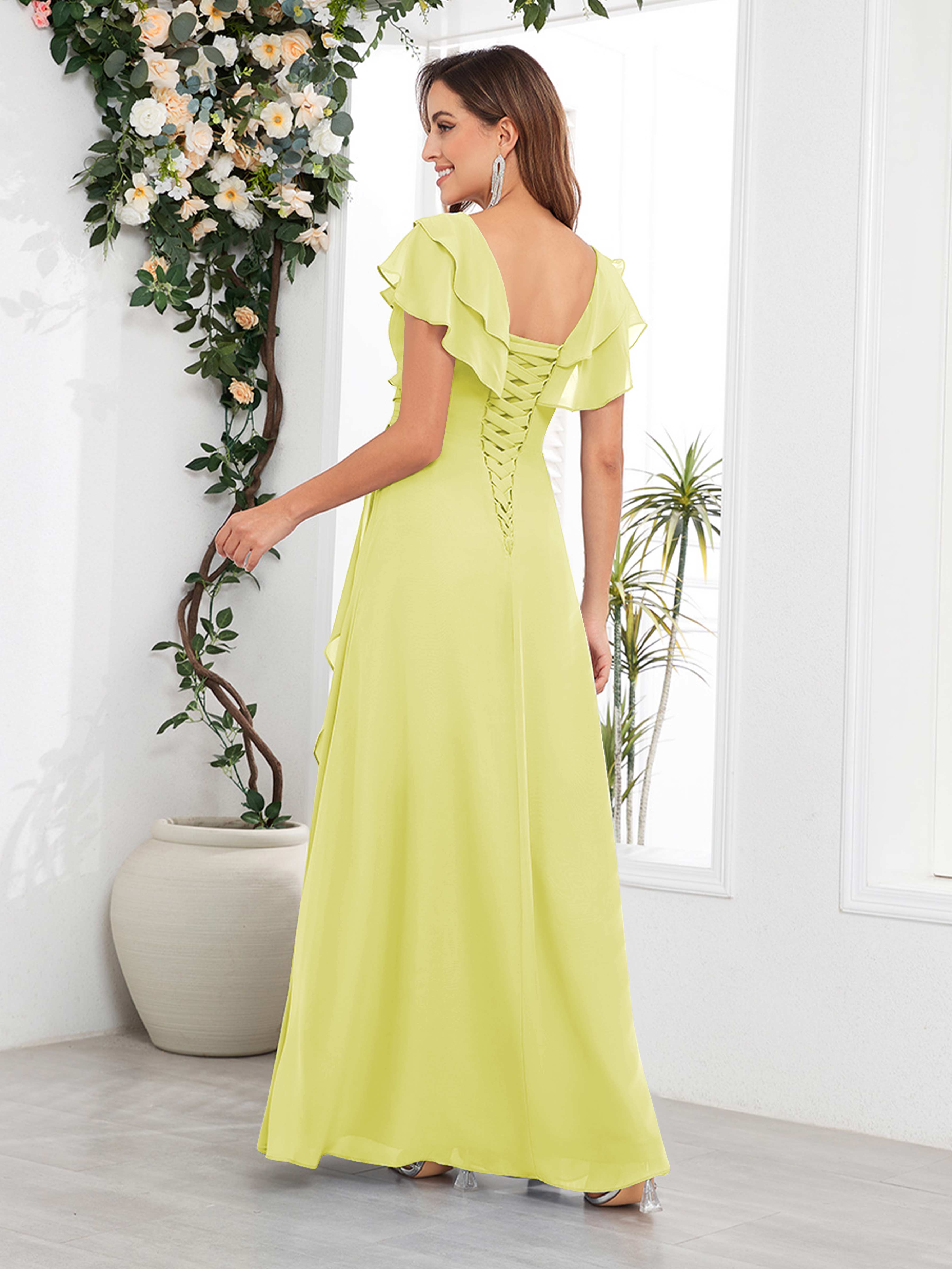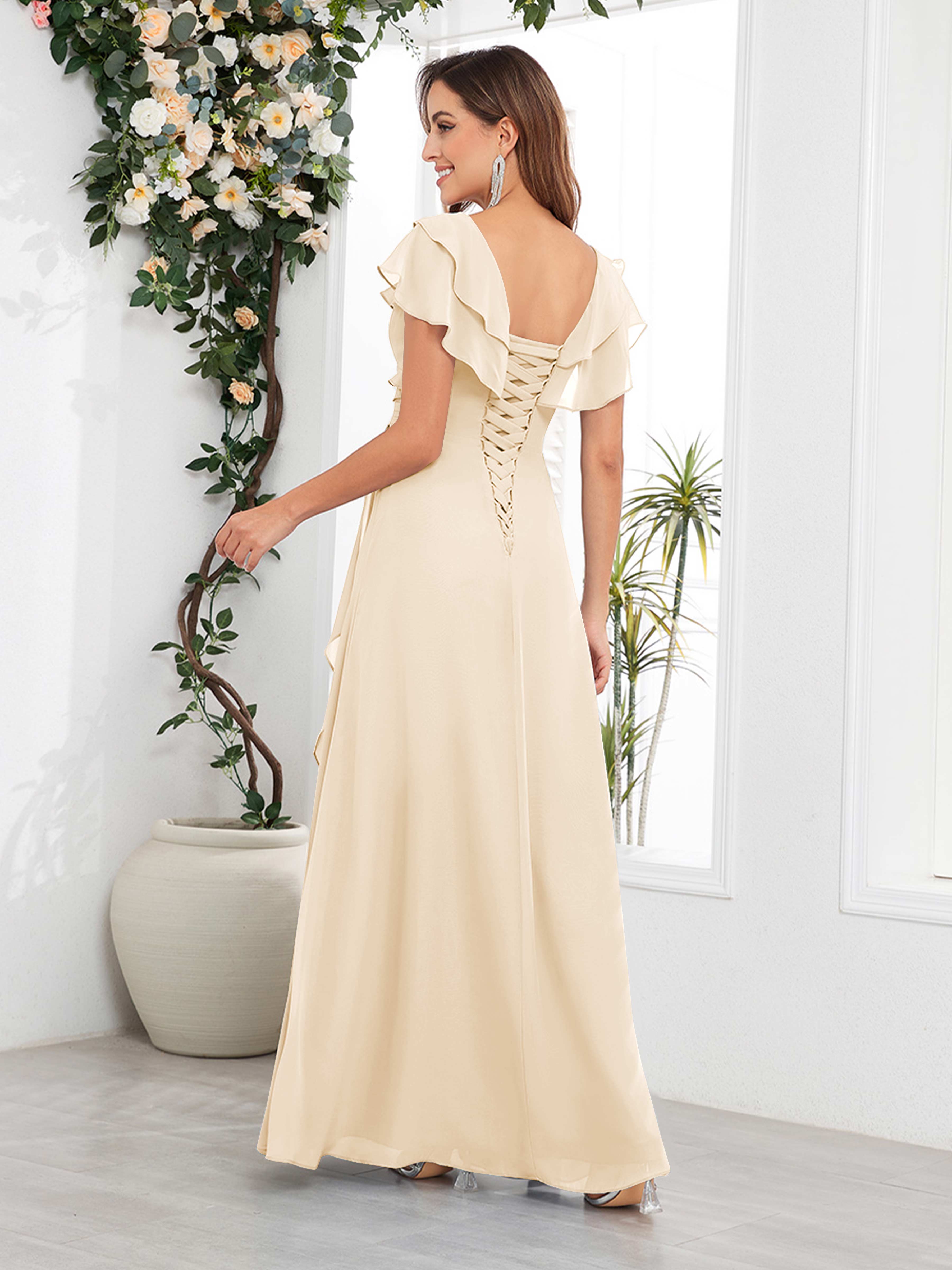 Meadow Trendy V Neck Ruffles Beaded Long Chiffon Mother Of The Bride Dresses