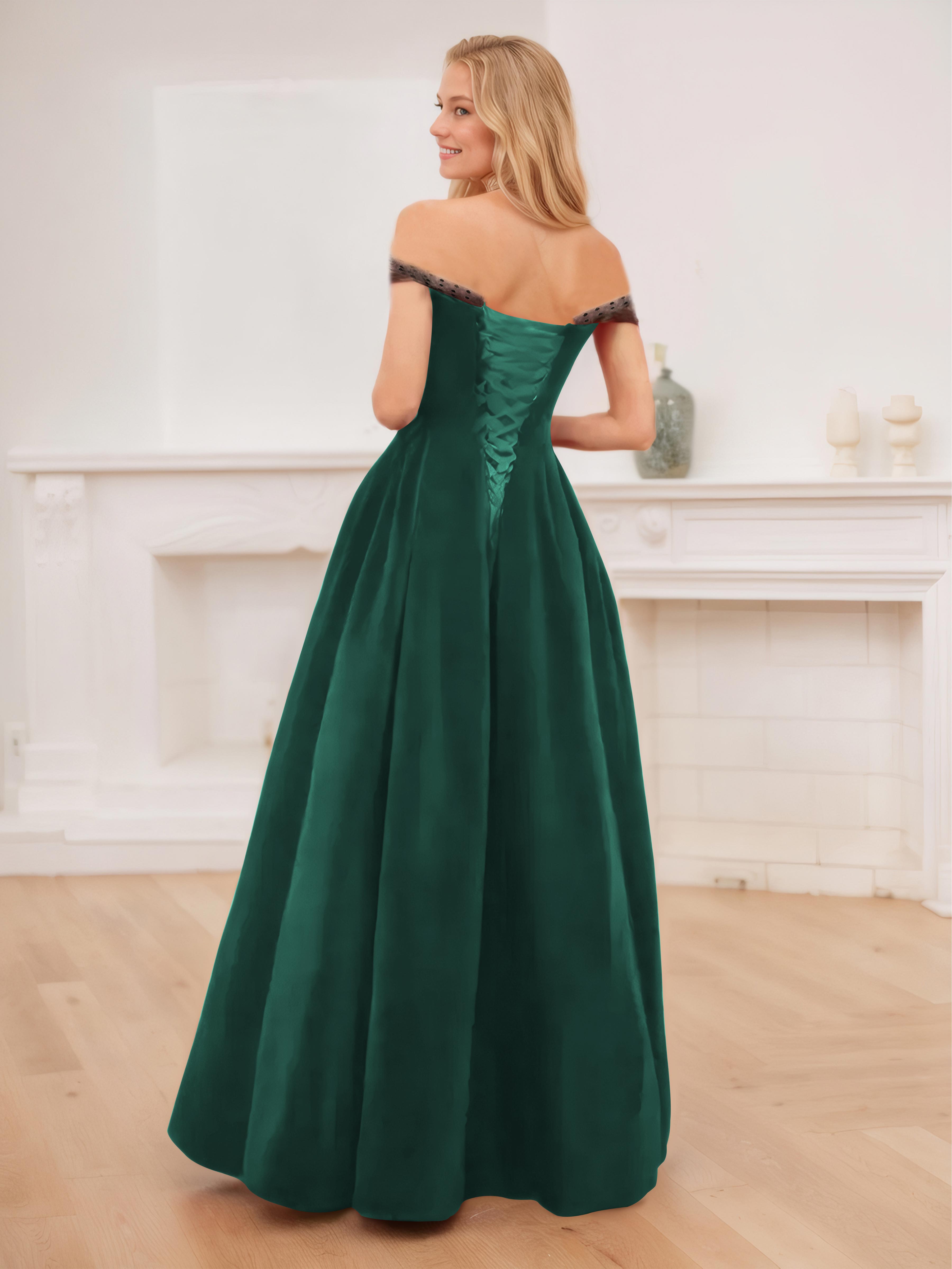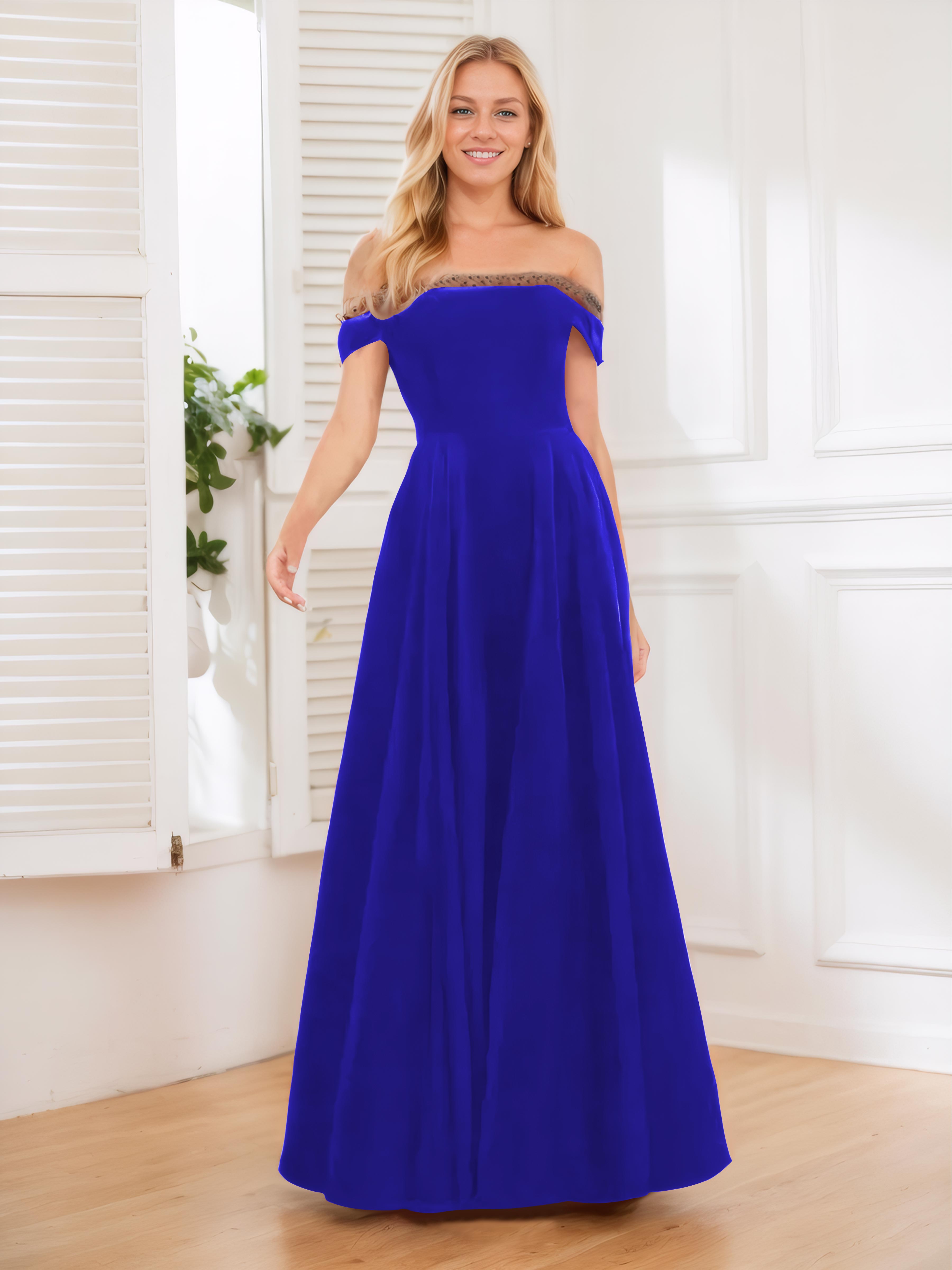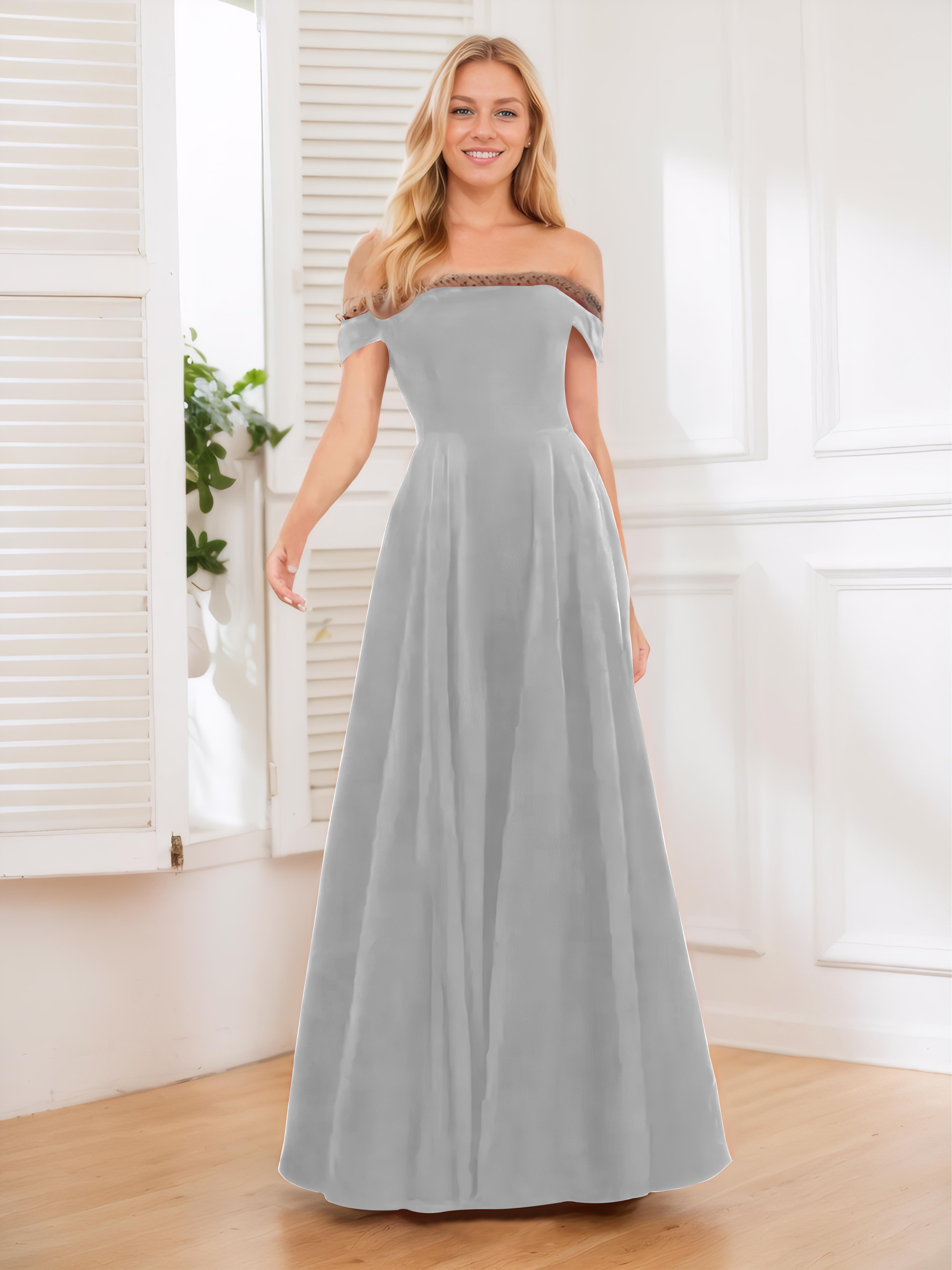 Designed to flatter with its off the shoulder neckline and elegant tulle fabric, this dress will make any bridesmaid feel like a goddess. Perfect for a romantic and sophisticated wedding, this dress will charm everyone with its floor length silhouette and luxurious velvet details.