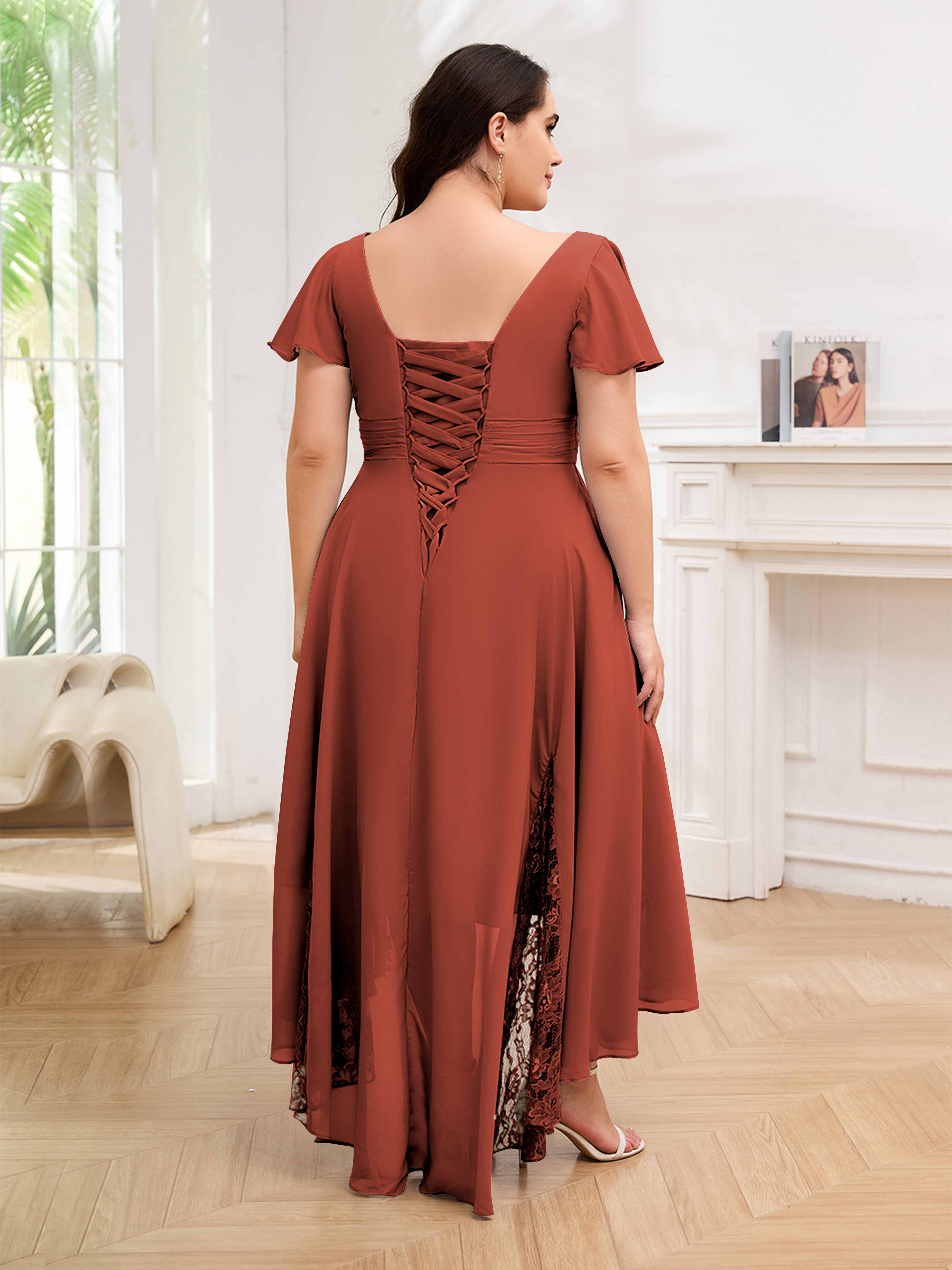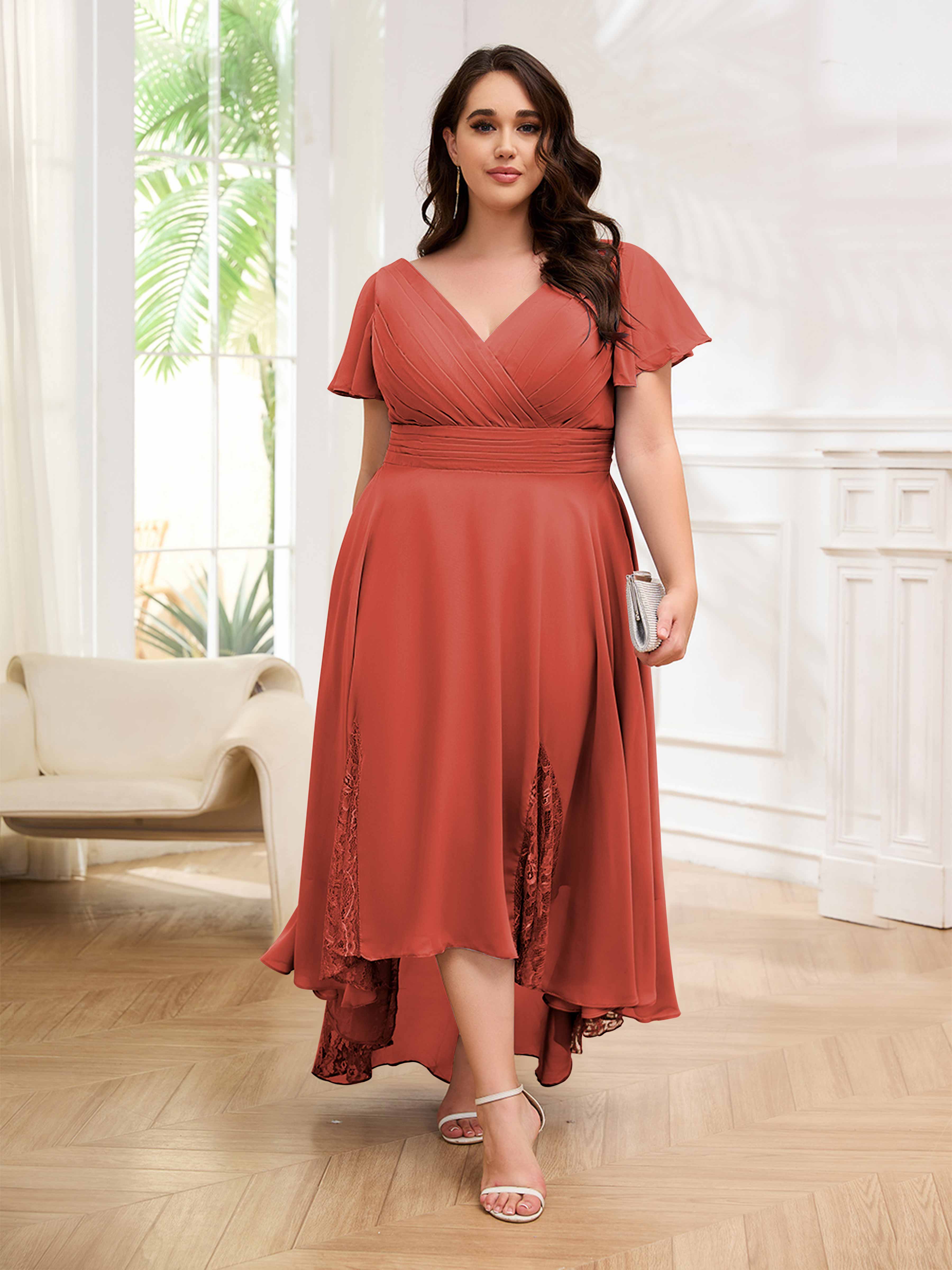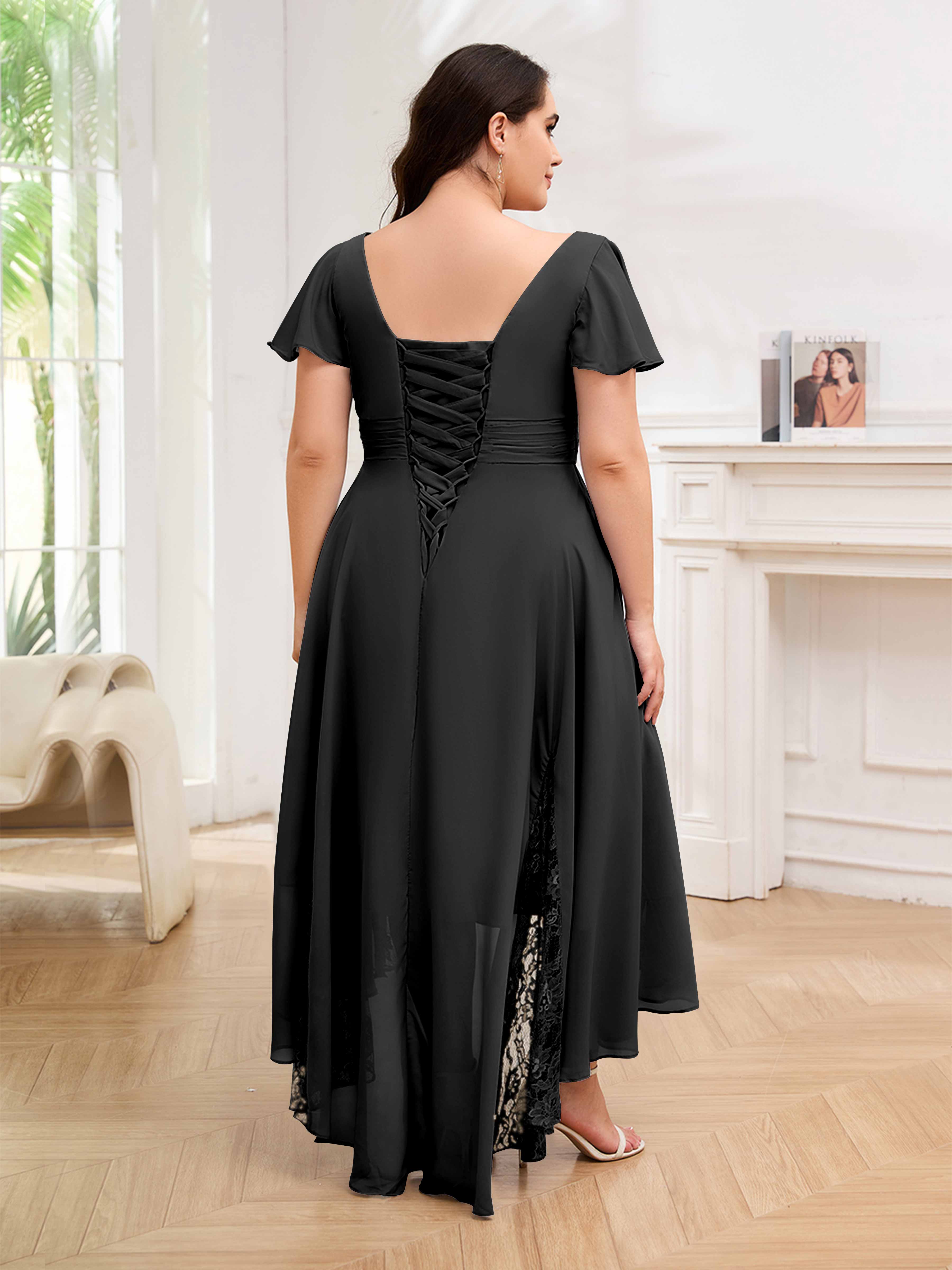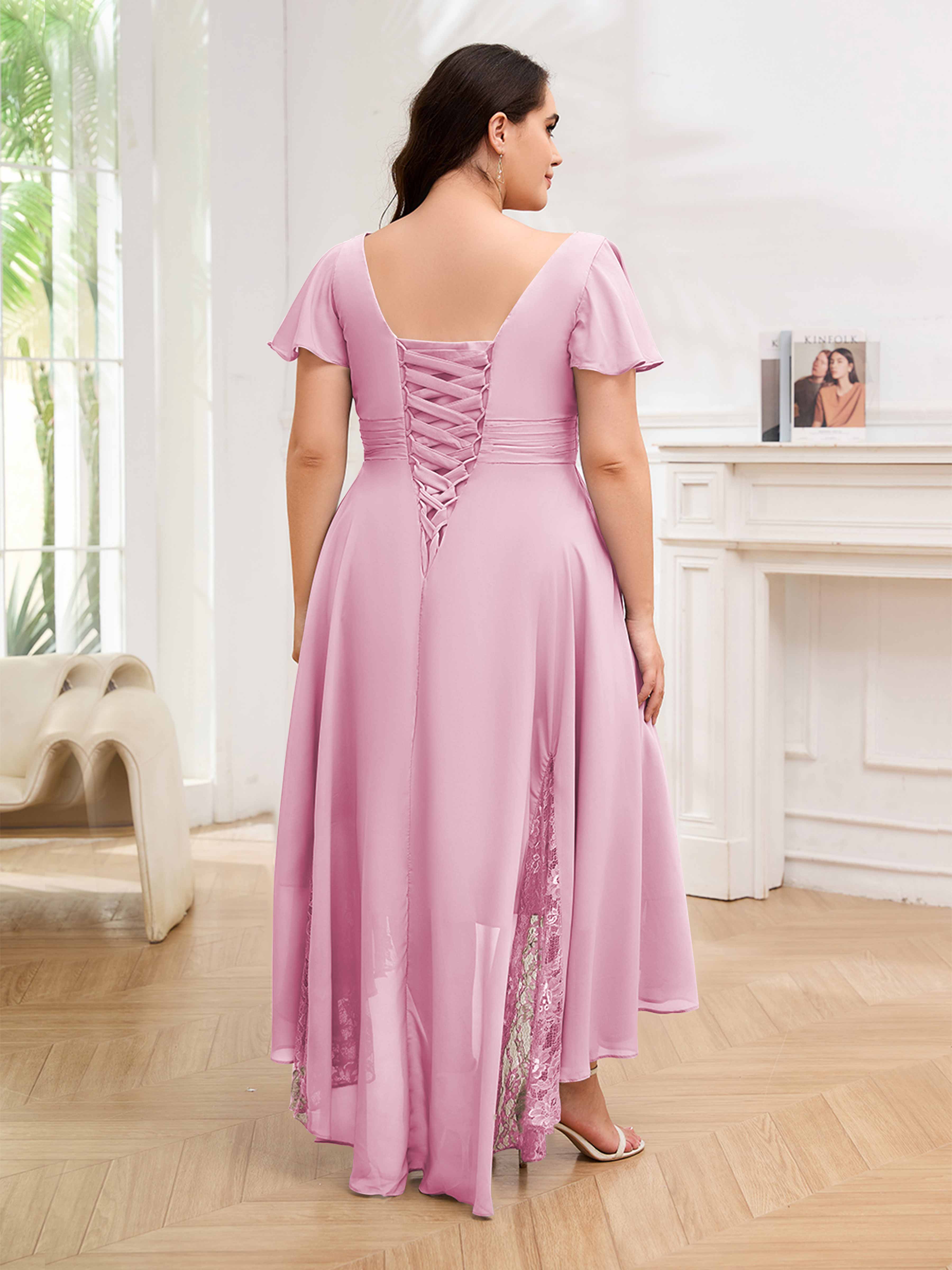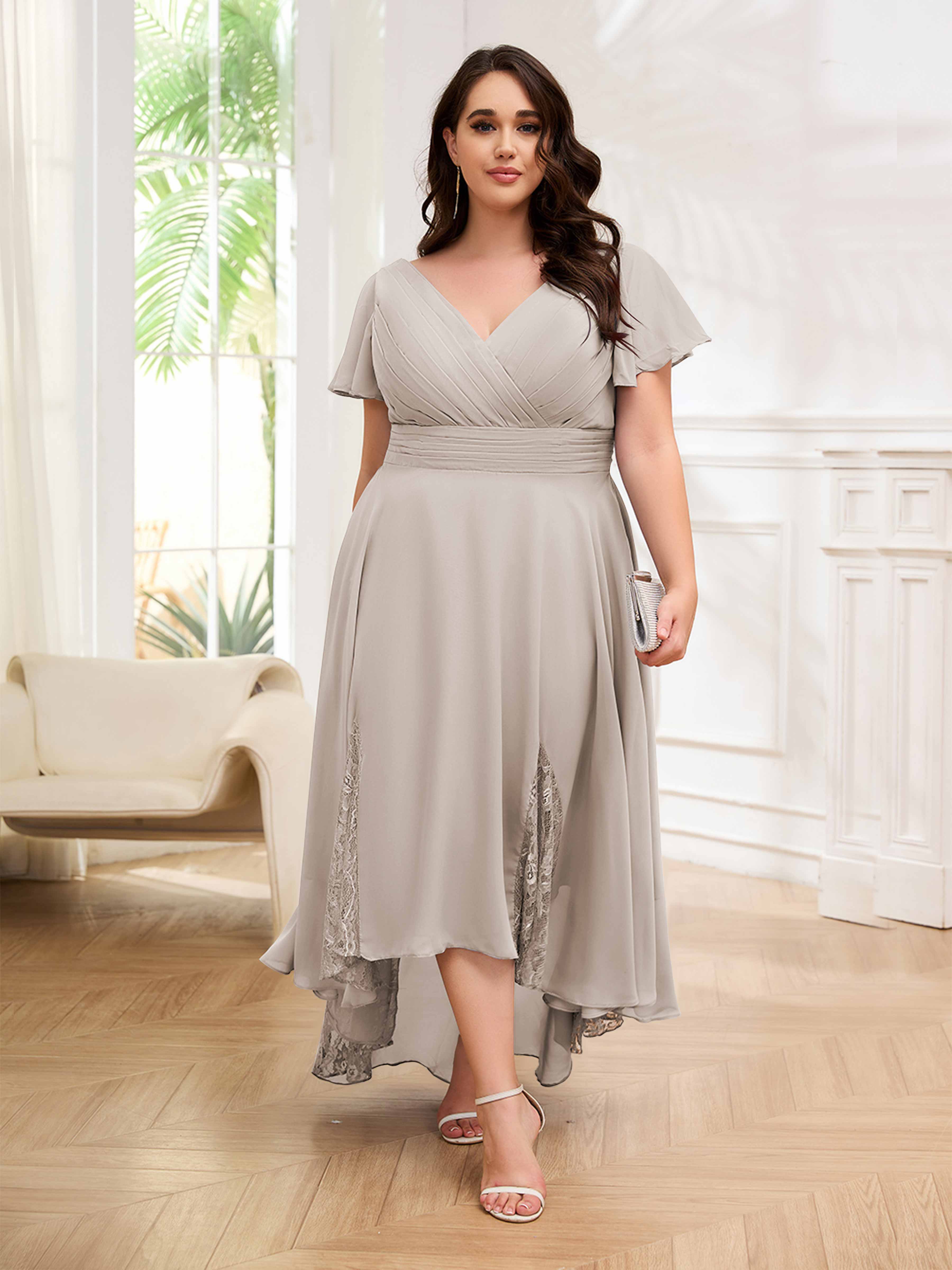 Remy Elegant V Neck Short Sleeves Lace Chiffon Plus Size Mother of the Bride Dresses